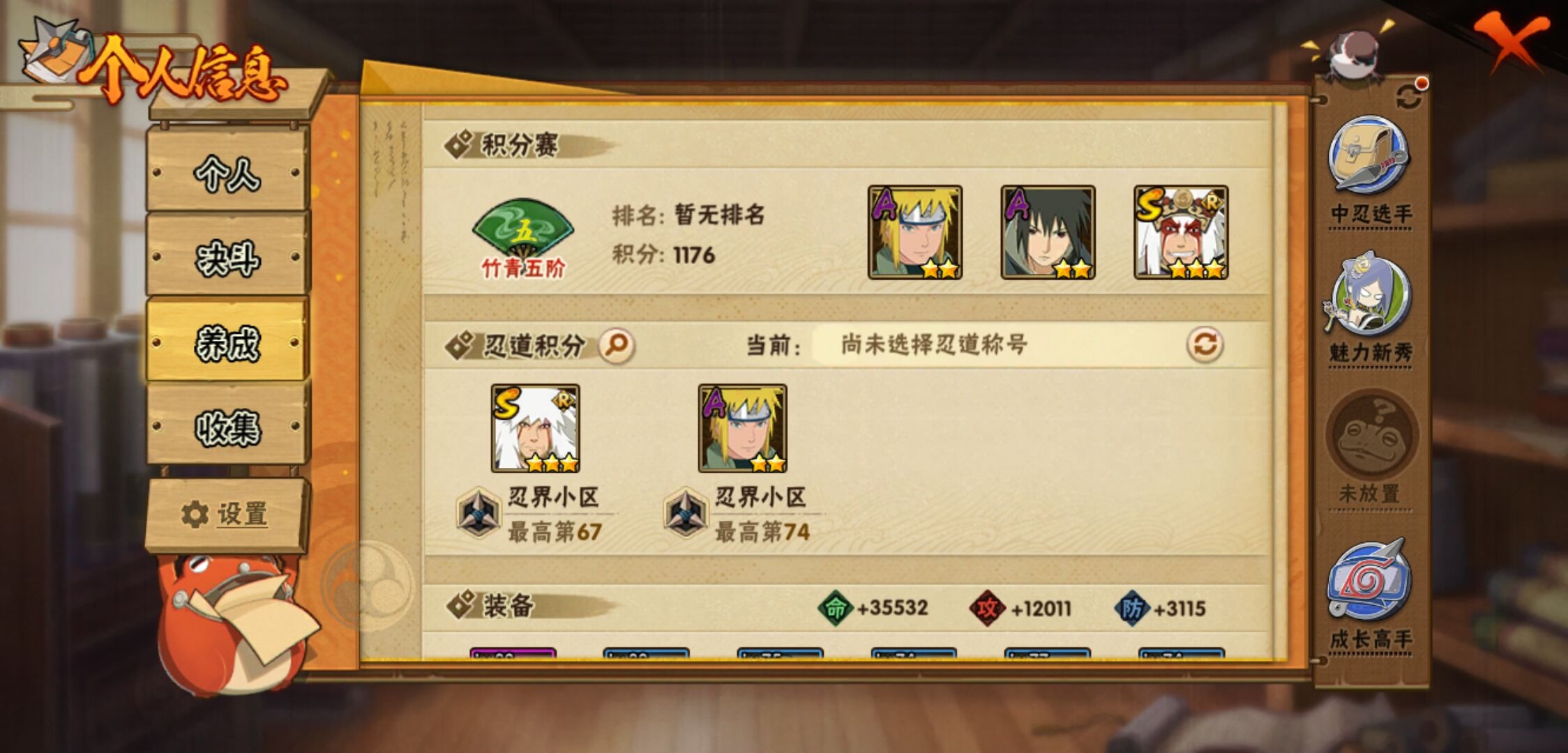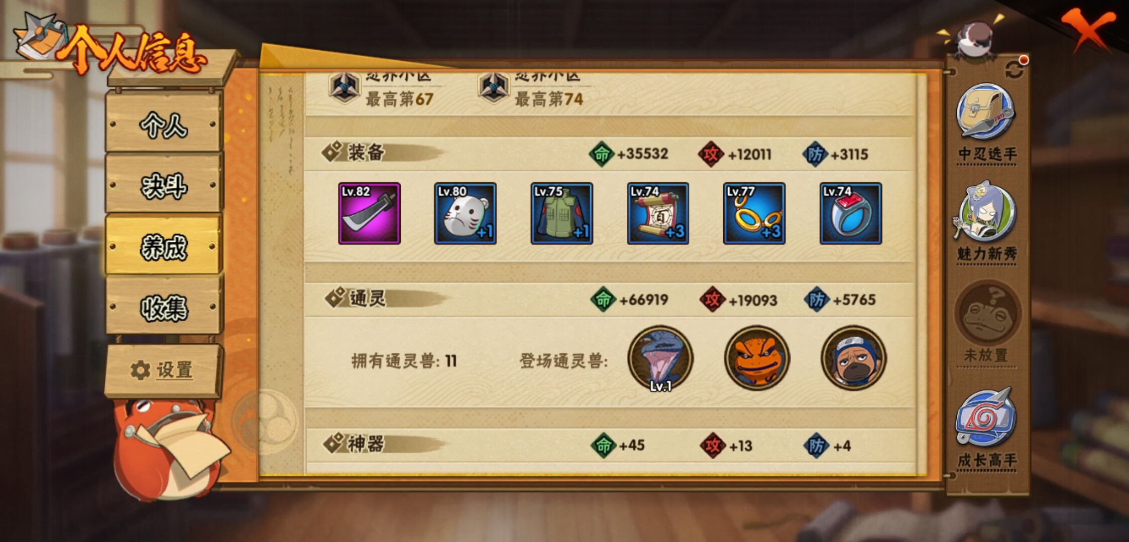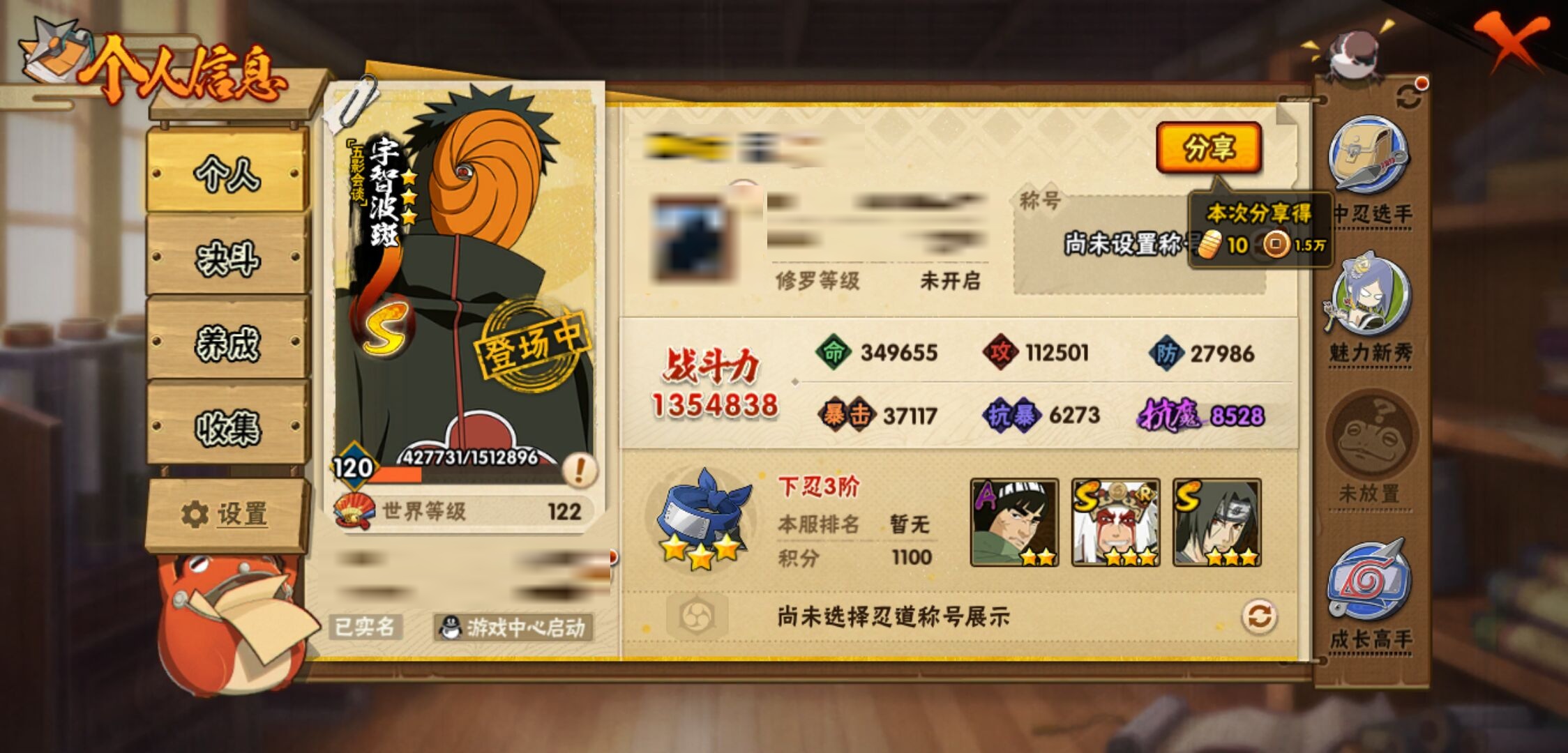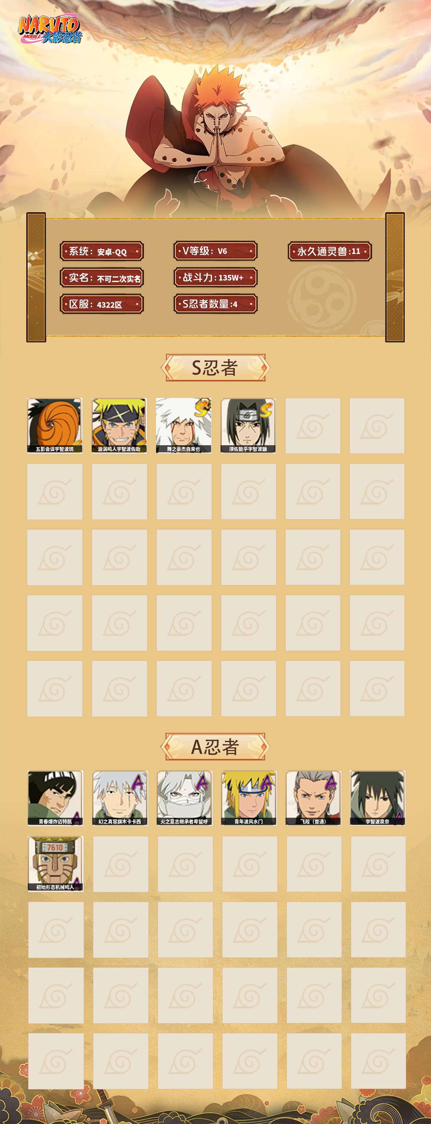 【火影忍者】【lyhy11296】战斗力:135w;段位:下忍3阶;本服排名:3964;vip:v6级;s忍:4个;a忍:7个;通灵兽:11个,s忍:五影会谈宇智波斑|漩涡鸣人宇智波佐助|舞之豪杰自来也|须佐能乎宇智波鼬__a忍:青春爆炸迈特凯|幻之真容旗木卡卡西|火之意志继承者卑留呼|青年波风水门|飞段(普通)|宇智波泉奈|初始形态机械鸣人__通灵兽:忍犬(普通)|蓝蛇|蛤蟆吉|砂之守鹤|忍龟|镰鼬|猿魔|山椒鱼|蜃|蛤蟆仙人|鲛鲨