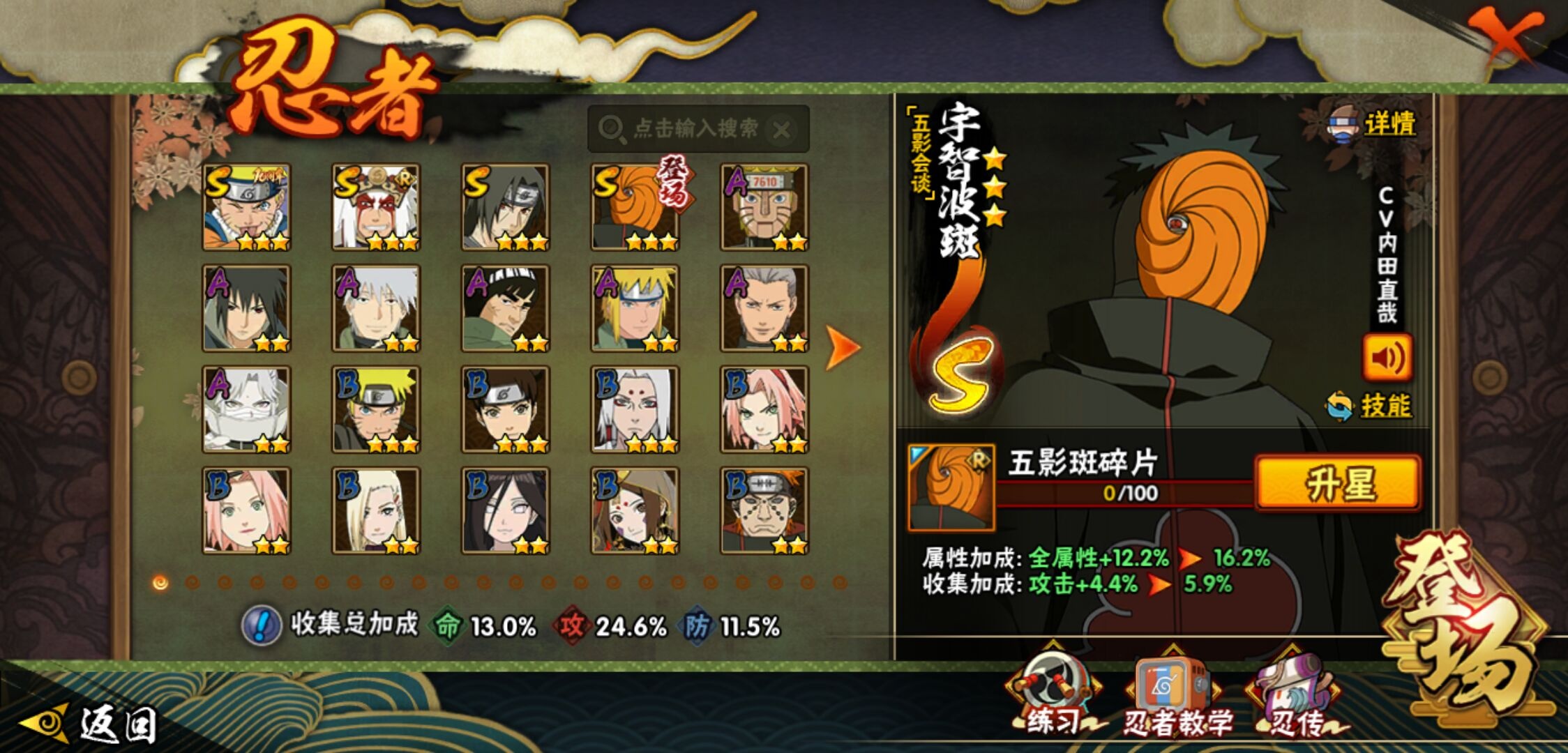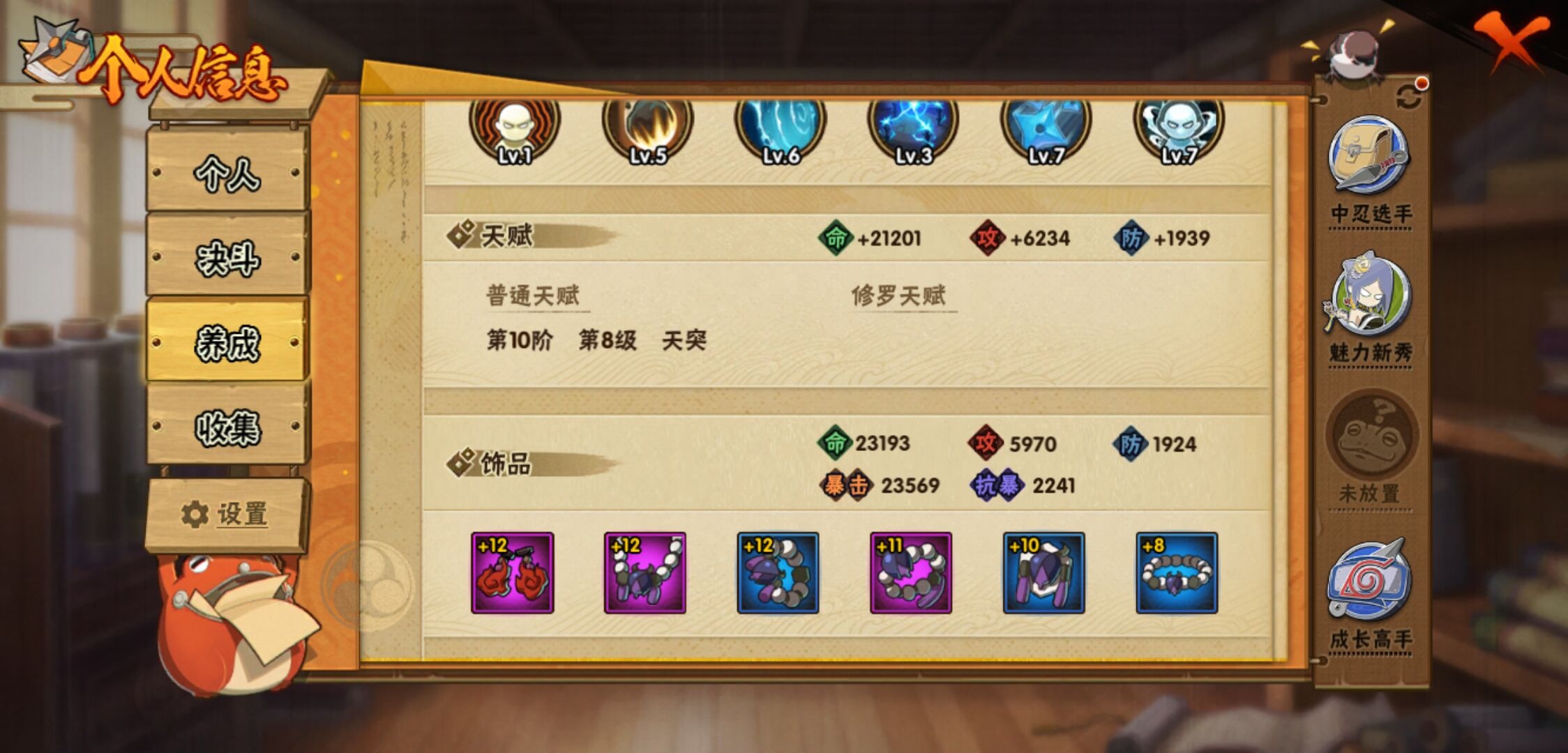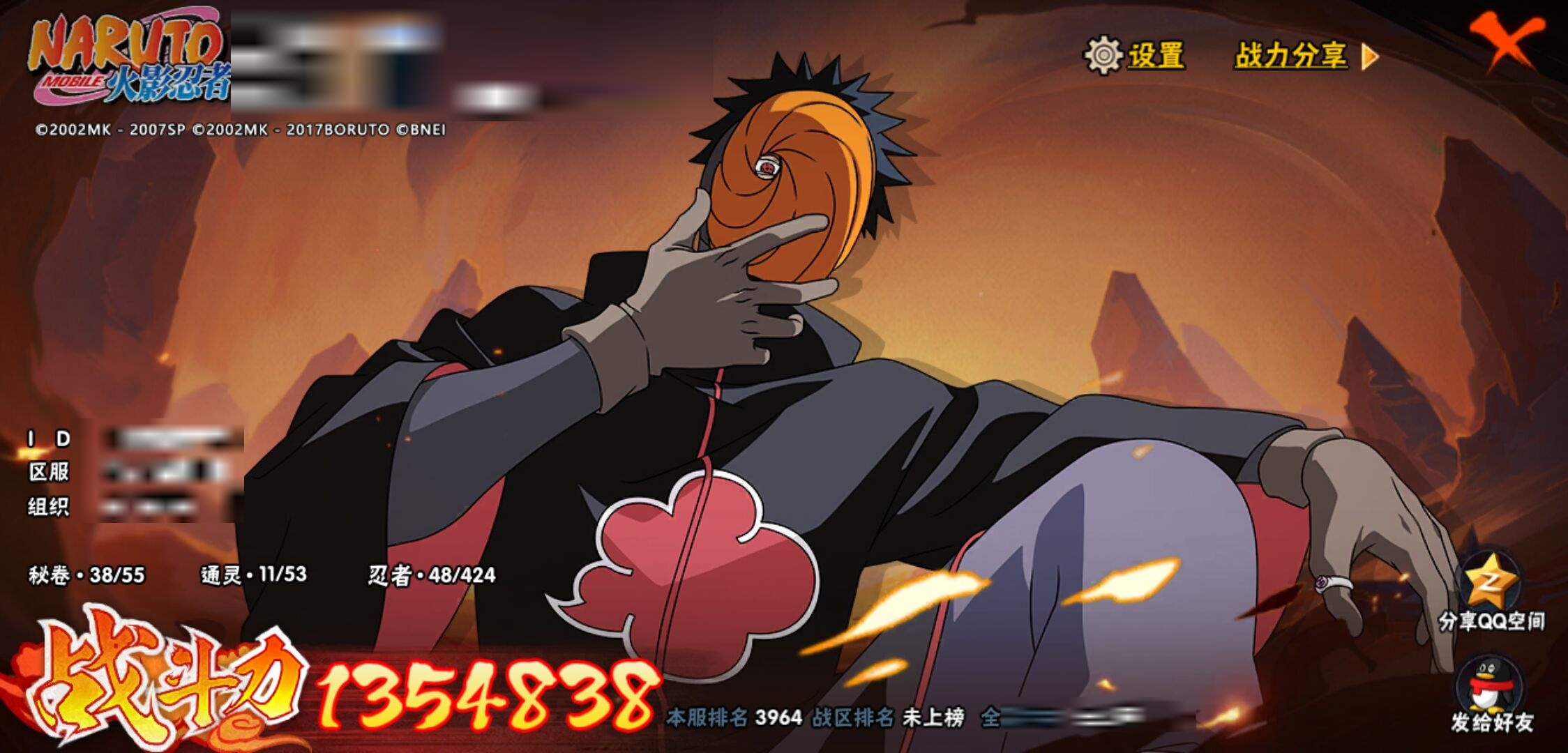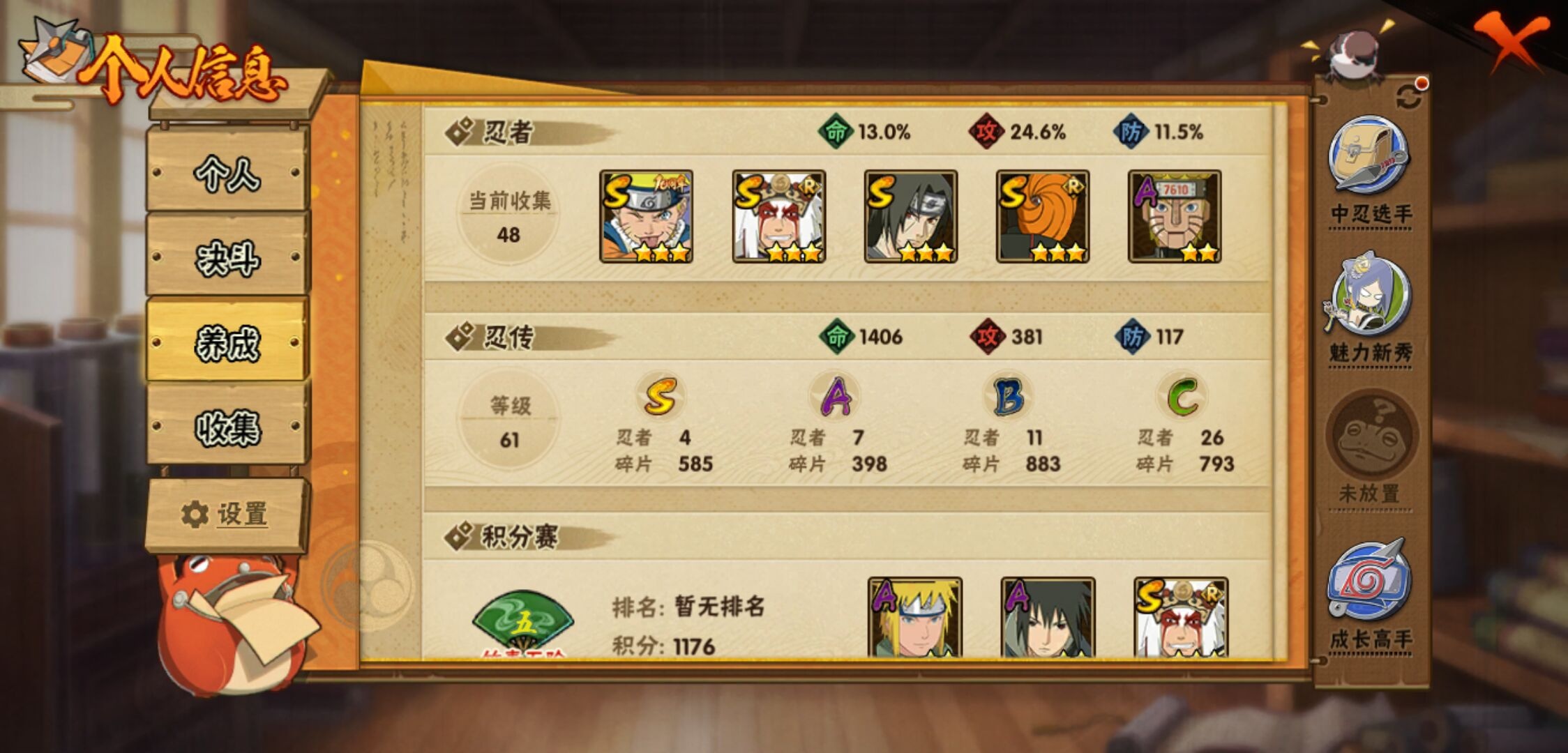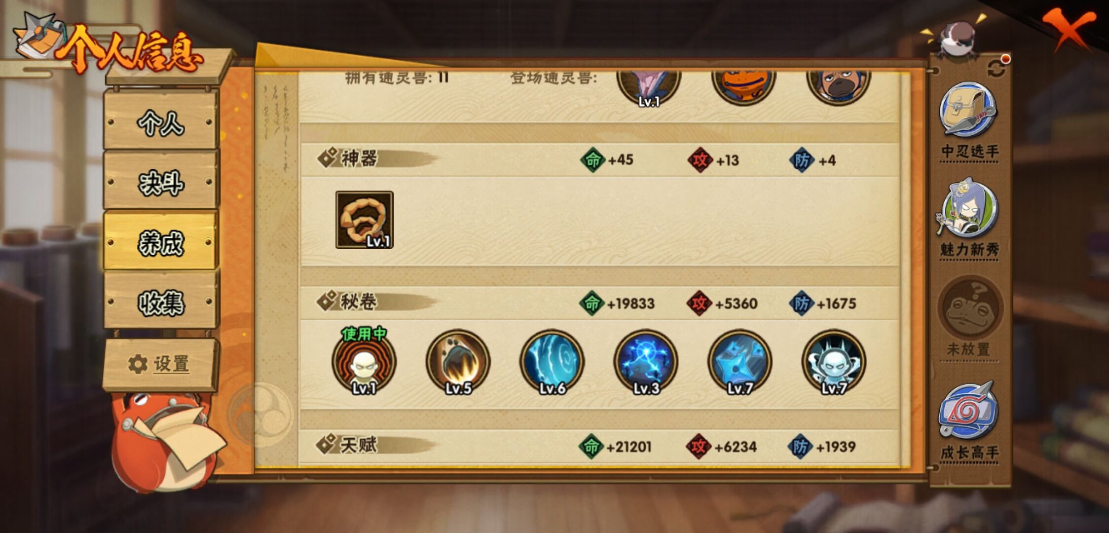 【火影忍者】【lyhy11296】战斗力:135w;段位:下忍3阶;本服排名:3964;vip:v6级;s忍:4个;a忍:7个;通灵兽:11个,s忍:五影会谈宇智波斑|漩涡鸣人宇智波佐助|舞之豪杰自来也|须佐能乎宇智波鼬__a忍:青春爆炸迈特凯|幻之真容旗木卡卡西|火之意志继承者卑留呼|青年波风水门|飞段(普通)|宇智波泉奈|初始形态机械鸣人__通灵兽:忍犬(普通)|蓝蛇|蛤蟆吉|砂之守鹤|忍龟|镰鼬|猿魔|山椒鱼|蜃|蛤蟆仙人|鲛鲨