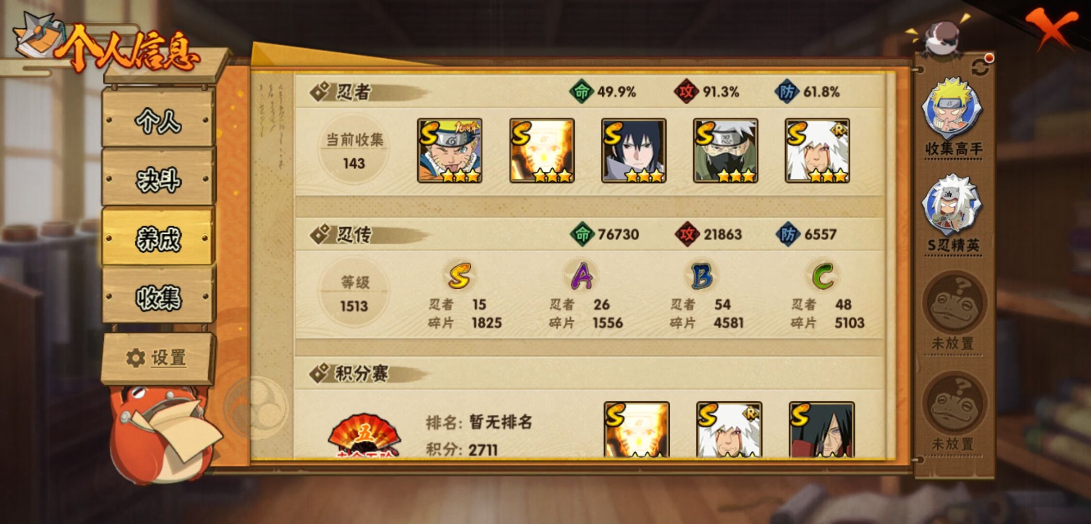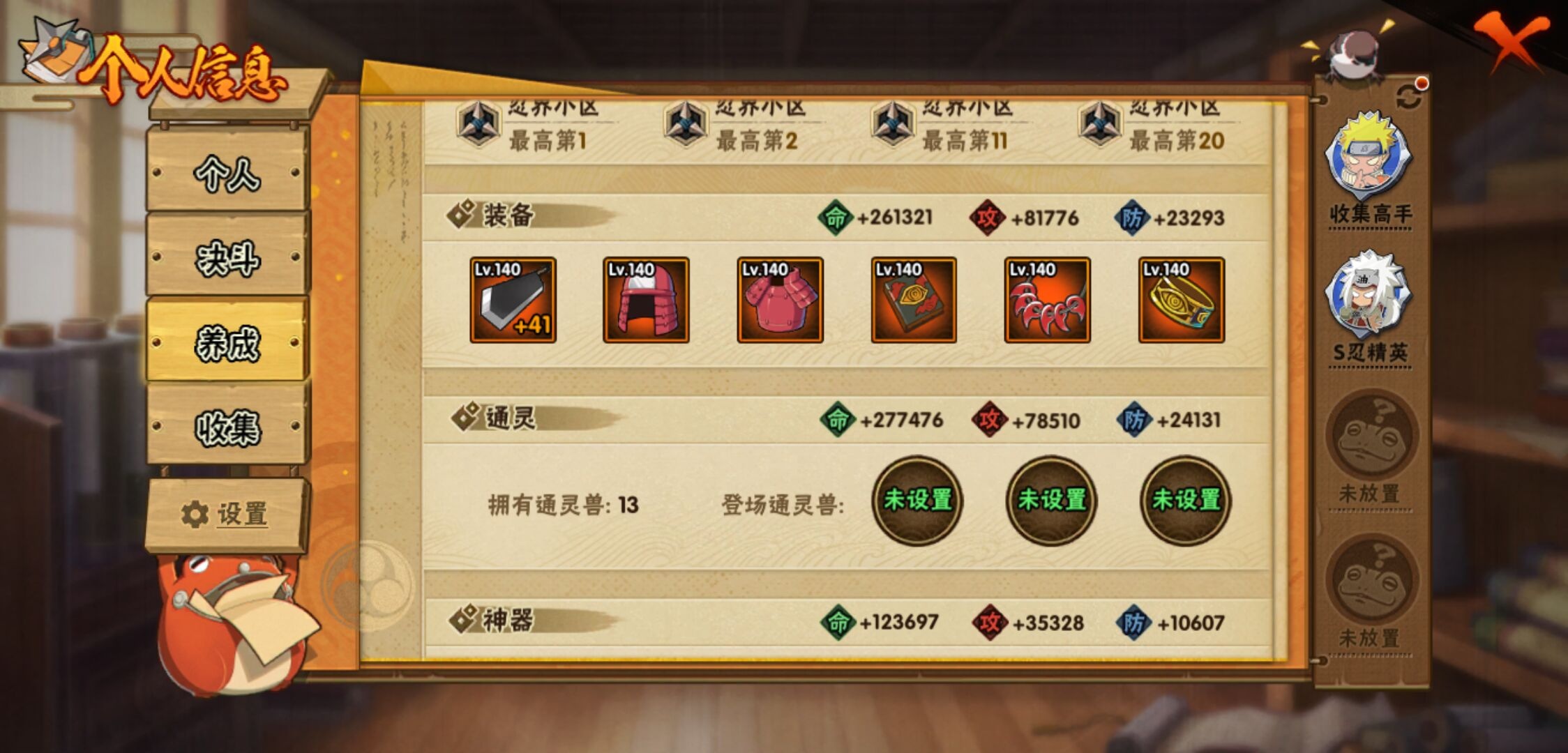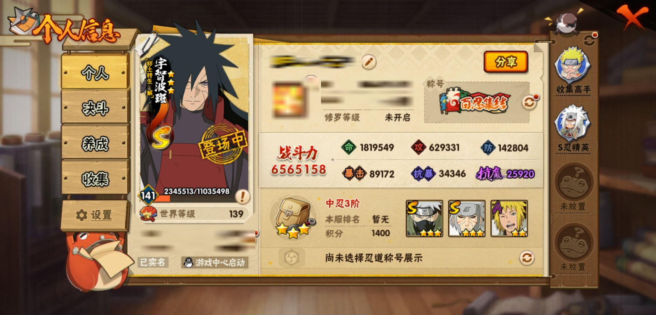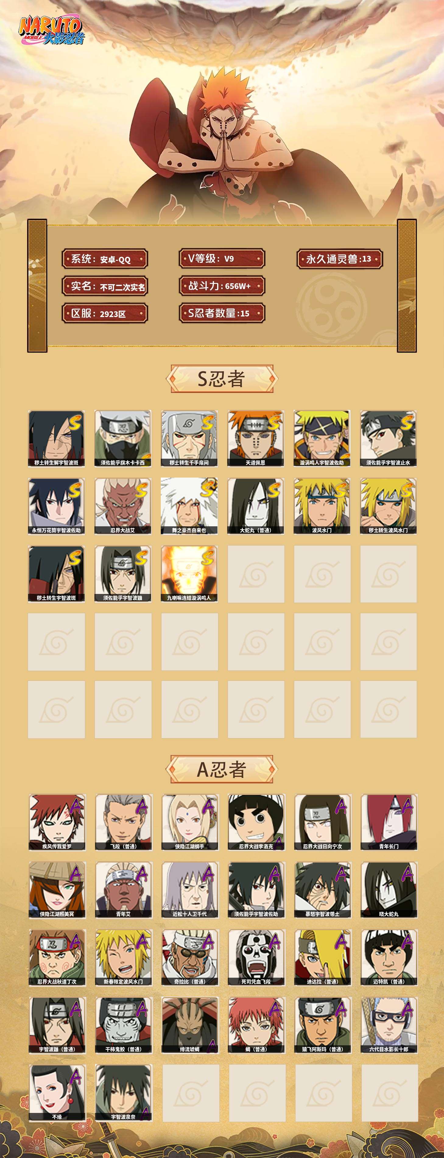 【火影忍者】【lyhy11298】战斗力:656w;段位:中忍3阶;vip:v9级;s忍:15个;a忍:26个;通灵兽:13个,s忍:秽土转生解宇智波斑|须佐能乎旗木卡卡西|秽土转生千手扉间|天道佩恩|漩涡鸣人宇智波佐助|须佐能乎宇智波止水|永恒万花筒宇智波佐助|忍界大战艾|舞之豪杰自来也|大蛇丸(普通)|波风水门|秽土转生波风水门|秽土转生宇智波斑|须佐能乎宇智波鼬|九喇嘛连结漩涡鸣人__a忍:侠隐江湖纲手|忍界大战李洛克|忍界大战日向宁次|青年长门|侠隐江湖照美冥|青年艾|近松十人卫千代|须佐能乎宇智波佐助|暴怒宇智波带土|晓大蛇丸|忍界大战秋道丁次|新春限定波风水门|奇拉比(普通)|死司凭血飞段|疾风传我爱罗 3星|迪达拉(普通)|飞段(普通) 3星|迈特凯(普通)|宇智波鼬(普通)|干柿鬼鲛(普通)|绯流琥蝎|蝎(普通)|猿飞阿斯玛(普通)|六代目水影长十郎|不缘|宇智波泉奈__通灵兽:忍犬(普通)|蓝蛇|砂之守鹤|蛤蟆吉|忍龟|镰鼬|猿魔|山椒鱼|蜃|蛤蟆仙人|鲛鲨|蛤蟆健|乌鸦(普通)