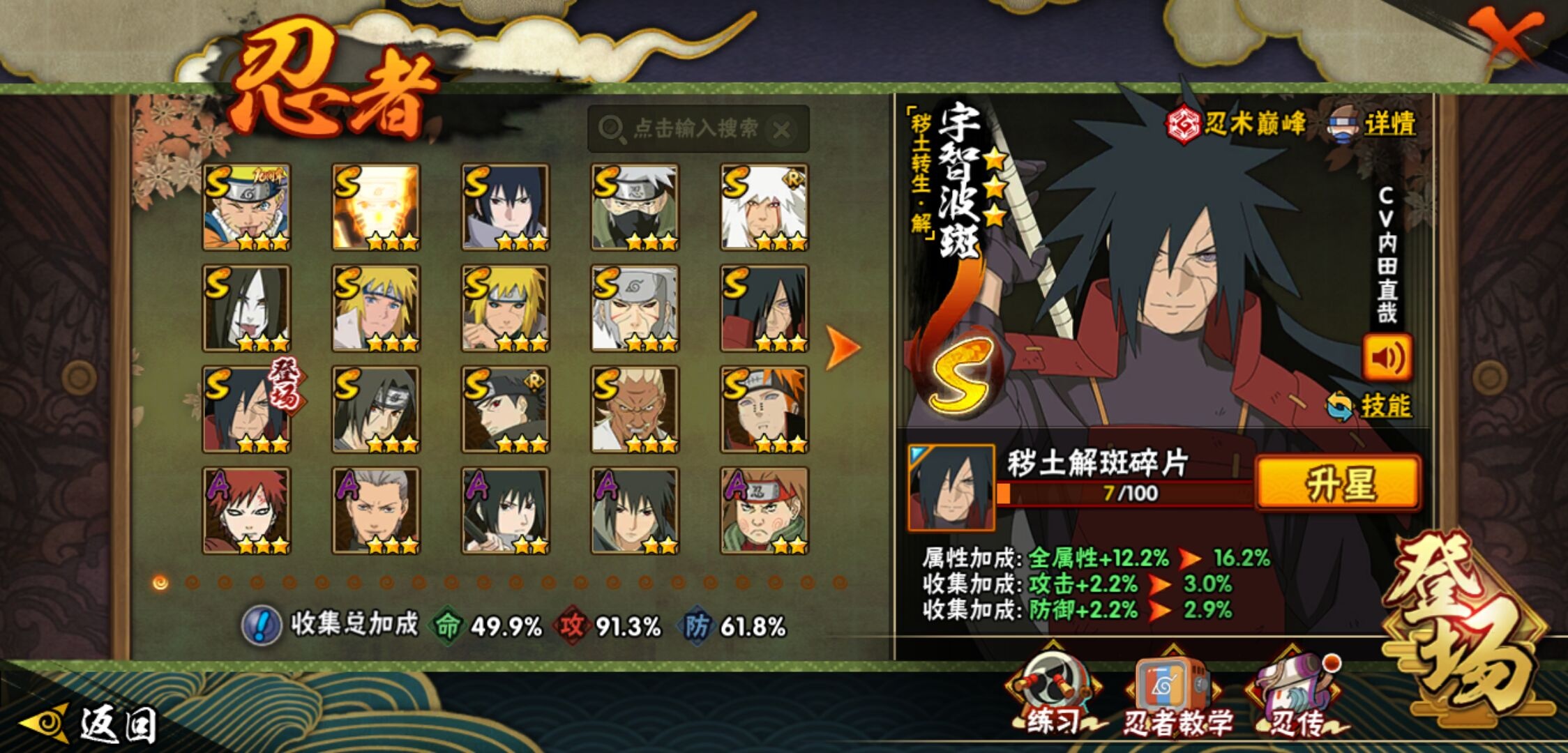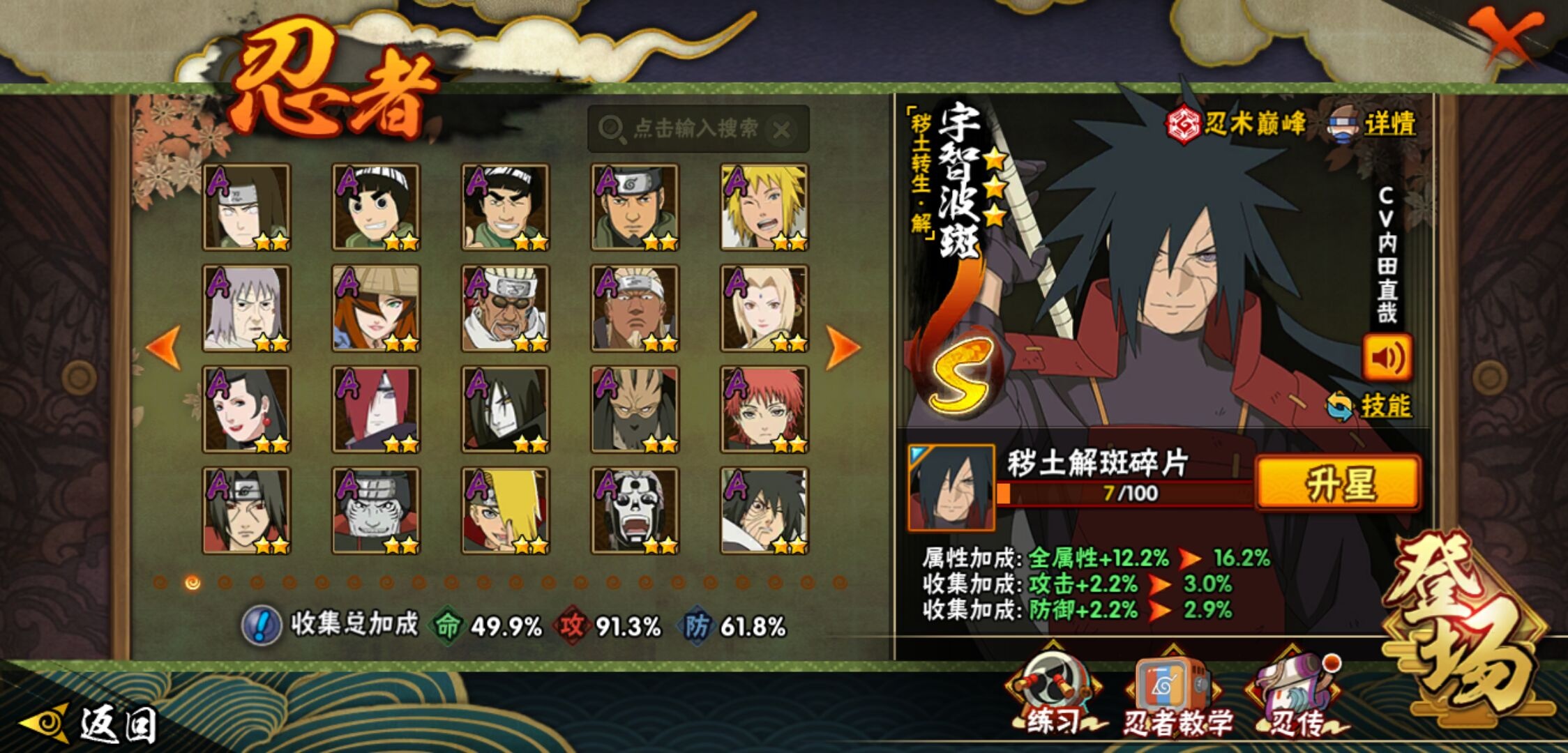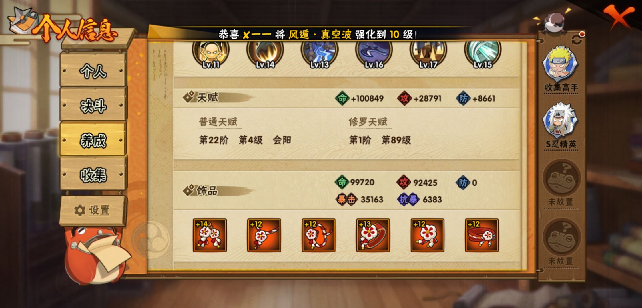 【火影忍者】【lyhy11298】战斗力:656w;段位:中忍3阶;vip:v9级;s忍:15个;a忍:26个;通灵兽:13个,s忍:秽土转生解宇智波斑|须佐能乎旗木卡卡西|秽土转生千手扉间|天道佩恩|漩涡鸣人宇智波佐助|须佐能乎宇智波止水|永恒万花筒宇智波佐助|忍界大战艾|舞之豪杰自来也|大蛇丸(普通)|波风水门|秽土转生波风水门|秽土转生宇智波斑|须佐能乎宇智波鼬|九喇嘛连结漩涡鸣人__a忍:侠隐江湖纲手|忍界大战李洛克|忍界大战日向宁次|青年长门|侠隐江湖照美冥|青年艾|近松十人卫千代|须佐能乎宇智波佐助|暴怒宇智波带土|晓大蛇丸|忍界大战秋道丁次|新春限定波风水门|奇拉比(普通)|死司凭血飞段|疾风传我爱罗 3星|迪达拉(普通)|飞段(普通) 3星|迈特凯(普通)|宇智波鼬(普通)|干柿鬼鲛(普通)|绯流琥蝎|蝎(普通)|猿飞阿斯玛(普通)|六代目水影长十郎|不缘|宇智波泉奈__通灵兽:忍犬(普通)|蓝蛇|砂之守鹤|蛤蟆吉|忍龟|镰鼬|猿魔|山椒鱼|蜃|蛤蟆仙人|鲛鲨|蛤蟆健|乌鸦(普通)