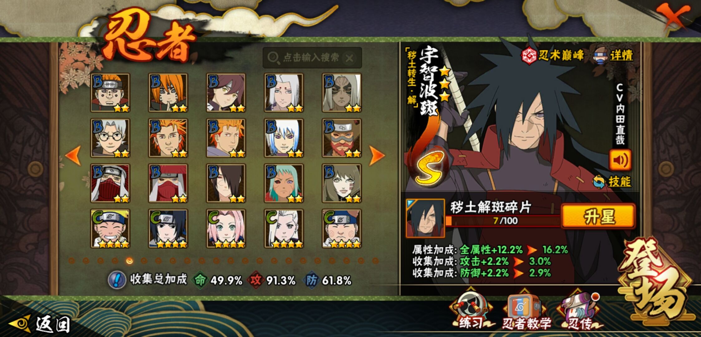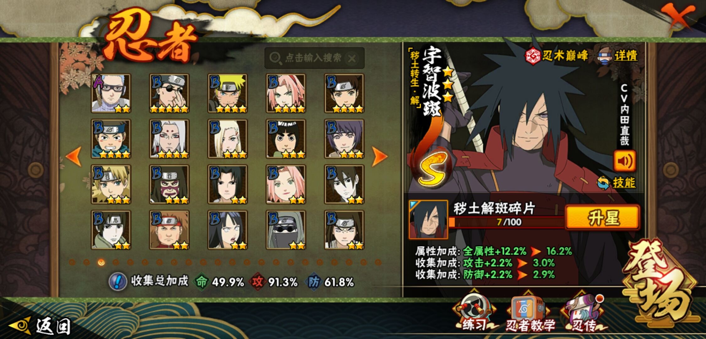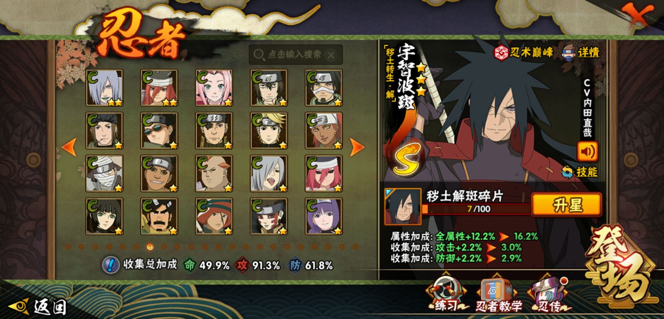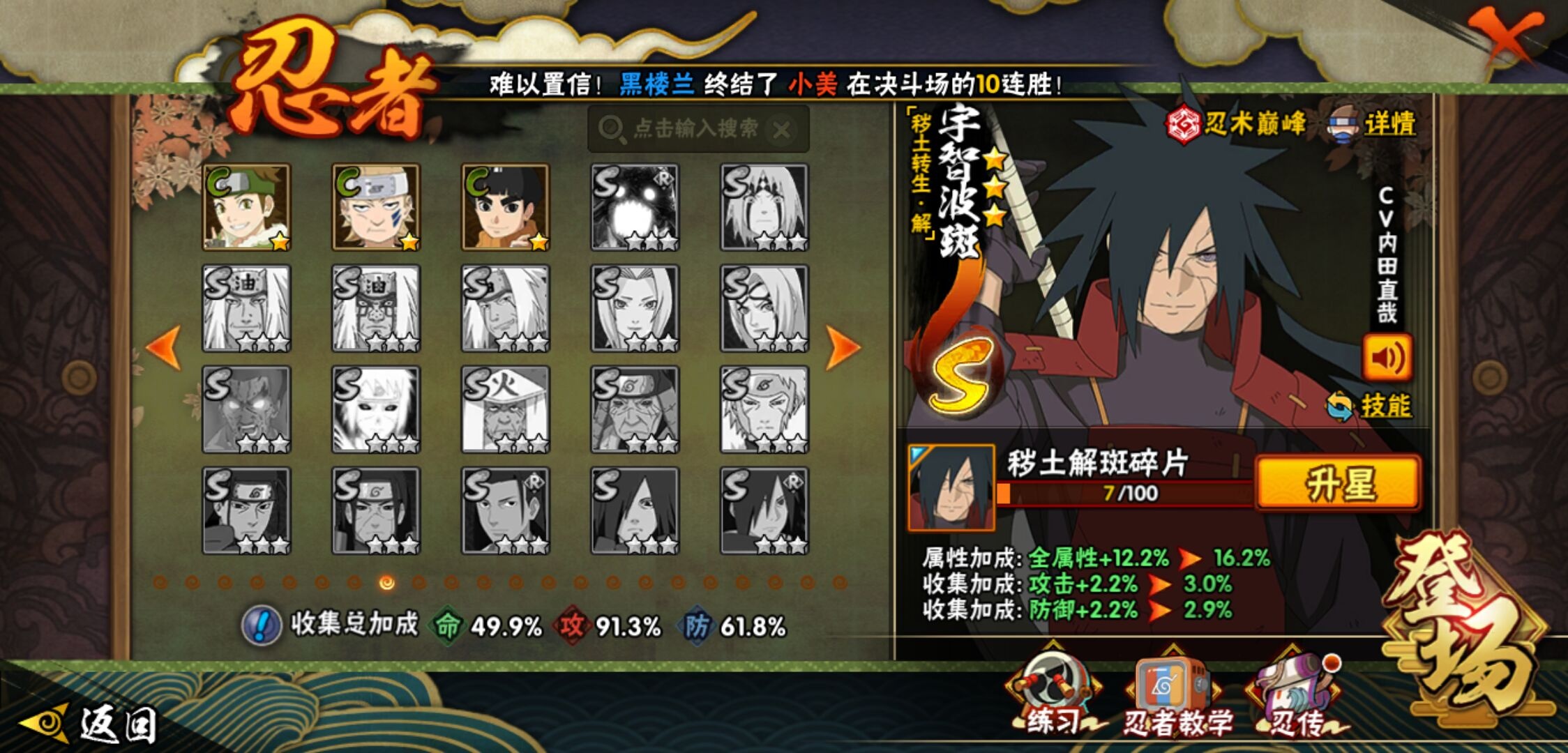 【火影忍者】【lyhy11298】战斗力:656w;段位:中忍3阶;vip:v9级;s忍:15个;a忍:26个;通灵兽:13个,s忍:秽土转生解宇智波斑|须佐能乎旗木卡卡西|秽土转生千手扉间|天道佩恩|漩涡鸣人宇智波佐助|须佐能乎宇智波止水|永恒万花筒宇智波佐助|忍界大战艾|舞之豪杰自来也|大蛇丸(普通)|波风水门|秽土转生波风水门|秽土转生宇智波斑|须佐能乎宇智波鼬|九喇嘛连结漩涡鸣人__a忍:侠隐江湖纲手|忍界大战李洛克|忍界大战日向宁次|青年长门|侠隐江湖照美冥|青年艾|近松十人卫千代|须佐能乎宇智波佐助|暴怒宇智波带土|晓大蛇丸|忍界大战秋道丁次|新春限定波风水门|奇拉比(普通)|死司凭血飞段|疾风传我爱罗 3星|迪达拉(普通)|飞段(普通) 3星|迈特凯(普通)|宇智波鼬(普通)|干柿鬼鲛(普通)|绯流琥蝎|蝎(普通)|猿飞阿斯玛(普通)|六代目水影长十郎|不缘|宇智波泉奈__通灵兽:忍犬(普通)|蓝蛇|砂之守鹤|蛤蟆吉|忍龟|镰鼬|猿魔|山椒鱼|蜃|蛤蟆仙人|鲛鲨|蛤蟆健|乌鸦(普通)