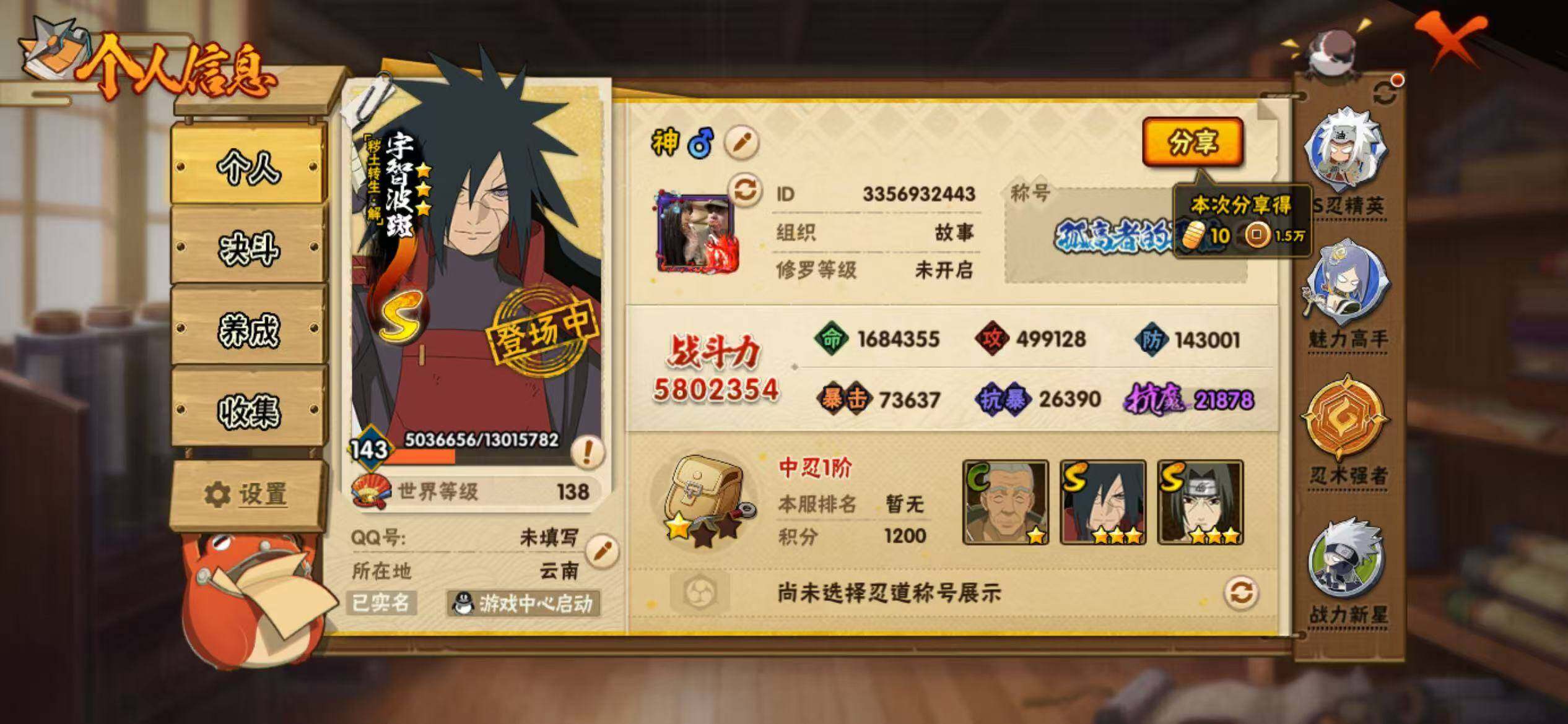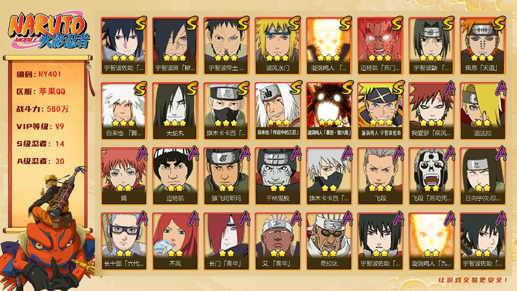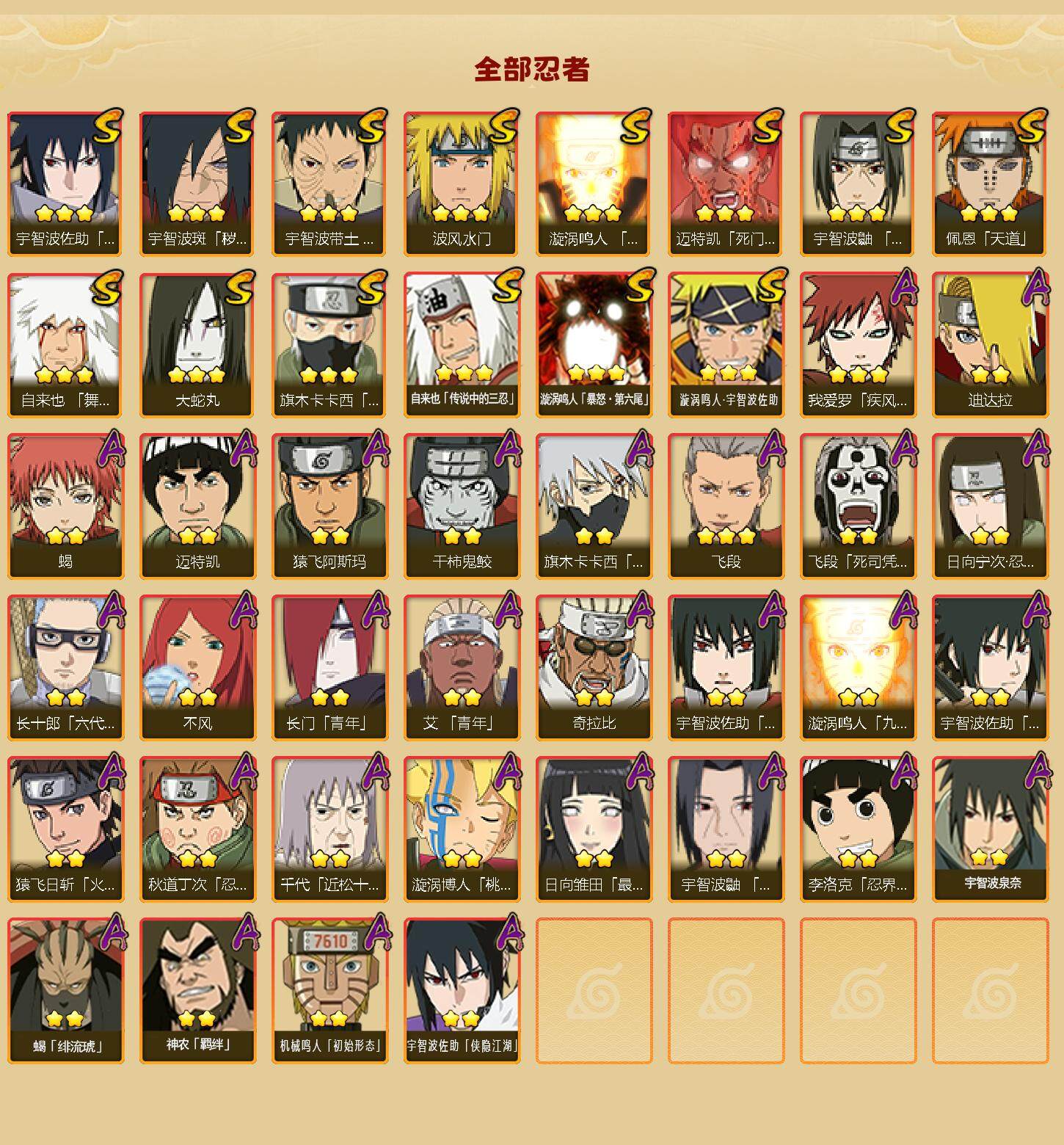 【hy401】14s级忍者数-30a级忍者数 【s级忍者】:宇智波斑「秽土转生·解」3星,宇智波带土「忍界大战」3星,宇智波鼬「须佐能乎」3星,旗木卡卡西「须佐能乎」3星,自来也「舞之豪杰」3星,大蛇丸3星,自来也「传说中的三忍」3星,波风水门3星,漩涡鸣人「九喇嘛连结」3星,迈特凯「死门」3星,佩恩「天道」3星,宇智波佐助「永恒万花筒」3星,漩涡鸣人「暴怒·第六尾」3星,漩涡鸣人·宇智波佐助3星 【a级忍者】:艾「青年」2星,长门「青年」2星,迪达拉2星,奇拉比2星,飞段3星,飞段「死司凭血」2星,干柿鬼鲛2星,漩涡博人「桃式显现」2星,漩涡鸣人「九尾查克拉」2星,机械鸣人「初始形态」2星,迈特凯2星,旗木卡卡西「万花筒写轮眼」2星,我爱罗「疾风传」3星,蝎2星,蝎「绯流琥」2星,猿飞阿斯玛2星,猿飞日斩「火影继承人」2星,宇智波鼬「夏日限定」2星,宇智波佐助「须佐能乎」2星,宇智波佐助「万花筒写轮眼」2星,宇智波佐助「侠隐江湖」2星,日向宁次「忍界大战」2星,日向雏田「最终章」2星,长十郎「六代目水影」2星,李洛克「忍界大战」2星,秋道丁次「忍界大战」2星,千代「近松十人卫」2星,神农「羁绊」2星,不风2星,宇智波泉奈2星
