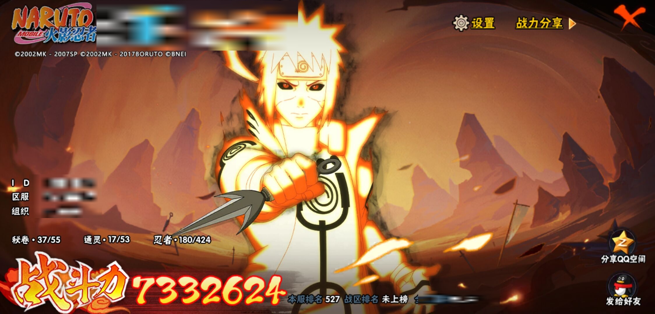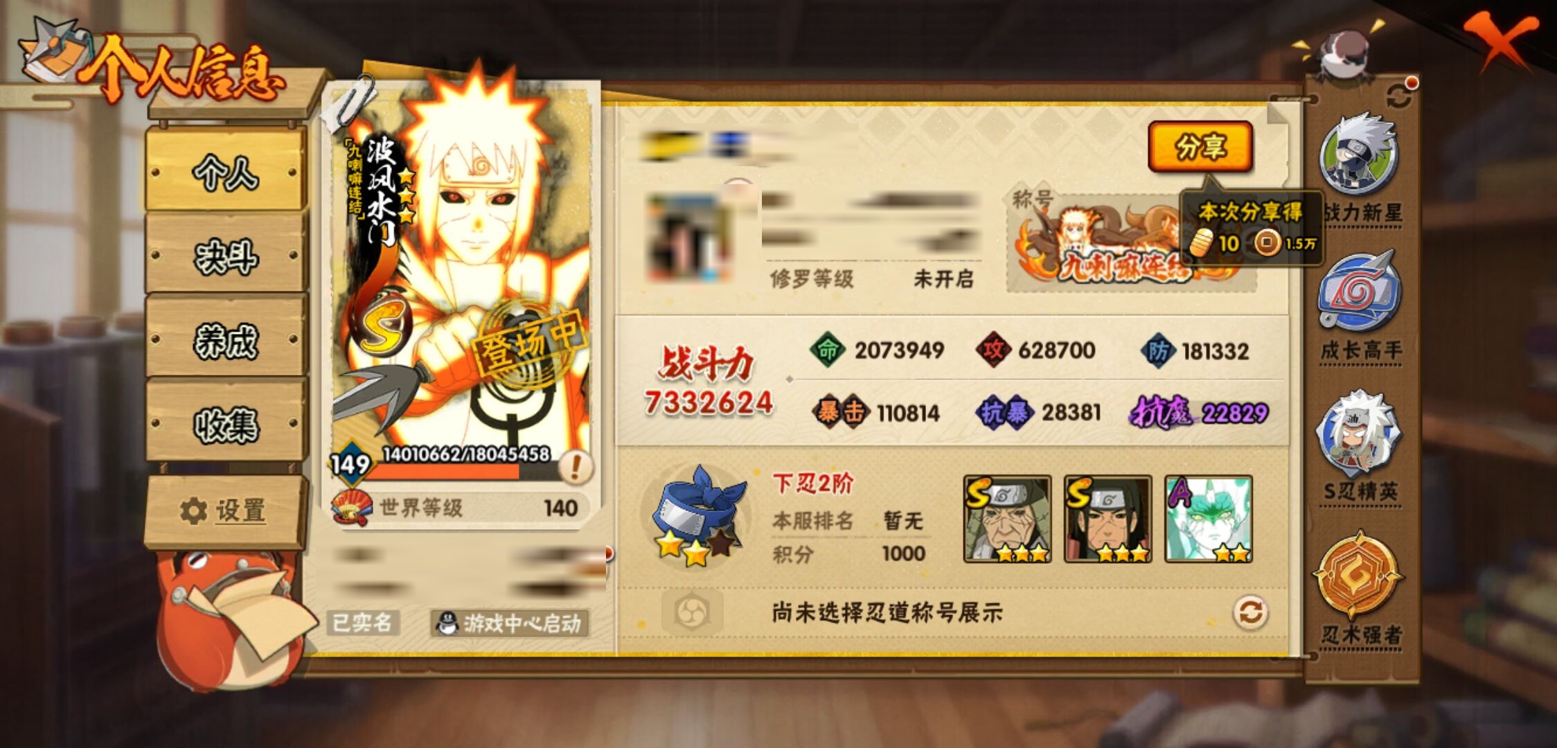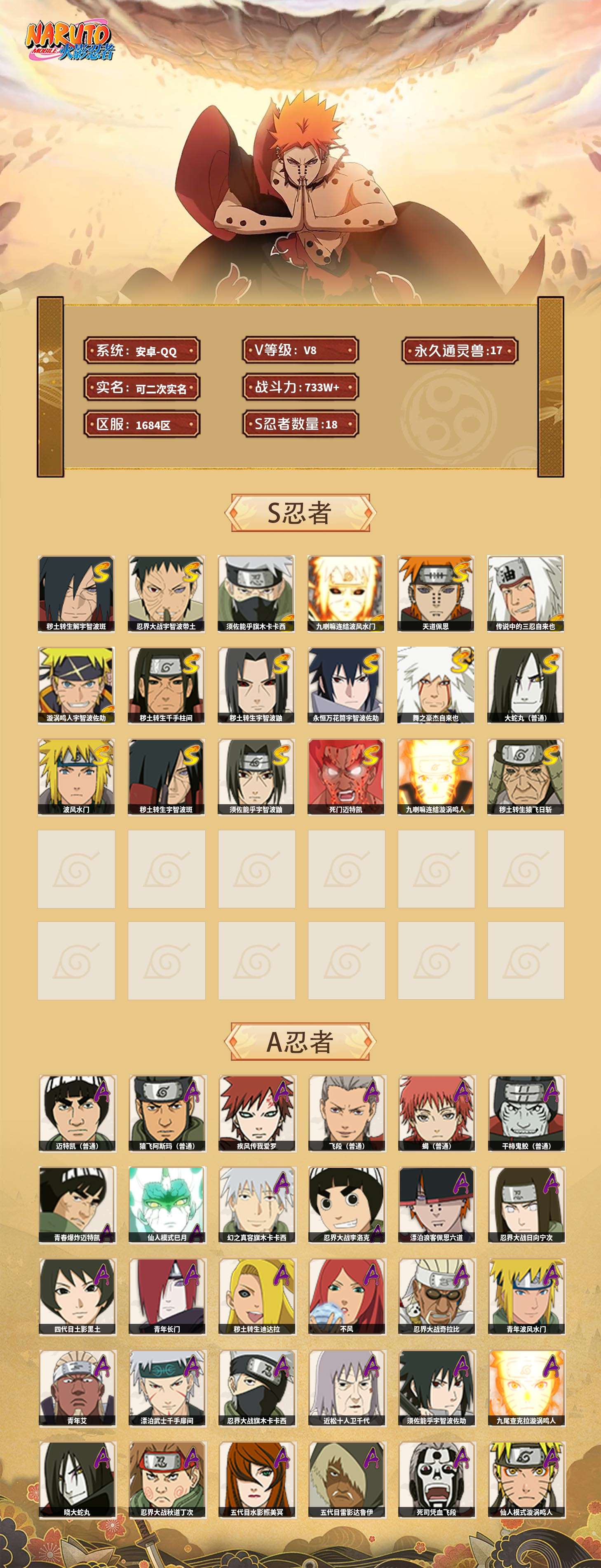 【火影忍者】【lyhy11314】战斗力:733w;段位:下忍2阶;本服排名:527;vip:v8级;s忍:18个;a忍:37个;通灵兽:17个,s忍:秽土转生解宇智波斑|忍界大战宇智波带土|须佐能乎旗木卡卡西|九喇嘛连结波风水门|天道佩恩|传说中的三忍自来也|漩涡鸣人宇智波佐助|秽土转生千手柱间|秽土转生宇智波鼬|永恒万花筒宇智波佐助|舞之豪杰自来也|大蛇丸(普通)|波风水门|秽土转生宇智波斑|须佐能乎宇智波鼬|死门迈特凯|九喇嘛连结漩涡鸣人|秽土转生猿飞日斩__a忍:青春爆炸迈特凯|仙人模式巳月|幻之真容旗木卡卡西|忍界大战李洛克|漂泊浪客佩恩六道|忍界大战日向宁次|四代目土影黑土|青年长门|秽土转生迪达拉|不风|忍界大战奇拉比|青年波风水门|青年艾|漂泊武士千手扉间|忍界大战旗木卡卡西|近松十人卫千代|须佐能乎宇智波佐助|九尾查克拉漩涡鸣人|晓大蛇丸|忍界大战秋道丁次|五代目水影照美冥|五代目雷影达鲁伊|死司凭血飞段|疾风传我爱罗 4星|飞段(普通) 4星|仙人模式漩涡鸣人|迈特凯(普通) 5星|宇智波鼬(普通)|干柿鬼鲛(普通) 3星|秽土转生桃地再不斩|蝎(普通) 4星|猿飞阿斯玛(普通) 5星|桃式显现漩涡博人|最终章日向雏田|六代目水影长十郎|不缘|宇智波泉奈__通灵兽:忍犬(普通)|蓝蛇|蛤蟆吉|忍龟|镰鼬|猿魔|山椒鱼|蜃|蛤蟆仙人|鲛鲨|砂之守鹤|蛤蟆健|蛞蝓(普通)|乌鸦(普通)|蛤蟆龙|蛤蟆广|乌鸦夏日限定