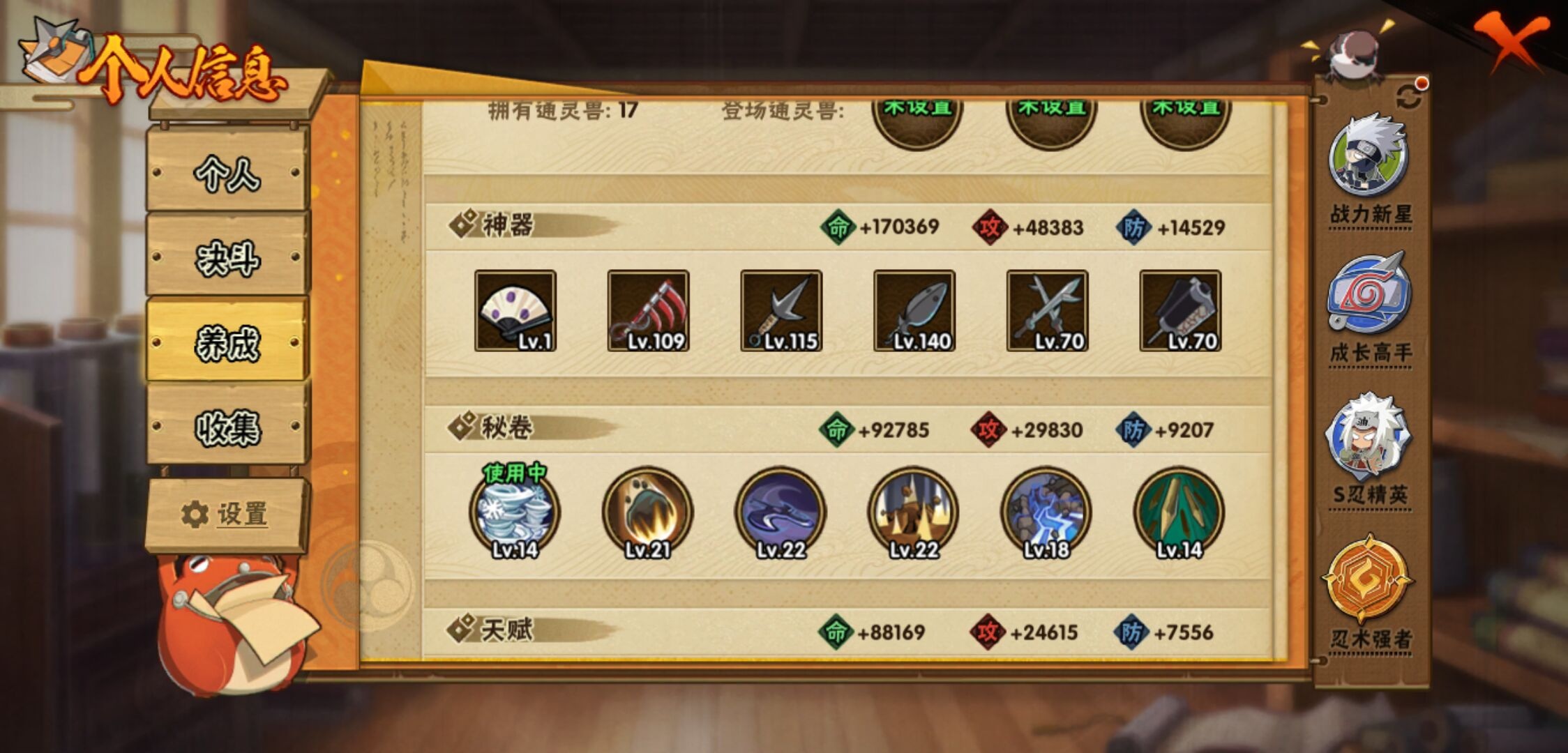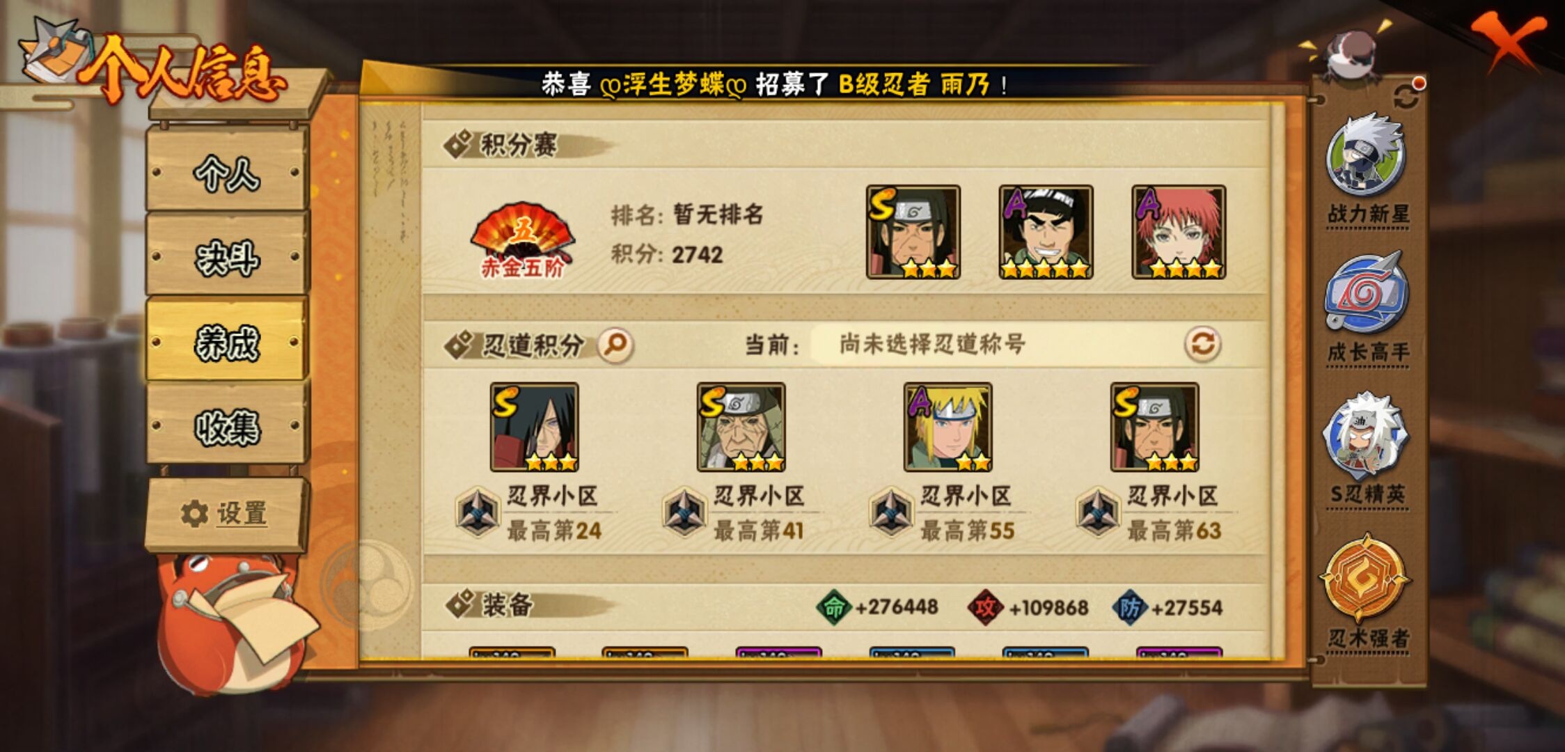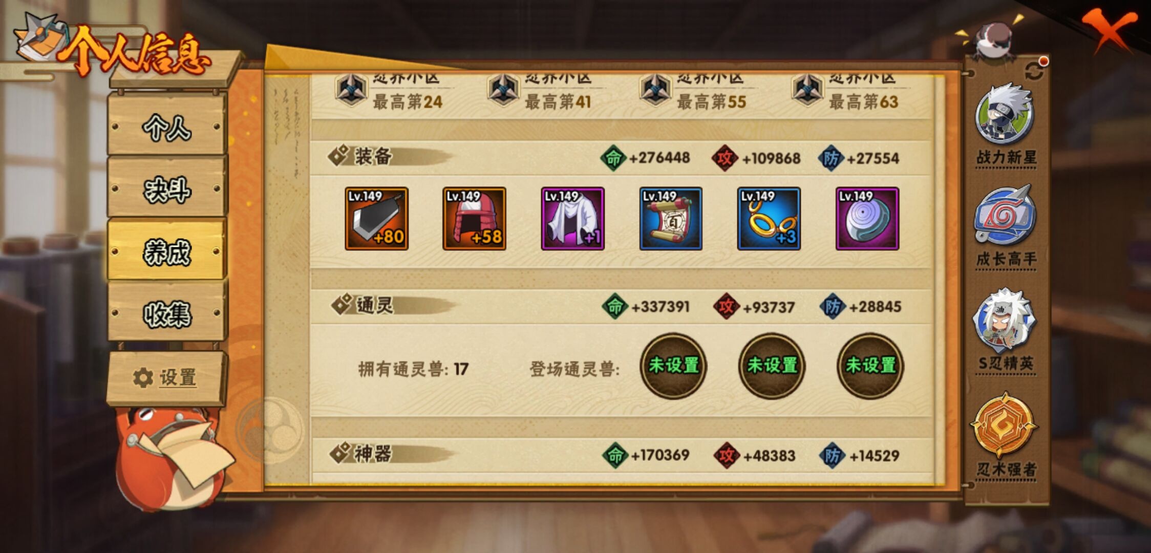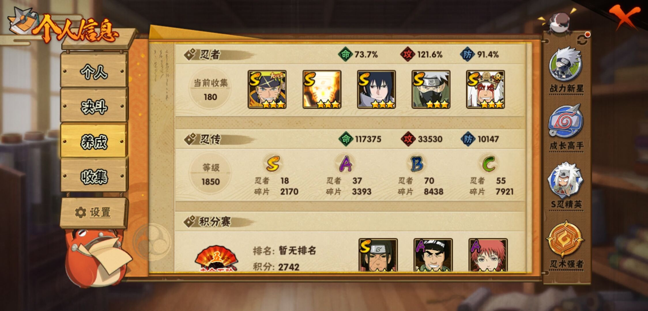 【火影忍者】【lyhy11314】战斗力:733w;段位:下忍2阶;本服排名:527;vip:v8级;s忍:18个;a忍:37个;通灵兽:17个,s忍:秽土转生解宇智波斑|忍界大战宇智波带土|须佐能乎旗木卡卡西|九喇嘛连结波风水门|天道佩恩|传说中的三忍自来也|漩涡鸣人宇智波佐助|秽土转生千手柱间|秽土转生宇智波鼬|永恒万花筒宇智波佐助|舞之豪杰自来也|大蛇丸(普通)|波风水门|秽土转生宇智波斑|须佐能乎宇智波鼬|死门迈特凯|九喇嘛连结漩涡鸣人|秽土转生猿飞日斩__a忍:青春爆炸迈特凯|仙人模式巳月|幻之真容旗木卡卡西|忍界大战李洛克|漂泊浪客佩恩六道|忍界大战日向宁次|四代目土影黑土|青年长门|秽土转生迪达拉|不风|忍界大战奇拉比|青年波风水门|青年艾|漂泊武士千手扉间|忍界大战旗木卡卡西|近松十人卫千代|须佐能乎宇智波佐助|九尾查克拉漩涡鸣人|晓大蛇丸|忍界大战秋道丁次|五代目水影照美冥|五代目雷影达鲁伊|死司凭血飞段|疾风传我爱罗 4星|飞段(普通) 4星|仙人模式漩涡鸣人|迈特凯(普通) 5星|宇智波鼬(普通)|干柿鬼鲛(普通) 3星|秽土转生桃地再不斩|蝎(普通) 4星|猿飞阿斯玛(普通) 5星|桃式显现漩涡博人|最终章日向雏田|六代目水影长十郎|不缘|宇智波泉奈__通灵兽:忍犬(普通)|蓝蛇|蛤蟆吉|忍龟|镰鼬|猿魔|山椒鱼|蜃|蛤蟆仙人|鲛鲨|砂之守鹤|蛤蟆健|蛞蝓(普通)|乌鸦(普通)|蛤蟆龙|蛤蟆广|乌鸦夏日限定