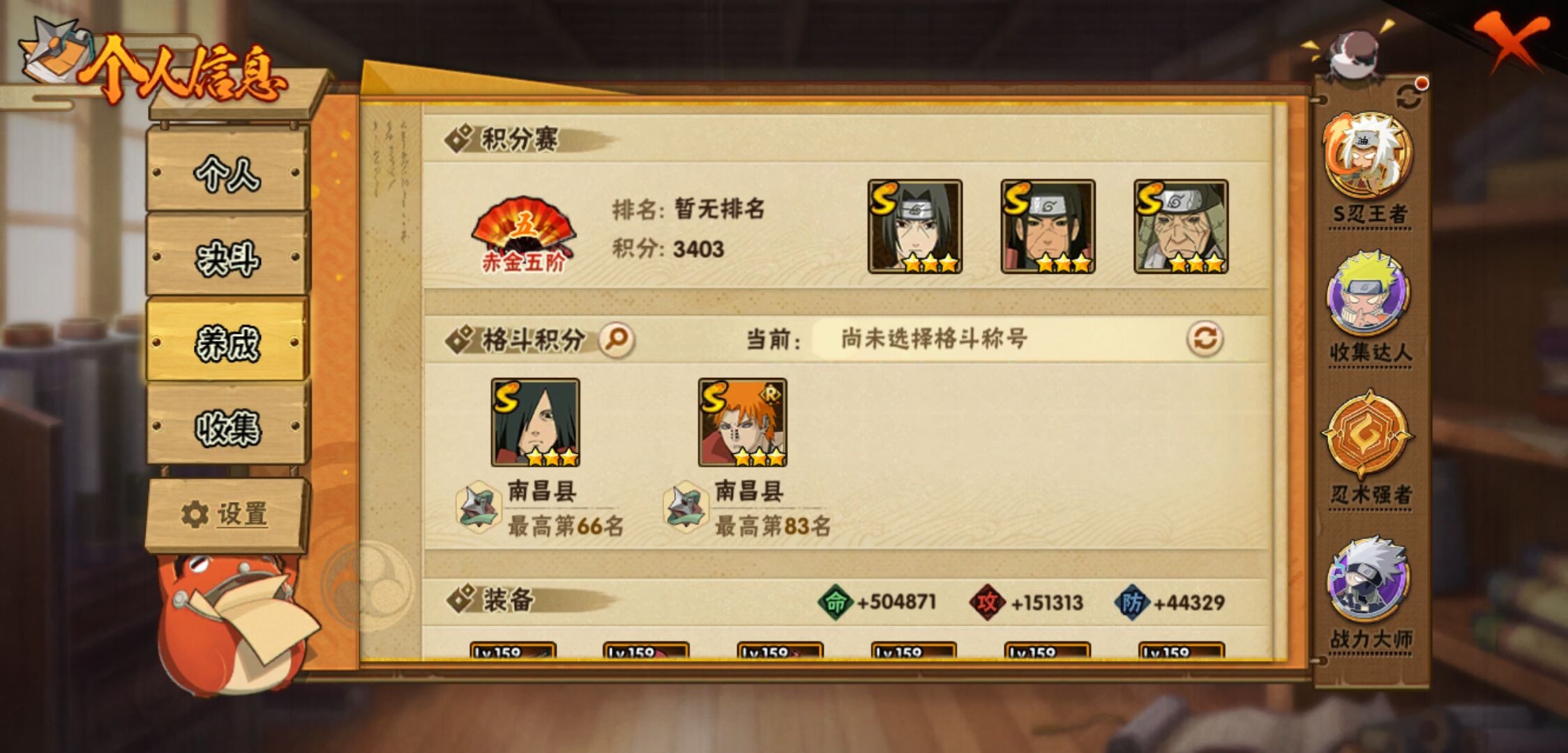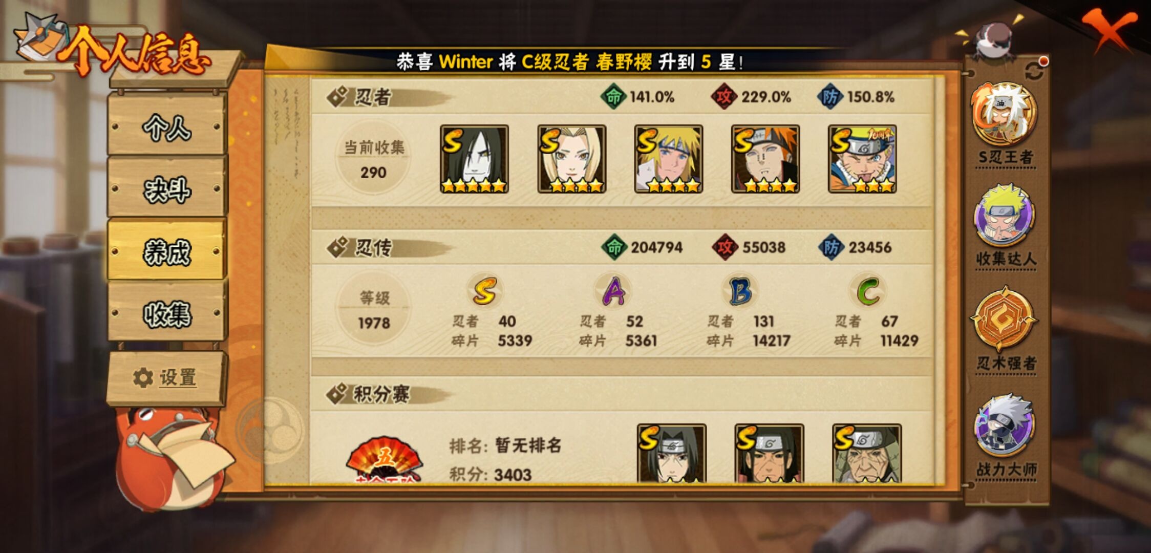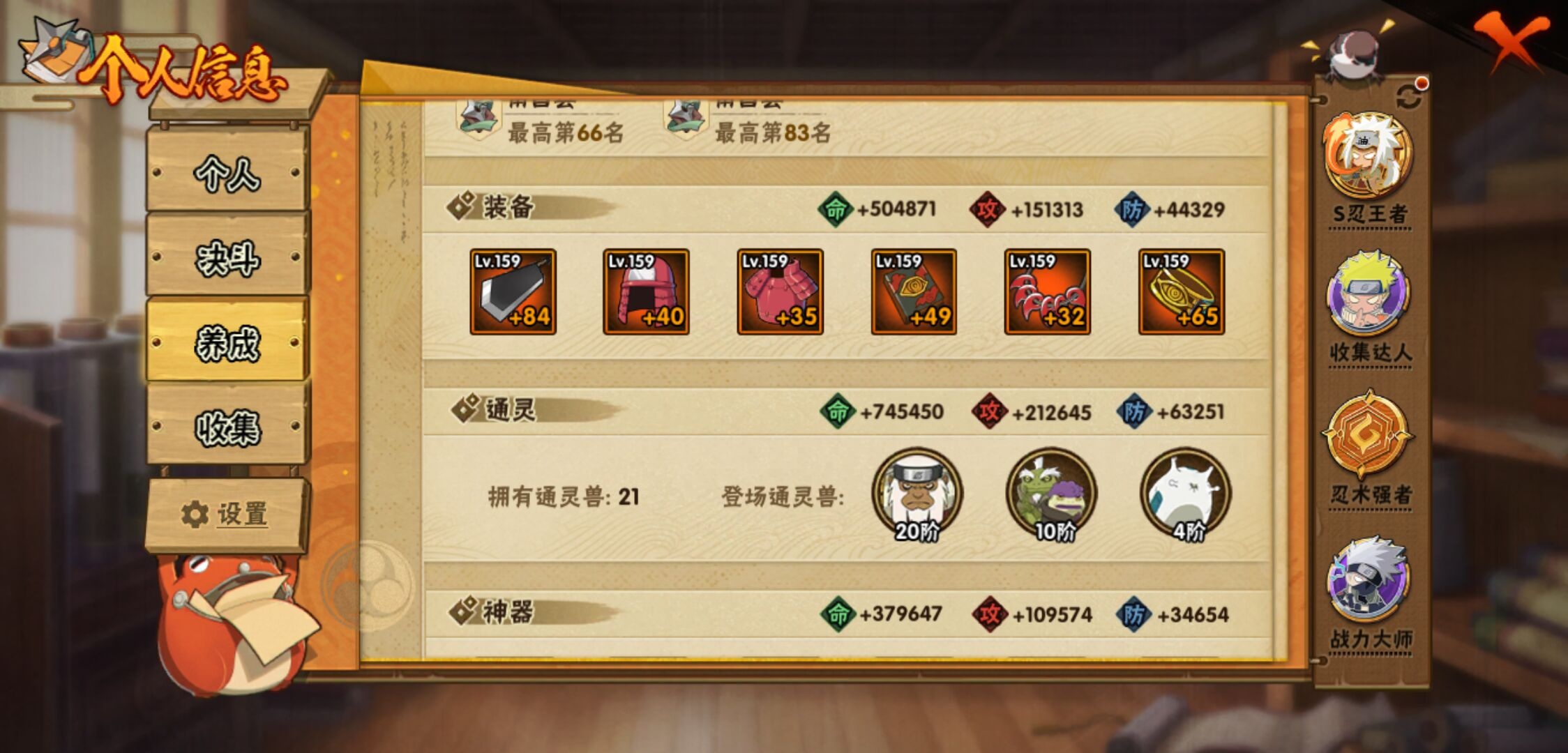 【火影忍者】【lyhy11324】战斗力:1749w;段位:下忍1阶;本服排名:217;vip:v11级;s忍:40个;a忍:52个;通灵兽:20个,s忍:秽土转生解宇智波斑|白面具宇智波斑|忍界大战宇智波带土|须佐能乎旗木卡卡西|秽土转生千手扉间|超佩恩天道|五影会谈宇智波斑|天道佩恩 4星|漩涡鸣人宇智波佐助|须佐能乎宇智波止水|秽土转生千手柱间|秽土转生宇智波鼬|永恒万花筒宇智波佐助|忍界大战艾|舞之豪杰自来也|大蛇丸(普通) 5星|纲手(普通) 4星|百豪纲手|波风水门 4星|秽土转生波风水门|千手扉间(普通)|千手柱间(普通)|秽土转生宇智波斑|宇智波斑(普通)|须佐能乎宇智波鼬|神秘面具男(普通)|秽土转生长门|秽土转生半藏|秽土转生金角银角|二代目土影无|二代目水影鬼灯幻月|四代目雷影艾|四代目风影罗砂|仙人模式药师兜|死门迈特凯|忍界大战春野樱|九喇嘛连结漩涡鸣人|猿飞日斩(普通)|秽土转生猿飞日斩|自来也(普通)__a忍:青春爆炸迈特凯|漂泊浪客宇智波带土|仙人模式巳月|幻之真容旗木卡卡西|忍界大战李洛克|秽土转生角都|忍界大战日向宁次|四代目土影黑土 3星|木叶上忍猿飞木叶丸|火之意志继承者卑留呼|青年长门|秽土转生迪达拉|宇智波止水(普通) 3星|不风|忍界大战奇拉比 3星|青年波风水门 3星|青年艾|近松十人卫千代|半蛇斗篷药师兜|须佐能乎宇智波佐助|九尾查克拉漩涡鸣人|晓大蛇丸|百豪春野樱|忍界大战秋道丁次|忍界大战我爱罗|奇拉比(普通)|万花筒写轮眼宇智波佐助|五代目水影照美冥|五代目雷影达鲁伊|死司凭血飞段 5星|角都(普通)|地怨虞角都|疾风传我爱罗 5星|迪达拉(普通)|飞段(普通) 5星|小南(普通)|仙人模式漩涡鸣人 3星|万花筒写轮眼旗木卡卡西|迈特凯(普通) 5星|宇智波鼬(普通) 3星|干柿鬼鲛(普通) 5星|蝎(普通) 5星|绯流琥蝎|猿飞阿斯玛(普通) 5星|桃式显现漩涡博人|最终章日向雏田|六代目水影长十郎 3星|不缘|宇智波泉奈|忍界大战土台|初始形态机械鸣人|侠隐江湖大野木__通灵兽:忍犬(普通)|蓝蛇|蛤蟆吉|忍龟|镰鼬|猿魔|山椒鱼|蜃|蛤蟆仙人|鲛鲨|蛤蟆健|乌鸦(普通)|蛤蟆龙|蛤蟆广|蛞蝓(普通)|怒鬼(普通)|梦貘|鹰|砂之守鹤|蜘蛛