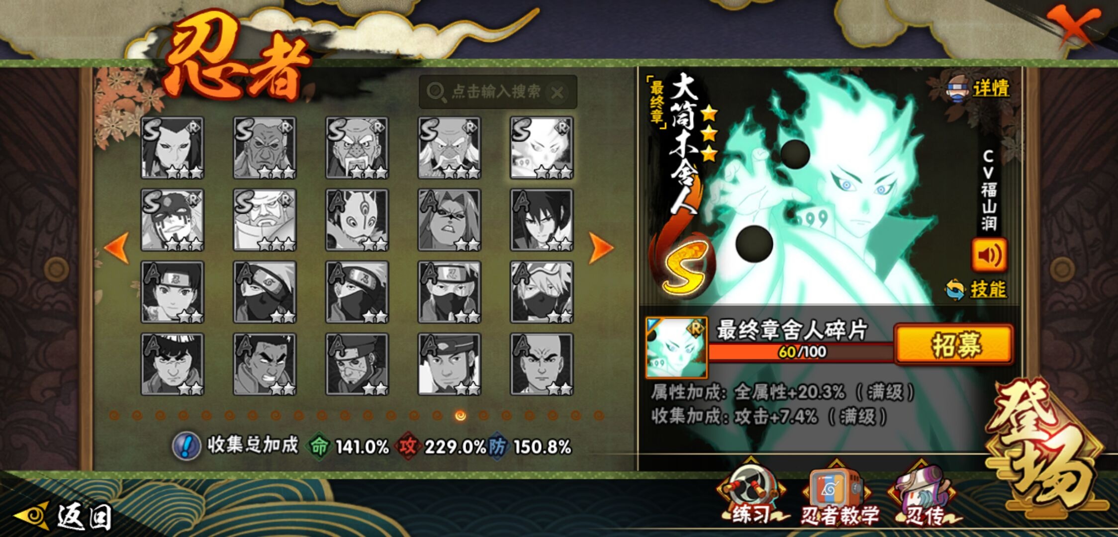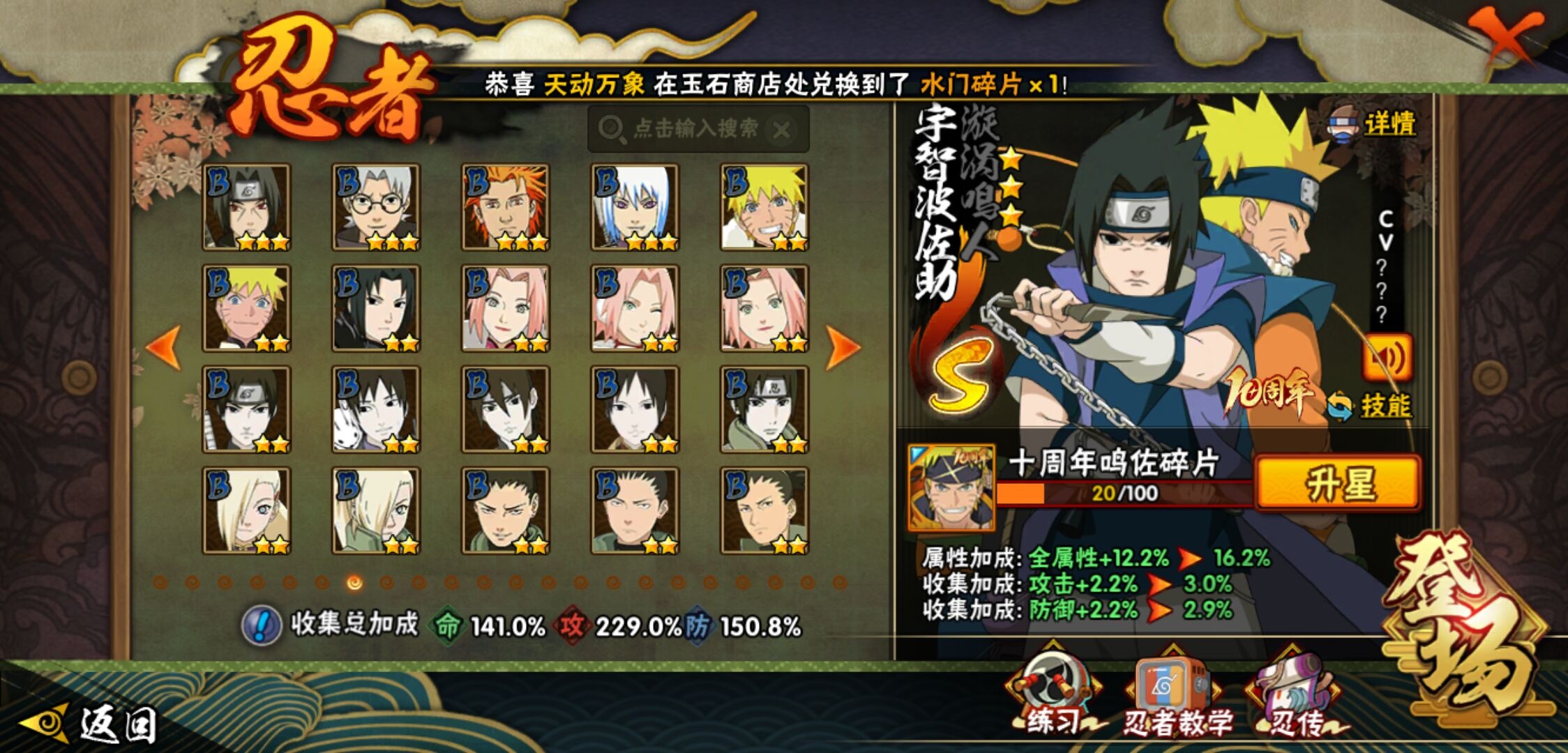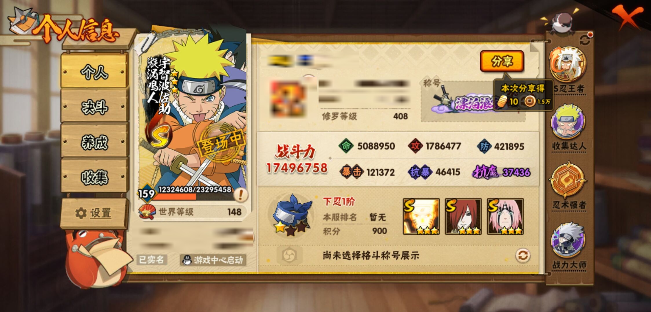 【火影忍者】【lyhy11324】战斗力:1749w;段位:下忍1阶;本服排名:217;vip:v11级;s忍:40个;a忍:52个;通灵兽:20个,s忍:秽土转生解宇智波斑|白面具宇智波斑|忍界大战宇智波带土|须佐能乎旗木卡卡西|秽土转生千手扉间|超佩恩天道|五影会谈宇智波斑|天道佩恩 4星|漩涡鸣人宇智波佐助|须佐能乎宇智波止水|秽土转生千手柱间|秽土转生宇智波鼬|永恒万花筒宇智波佐助|忍界大战艾|舞之豪杰自来也|大蛇丸(普通) 5星|纲手(普通) 4星|百豪纲手|波风水门 4星|秽土转生波风水门|千手扉间(普通)|千手柱间(普通)|秽土转生宇智波斑|宇智波斑(普通)|须佐能乎宇智波鼬|神秘面具男(普通)|秽土转生长门|秽土转生半藏|秽土转生金角银角|二代目土影无|二代目水影鬼灯幻月|四代目雷影艾|四代目风影罗砂|仙人模式药师兜|死门迈特凯|忍界大战春野樱|九喇嘛连结漩涡鸣人|猿飞日斩(普通)|秽土转生猿飞日斩|自来也(普通)__a忍:青春爆炸迈特凯|漂泊浪客宇智波带土|仙人模式巳月|幻之真容旗木卡卡西|忍界大战李洛克|秽土转生角都|忍界大战日向宁次|四代目土影黑土 3星|木叶上忍猿飞木叶丸|火之意志继承者卑留呼|青年长门|秽土转生迪达拉|宇智波止水(普通) 3星|不风|忍界大战奇拉比 3星|青年波风水门 3星|青年艾|近松十人卫千代|半蛇斗篷药师兜|须佐能乎宇智波佐助|九尾查克拉漩涡鸣人|晓大蛇丸|百豪春野樱|忍界大战秋道丁次|忍界大战我爱罗|奇拉比(普通)|万花筒写轮眼宇智波佐助|五代目水影照美冥|五代目雷影达鲁伊|死司凭血飞段 5星|角都(普通)|地怨虞角都|疾风传我爱罗 5星|迪达拉(普通)|飞段(普通) 5星|小南(普通)|仙人模式漩涡鸣人 3星|万花筒写轮眼旗木卡卡西|迈特凯(普通) 5星|宇智波鼬(普通) 3星|干柿鬼鲛(普通) 5星|蝎(普通) 5星|绯流琥蝎|猿飞阿斯玛(普通) 5星|桃式显现漩涡博人|最终章日向雏田|六代目水影长十郎 3星|不缘|宇智波泉奈|忍界大战土台|初始形态机械鸣人|侠隐江湖大野木__通灵兽:忍犬(普通)|蓝蛇|蛤蟆吉|忍龟|镰鼬|猿魔|山椒鱼|蜃|蛤蟆仙人|鲛鲨|蛤蟆健|乌鸦(普通)|蛤蟆龙|蛤蟆广|蛞蝓(普通)|怒鬼(普通)|梦貘|鹰|砂之守鹤|蜘蛛