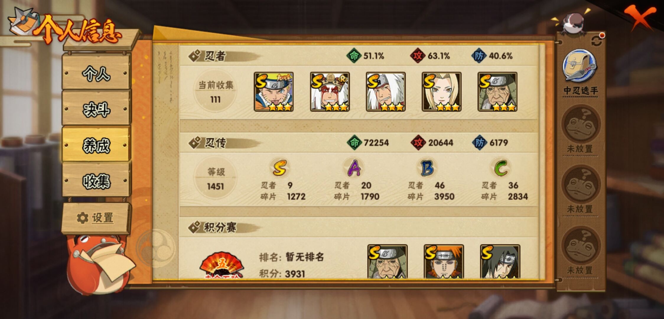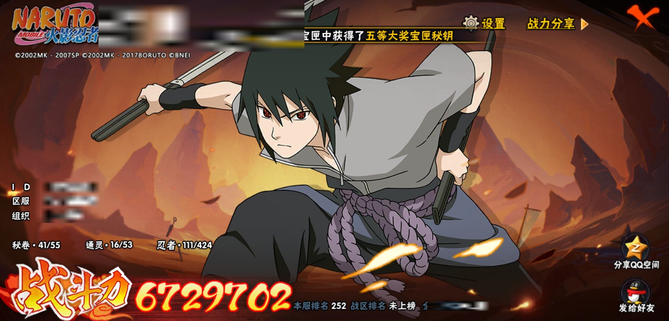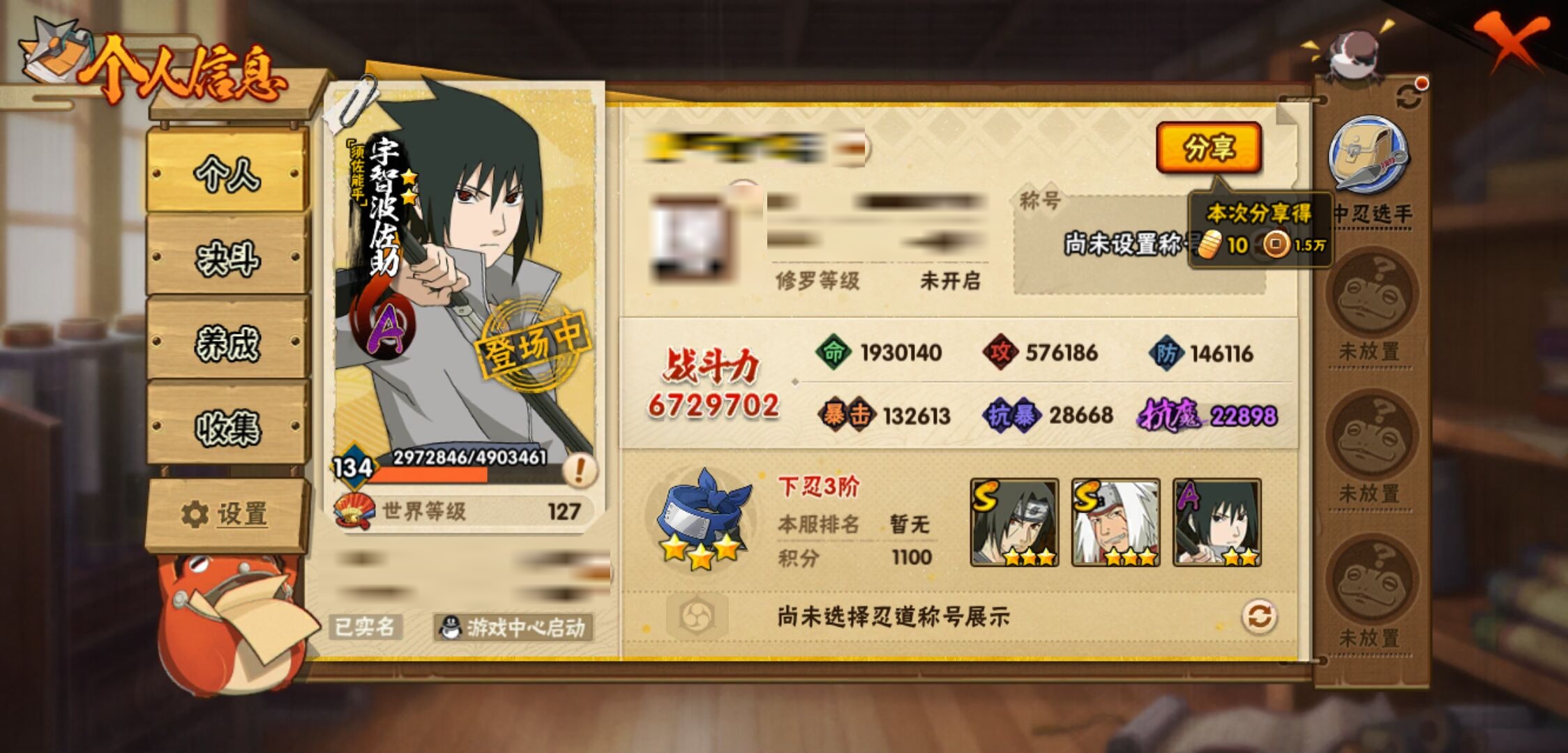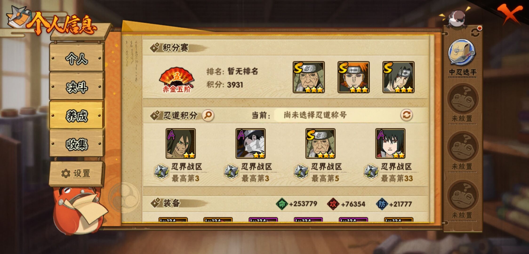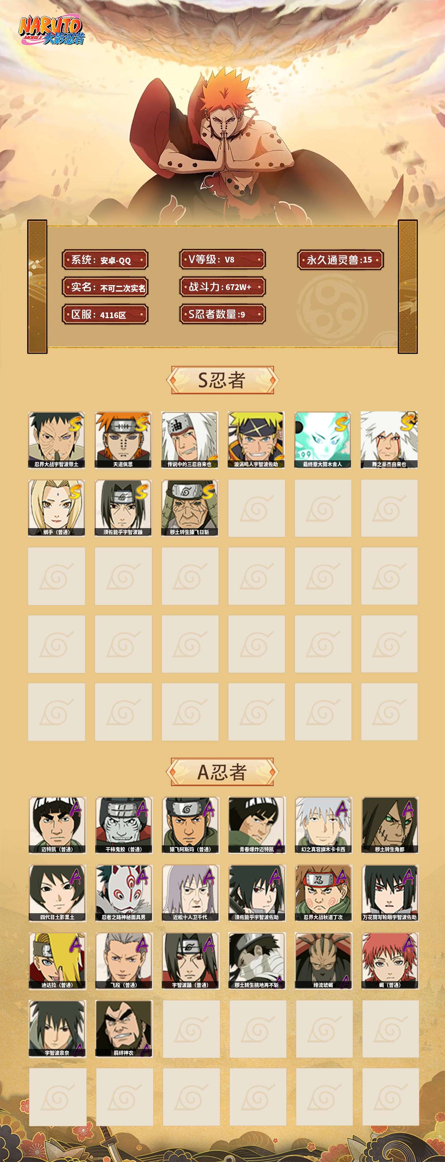 【火影忍者】【lyhy11267】战斗力:672w;段位:下忍3阶;本服排名:252;vip:v8级;s忍:9个;a忍:20个;通灵兽:15个,s忍:忍界大战宇智波带土|天道佩恩|传说中的三忍自来也|漩涡鸣人宇智波佐助|最终章大筒木舍人|舞之豪杰自来也|纲手(普通)|须佐能乎宇智波鼬|秽土转生猿飞日斩__a忍:青春爆炸迈特凯|幻之真容旗木卡卡西|秽土转生角都|四代目土影黑土|忍者之路神秘面具男|近松十人卫千代|须佐能乎宇智波佐助|忍界大战秋道丁次|万花筒写轮眼宇智波佐助|迪达拉(普通)|飞段(普通)|迈特凯(普通) 5星|宇智波鼬(普通)|干柿鬼鲛(普通) 4星|秽土转生桃地再不斩|绯流琥蝎|蝎(普通)|猿飞阿斯玛(普通) 4星|宇智波泉奈|羁绊神农__通灵兽:忍犬(普通)|蓝蛇|蛤蟆吉|忍龟|砂之守鹤|镰鼬|猿魔|山椒鱼|蜃|蛤蟆仙人|鲛鲨|蛤蟆健|乌鸦(普通)|蛤蟆龙|蛞蝓(普通)