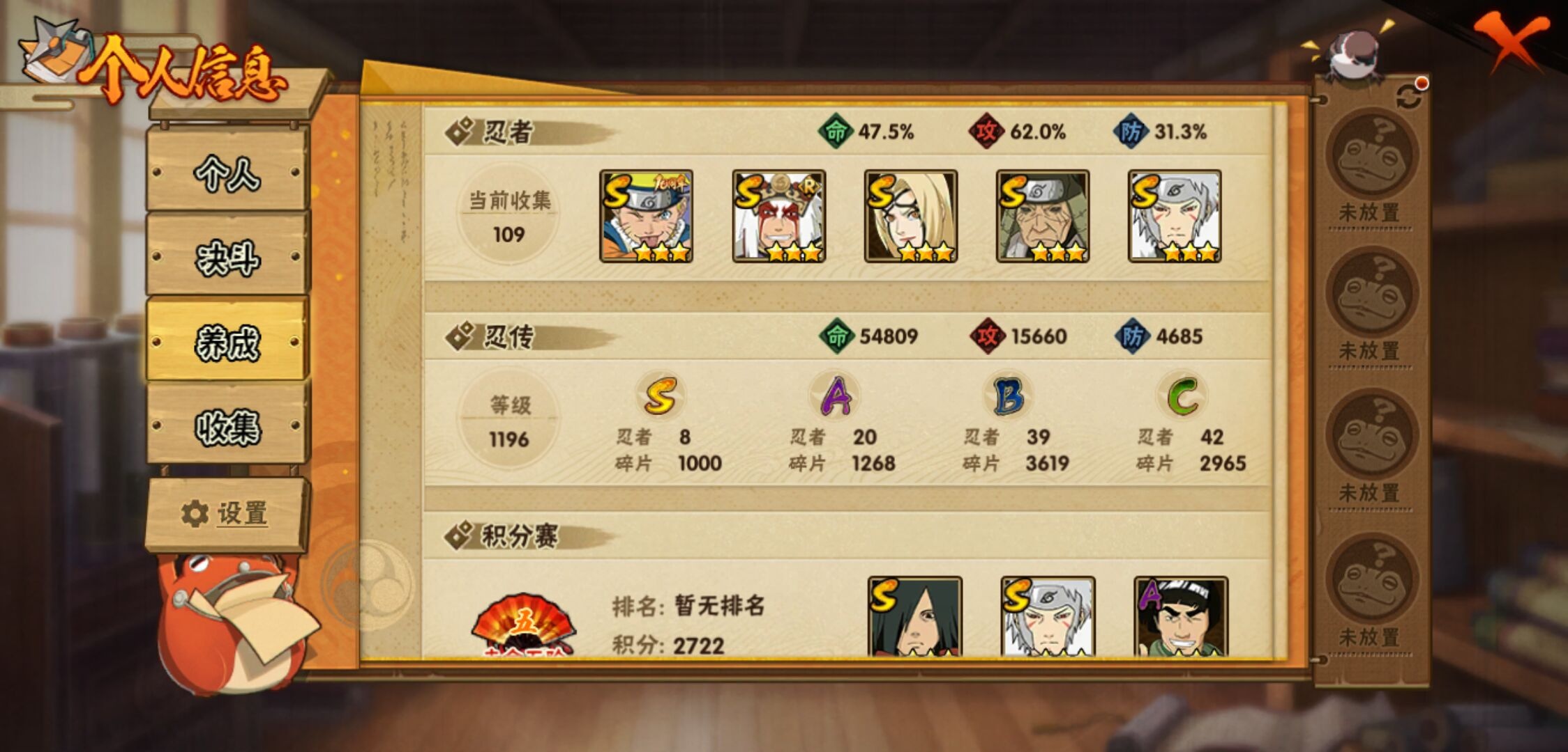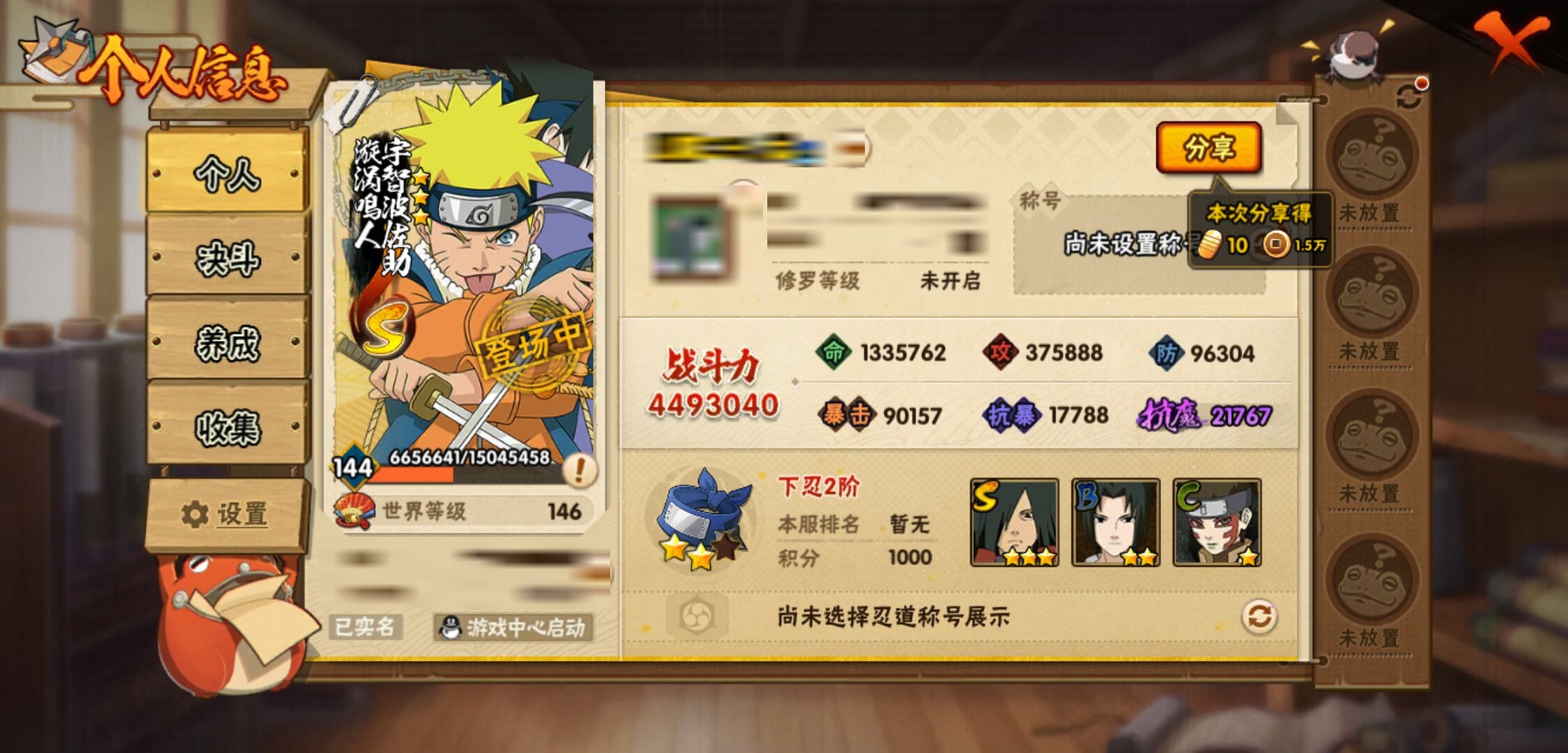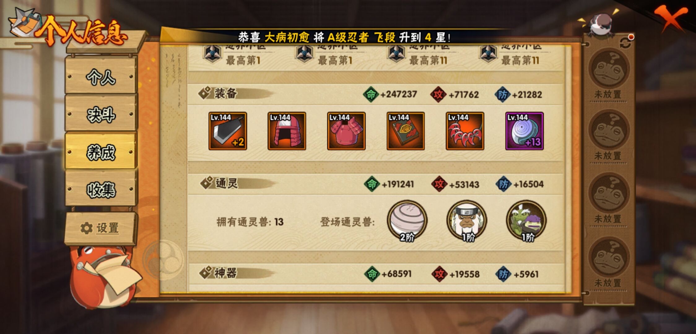 【火影忍者】【lyhy11349】战斗力:449w;段位:下忍2阶;本服排名:1641;vip:v5级;s忍:8个;a忍:20个;通灵兽:13个,s忍:十尾人柱力宇智波带土|漩涡鸣人宇智波佐助|舞之豪杰自来也|百豪纲手|千手扉间(普通)|宇智波斑(普通)|须佐能乎宇智波鼬|秽土转生猿飞日斩__a忍:青春爆炸迈特凯|妖怪奇谭纲手|仙人模式巳月|加藤断|须佐能乎宇智波佐助|九尾查克拉漩涡鸣人|晓大蛇丸|火影继承人猿飞日斩|忍界大战我爱罗|奇拉比(普通)|五代目水影照美冥|死司凭血飞段|角都(普通)|疾风传我爱罗|飞段(普通) 3星|万花筒写轮眼旗木卡卡西|迈特凯(普通) 3星|干柿鬼鲛(普通)|蝎(普通)|猿飞阿斯玛(普通)__通灵兽:忍犬(普通)|蓝蛇|蛤蟆吉|忍龟|镰鼬|猿魔|山椒鱼|蜃|蛤蟆仙人|鲛鲨|蛤蟆健|乌鸦(普通)|砂之守鹤