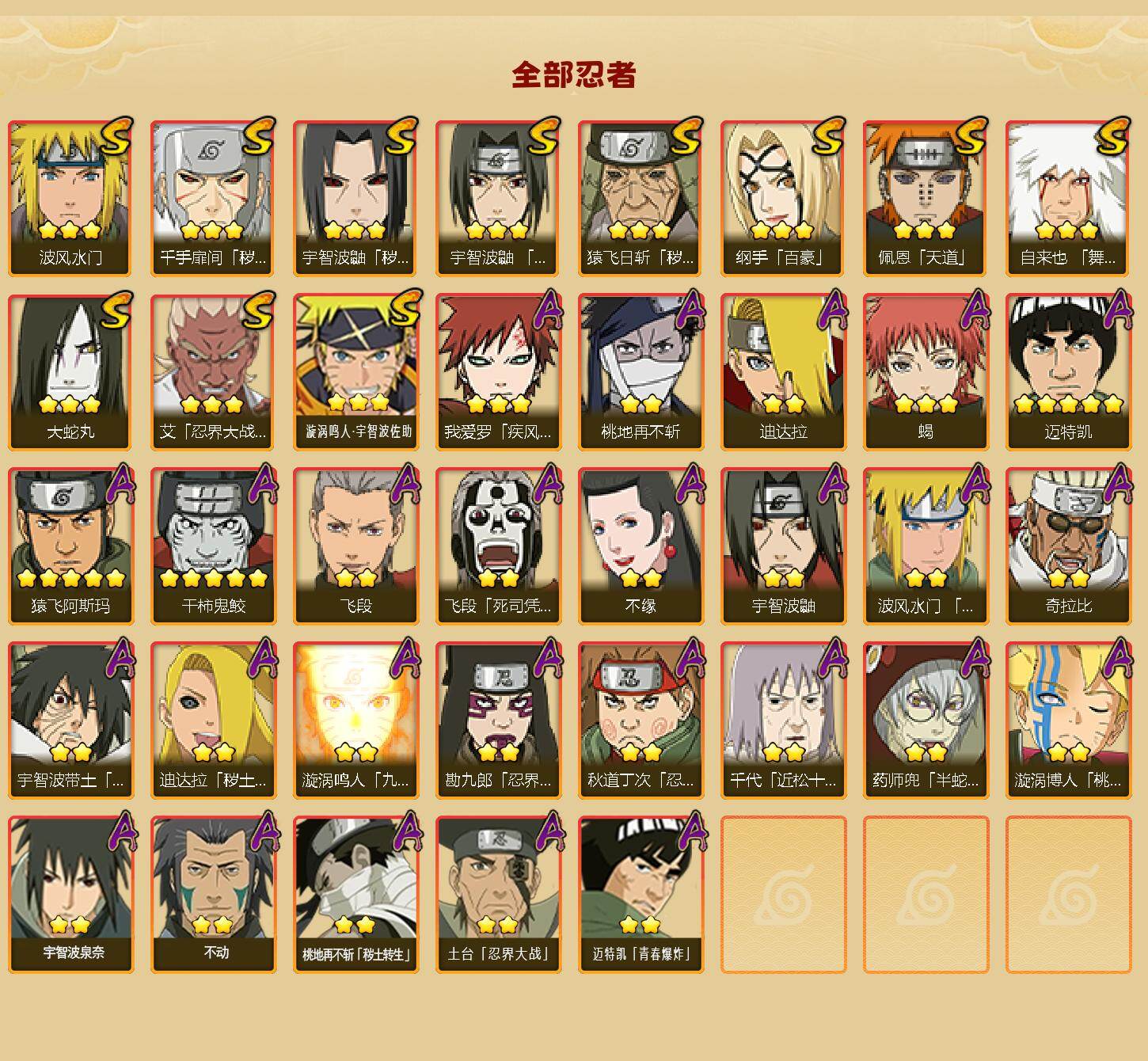 【hy567】11s级忍者数-26a级忍者数 【s级忍者】:猿飞日斩「秽土转生」3星,千手扉间「秽土转生」3星,宇智波鼬「秽土转生」3星,艾「忍界大战」3星,宇智波鼬「须佐能乎」3星,自来也「舞之豪杰」3星,大蛇丸3星,纲手「百豪」3星,波风水门3星,佩恩「天道」3星,漩涡鸣人·宇智波佐助3星 【a级忍者】:波风水门「青年」2星,迪达拉2星,迪达拉「秽土转生」2星,奇拉比2星,飞段2星,飞段「死司凭血」2星,干柿鬼鲛5星,漩涡博人「桃式显现」2星,漩涡鸣人「九尾查克拉」2星,迈特凯5星,桃地再不斩2星,桃地再不斩「秽土转生」2星,我爱罗「疾风传」3星,蝎3星,猿飞阿斯玛5星,宇智波鼬2星,药师兜「半蛇斗篷」2星,宇智波带土「暴怒」2星,勘九郎「忍界大战」2星,秋道丁次「忍界大战」2星,千代「近松十人卫」2星,土台「忍界大战」2星,不缘2星,宇智波泉奈2星,不动2星,迈特凯「青春爆炸」2星