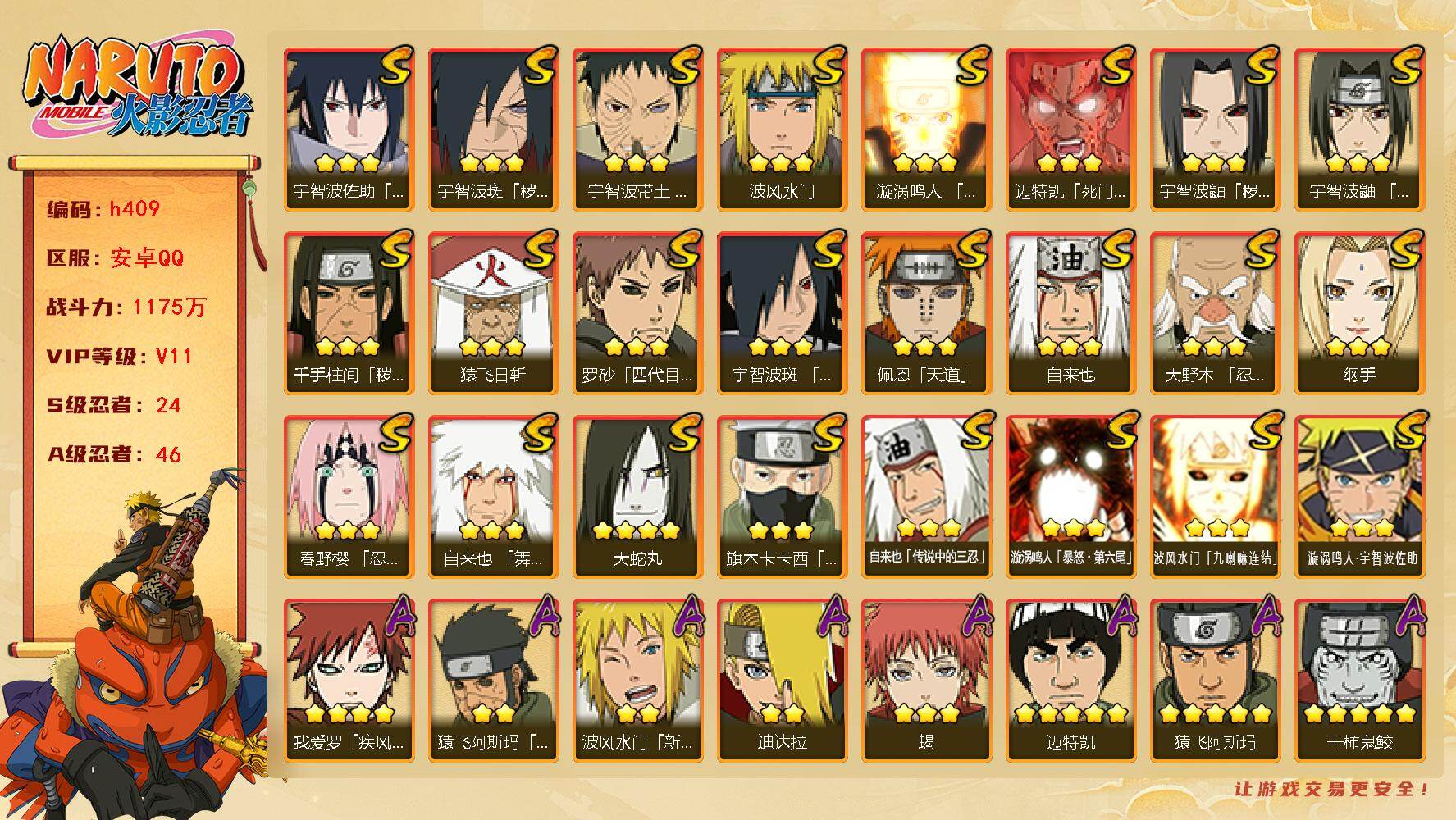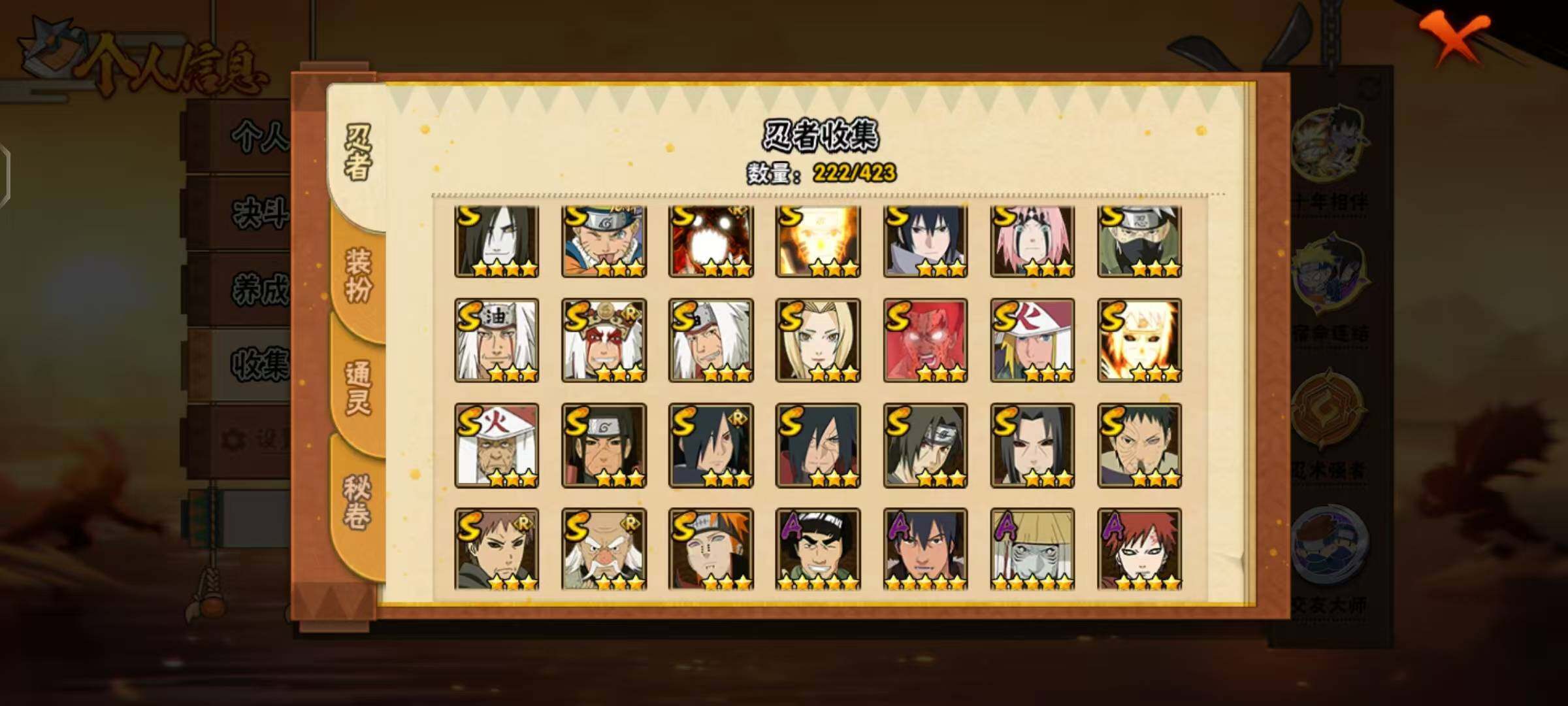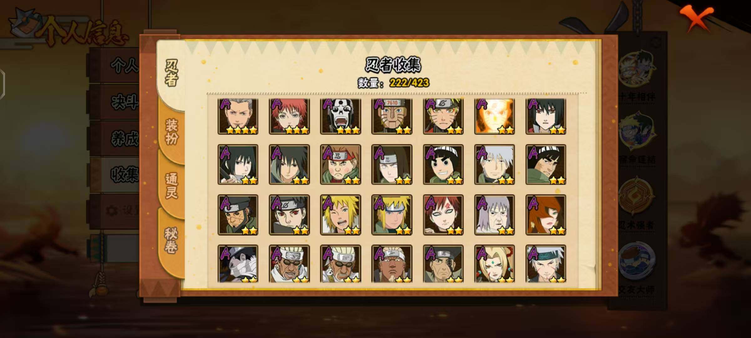[16440232]24s级忍者数-46a级忍者数 【s级忍者】:千手柱间「秽土转生」3星,宇智波鼬「秽土转生」3星,宇智波斑「秽土转生·解」3星,大野木「忍界大战」3星,春野樱「忍界大战」3星,宇智波带土「忍界大战」3星,宇智波鼬「须佐能乎」3星,旗木卡卡西「须佐能乎」3星,宇智波斑「木叶创立」3星,罗砂「四代目风影」3星,自来也3星,自来也「舞之豪杰」3星,大蛇丸4星,自来也「传说中的三忍」3星,纲手3星,猿飞日斩3星,波风水门3星,漩涡鸣人「九喇嘛连结」3星,迈特凯「死门」3星,佩恩「天道」3星,宇智波佐助「永恒万花筒」3星,漩涡鸣人「暴怒·第六尾」3星,波风水门「九喇嘛连结」3星,漩涡鸣人·宇智波佐助3星 【a级忍者】:艾「青年」2星,长门「青年」2星,波风水门「青年」2星,波风水门「新春限定」2星,达鲁伊「博人传」2星,迪达拉2星,奇拉比2星,奇拉比「忍界大战」2星,飞段4星,飞段「死司凭血」3星,干柿鬼鲛5星,漩涡博人「桃式显现」2星,漩涡鸣人「仙人模式」2星,漩涡鸣人「九尾查克拉」2星,机械鸣人「初始形态」2星,迈特凯5星,旗木卡卡西「幻之真容」2星,桃地再不斩「秽土转生」2星,我爱罗「疾风传」4星,我爱罗「忍界大战」2星,蝎3星,蝎「绯流琥」2星,小南2星,角都「秽土转生」2星,猿飞阿斯玛5星,猿飞阿斯玛「秽土转生」2星,宇智波止水2星,宇智波鼬2星,宇智波鼬「新春限定」2星,宇智波佐助「须佐能乎」2星,宇智波佐助「万花筒写轮眼」2星,药师兜「半蛇斗篷」2星,照美冥「夏日泳装」2星,日向宁次「忍界大战」2星,长十郎「六代目水影」2星,李洛克「忍界大战」2星,黑土「博人传」2星,千手扉间「漂泊武士」2星,秋道丁次「忍界大战」2星,千代「近松十人卫」2星,神农「羁绊」2星,土台「忍界大战」2星,宇智波泉奈2星,巳月「仙人模式」2星,纲手「妖怪奇谭」2星,迈特凯「青春爆炸」2星