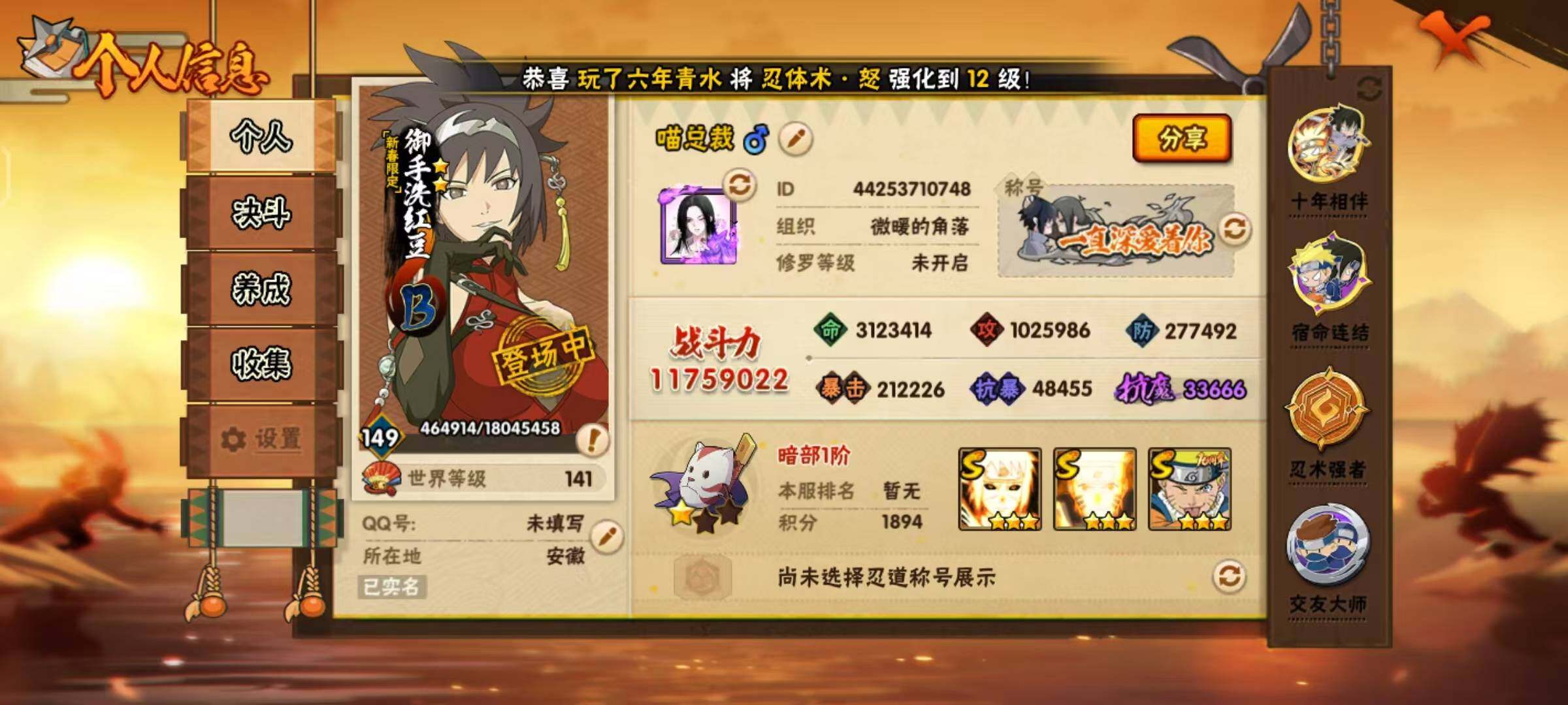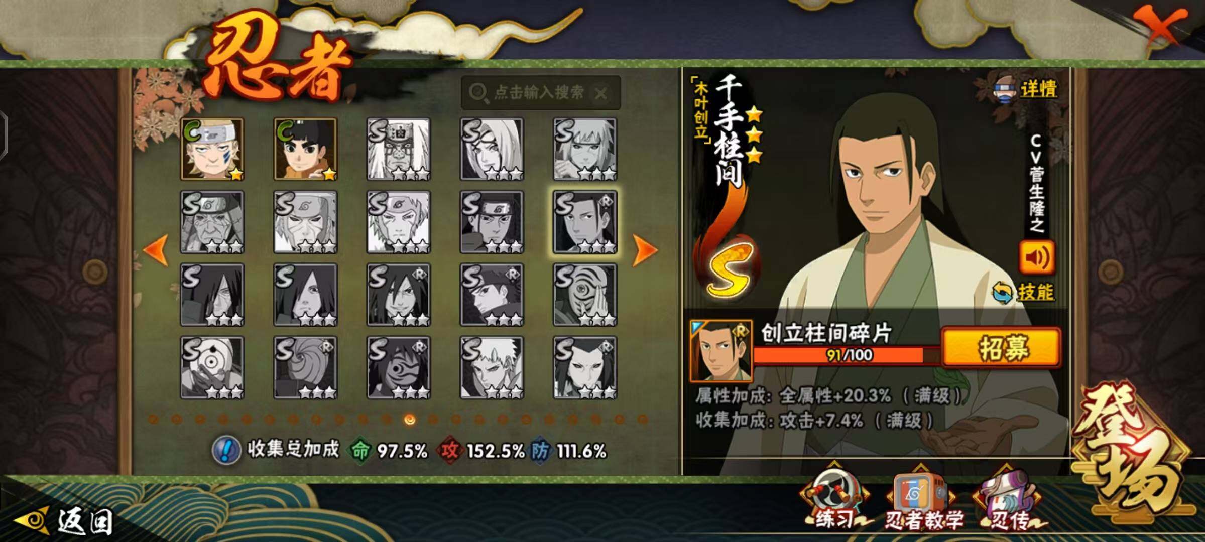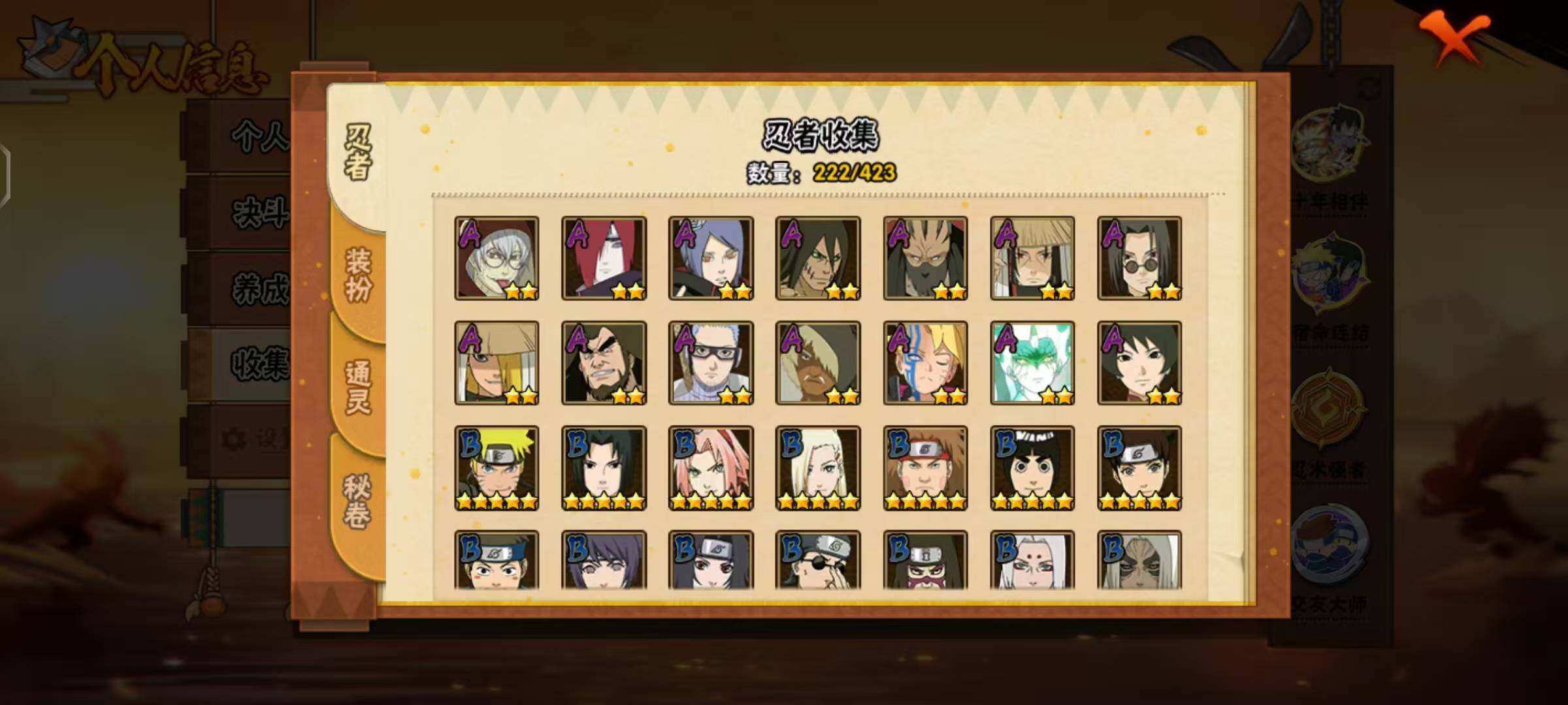 [16440232]24s级忍者数-46a级忍者数 【s级忍者】:千手柱间「秽土转生」3星,宇智波鼬「秽土转生」3星,宇智波斑「秽土转生·解」3星,大野木「忍界大战」3星,春野樱「忍界大战」3星,宇智波带土「忍界大战」3星,宇智波鼬「须佐能乎」3星,旗木卡卡西「须佐能乎」3星,宇智波斑「木叶创立」3星,罗砂「四代目风影」3星,自来也3星,自来也「舞之豪杰」3星,大蛇丸4星,自来也「传说中的三忍」3星,纲手3星,猿飞日斩3星,波风水门3星,漩涡鸣人「九喇嘛连结」3星,迈特凯「死门」3星,佩恩「天道」3星,宇智波佐助「永恒万花筒」3星,漩涡鸣人「暴怒·第六尾」3星,波风水门「九喇嘛连结」3星,漩涡鸣人·宇智波佐助3星 【a级忍者】:艾「青年」2星,长门「青年」2星,波风水门「青年」2星,波风水门「新春限定」2星,达鲁伊「博人传」2星,迪达拉2星,奇拉比2星,奇拉比「忍界大战」2星,飞段4星,飞段「死司凭血」3星,干柿鬼鲛5星,漩涡博人「桃式显现」2星,漩涡鸣人「仙人模式」2星,漩涡鸣人「九尾查克拉」2星,机械鸣人「初始形态」2星,迈特凯5星,旗木卡卡西「幻之真容」2星,桃地再不斩「秽土转生」2星,我爱罗「疾风传」4星,我爱罗「忍界大战」2星,蝎3星,蝎「绯流琥」2星,小南2星,角都「秽土转生」2星,猿飞阿斯玛5星,猿飞阿斯玛「秽土转生」2星,宇智波止水2星,宇智波鼬2星,宇智波鼬「新春限定」2星,宇智波佐助「须佐能乎」2星,宇智波佐助「万花筒写轮眼」2星,药师兜「半蛇斗篷」2星,照美冥「夏日泳装」2星,日向宁次「忍界大战」2星,长十郎「六代目水影」2星,李洛克「忍界大战」2星,黑土「博人传」2星,千手扉间「漂泊武士」2星,秋道丁次「忍界大战」2星,千代「近松十人卫」2星,神农「羁绊」2星,土台「忍界大战」2星,宇智波泉奈2星,巳月「仙人模式」2星,纲手「妖怪奇谭」2星,迈特凯「青春爆炸」2星