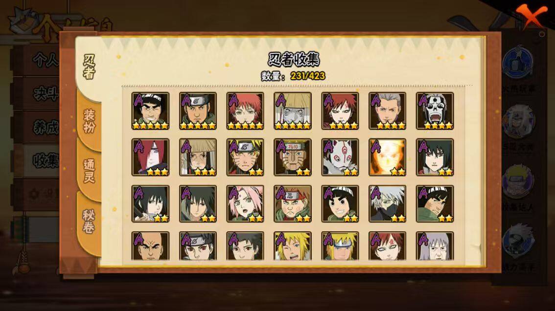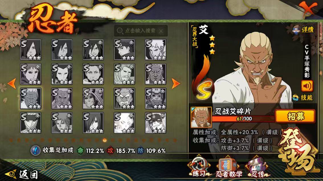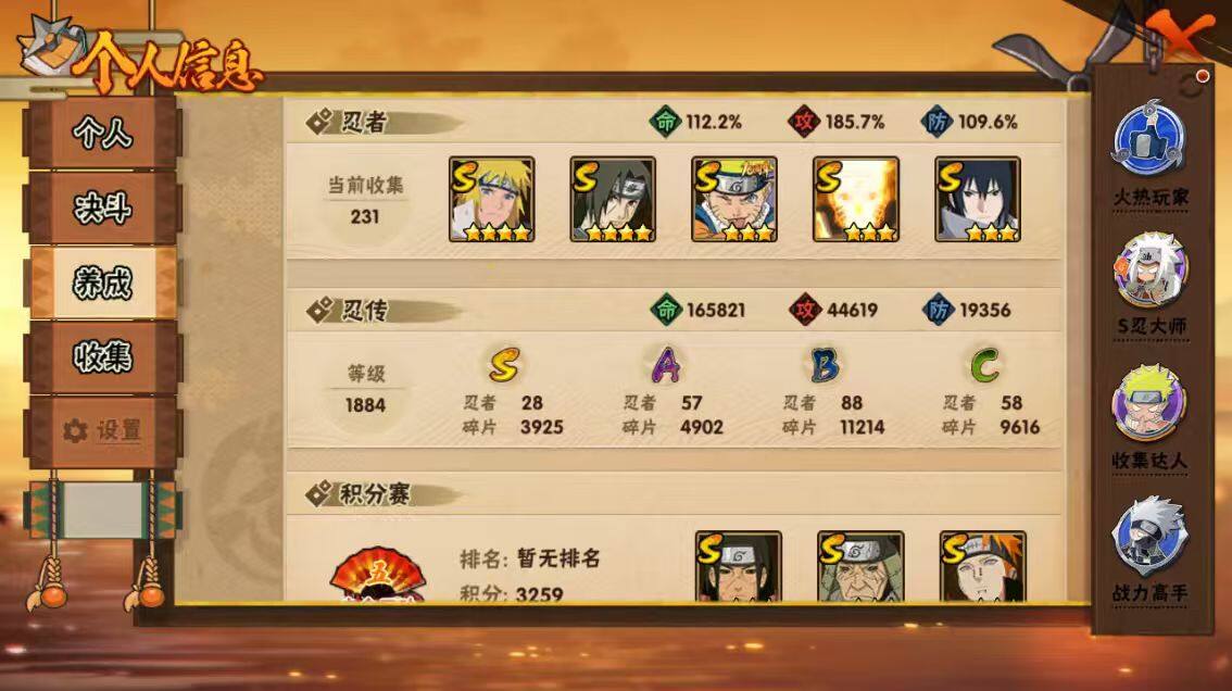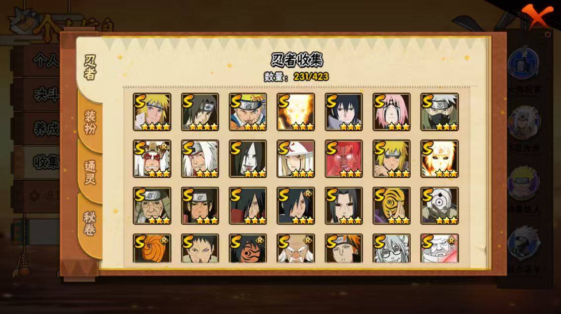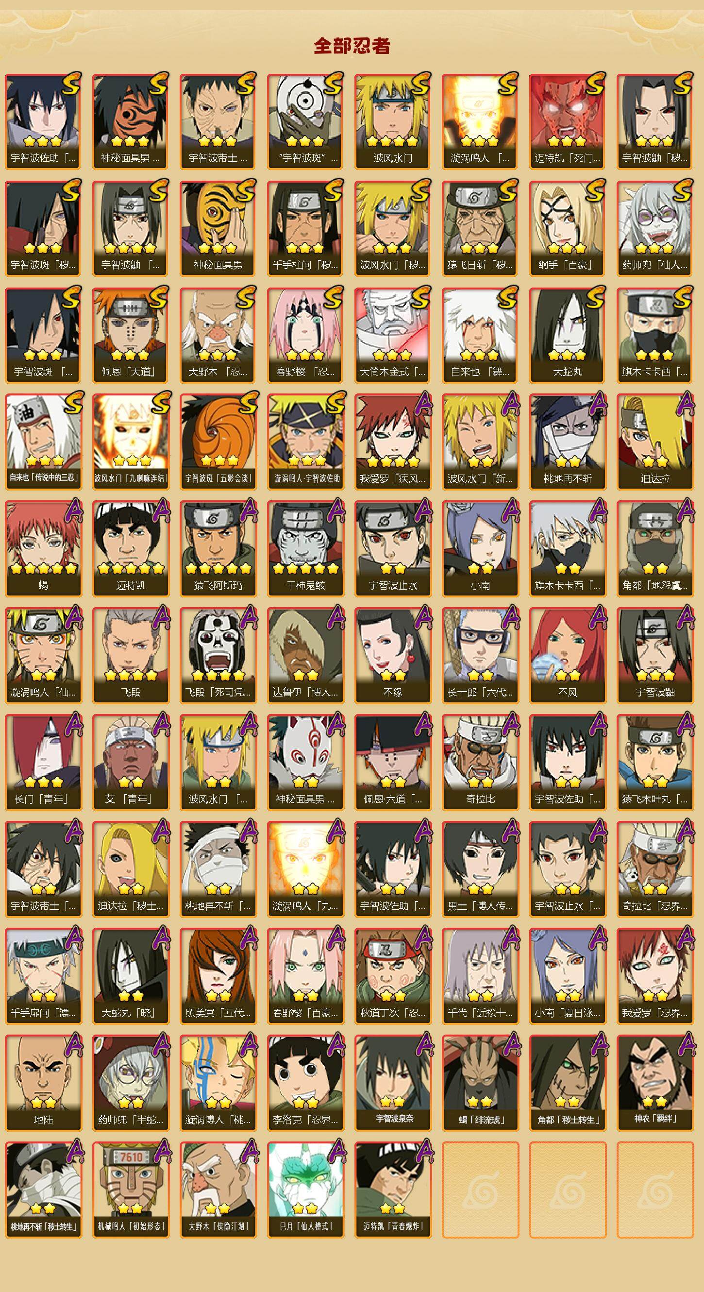 [16445955]28s级忍者数-57a级忍者数 【s级忍者】:猿飞日斩「秽土转生」3星,波风水门「秽土转生」3星,千手柱间「秽土转生」3星,宇智波鼬「秽土转生」3星,宇智波斑「秽土转生」3星,大野木「忍界大战」3星,春野樱「忍界大战」3星,宇智波带土「忍界大战」3星,宇智波鼬「须佐能乎」4星,旗木卡卡西「须佐能乎」3星,宇智波斑「木叶创立」3星,自来也「舞之豪杰」3星,大蛇丸3星,自来也「传说中的三忍」3星,纲手「百豪」3星,波风水门4星,药师兜「仙人模式」3星,神秘面具男3星,神秘面具男「红夜之刃」3星,漩涡鸣人「九喇嘛连结」3星,迈特凯「死门」3星,佩恩「天道」3星,宇智波佐助「永恒万花筒」3星,宇智波斑 「白面具」3星宇智波斑「白面具」,大筒木金式3星,波风水门「九喇嘛连结」3星,宇智波斑「五影会谈」3星,漩涡鸣人·宇智波佐助3星 【a级忍者】:艾「青年」2星,长门「青年」3星,波风水门「青年」2星,波风水门「新春限定」2星,达鲁伊「博人传」2星,迪达拉2星,迪达拉「秽土转生」2星,大蛇丸「晓」2星,奇拉比2星,奇拉比「忍界大战」2星,飞段4星,飞段「死司凭血」4星,干柿鬼鲛5星,漩涡博人「桃式显现」2星,漩涡鸣人「仙人模式」2星,漩涡鸣人「九尾查克拉」2星,机械鸣人「初始形态」2星,迈特凯5星,旗木卡卡西「万花筒写轮眼」2星,桃地再不斩2星,桃地再不斩「漂泊武士」2星,桃地再不斩「秽土转生」2星,我爱罗「疾风传」4星,我爱罗「忍界大战」2星,蝎5星,蝎「绯流琥」2星,小南2星,小南「夏日泳装」2星,角都「地怨虞」2星,角都「秽土转生」2星,猿飞阿斯玛5星,宇智波止水2星,宇智波止水「新春限定」2星,宇智波鼬3星,宇智波佐助「须佐能乎」2星,宇智波佐助「万花筒写轮眼」2星,药师兜「半蛇斗篷」2星,照美冥「五代目水影」2星,宇智波带土「暴怒」2星,长十郎「六代目水影」2星,神秘面具男「忍者之路」2星,佩恩·六道「漂泊浪客」2星,李洛克「忍界大战」2星,猿飞木叶丸「博人传」2星,黑土「博人传」