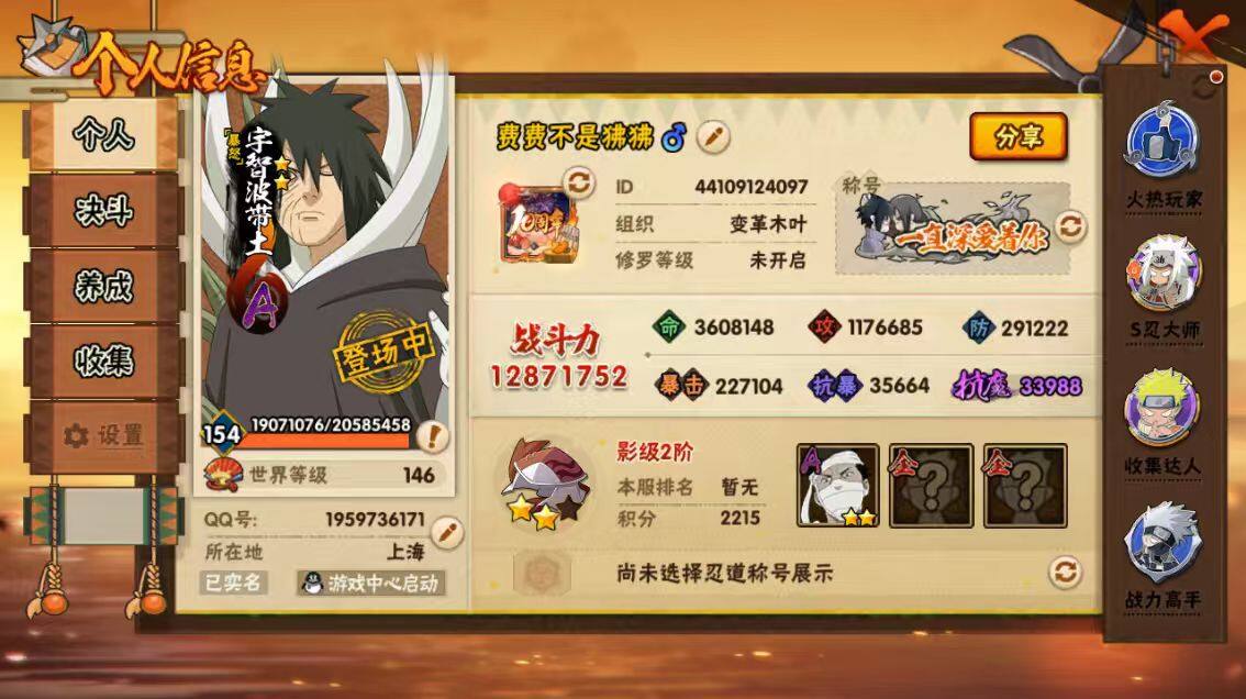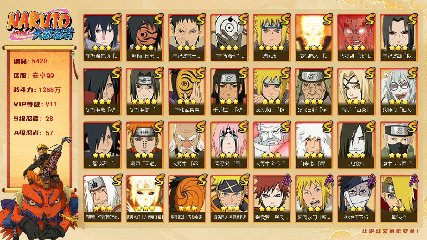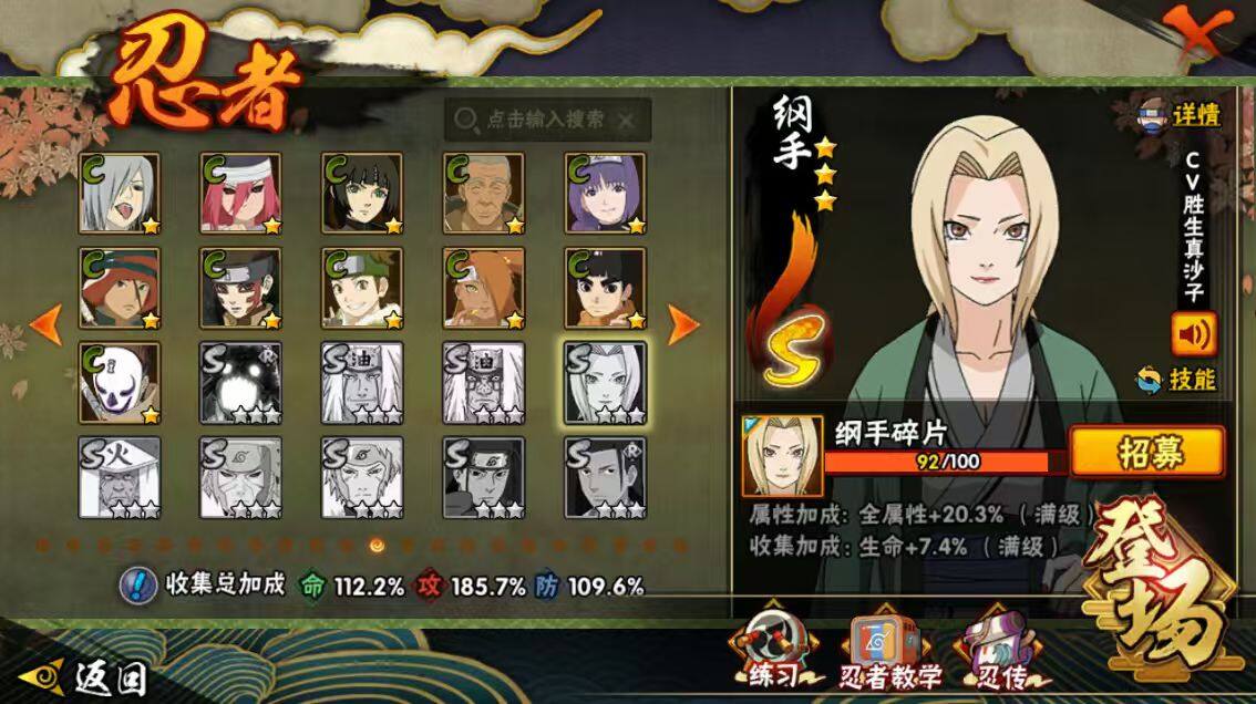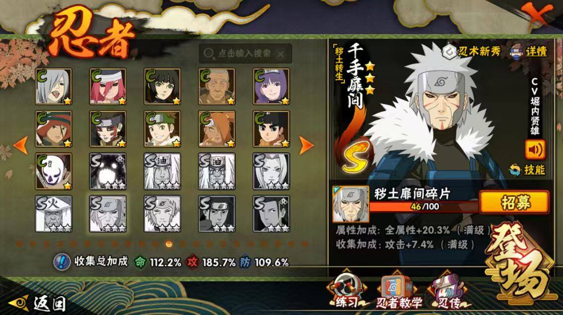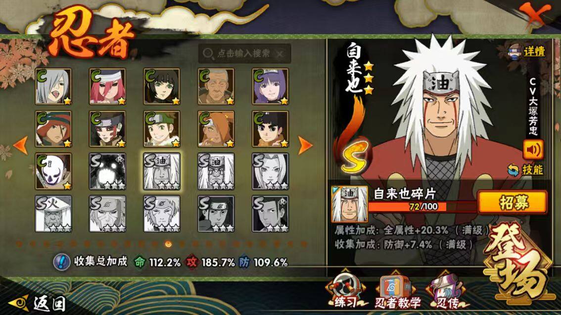 [16445955]28s级忍者数-57a级忍者数 【s级忍者】:猿飞日斩「秽土转生」3星,波风水门「秽土转生」3星,千手柱间「秽土转生」3星,宇智波鼬「秽土转生」3星,宇智波斑「秽土转生」3星,大野木「忍界大战」3星,春野樱「忍界大战」3星,宇智波带土「忍界大战」3星,宇智波鼬「须佐能乎」4星,旗木卡卡西「须佐能乎」3星,宇智波斑「木叶创立」3星,自来也「舞之豪杰」3星,大蛇丸3星,自来也「传说中的三忍」3星,纲手「百豪」3星,波风水门4星,药师兜「仙人模式」3星,神秘面具男3星,神秘面具男「红夜之刃」3星,漩涡鸣人「九喇嘛连结」3星,迈特凯「死门」3星,佩恩「天道」3星,宇智波佐助「永恒万花筒」3星,宇智波斑 「白面具」3星宇智波斑「白面具」,大筒木金式3星,波风水门「九喇嘛连结」3星,宇智波斑「五影会谈」3星,漩涡鸣人·宇智波佐助3星 【a级忍者】:艾「青年」2星,长门「青年」3星,波风水门「青年」2星,波风水门「新春限定」2星,达鲁伊「博人传」2星,迪达拉2星,迪达拉「秽土转生」2星,大蛇丸「晓」2星,奇拉比2星,奇拉比「忍界大战」2星,飞段4星,飞段「死司凭血」4星,干柿鬼鲛5星,漩涡博人「桃式显现」2星,漩涡鸣人「仙人模式」2星,漩涡鸣人「九尾查克拉」2星,机械鸣人「初始形态」2星,迈特凯5星,旗木卡卡西「万花筒写轮眼」2星,桃地再不斩2星,桃地再不斩「漂泊武士」2星,桃地再不斩「秽土转生」2星,我爱罗「疾风传」4星,我爱罗「忍界大战」2星,蝎5星,蝎「绯流琥」2星,小南2星,小南「夏日泳装」2星,角都「地怨虞」2星,角都「秽土转生」2星,猿飞阿斯玛5星,宇智波止水2星,宇智波止水「新春限定」2星,宇智波鼬3星,宇智波佐助「须佐能乎」2星,宇智波佐助「万花筒写轮眼」2星,药师兜「半蛇斗篷」2星,照美冥「五代目水影」2星,宇智波带土「暴怒」2星,长十郎「六代目水影」2星,神秘面具男「忍者之路」2星,佩恩·六道「漂泊浪客」2星,李洛克「忍界大战」2星,猿飞木叶丸「博人传」2星,黑土「博人传」