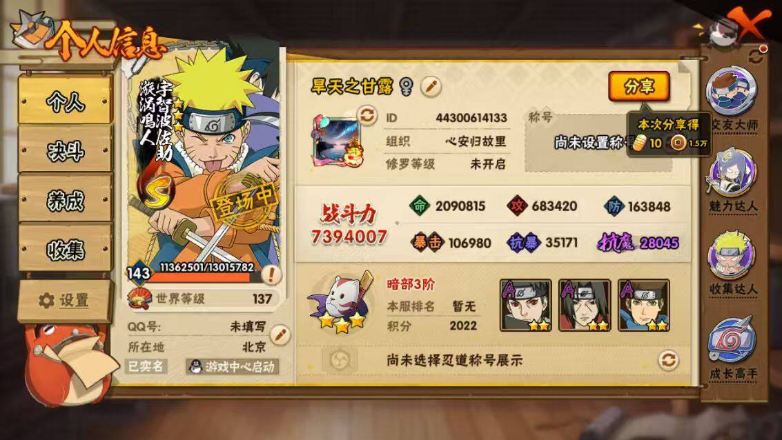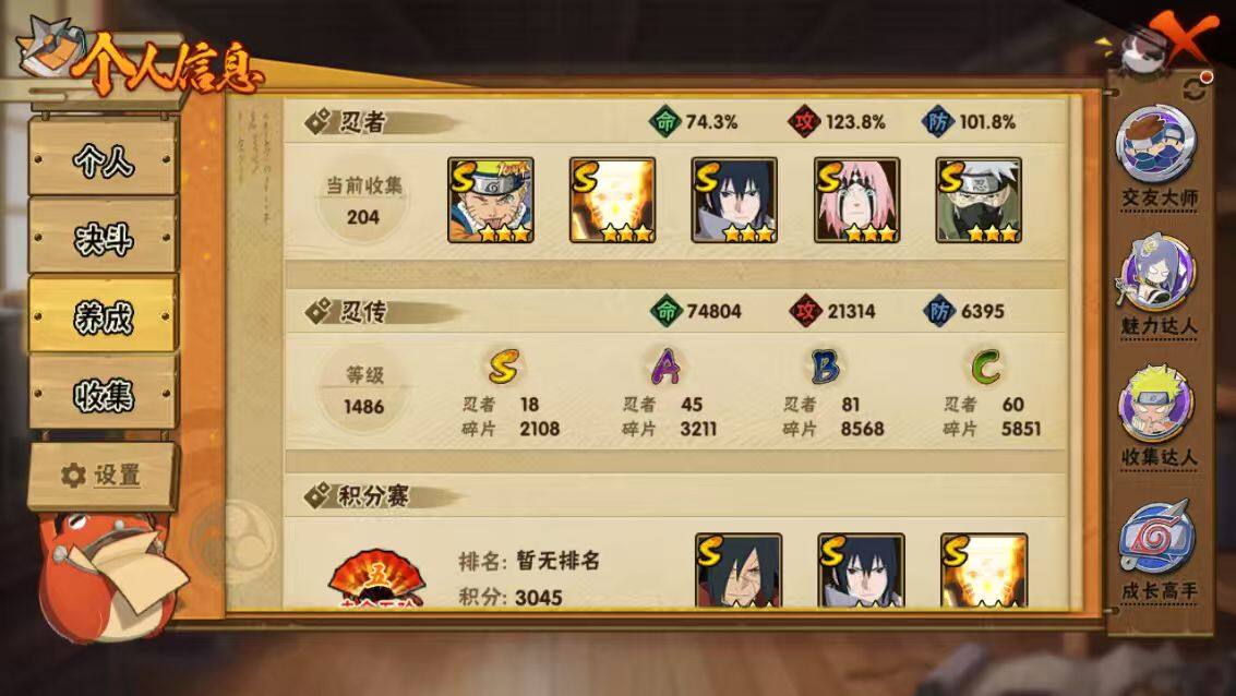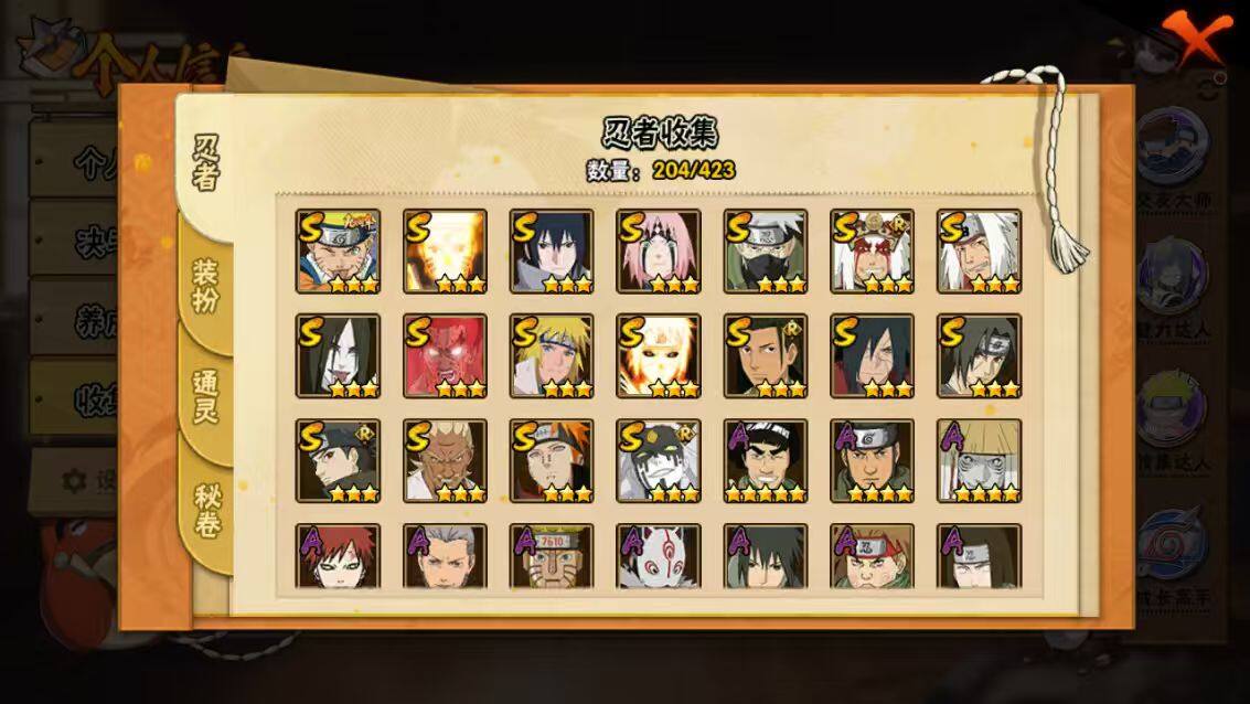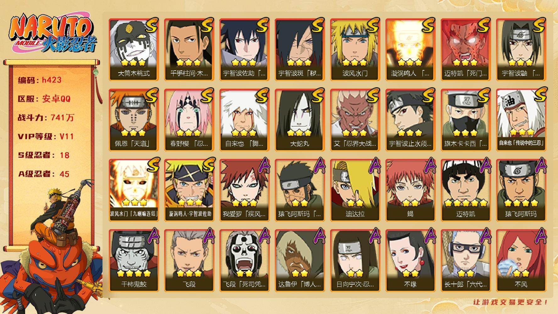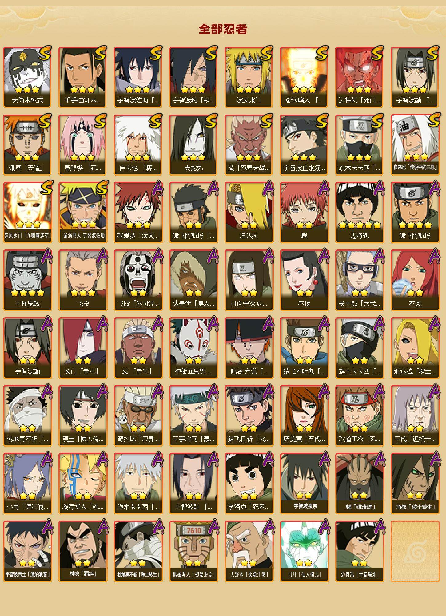 [16446783]18s级忍者数-45a级忍者数 【s级忍者】:宇智波斑「秽土转生·解」3星,春野樱「忍界大战」3星,艾「忍界大战」3星,宇智波鼬「须佐能乎」3星,宇智波止水「须佐能乎」3星,旗木卡卡西「须佐能乎」3星,千手柱间「木叶创立」3星,自来也「舞之豪杰」3星,大蛇丸3星,自来也「传说中的三忍」3星,波风水门3星,漩涡鸣人「九喇嘛连结」3星,迈特凯「死门」3星,佩恩「天道」3星,宇智波佐助「永恒万花筒」3星,大筒木桃式3星,波风水门「九喇嘛连结」3星,漩涡鸣人·宇智波佐助3星 【a级忍者】:艾「青年」2星,长门「青年」2星,达鲁伊「博人传」2星,迪达拉2星,迪达拉「秽土转生」2星,奇拉比「忍界大战」2星,飞段3星,飞段「死司凭血」2星,干柿鬼鲛4星,漩涡博人「桃式显现」2星,机械鸣人「初始形态」2星,迈特凯5星,旗木卡卡西「忍界大战」2星,旗木卡卡西「幻之真容」2星,桃地再不斩「漂泊武士」2星,桃地再不斩「秽土转生」2星,我爱罗「疾风传」3星,蝎2星,蝎「绯流琥」2星,小南「漂泊浪客」2星,角都「秽土转生」2星,猿飞阿斯玛4星,猿飞阿斯玛「秽土转生」2星,猿飞日斩「火影继承人」2星,宇智波鼬2星,宇智波鼬「夏日限定」2星,照美冥「五代目水影」2星,日向宁次「忍界大战」2星,宇智波带土「漂泊浪客」2星,长十郎「六代目水影」2星,神秘面具男「忍者之路」2星,佩恩·六道「漂泊浪客」2星,李洛克「忍界大战」2星,猿飞木叶丸「博人传」2星,黑土「博人传」2星,千手扉间「漂泊武士」2星,秋道丁次「忍界大战」2星,千代「近松十人卫」2星,神农「羁绊」2星,不缘2星,不风2星,宇智波泉奈2星,大野木「侠隐江湖」2星,巳月「仙人模式」2星,迈特凯「青春爆炸」2星