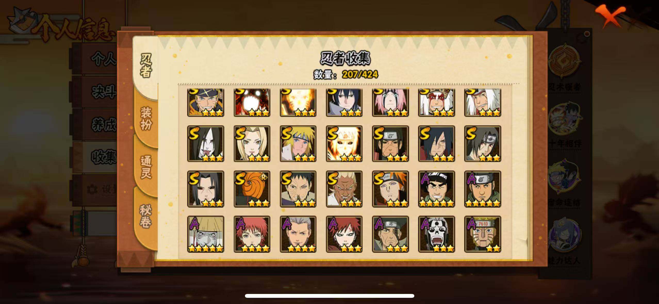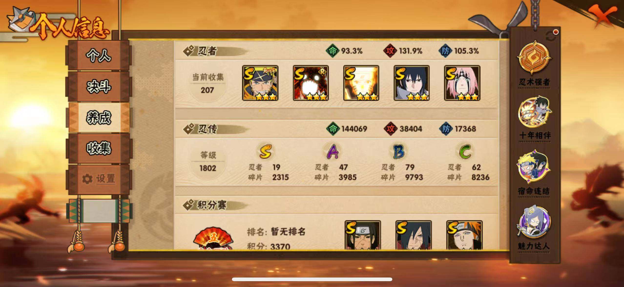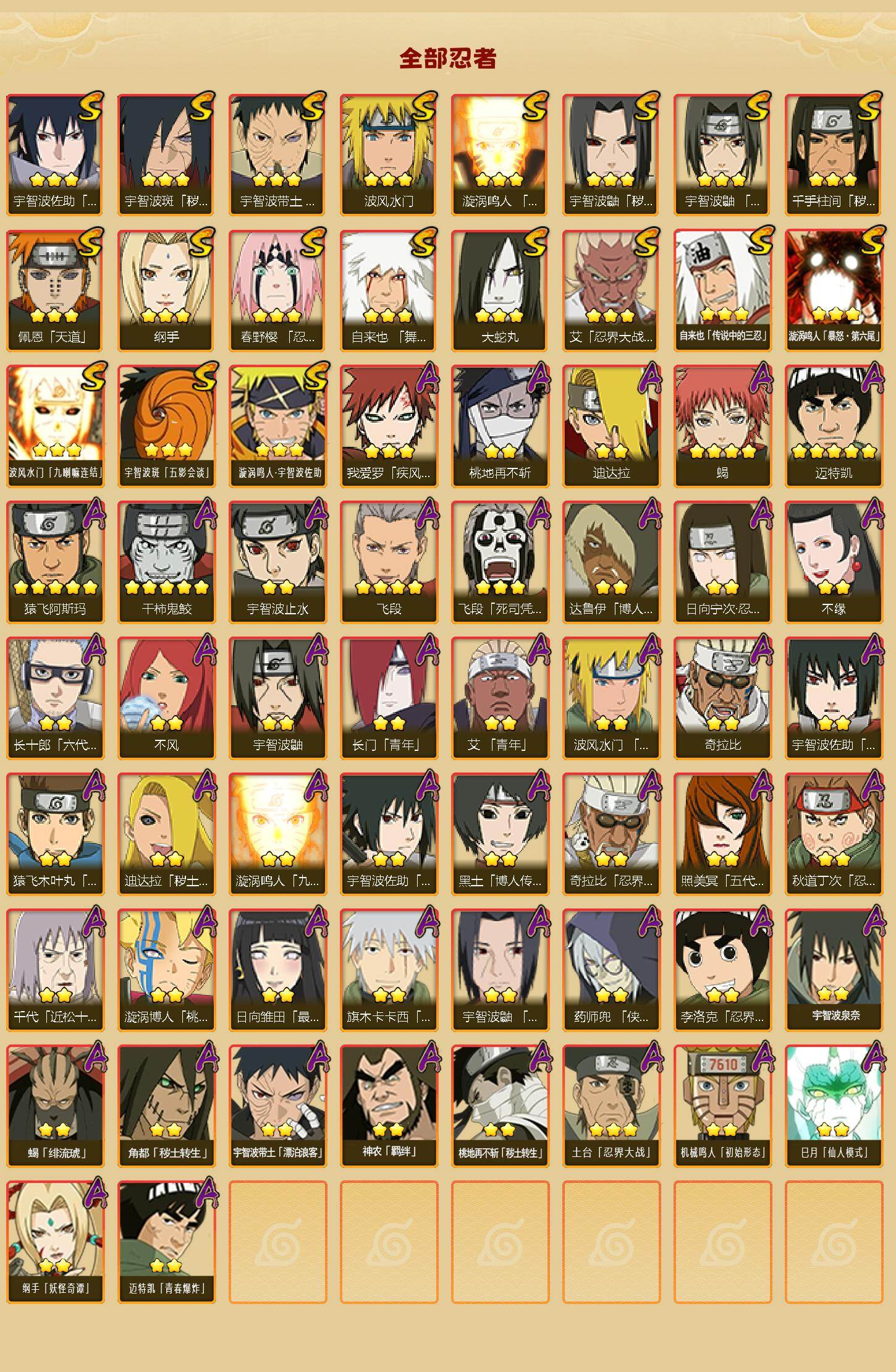[16447801]19s级忍者数-47a级忍者数 【s级忍者】:千手柱间「秽土转生」3星,宇智波鼬「秽土转生」3星,宇智波斑「秽土转生·解」3星,春野樱「忍界大战」3星,宇智波带土「忍界大战」3星,艾「忍界大战」3星,宇智波鼬「须佐能乎」3星,自来也「舞之豪杰」3星,大蛇丸3星,自来也「传说中的三忍」3星,纲手3星,波风水门3星,漩涡鸣人「九喇嘛连结」3星,佩恩「天道」3星,宇智波佐助「永恒万花筒」3星,漩涡鸣人「暴怒·第六尾」3星,波风水门「九喇嘛连结」3星,宇智波斑「五影会谈」3星,漩涡鸣人·宇智波佐助3星 【a级忍者】:艾「青年」2星,长门「青年」2星,波风水门「青年」2星,达鲁伊「博人传」2星,迪达拉2星,迪达拉「秽土转生」2星,奇拉比2星,奇拉比「忍界大战」2星,飞段4星,飞段「死司凭血」3星,干柿鬼鲛5星,漩涡博人「桃式显现」2星,漩涡鸣人「九尾查克拉」2星,机械鸣人「初始形态」2星,迈特凯5星,旗木卡卡西「幻之真容」2星,桃地再不斩2星,桃地再不斩「秽土转生」2星,我爱罗「疾风传」3星,蝎4星,蝎「绯流琥」2星,角都「秽土转生」2星,猿飞阿斯玛5星,宇智波止水2星,宇智波鼬2星,宇智波鼬「夏日限定」2星,宇智波佐助「须佐能乎」2星,宇智波佐助「万花筒写轮眼」2星,药师兜「侠隐江湖」2星,照美冥「五代目水影」2星,日向宁次「忍界大战」2星,日向雏田「最终章」2星,宇智波带土「漂泊浪客」2星,长十郎「六代目水影」2星,李洛克「忍界大战」2星,猿飞木叶丸「博人传」2星,黑土「博人传」2星,秋道丁次「忍界大战」2星,千代「近松十人卫」2星,神农「羁绊」2星,土台「忍界大战」3星,不缘2星,不风2星,宇智波泉奈2星,巳月「仙人模式」2星,纲手「妖怪奇谭」2星,迈特凯「青春爆炸」2星