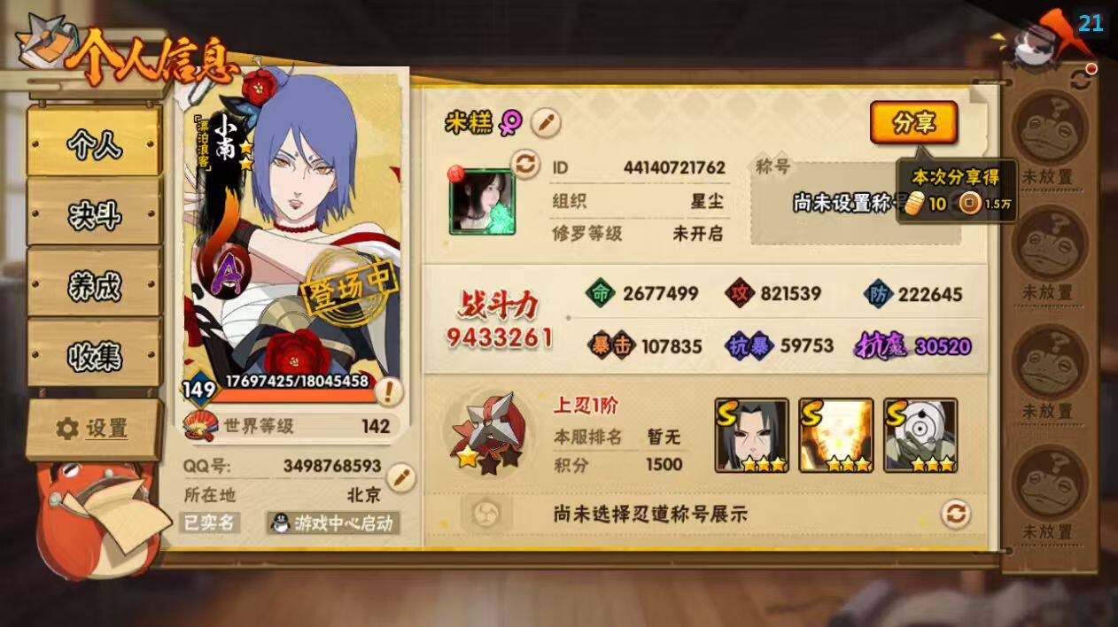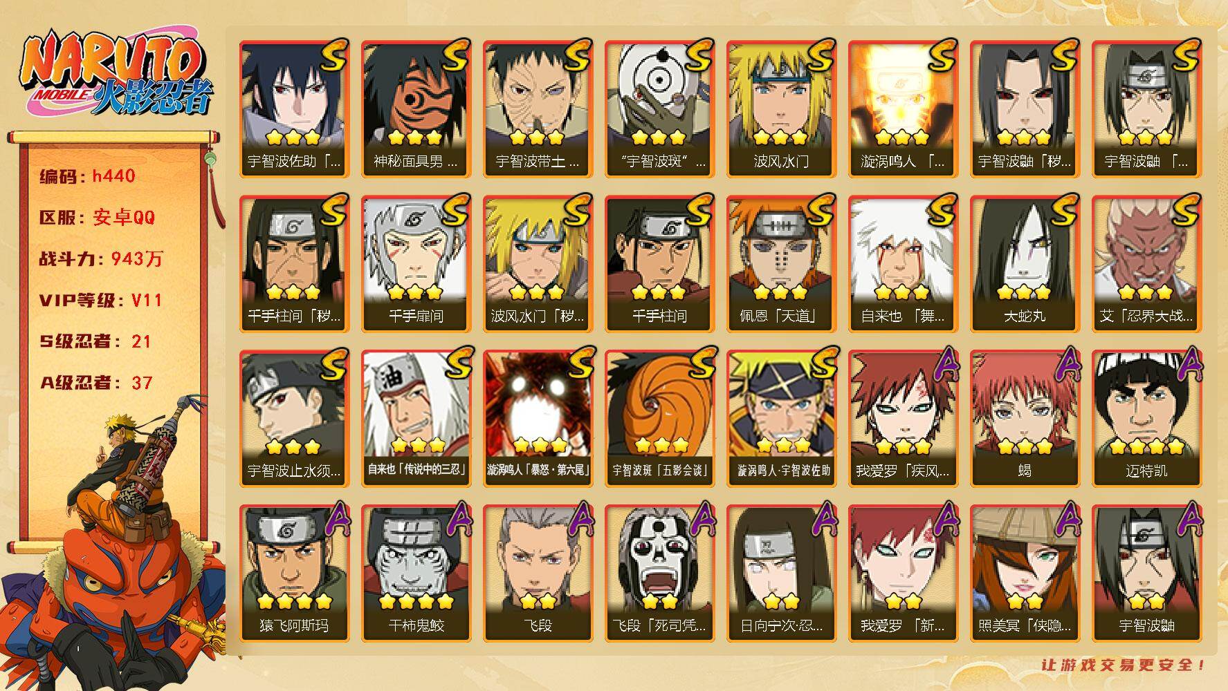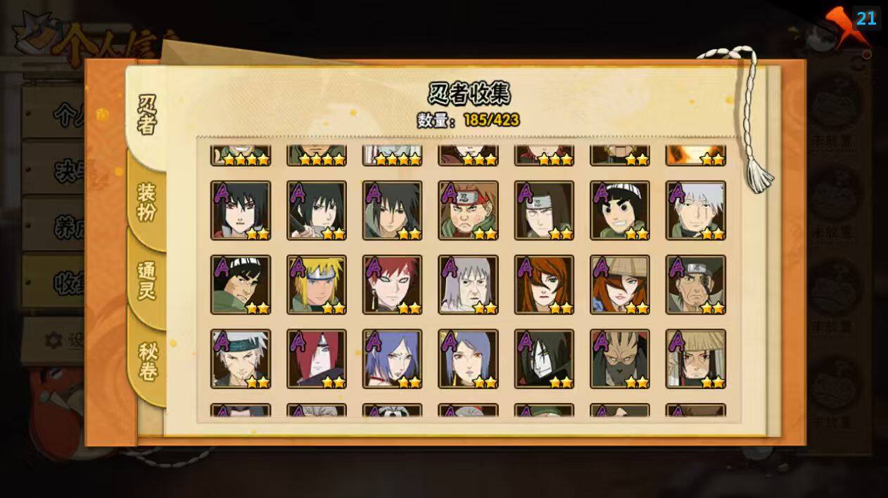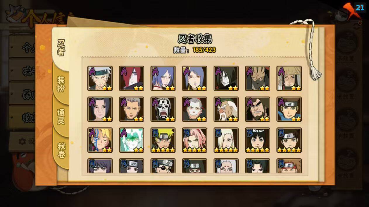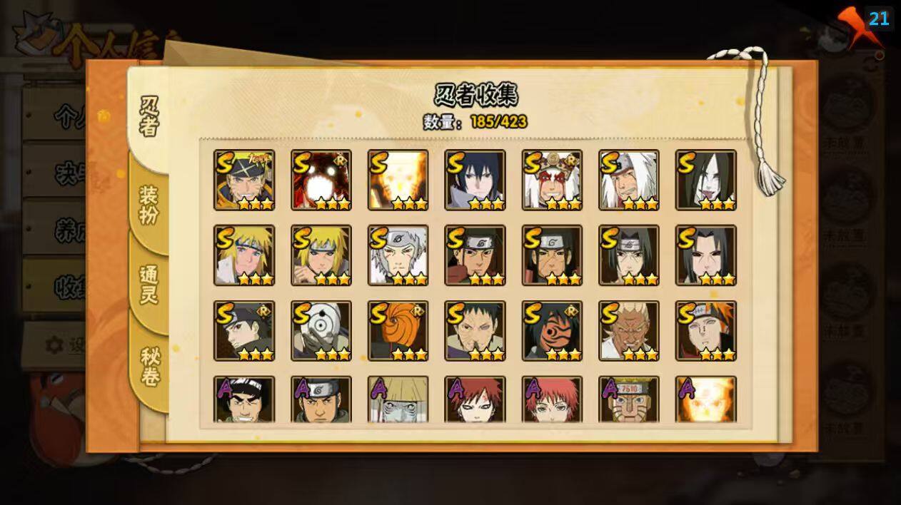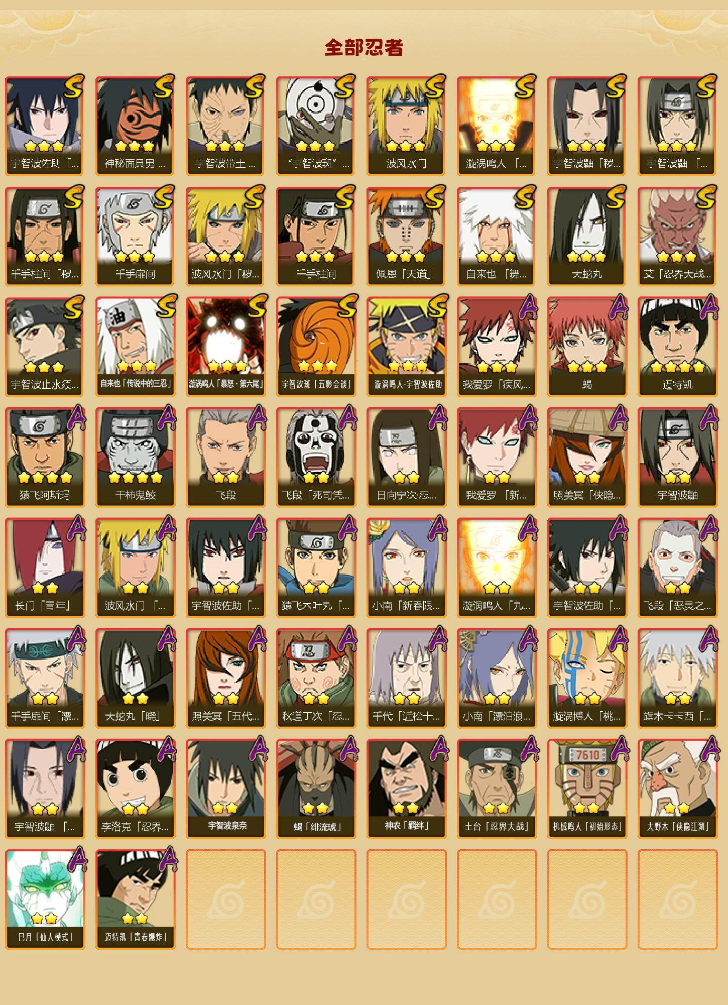 [16451486]21s级忍者数-37a级忍者数 【s级忍者】:波风水门「秽土转生」3星,千手柱间「秽土转生」3星,宇智波鼬「秽土转生」3星,宇智波带土「忍界大战」3星,艾「忍界大战」3星,宇智波鼬「须佐能乎」3星,宇智波止水「须佐能乎」3星,自来也「舞之豪杰」3星,大蛇丸3星,自来也「传说中的三忍」3星,千手柱间3星,千手扉间3星,波风水门3星,神秘面具男「红夜之刃」3星,漩涡鸣人「九喇嘛连结」3星,佩恩「天道」3星,宇智波佐助「永恒万花筒」3星,宇智波斑 「白面具」3星宇智波斑「白面具」,漩涡鸣人「暴怒·第六尾」3星,宇智波斑「五影会谈」3星,漩涡鸣人·宇智波佐助3星 【a级忍者】:长门「青年」2星,波风水门「青年」2星,大蛇丸「晓」2星,飞段2星,飞段「死司凭血」2星,飞段「恶灵之影」2星,干柿鬼鲛4星,漩涡博人「桃式显现」2星,漩涡鸣人「九尾查克拉」2星,机械鸣人「初始形态」2星,迈特凯4星,旗木卡卡西「幻之真容」2星,我爱罗「疾风传」3星,我爱罗「新春限定」2星,蝎3星,蝎「绯流琥」2星,小南「新春限定」2星,小南「漂泊浪客」2星,猿飞阿斯玛4星,宇智波鼬2星,宇智波鼬「夏日限定」2星,宇智波佐助「须佐能乎」2星,宇智波佐助「万花筒写轮眼」2星,照美冥「侠隐江湖」2星,照美冥「五代目水影」2星,日向宁次「忍界大战」2星,李洛克「忍界大战」2星,猿飞木叶丸「博人传」2星,千手扉间「漂泊武士」2星,秋道丁次「忍界大战」2星,千代「近松十人卫」2星,神农「羁绊」2星,土台「忍界大战」2星,宇智波泉奈2星,大野木「侠隐江湖」2星,巳月「仙人模式」2星,迈特凯「青春爆炸」2星