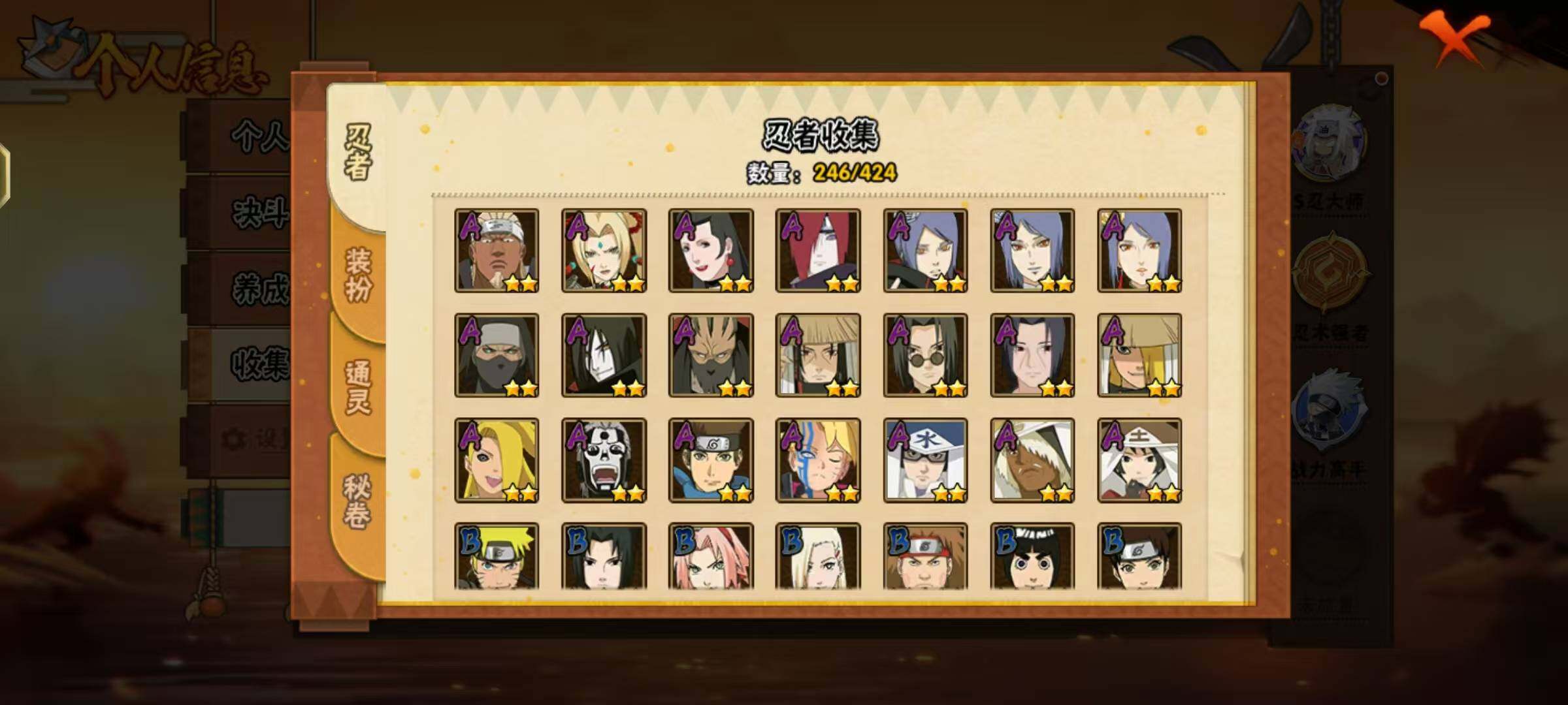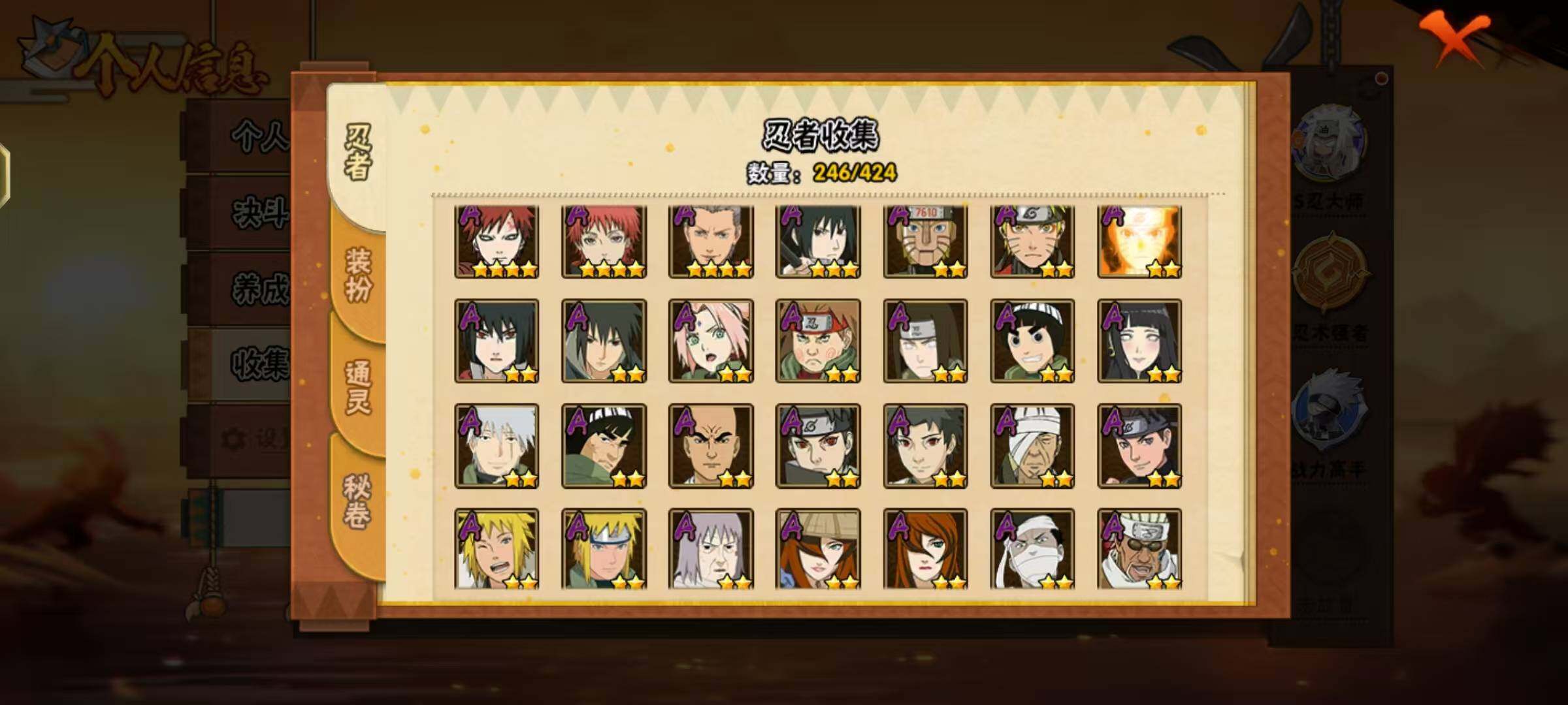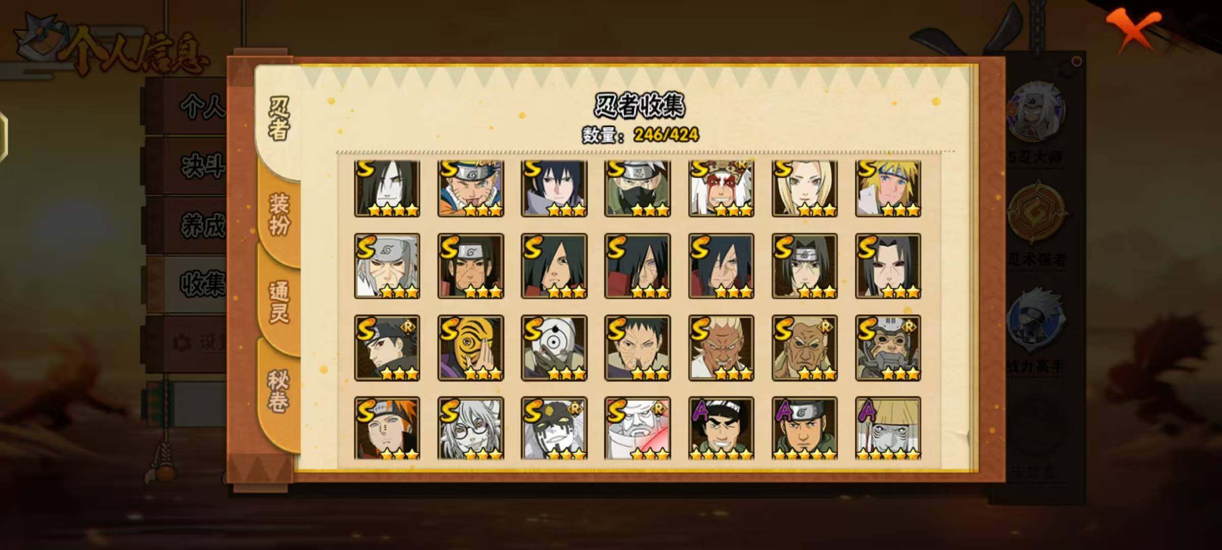 [16449837]25s级忍者数-52a级忍者数 【s级忍者】:半藏「秽土转生」3星,千手扉间「秽土转生」3星,千手柱间「秽土转生」3星,宇智波鼬「秽土转生」3星,宇智波斑「秽土转生」3星,宇智波斑「秽土转生·解」3星,宇智波带土「忍界大战」3星,艾「忍界大战」3星,宇智波鼬「须佐能乎」3星,宇智波止水「须佐能乎」3星,旗木卡卡西「须佐能乎」3星,艾「三代目雷影」3星,自来也「舞之豪杰」3星,大蛇丸4星,纲手3星,宇智波斑3星,波风水门3星,药师兜「仙人模式」3星,神秘面具男3星,佩恩「天道」3星,宇智波佐助「永恒万花筒」3星,宇智波斑 「白面具」3星宇智波斑「白面具」,大筒木金式3星,大筒木桃式3星,漩涡鸣人·宇智波佐助3星 【a级忍者】:艾「青年」2星,长门「青年」2星,波风水门「青年」2星,波风水门「新春限定」2星,达鲁伊「博人传」2星,迪达拉2星,迪达拉「秽土转生」2星,大蛇丸「晓」2星,奇拉比2星,飞段4星,飞段「死司凭血」2星,干柿鬼鲛5星,漩涡博人「桃式显现」2星,漩涡鸣人「仙人模式」2星,漩涡鸣人「九尾查克拉」2星,机械鸣人「初始形态」2星,迈特凯5星,旗木卡卡西「幻之真容」2星,桃地再不斩「漂泊武士」2星,我爱罗「疾风传」4星,蝎4星,蝎「绯流琥」2星,小南2星,小南「新春限定」2星,小南「夏日泳装」2星,角都「晓创生」2星,猿飞阿斯玛5星,宇智波止水2星,宇智波止水「新春限定」2星,猿飞日斩「火影继承人」2星,宇智波鼬2星,宇智波鼬「新春限定」2星,宇智波鼬「夏日限定」2星,宇智波佐助「须佐能乎」3星,宇智波佐助「万花筒写轮眼」2星,照美冥「侠隐江湖」2星,照美冥「五代目水影」2星,日向宁次「忍界大战」2星,日向雏田「最终章」2星,长十郎「六代目水影」2星,李洛克「忍界大战」2星,猿飞木叶丸「博人传」2星,黑土「博人传」2星,春野樱「百豪」2星,秋道丁次「忍界大战」2星,千代「近松十人卫」2星,志村团藏2星,不缘2星,地陆2星,宇智波泉奈2星,纲手「妖怪奇谭」2星