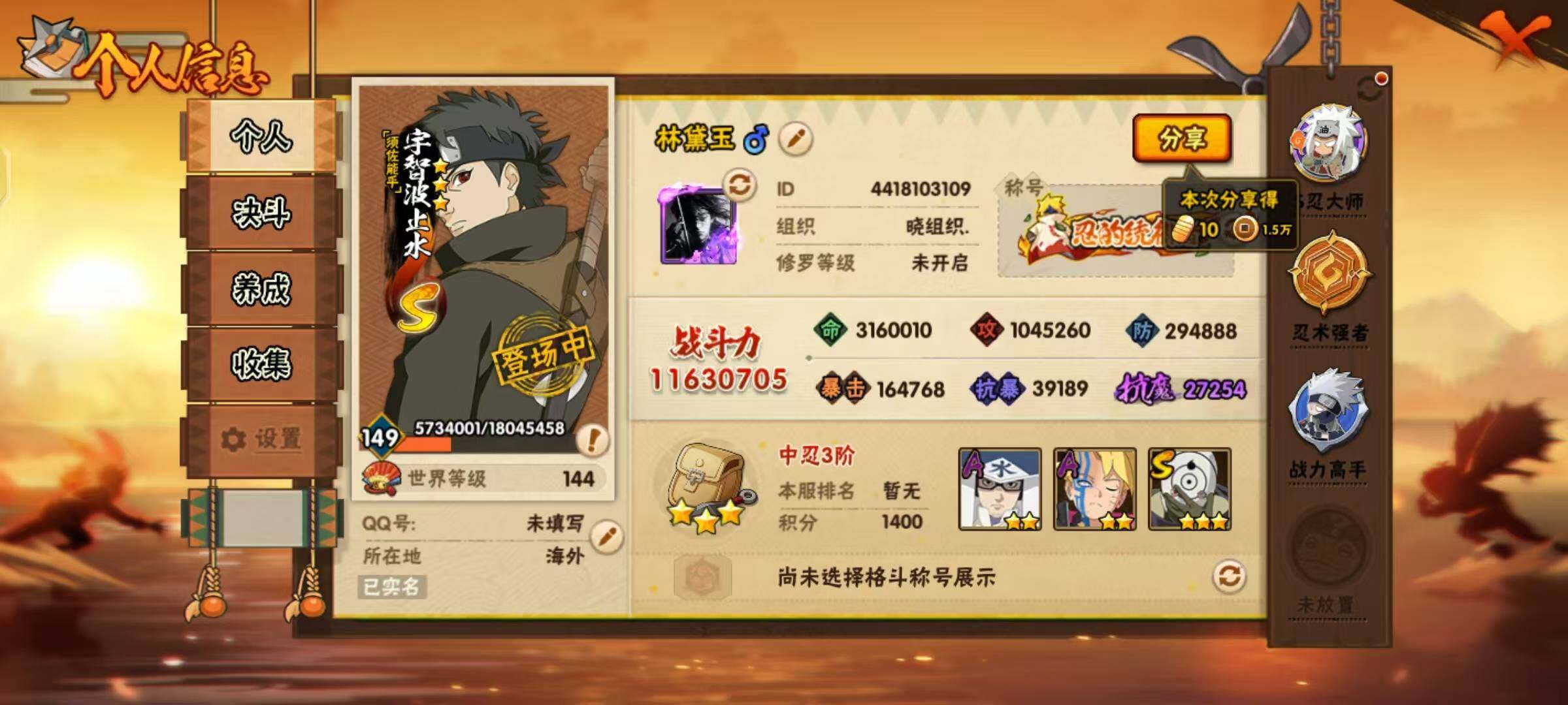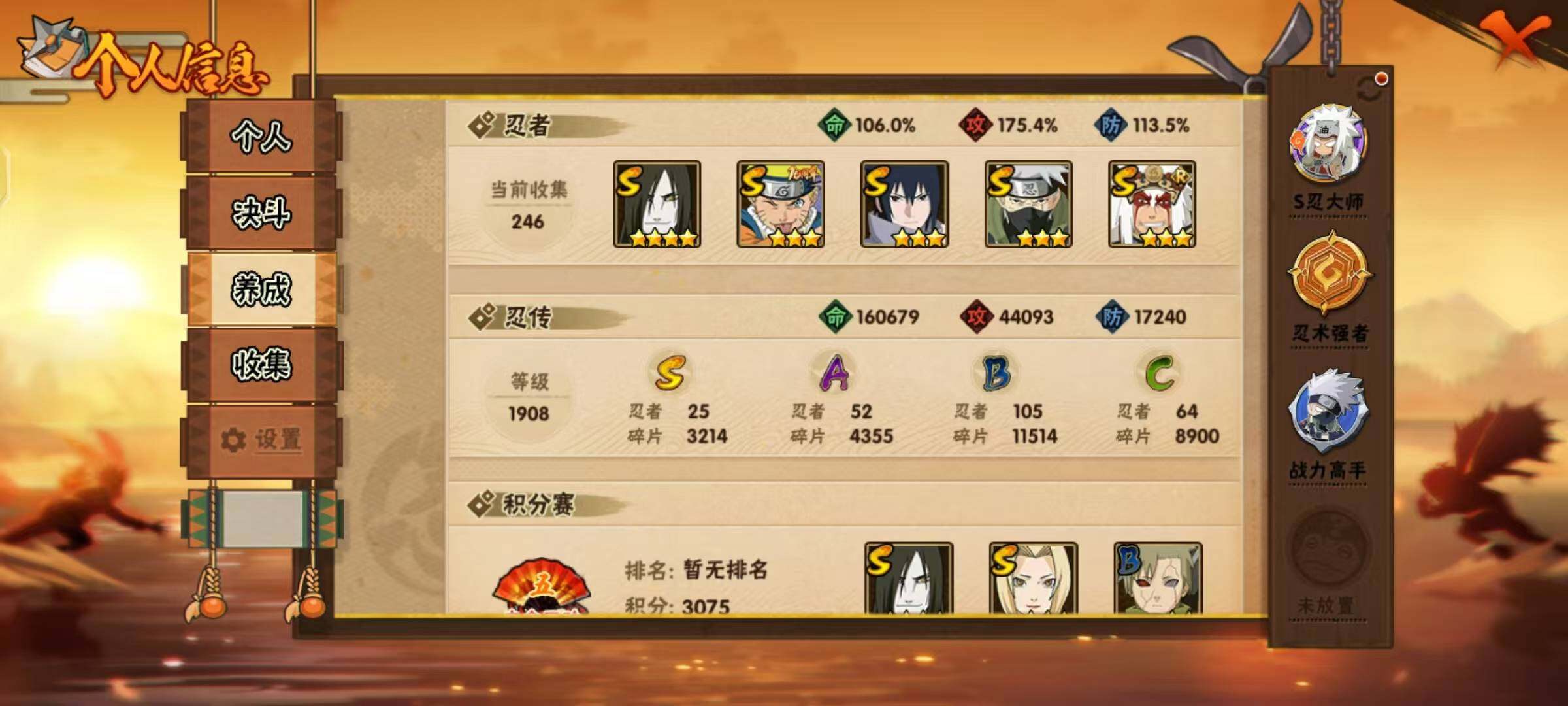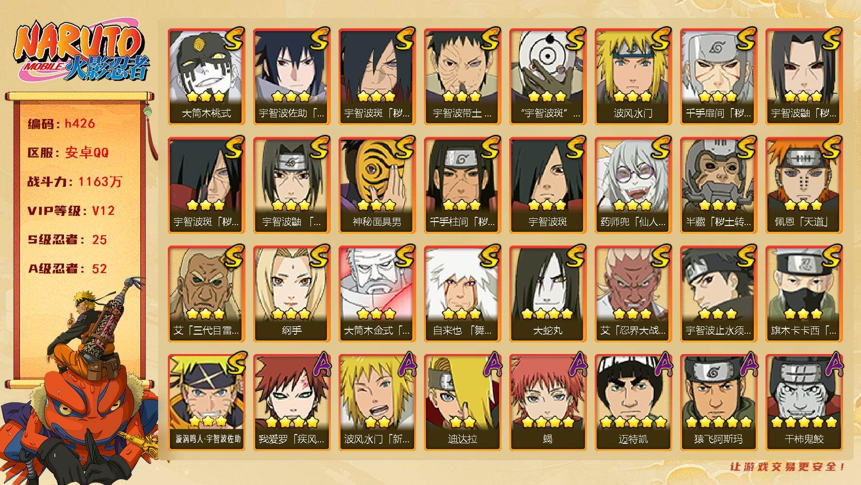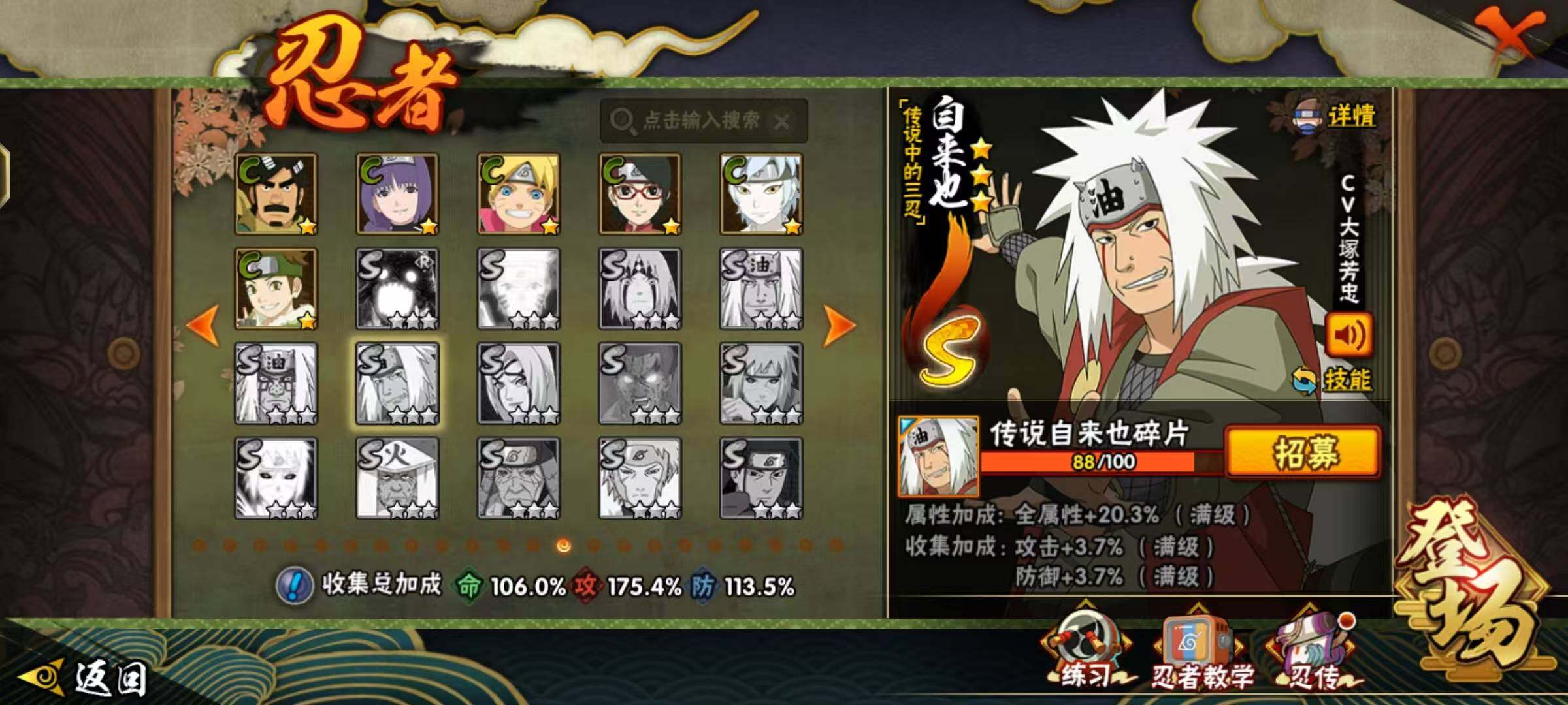 [16449837]25s级忍者数-52a级忍者数 【s级忍者】:半藏「秽土转生」3星,千手扉间「秽土转生」3星,千手柱间「秽土转生」3星,宇智波鼬「秽土转生」3星,宇智波斑「秽土转生」3星,宇智波斑「秽土转生·解」3星,宇智波带土「忍界大战」3星,艾「忍界大战」3星,宇智波鼬「须佐能乎」3星,宇智波止水「须佐能乎」3星,旗木卡卡西「须佐能乎」3星,艾「三代目雷影」3星,自来也「舞之豪杰」3星,大蛇丸4星,纲手3星,宇智波斑3星,波风水门3星,药师兜「仙人模式」3星,神秘面具男3星,佩恩「天道」3星,宇智波佐助「永恒万花筒」3星,宇智波斑 「白面具」3星宇智波斑「白面具」,大筒木金式3星,大筒木桃式3星,漩涡鸣人·宇智波佐助3星 【a级忍者】:艾「青年」2星,长门「青年」2星,波风水门「青年」2星,波风水门「新春限定」2星,达鲁伊「博人传」2星,迪达拉2星,迪达拉「秽土转生」2星,大蛇丸「晓」2星,奇拉比2星,飞段4星,飞段「死司凭血」2星,干柿鬼鲛5星,漩涡博人「桃式显现」2星,漩涡鸣人「仙人模式」2星,漩涡鸣人「九尾查克拉」2星,机械鸣人「初始形态」2星,迈特凯5星,旗木卡卡西「幻之真容」2星,桃地再不斩「漂泊武士」2星,我爱罗「疾风传」4星,蝎4星,蝎「绯流琥」2星,小南2星,小南「新春限定」2星,小南「夏日泳装」2星,角都「晓创生」2星,猿飞阿斯玛5星,宇智波止水2星,宇智波止水「新春限定」2星,猿飞日斩「火影继承人」2星,宇智波鼬2星,宇智波鼬「新春限定」2星,宇智波鼬「夏日限定」2星,宇智波佐助「须佐能乎」3星,宇智波佐助「万花筒写轮眼」2星,照美冥「侠隐江湖」2星,照美冥「五代目水影」2星,日向宁次「忍界大战」2星,日向雏田「最终章」2星,长十郎「六代目水影」2星,李洛克「忍界大战」2星,猿飞木叶丸「博人传」2星,黑土「博人传」2星,春野樱「百豪」2星,秋道丁次「忍界大战」2星,千代「近松十人卫」2星,志村团藏2星,不缘2星,地陆2星,宇智波泉奈2星,纲手「妖怪奇谭」2星