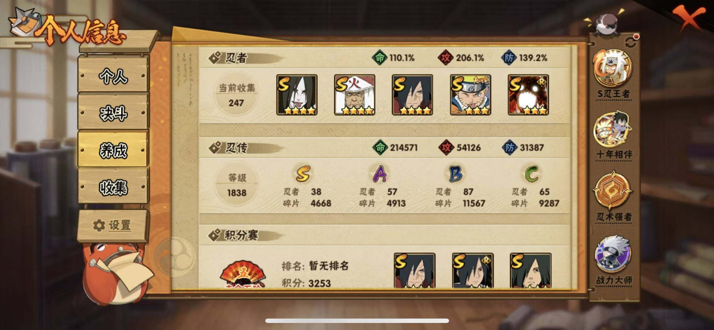 【hy3919】v0/战力1600w/s忍38/a忍57/3星纲手「百豪」/2星大野木「侠隐江湖」/3星波风水门「九喇嘛连结」/3星宇智波带土「十尾人柱力」/2星达鲁伊「博人传」/2星宇智波止水/5星猿飞阿斯玛/3星旗木卡卡西「须佐能乎」/2星猿飞日斩「火影继承人」/5星蝎/3星宇智波斑/3星猿飞日斩「秽土转生」/2星照美冥「五代目水影」/2星猿飞阿斯玛「秽土转生」/5星迈特凯/3星日向宁次「忍界大战」/3星自来也/2星奇拉比「忍界大战」/3星千手扉间「秽土转生」/3星千手柱间「木叶创立」/2星神秘面具男「忍者之路」/3星大筒木桃式/2星长十郎「六代目水影」/3星蝎「绯流琥」/3星漩涡鸣人「暴怒·第六尾」/2星桃地再不斩「秽土转生」/2星春野樱「百豪」/3星宇智波斑「白面具」/3星迈特凯「死门」/2星干柿鬼鲛「鲛肌融合」/3星自来也「传说中的三忍」/3星千手柱间/2星佩恩·六道「漂泊浪客」/2星飞段「恶灵之影」/2星黑土「博人传」/2星勘九郎「忍界大战」/2星药师兜「半蛇斗篷」/2星神农「羁绊」/3星飞段「死司凭血」/3星春野樱「忍界大战」/2星宇智波佐助「万花筒写轮眼」/2星志村团藏/2星我爱罗「忍界大战」/2星迪达拉/4星我爱罗「疾风传」/2星小南/2星漩涡鸣人「九尾查克拉」/2星不动/2星不缘/3星神秘面具男/3星李洛克「忍界大战」/2星宇智波鼬/4星大蛇丸/3星宇智波佐助「永恒万花筒」/3星大筒木金式/2星长门「青年」/2星桃地再不斩/3星宇智波带土「忍界大战」/3星佩恩「天道」/3星漩涡鸣人·宇智波佐助/3星波风水门/3星大筒木舍人「最终章」/3星漩涡鸣人「九喇嘛连结」/3星波风水门「秽土转生」/2星秋道丁次「忍界大战」/2星角都「秽土转生」/2星波风水门「青年」/3星自来也「舞之豪杰」/3星神秘面具男「红夜之刃」/3星漩涡博人「桃式显现」/3星宇智波止水「须佐能乎」/4星飞段/2星日向雏田「最终章」/2星奇拉比/2星漩涡鸣人「仙人模式」/2星加藤断/2星宇智波泉奈/4星猿飞日斩/2星旗木卡卡西「幻之真容」/2星巳月「仙人模式」/3星土台「忍界大战」/3星宇智波斑「木叶创立」/3星艾「忍界大战」/2星小南「漂泊浪客」/2星艾「青年」/3星大野木「忍界大战」/2星迈特凯「青春爆炸」/2星宇智波佐助「须佐能乎」/4星宇智波斑「秽土转生·解」/3星宇智波斑「五影会谈」/5星干柿鬼鲛/2星机械鸣人「初始形态」/2星千代「近松十人卫」/3星长门「秽土转生」/3星宇智波鼬「须佐能乎」