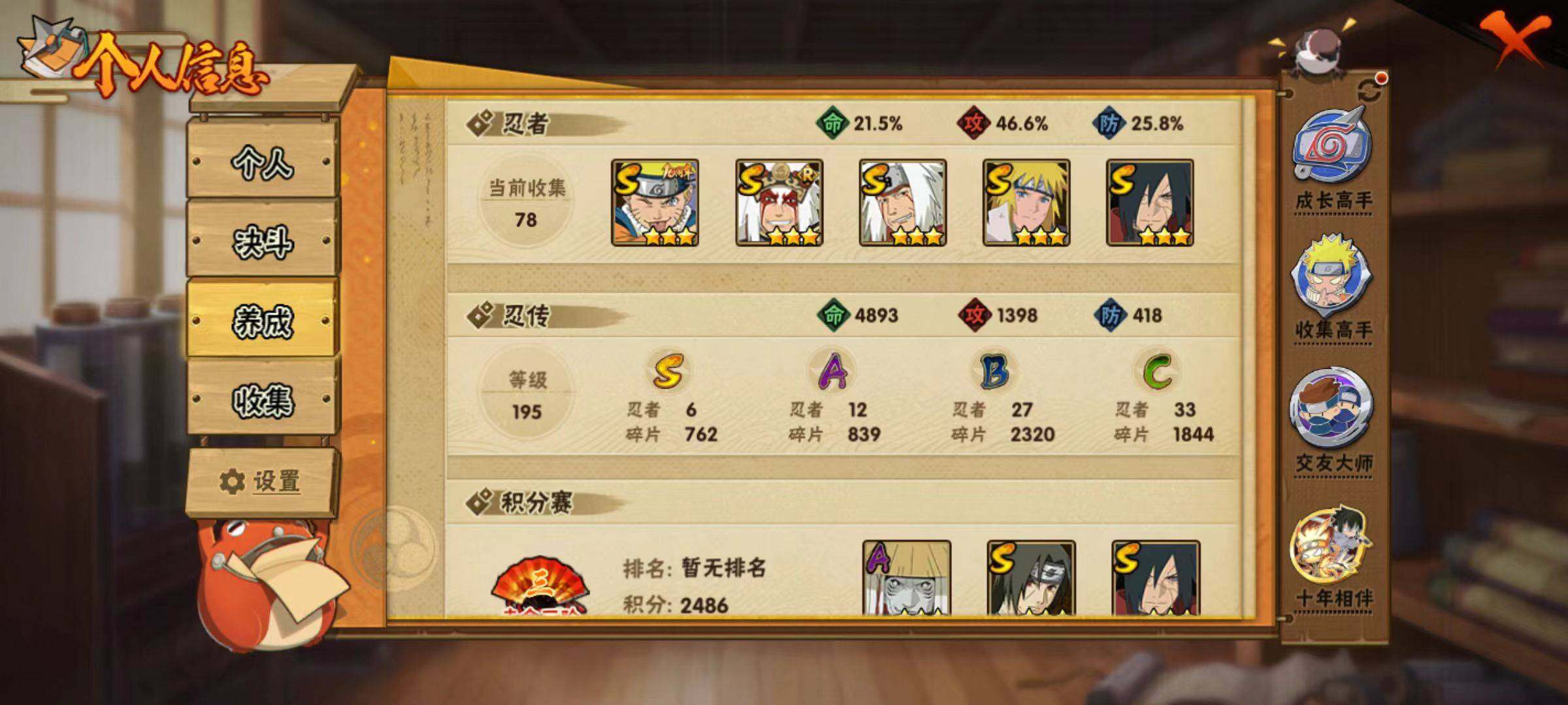 【hy607】6s级忍者数-12a级忍者数 【s级忍者】:宇智波斑「秽土转生·解」3星,宇智波鼬「须佐能乎」3星,自来也「舞之豪杰」3星,自来也「传说中的三忍」3星,波风水门3星,漩涡鸣人·宇智波佐助3星 【a级忍者】:长门「青年」2星,波风水门「青年」2星,飞段2星,干柿鬼鲛3星,迈特凯2星,角都2星,角都「地怨虞」2星,猿飞阿斯玛2星,宇智波佐助「须佐能乎」2星,宇智波泉奈2星,纲手「妖怪奇谭」2星,迈特凯「青春爆炸」2星