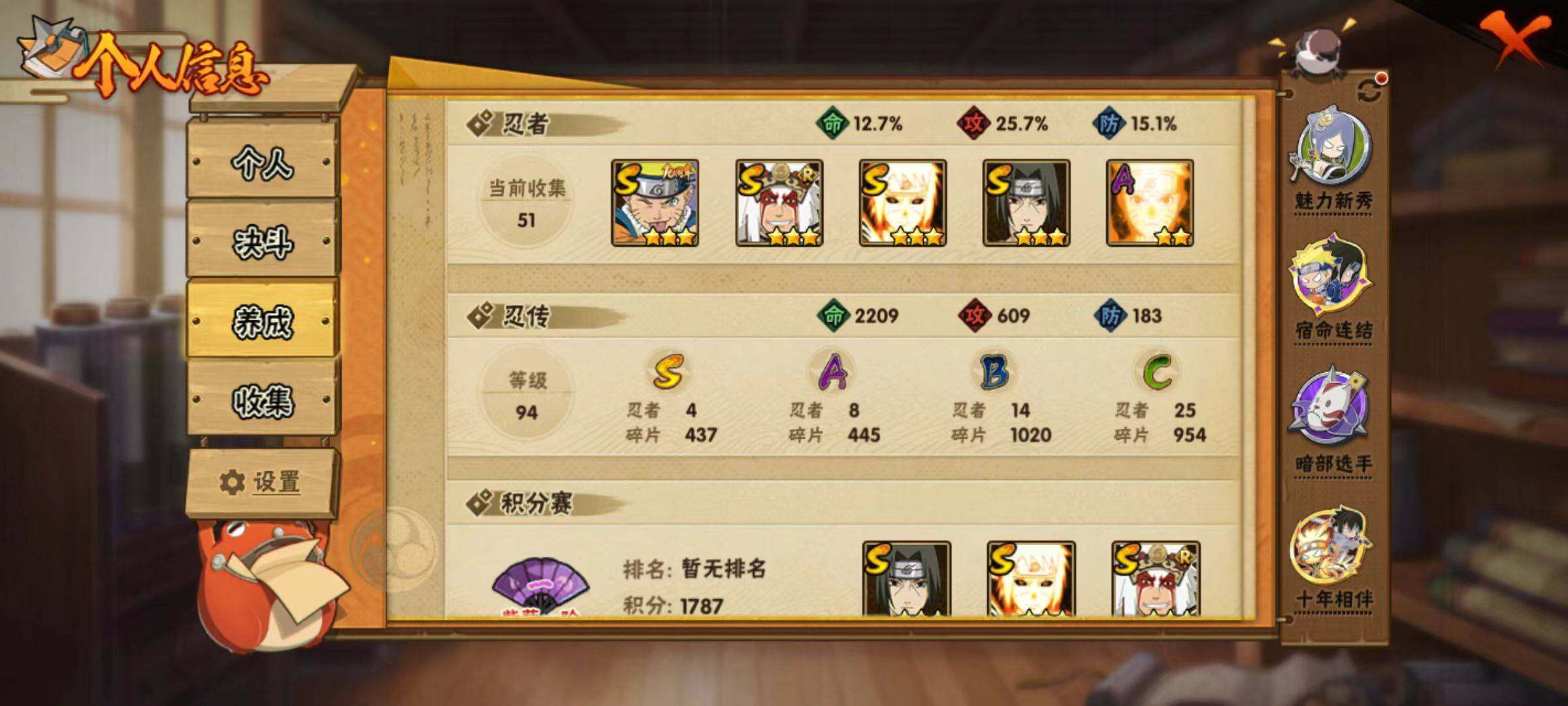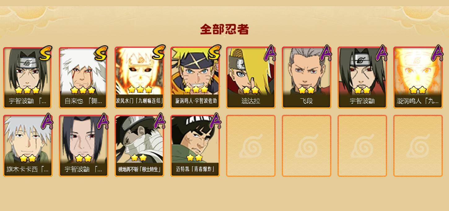【hy608】4s级忍者数-8a级忍者数 【s级忍者】:宇智波鼬「须佐能乎」3星,自来也「舞之豪杰」3星,波风水门「九喇嘛连结」3星,漩涡鸣人·宇智波佐助3星 【a级忍者】:迪达拉2星,飞段2星,漩涡鸣人「九尾查克拉」2星,旗木卡卡西「幻之真容」2星,桃地再不斩「秽土转生」2星,宇智波鼬2星,宇智波鼬「夏日限定」2星,迈特凯「青春爆炸」2星