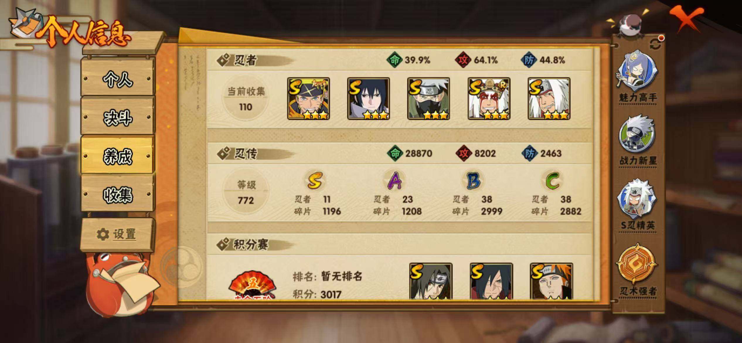 【hy421】11s级忍者数-27a级忍者数 【s级忍者】:宇智波斑「秽土转生·解」3星,宇智波鼬「须佐能乎」3星,旗木卡卡西「须佐能乎」3星,自来也「舞之豪杰」3星,自来也「传说中的三忍」3星,波风水门3星,佩恩「天道」3星,宇智波佐助「永恒万花筒」3星,漩涡鸣人「暴怒·第六尾」3星,波风水门「九喇嘛连结」3星,漩涡鸣人·宇智波佐助3星 【a级忍者】:波风水门「青年」2星,大蛇丸「新春限定」2星,飞段3星,飞段「死司凭血」2星,干柿鬼鲛2星,漩涡博人「桃式显现」2星,机械鸣人「初始形态」2星,迈特凯3星,旗木卡卡西「忍界大战」2星,旗木卡卡西「元气夏日」2星,桃地再不斩「秽土转生」2星,我爱罗「疾风传」2星,蝎2星,蝎「绯流琥」2星,角都「秽土转生」2星,猿飞阿斯玛3星,宇智波鼬「夏日限定」2星,宇智波佐助「万花筒写轮眼」2星,宇智波佐助「侠隐江湖」2星,日向宁次「忍界大战」2星,李洛克「忍界大战」2星,神农「羁绊」2星,土台「忍界大战」2星,地陆2星,宇智波泉奈2星,不动2星,迈特凯「青春爆炸」2星