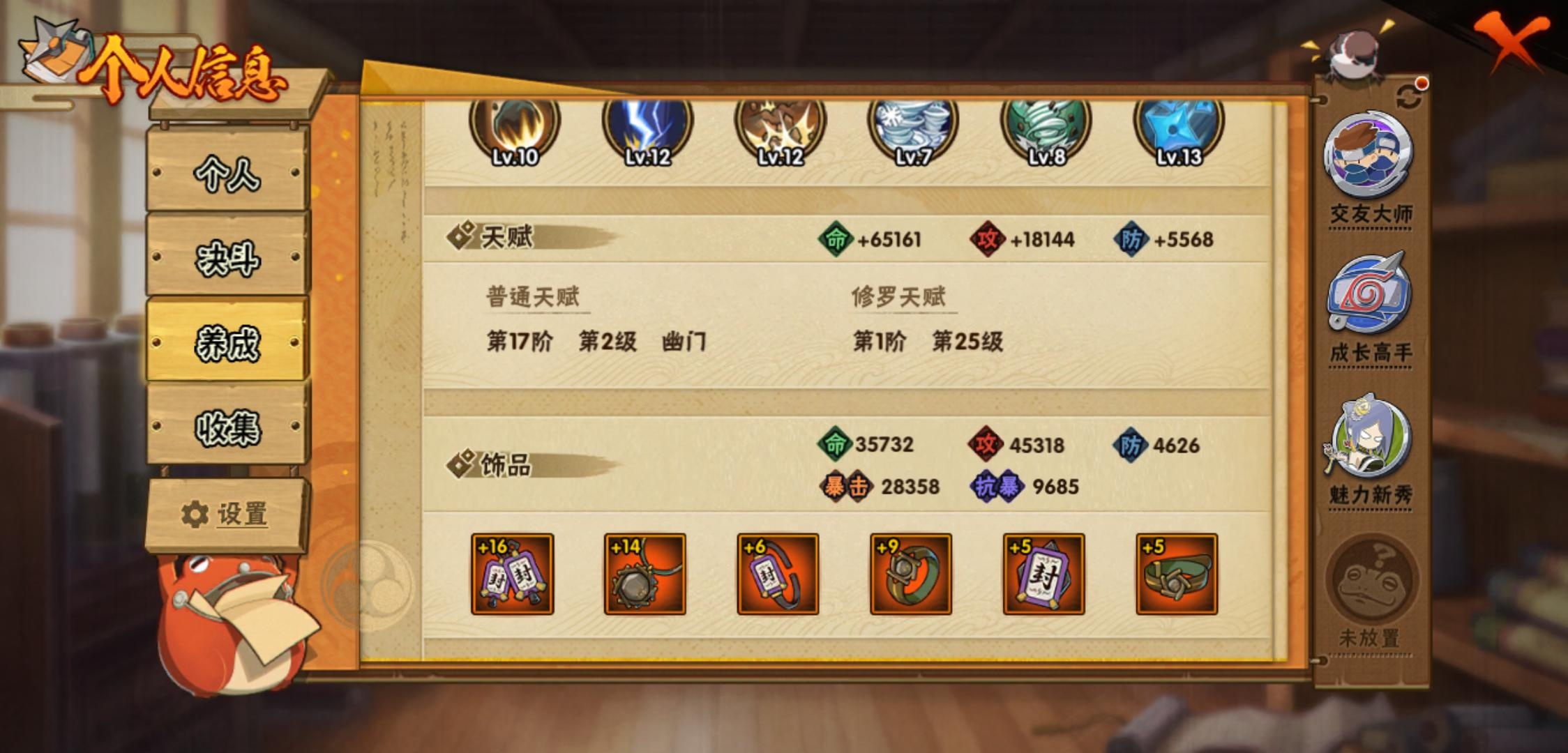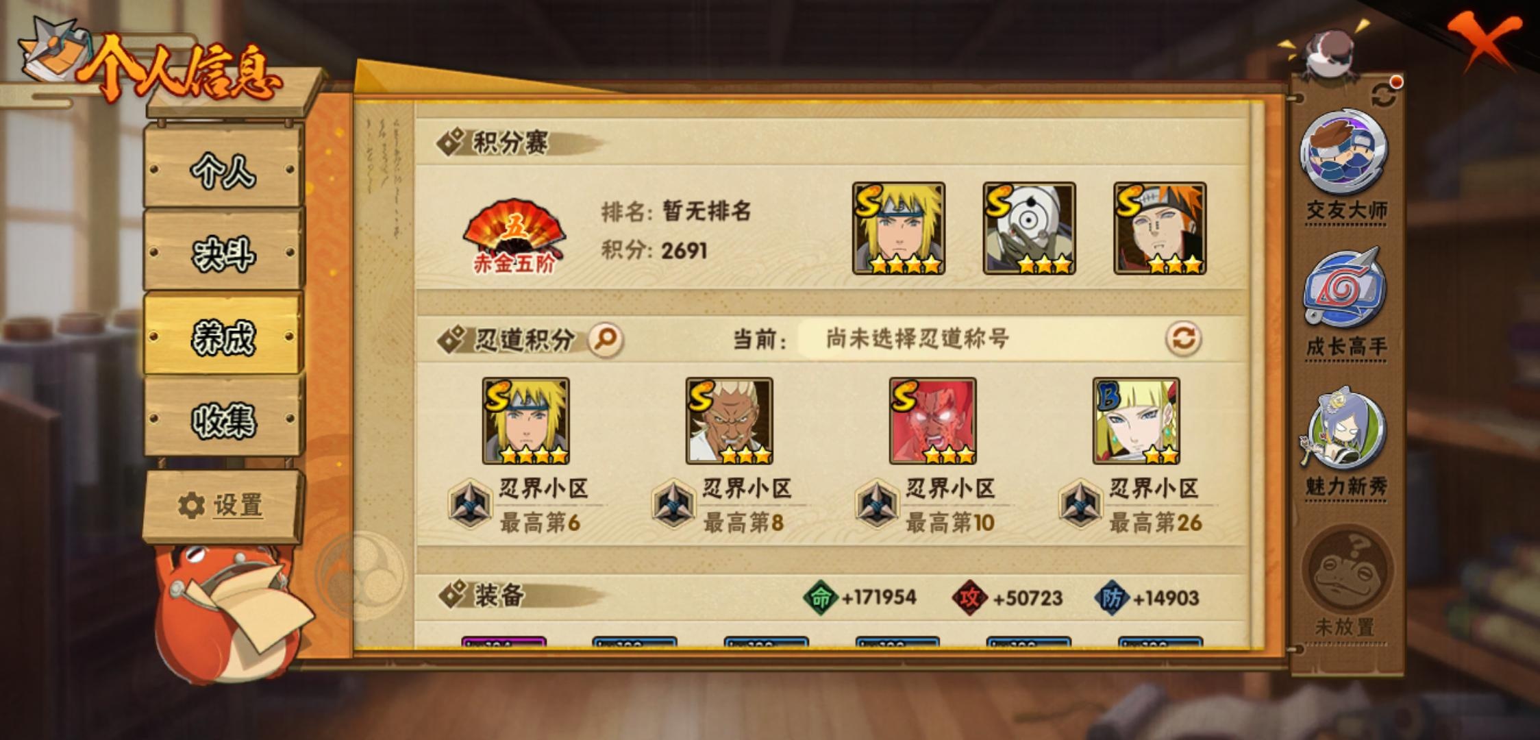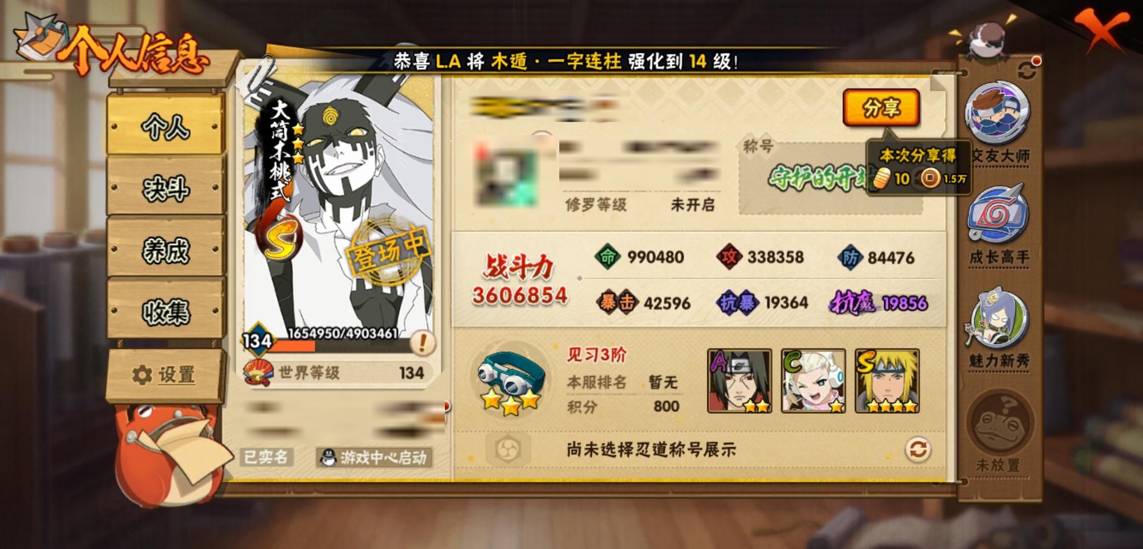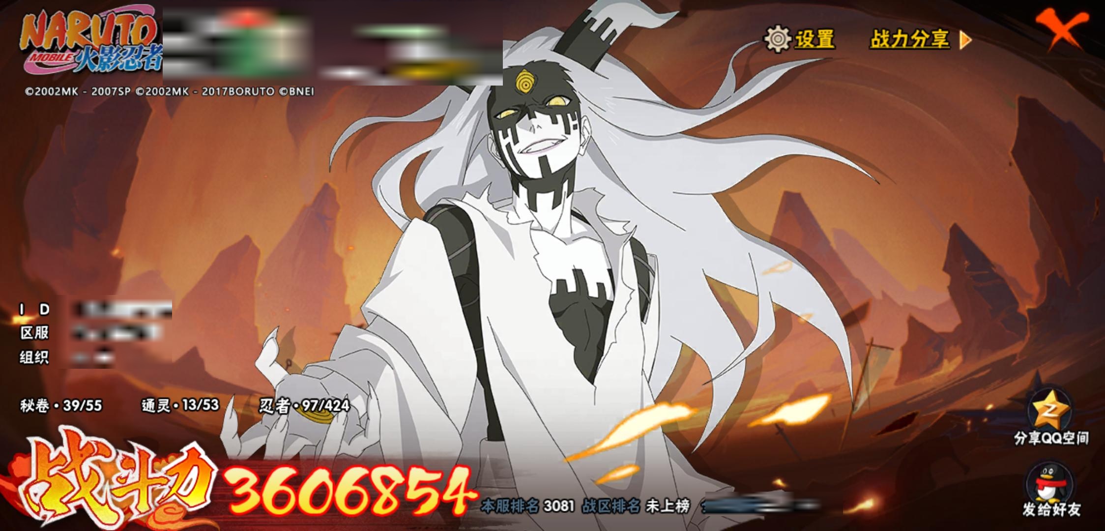 【火影忍者】【lyhy11281】战斗力:360w;段位:见习3阶;本服排名:3081;vip:v6级;s忍:9个;a忍:15个;通灵兽:12个,s忍:白面具宇智波斑|天道佩恩|漩涡鸣人宇智波佐助|秽土转生千手柱间|忍界大战艾|舞之豪杰自来也|波风水门 4星|死门迈特凯|大筒木桃式__a忍:青春爆炸迈特凯|幻之真容旗木卡卡西|四代目土影黑土|疾风传咒印宇智波佐助|死司凭血飞段|疾风传我爱罗|迪达拉(普通)|飞段(普通)|迈特凯(普通) 4星|宇智波鼬(普通)|干柿鬼鲛(普通)|蝎(普通)|猿飞阿斯玛(普通) 3星|桃式显现漩涡博人|最终章日向雏田__通灵兽:忍犬(普通)|蓝蛇|蛤蟆吉|忍龟|镰鼬|砂之守鹤|猿魔|山椒鱼|蜃|蛤蟆仙人|鲛鲨|蛤蟆健
