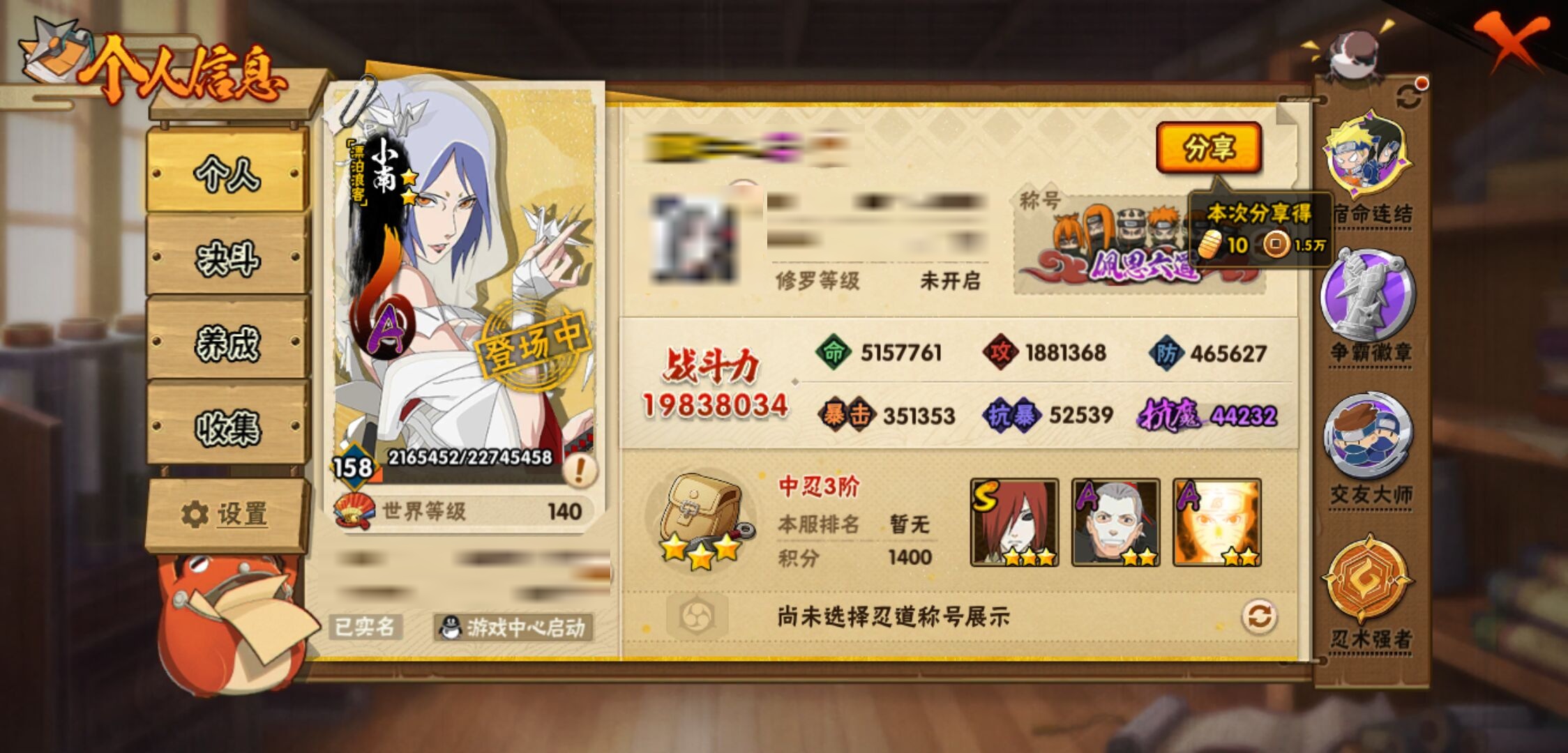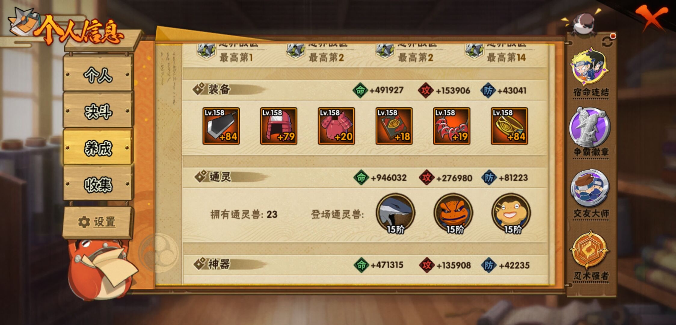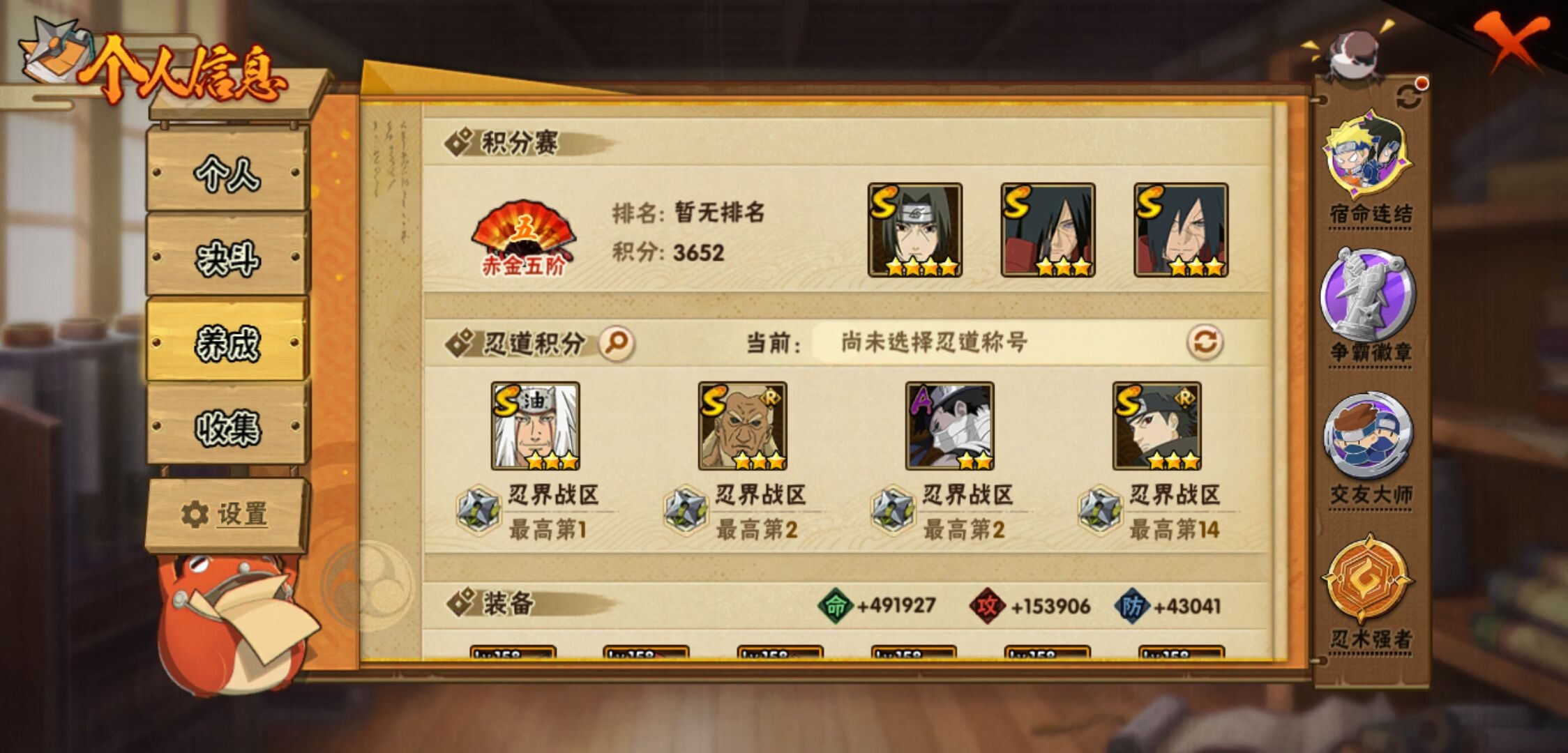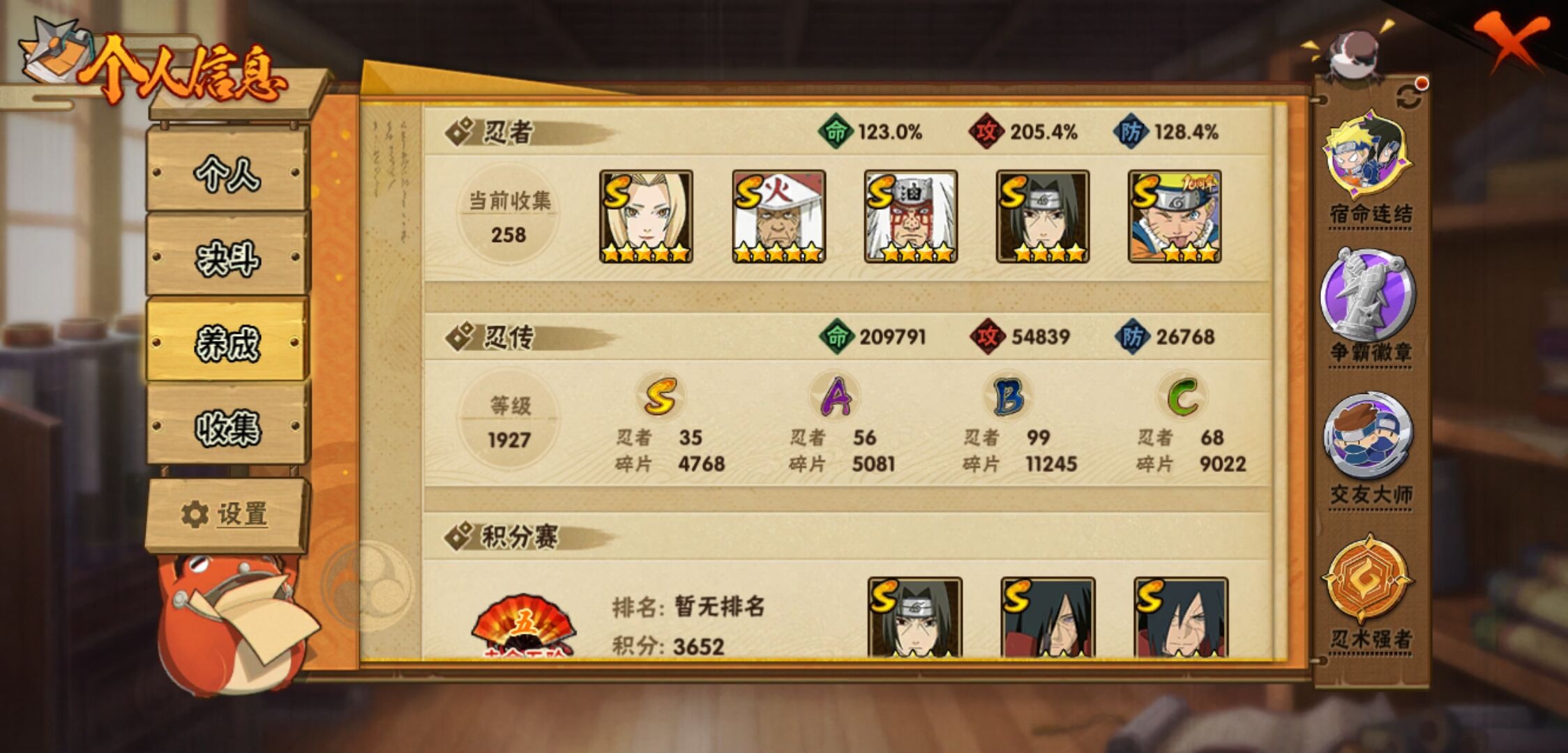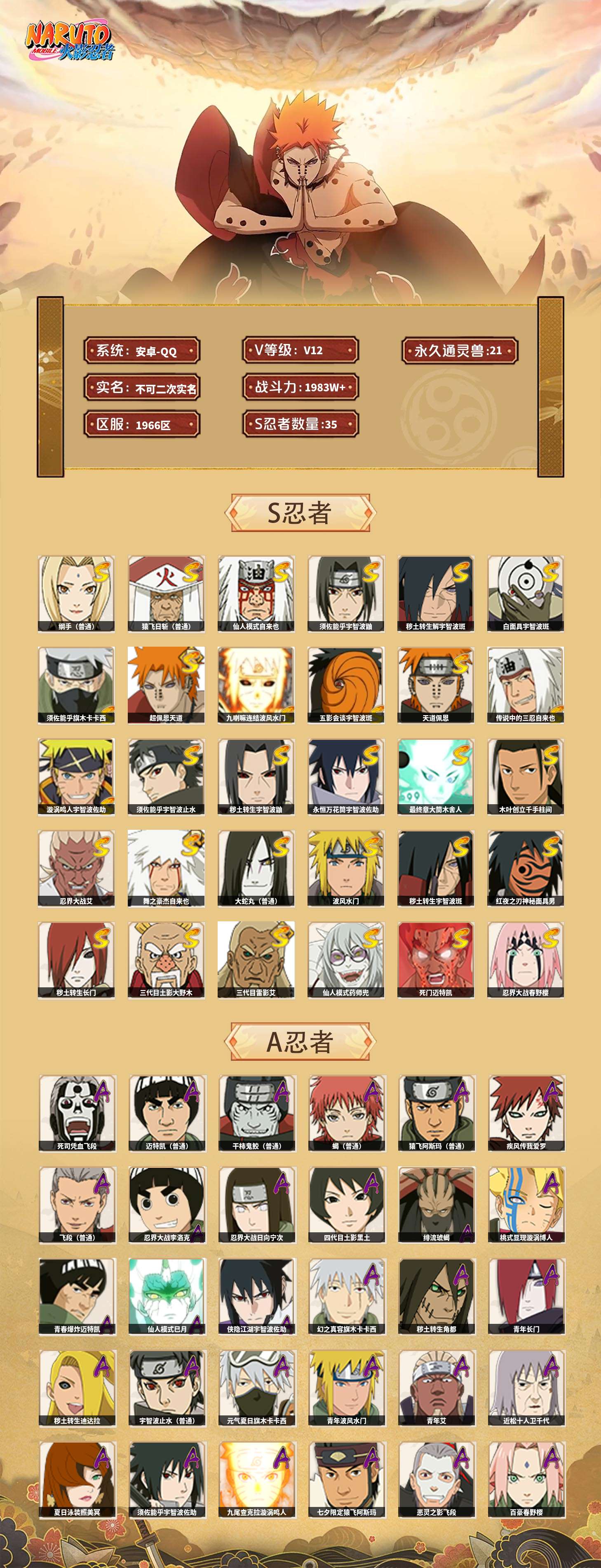 【火影忍者】【lyhy11395】战斗力:1983w;段位:中忍3阶;本服排名:40;vip:v12级;s忍:35个;a忍:56个;通灵兽:21个,s忍:秽土转生解宇智波斑|白面具宇智波斑|须佐能乎旗木卡卡西|超佩恩天道|九喇嘛连结波风水门|五影会谈宇智波斑|天道佩恩|传说中的三忍自来也|漩涡鸣人宇智波佐助|须佐能乎宇智波止水|秽土转生宇智波鼬|永恒万花筒宇智波佐助|最终章大筒木舍人|仙人模式自来也 4星|木叶创立千手柱间|忍界大战艾|舞之豪杰自来也|大蛇丸(普通)|纲手(普通) 5星|波风水门|秽土转生宇智波斑|须佐能乎宇智波鼬 4星|红夜之刃神秘面具男|秽土转生长门|三代目土影大野木|三代目雷影艾|仙人模式药师兜|死门迈特凯|忍界大战春野樱|九喇嘛连结漩涡鸣人|猿飞日斩(普通) 5星|秽土转生猿飞日斩|自来也(普通)|暴怒第六尾漩涡鸣人|初代目风影烈斗__a忍:青春爆炸迈特凯|仙人模式巳月|侠隐江湖宇智波佐助|幻之真容旗木卡卡西|忍界大战李洛克 3星|秽土转生角都|忍界大战日向宁次 3星|四代目土影黑土 3星|青年长门|秽土转生迪达拉|宇智波止水(普通)|元气夏日旗木卡卡西|青年波风水门|青年艾|近松十人卫千代|夏日泳装照美冥|须佐能乎宇智波佐助|九尾查克拉漩涡鸣人|七夕限定猿飞阿斯玛|恶灵之影飞段|百豪春野樱|忍界大战秋道丁次|忍界大战我爱罗|新春限定波风水门|夏日泳装小南|万花筒写轮眼宇智波佐助|五代目水影照美冥|五代目雷影达鲁伊|黑绝|死司凭血飞段 5星|疾风传我爱罗 4星|迪达拉(普通)|飞段(普通) 4星|小南(普通)|漂泊浪客小南|仙人模式漩涡鸣人|万花筒写轮眼旗木卡卡西|迈特凯(普通) 5星|宇智波鼬(普通)|夏日限定宇智波鼬|干柿鬼鲛(普通) 5星|秽土转生桃地再不斩|桃地再不斩|蝎(普通) 5星|绯流琥蝎 3星|猿飞阿斯玛(普通) 5星|桃式显现漩涡博人 3星|最终章日向雏田|六代目水影长十郎|不缘|新春限定大蛇丸|宇智波泉奈|羁绊神农|忍界大战土台|初始形态机械鸣人|侠隐江湖大野木__通灵兽:忍犬(普通)|蓝蛇|蛤蟆吉|忍龟|镰鼬|猿魔|山椒鱼|蜃|蛞蝓(普通)|蛤蟆仙人|鲛鲨|蛤蟆健|乌鸦(普通)|砂之守鹤|蛤蟆龙|蛤蟆广|梦貘|鹰|熊猫|蜘蛛|辛牙