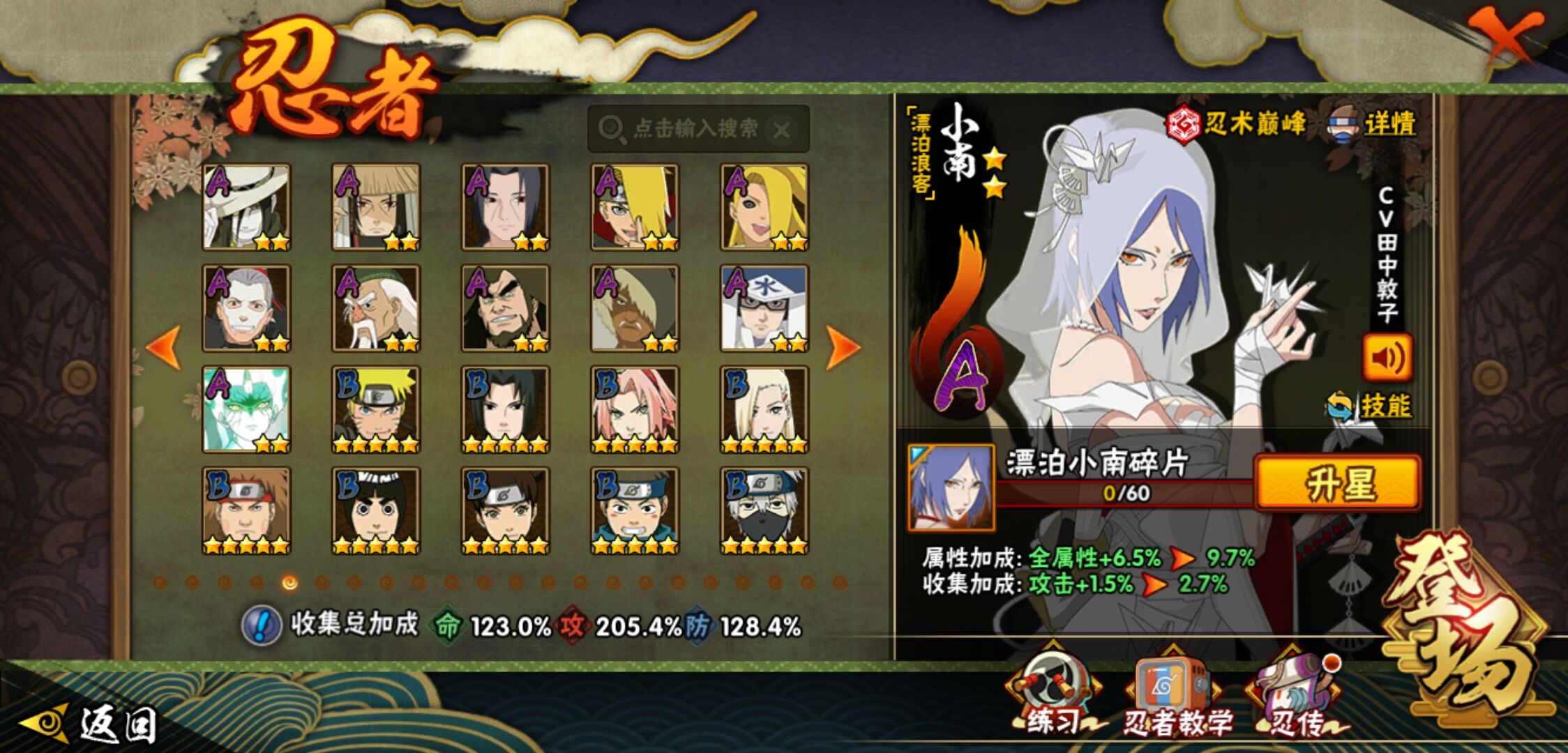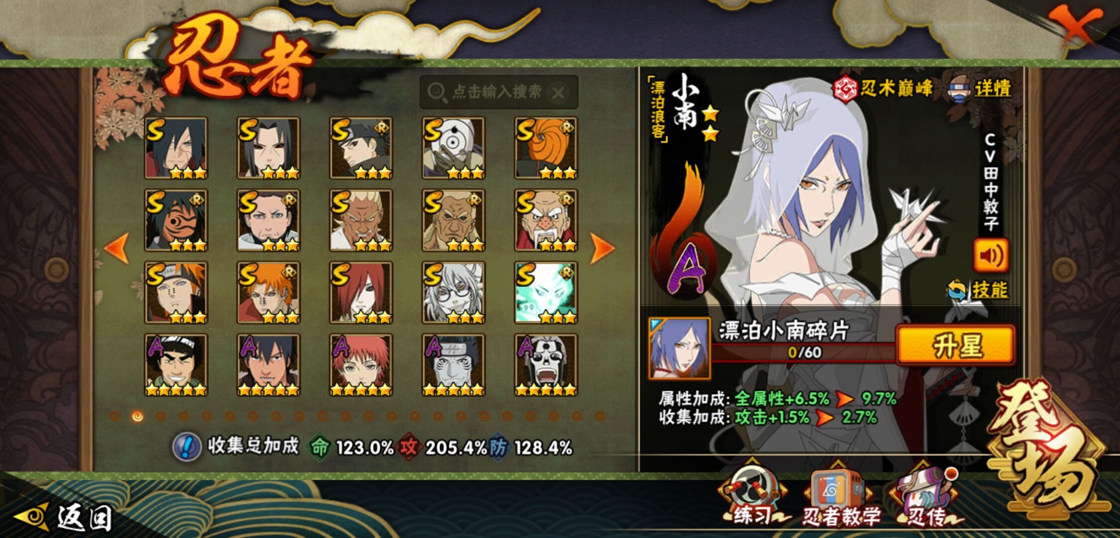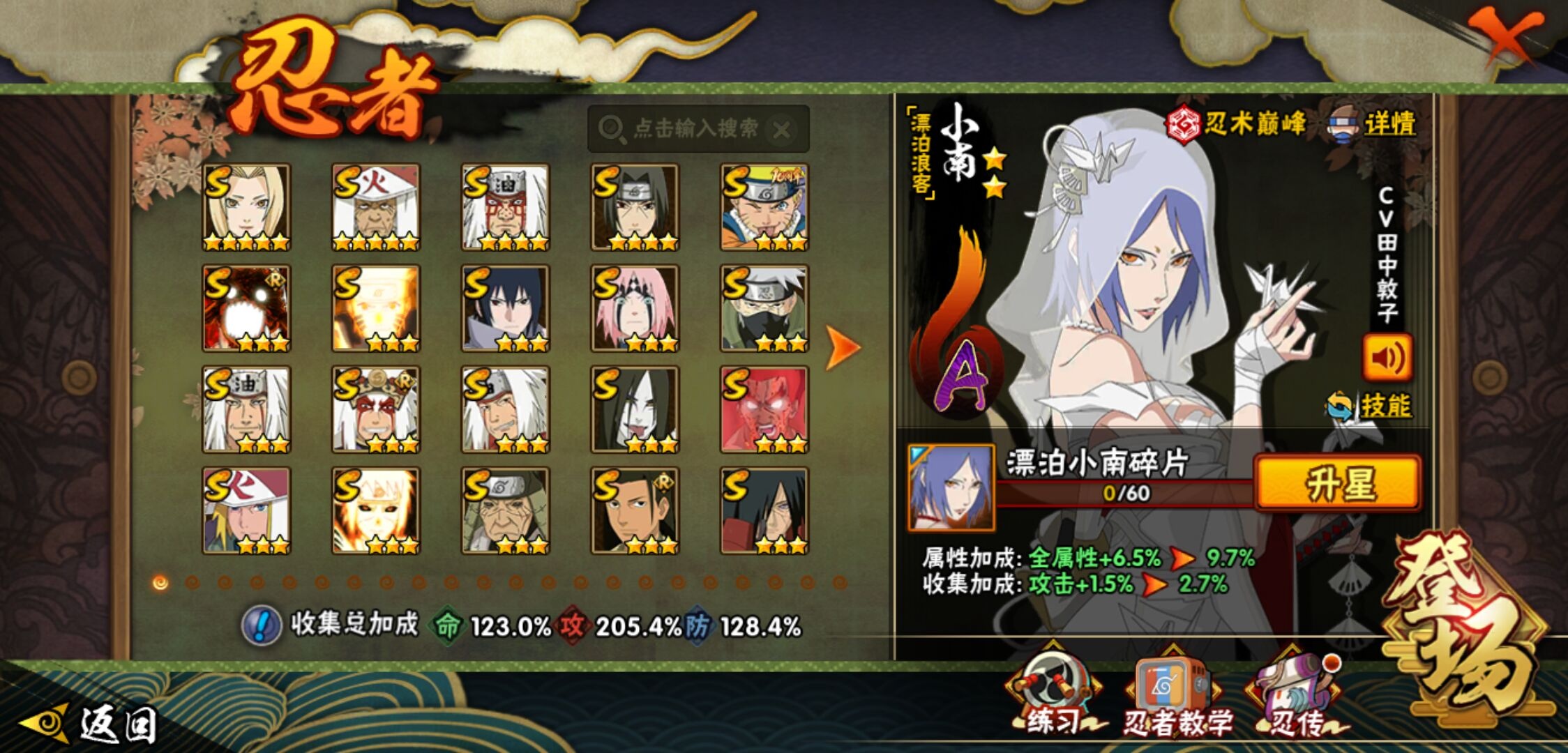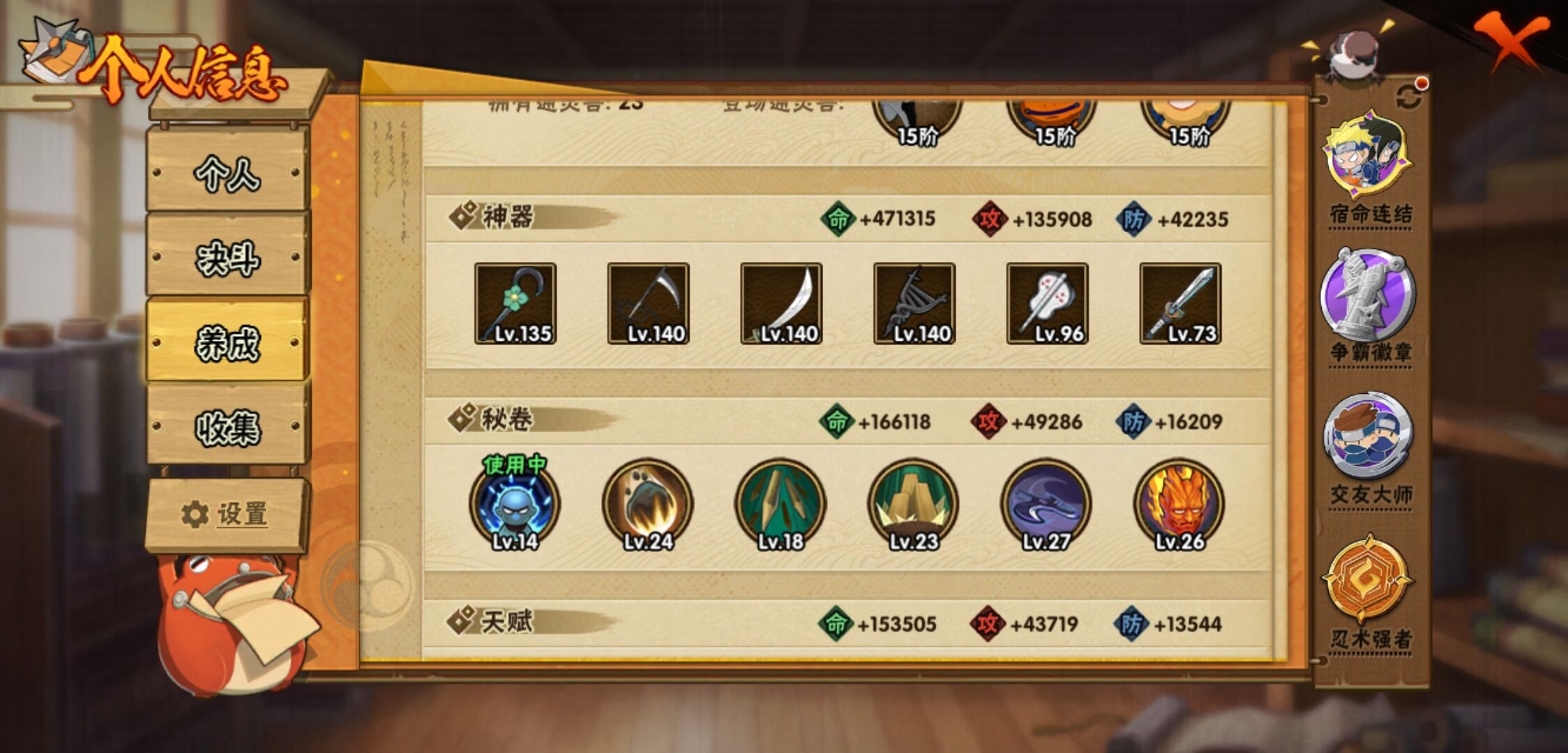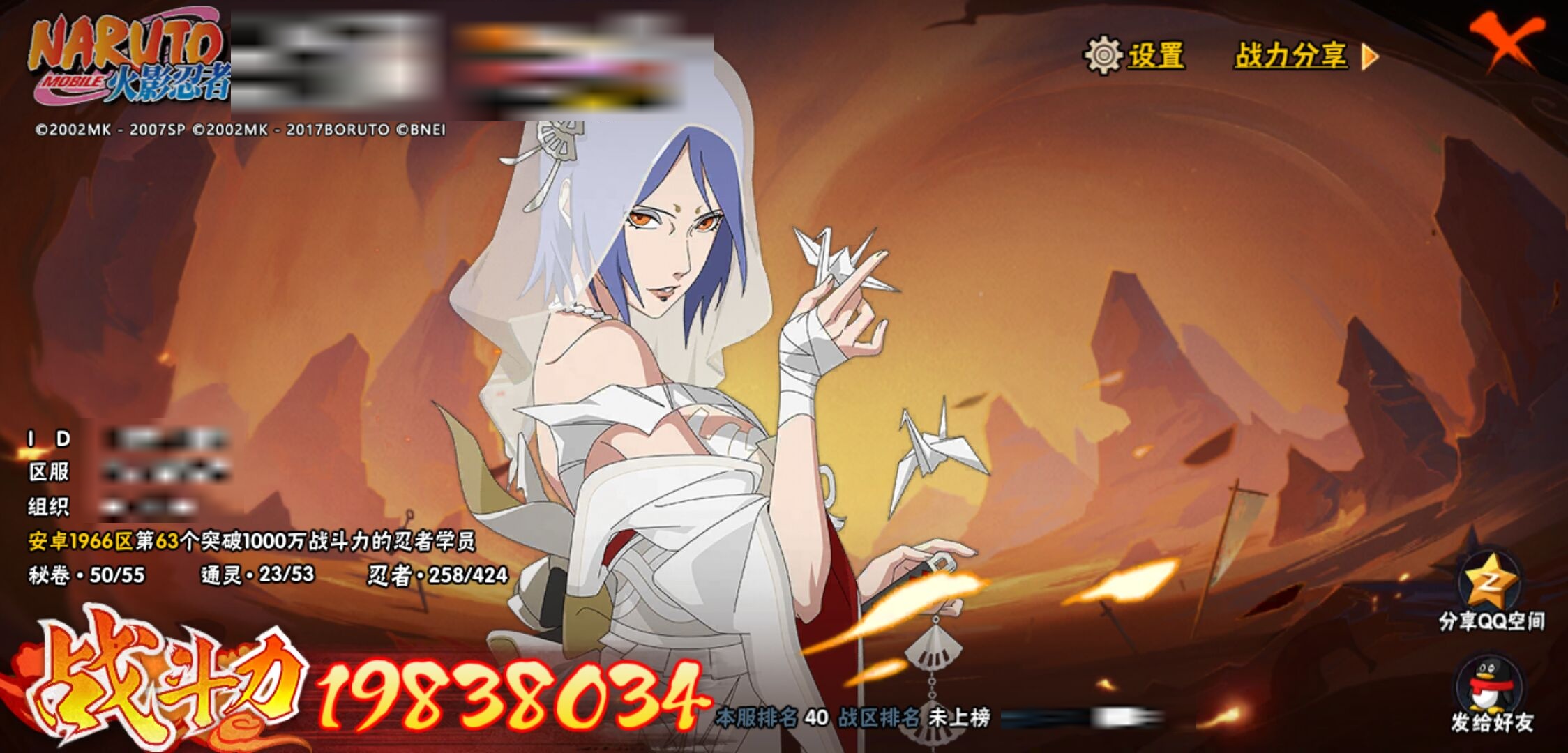 【火影忍者】【lyhy11395】战斗力:1983w;段位:中忍3阶;本服排名:40;vip:v12级;s忍:35个;a忍:56个;通灵兽:21个,s忍:秽土转生解宇智波斑|白面具宇智波斑|须佐能乎旗木卡卡西|超佩恩天道|九喇嘛连结波风水门|五影会谈宇智波斑|天道佩恩|传说中的三忍自来也|漩涡鸣人宇智波佐助|须佐能乎宇智波止水|秽土转生宇智波鼬|永恒万花筒宇智波佐助|最终章大筒木舍人|仙人模式自来也 4星|木叶创立千手柱间|忍界大战艾|舞之豪杰自来也|大蛇丸(普通)|纲手(普通) 5星|波风水门|秽土转生宇智波斑|须佐能乎宇智波鼬 4星|红夜之刃神秘面具男|秽土转生长门|三代目土影大野木|三代目雷影艾|仙人模式药师兜|死门迈特凯|忍界大战春野樱|九喇嘛连结漩涡鸣人|猿飞日斩(普通) 5星|秽土转生猿飞日斩|自来也(普通)|暴怒第六尾漩涡鸣人|初代目风影烈斗__a忍:青春爆炸迈特凯|仙人模式巳月|侠隐江湖宇智波佐助|幻之真容旗木卡卡西|忍界大战李洛克 3星|秽土转生角都|忍界大战日向宁次 3星|四代目土影黑土 3星|青年长门|秽土转生迪达拉|宇智波止水(普通)|元气夏日旗木卡卡西|青年波风水门|青年艾|近松十人卫千代|夏日泳装照美冥|须佐能乎宇智波佐助|九尾查克拉漩涡鸣人|七夕限定猿飞阿斯玛|恶灵之影飞段|百豪春野樱|忍界大战秋道丁次|忍界大战我爱罗|新春限定波风水门|夏日泳装小南|万花筒写轮眼宇智波佐助|五代目水影照美冥|五代目雷影达鲁伊|黑绝|死司凭血飞段 5星|疾风传我爱罗 4星|迪达拉(普通)|飞段(普通) 4星|小南(普通)|漂泊浪客小南|仙人模式漩涡鸣人|万花筒写轮眼旗木卡卡西|迈特凯(普通) 5星|宇智波鼬(普通)|夏日限定宇智波鼬|干柿鬼鲛(普通) 5星|秽土转生桃地再不斩|桃地再不斩|蝎(普通) 5星|绯流琥蝎 3星|猿飞阿斯玛(普通) 5星|桃式显现漩涡博人 3星|最终章日向雏田|六代目水影长十郎|不缘|新春限定大蛇丸|宇智波泉奈|羁绊神农|忍界大战土台|初始形态机械鸣人|侠隐江湖大野木__通灵兽:忍犬(普通)|蓝蛇|蛤蟆吉|忍龟|镰鼬|猿魔|山椒鱼|蜃|蛞蝓(普通)|蛤蟆仙人|鲛鲨|蛤蟆健|乌鸦(普通)|砂之守鹤|蛤蟆龙|蛤蟆广|梦貘|鹰|熊猫|蜘蛛|辛牙