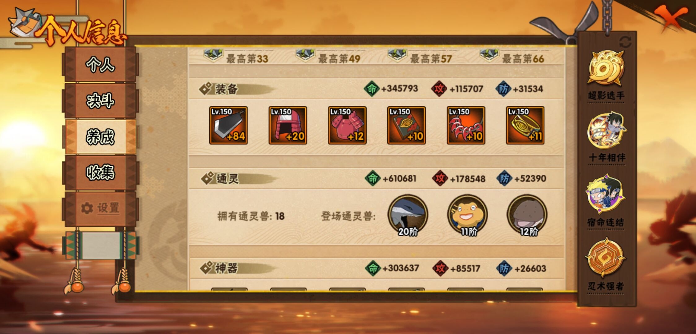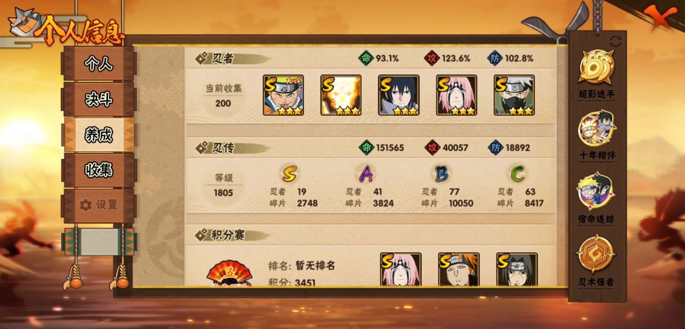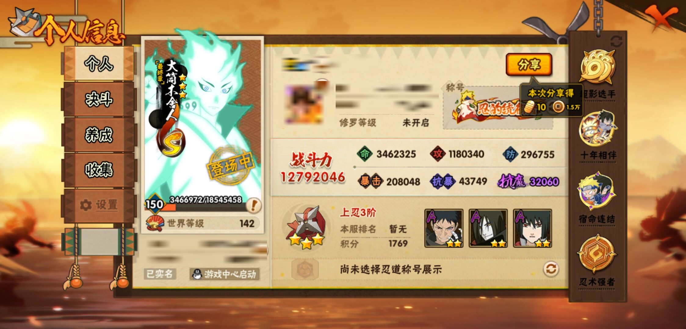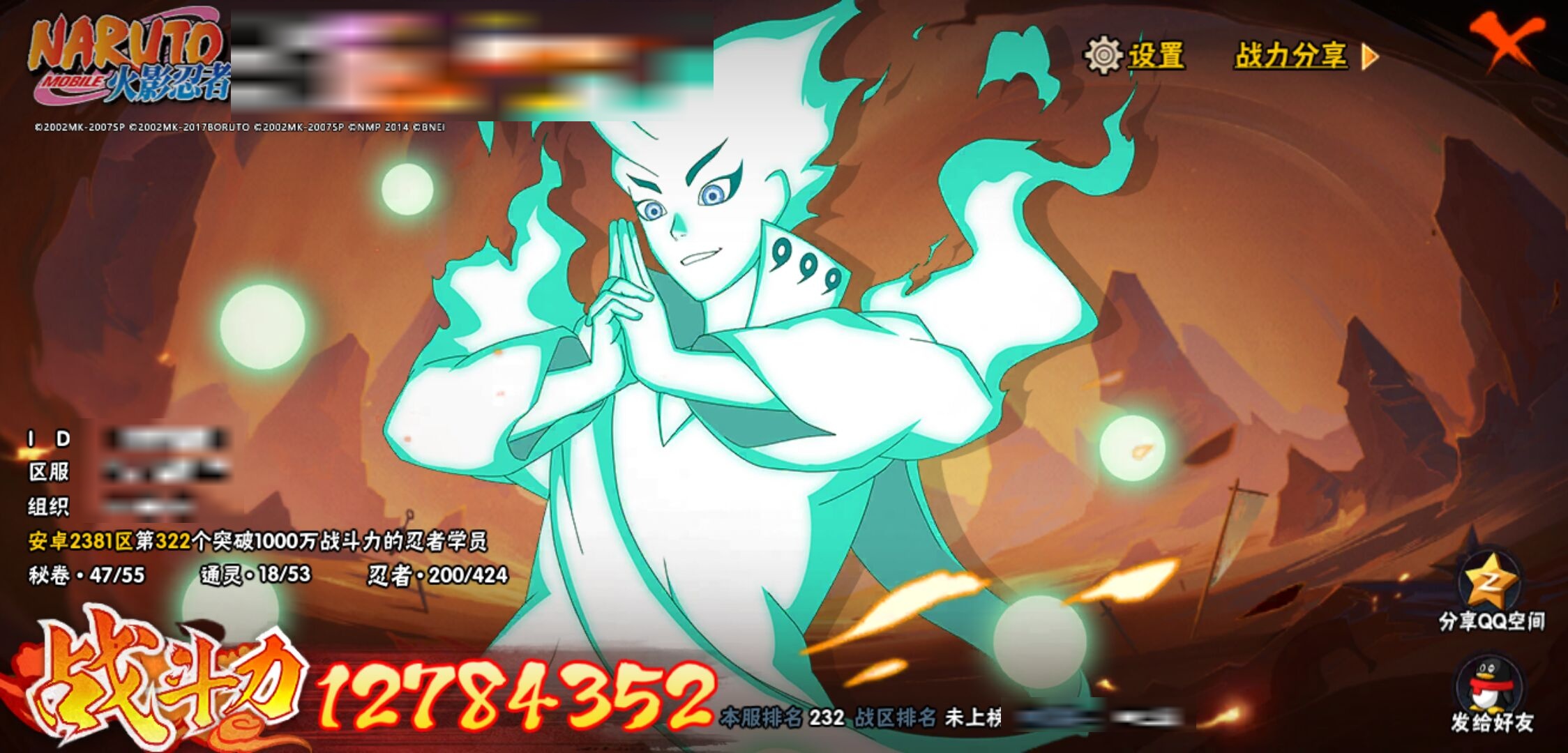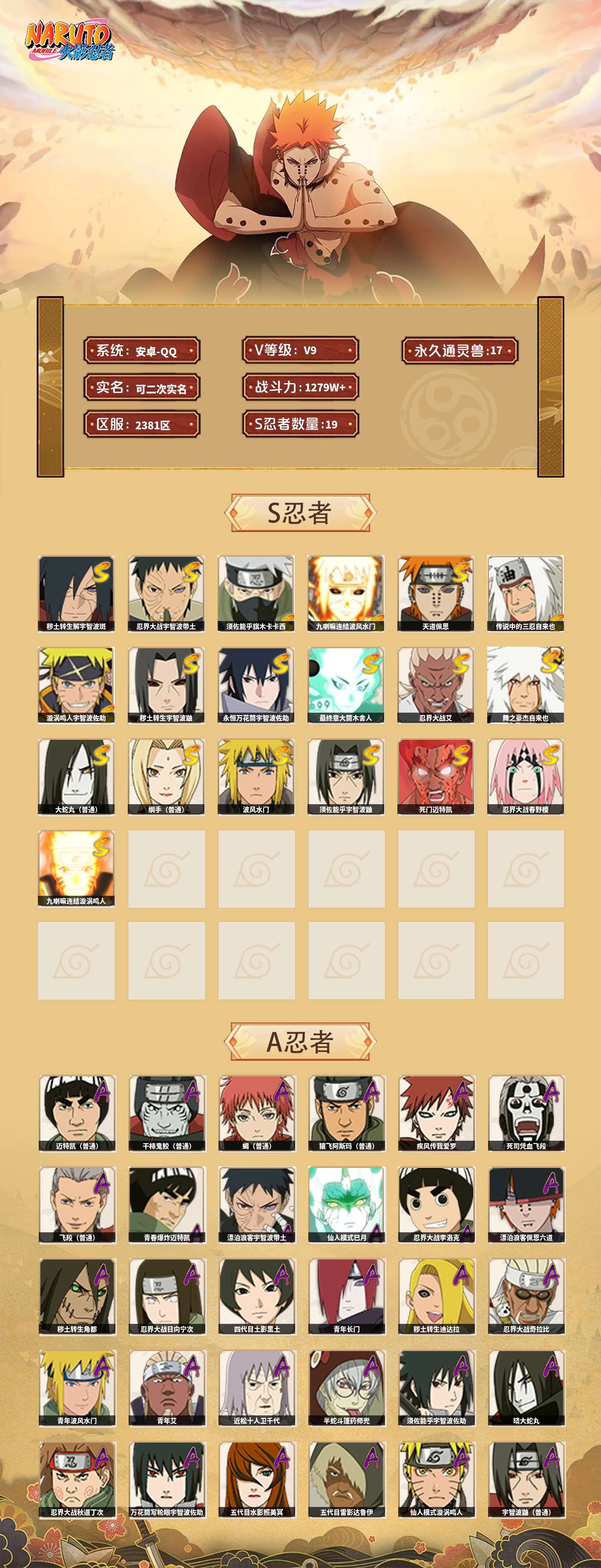【火影忍者】【lyhy11396】战斗力:1279w;段位:上忍3阶;本服排名:232;vip:v9级;s忍:19个;a忍:41个;通灵兽:17个,s忍:秽土转生解宇智波斑|忍界大战宇智波带土|须佐能乎旗木卡卡西|九喇嘛连结波风水门|天道佩恩|传说中的三忍自来也|漩涡鸣人宇智波佐助|秽土转生宇智波鼬|永恒万花筒宇智波佐助|最终章大筒木舍人|忍界大战艾|舞之豪杰自来也|大蛇丸(普通)|纲手(普通)|波风水门|须佐能乎宇智波鼬|死门迈特凯|忍界大战春野樱|九喇嘛连结漩涡鸣人__a忍:青春爆炸迈特凯|漂泊浪客宇智波带土|仙人模式巳月|忍界大战李洛克|漂泊浪客佩恩六道|秽土转生角都|忍界大战日向宁次|四代目土影黑土|青年长门|秽土转生迪达拉|忍界大战奇拉比|青年波风水门|青年艾|近松十人卫千代|半蛇斗篷药师兜|须佐能乎宇智波佐助|晓大蛇丸|忍界大战秋道丁次|万花筒写轮眼宇智波佐助|五代目水影照美冥|五代目雷影达鲁伊|死司凭血飞段 3星|疾风传我爱罗 4星|飞段(普通) 3星|仙人模式漩涡鸣人|迈特凯(普通) 5星|宇智波鼬(普通)|夏日限定宇智波鼬|干柿鬼鲛(普通) 5星|秽土转生桃地再不斩|蝎(普通) 5星|绯流琥蝎|猿飞阿斯玛(普通) 5星|桃式显现漩涡博人|最终章日向雏田|六代目水影长十郎|不缘|宇智波泉奈|忍界大战土台|初始形态机械鸣人|侠隐江湖大野木__通灵兽:忍犬(普通)|蓝蛇|蛤蟆吉|忍龟|镰鼬|猿魔|山椒鱼|砂之守鹤|蜃|蛤蟆仙人|鲛鲨|蛤蟆健|乌鸦(普通)|蛤蟆龙|蛤蟆广|蛞蝓(普通)|梦貘