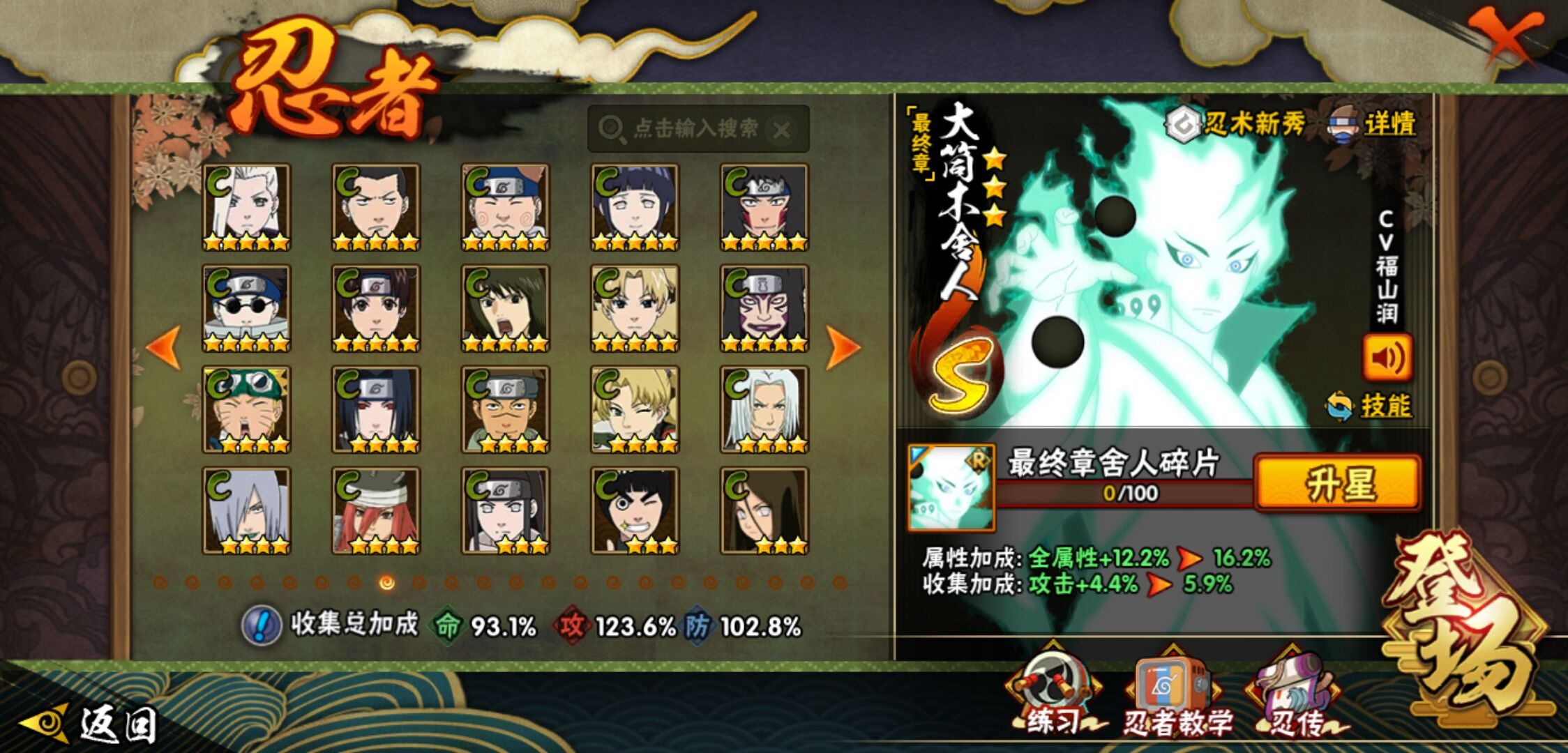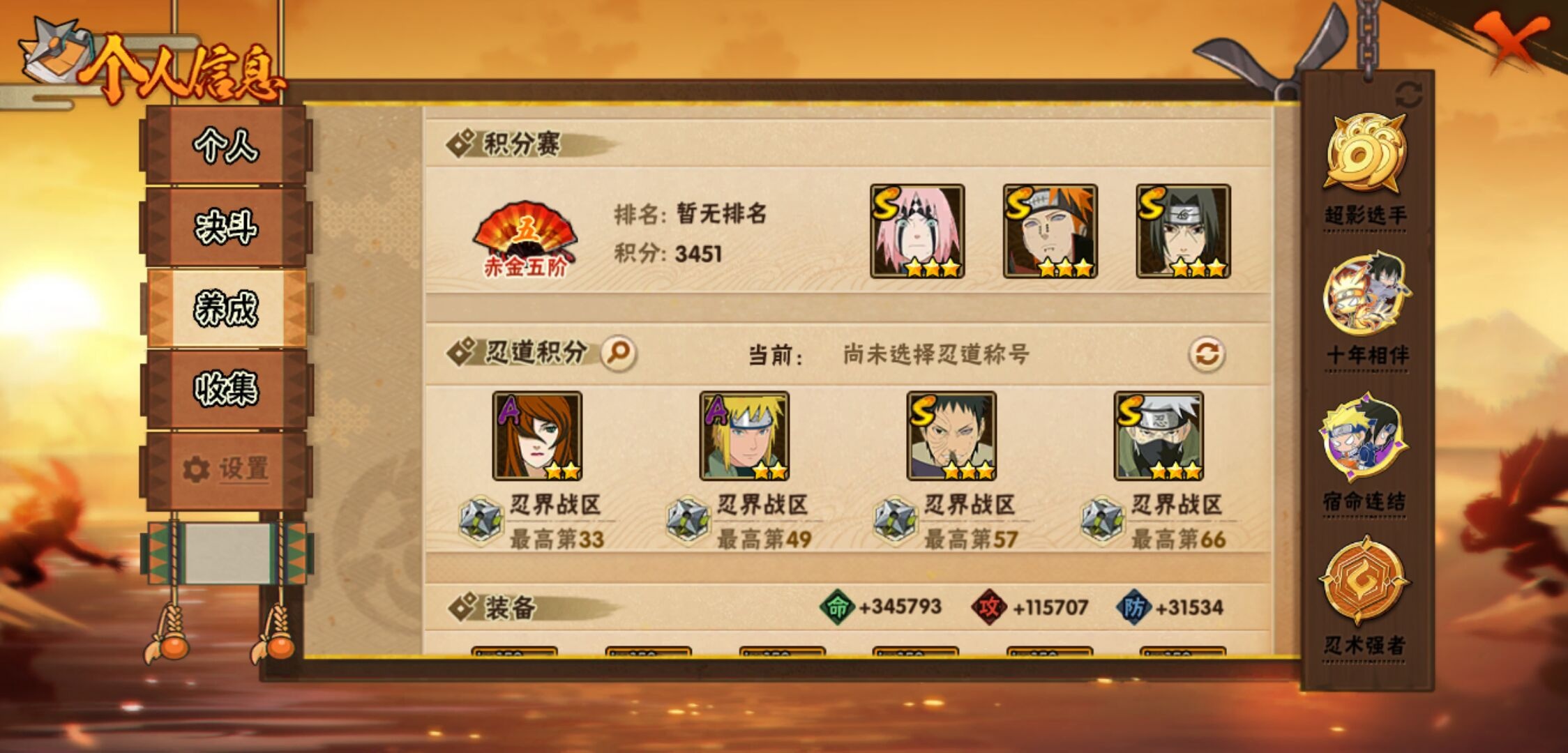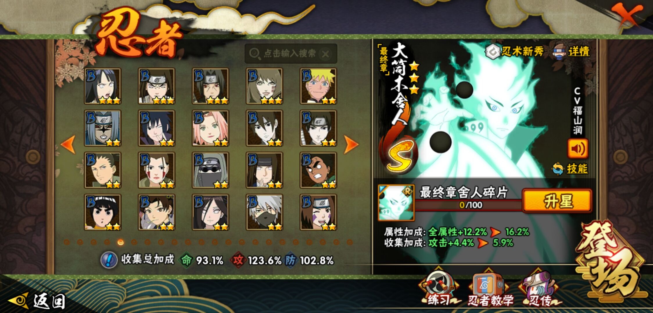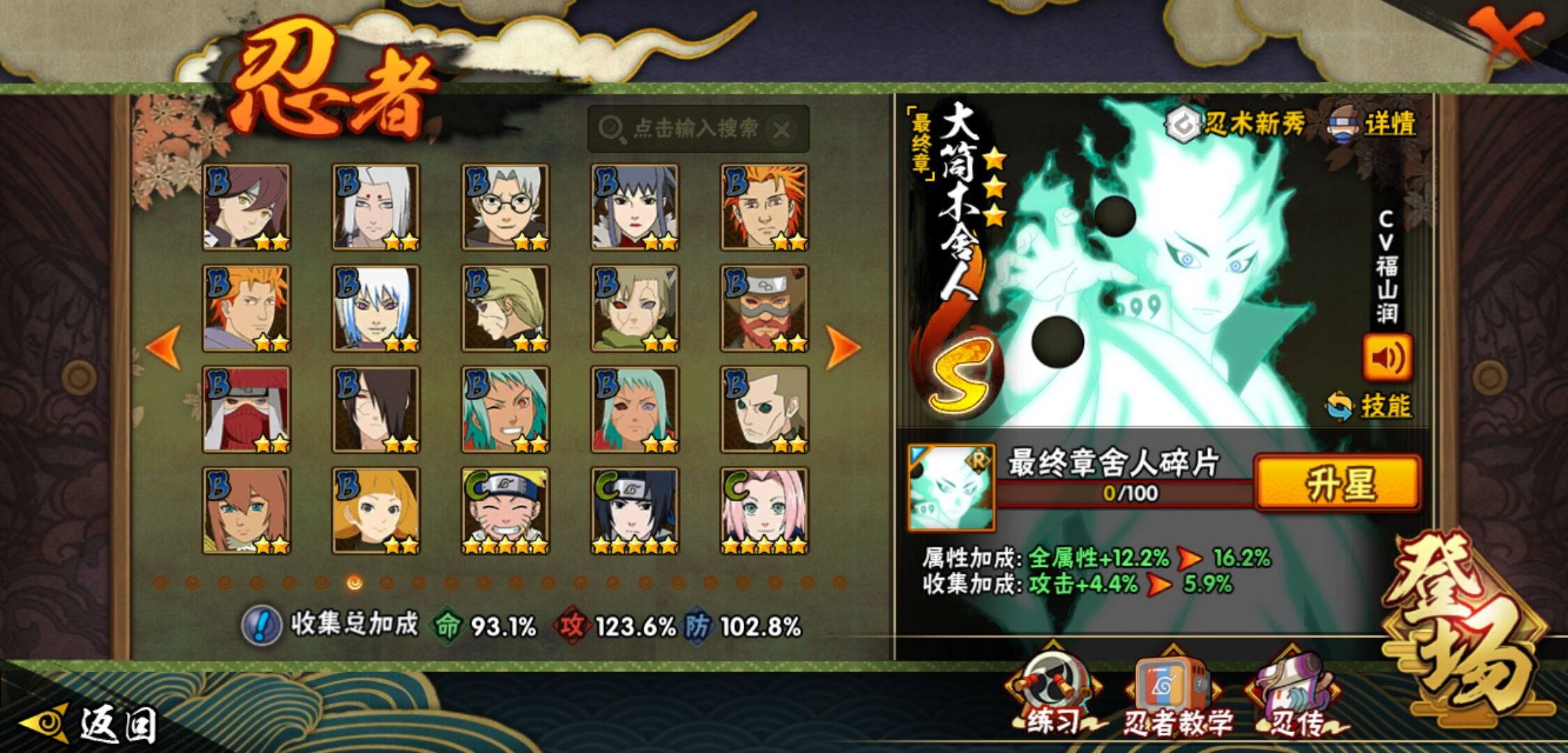 【火影忍者】【lyhy11396】战斗力:1279w;段位:上忍3阶;本服排名:232;vip:v9级;s忍:19个;a忍:41个;通灵兽:17个,s忍:秽土转生解宇智波斑|忍界大战宇智波带土|须佐能乎旗木卡卡西|九喇嘛连结波风水门|天道佩恩|传说中的三忍自来也|漩涡鸣人宇智波佐助|秽土转生宇智波鼬|永恒万花筒宇智波佐助|最终章大筒木舍人|忍界大战艾|舞之豪杰自来也|大蛇丸(普通)|纲手(普通)|波风水门|须佐能乎宇智波鼬|死门迈特凯|忍界大战春野樱|九喇嘛连结漩涡鸣人__a忍:青春爆炸迈特凯|漂泊浪客宇智波带土|仙人模式巳月|忍界大战李洛克|漂泊浪客佩恩六道|秽土转生角都|忍界大战日向宁次|四代目土影黑土|青年长门|秽土转生迪达拉|忍界大战奇拉比|青年波风水门|青年艾|近松十人卫千代|半蛇斗篷药师兜|须佐能乎宇智波佐助|晓大蛇丸|忍界大战秋道丁次|万花筒写轮眼宇智波佐助|五代目水影照美冥|五代目雷影达鲁伊|死司凭血飞段 3星|疾风传我爱罗 4星|飞段(普通) 3星|仙人模式漩涡鸣人|迈特凯(普通) 5星|宇智波鼬(普通)|夏日限定宇智波鼬|干柿鬼鲛(普通) 5星|秽土转生桃地再不斩|蝎(普通) 5星|绯流琥蝎|猿飞阿斯玛(普通) 5星|桃式显现漩涡博人|最终章日向雏田|六代目水影长十郎|不缘|宇智波泉奈|忍界大战土台|初始形态机械鸣人|侠隐江湖大野木__通灵兽:忍犬(普通)|蓝蛇|蛤蟆吉|忍龟|镰鼬|猿魔|山椒鱼|砂之守鹤|蜃|蛤蟆仙人|鲛鲨|蛤蟆健|乌鸦(普通)|蛤蟆龙|蛤蟆广|蛞蝓(普通)|梦貘