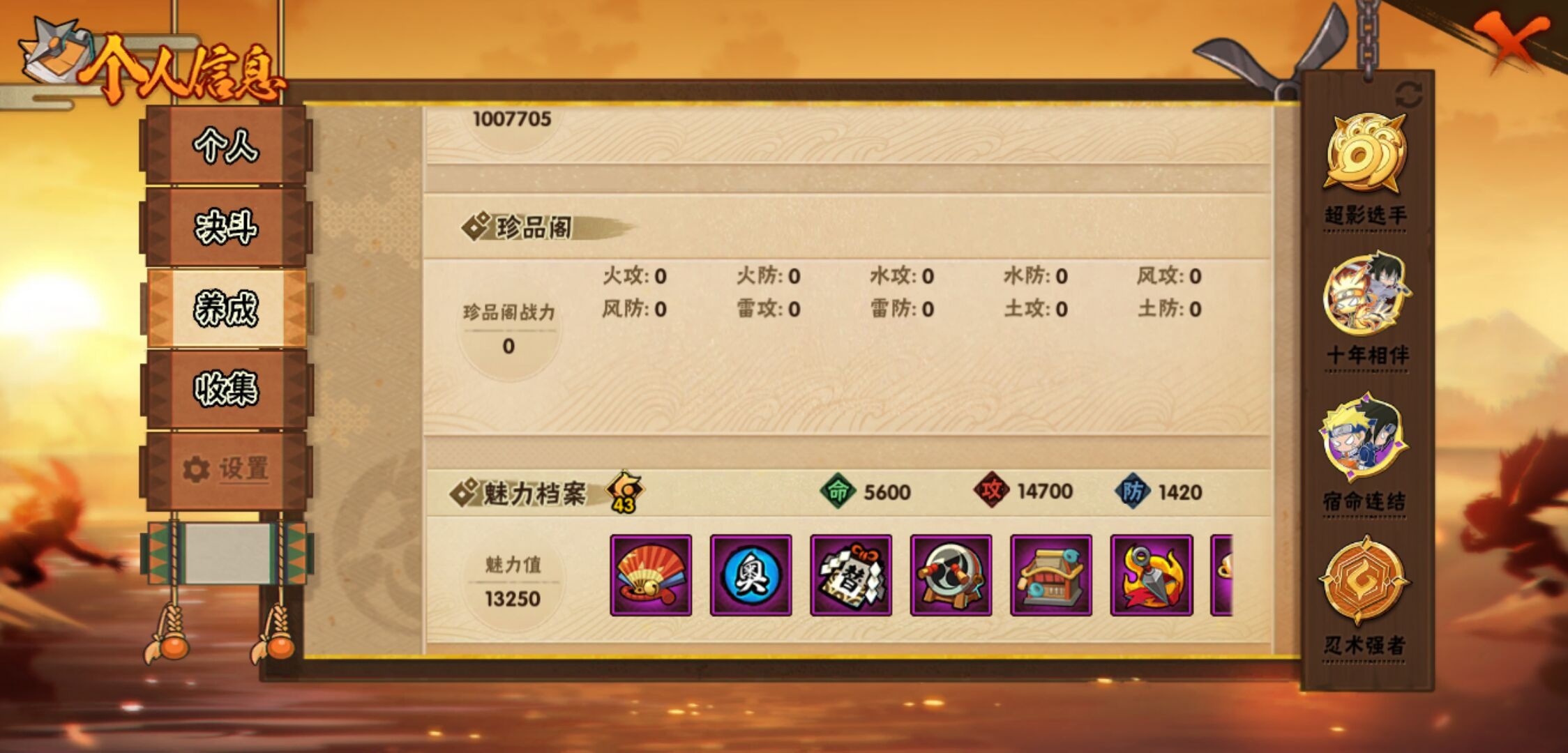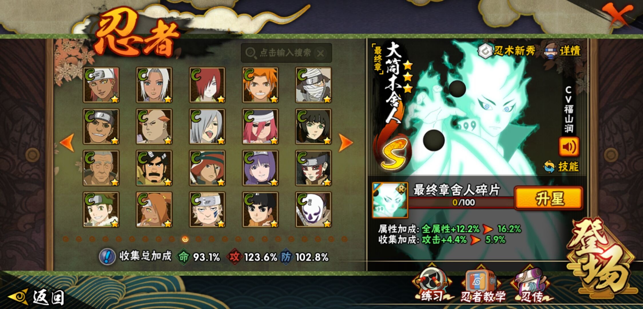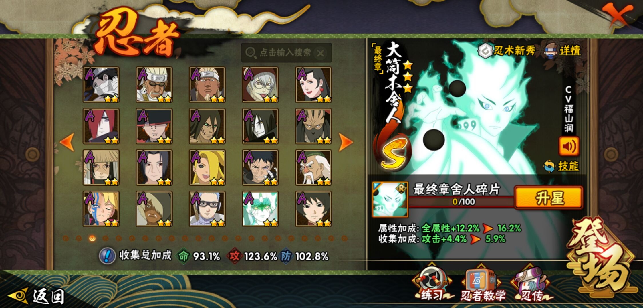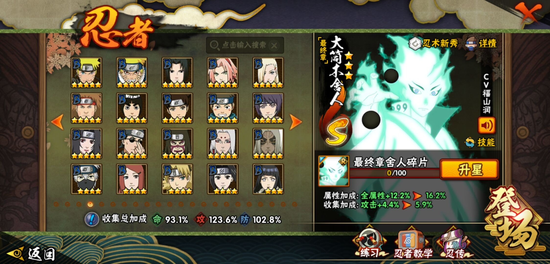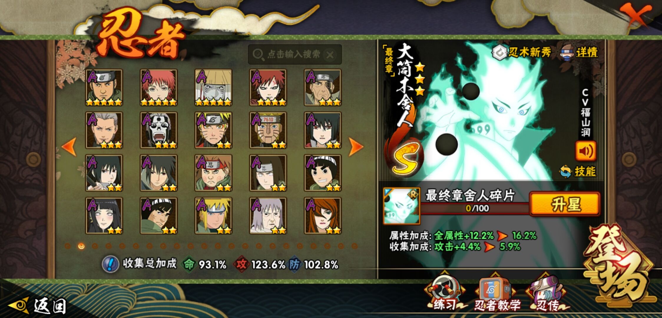 【火影忍者】【lyhy11396】战斗力:1279w;段位:上忍3阶;本服排名:232;vip:v9级;s忍:19个;a忍:41个;通灵兽:17个,s忍:秽土转生解宇智波斑|忍界大战宇智波带土|须佐能乎旗木卡卡西|九喇嘛连结波风水门|天道佩恩|传说中的三忍自来也|漩涡鸣人宇智波佐助|秽土转生宇智波鼬|永恒万花筒宇智波佐助|最终章大筒木舍人|忍界大战艾|舞之豪杰自来也|大蛇丸(普通)|纲手(普通)|波风水门|须佐能乎宇智波鼬|死门迈特凯|忍界大战春野樱|九喇嘛连结漩涡鸣人__a忍:青春爆炸迈特凯|漂泊浪客宇智波带土|仙人模式巳月|忍界大战李洛克|漂泊浪客佩恩六道|秽土转生角都|忍界大战日向宁次|四代目土影黑土|青年长门|秽土转生迪达拉|忍界大战奇拉比|青年波风水门|青年艾|近松十人卫千代|半蛇斗篷药师兜|须佐能乎宇智波佐助|晓大蛇丸|忍界大战秋道丁次|万花筒写轮眼宇智波佐助|五代目水影照美冥|五代目雷影达鲁伊|死司凭血飞段 3星|疾风传我爱罗 4星|飞段(普通) 3星|仙人模式漩涡鸣人|迈特凯(普通) 5星|宇智波鼬(普通)|夏日限定宇智波鼬|干柿鬼鲛(普通) 5星|秽土转生桃地再不斩|蝎(普通) 5星|绯流琥蝎|猿飞阿斯玛(普通) 5星|桃式显现漩涡博人|最终章日向雏田|六代目水影长十郎|不缘|宇智波泉奈|忍界大战土台|初始形态机械鸣人|侠隐江湖大野木__通灵兽:忍犬(普通)|蓝蛇|蛤蟆吉|忍龟|镰鼬|猿魔|山椒鱼|砂之守鹤|蜃|蛤蟆仙人|鲛鲨|蛤蟆健|乌鸦(普通)|蛤蟆龙|蛤蟆广|蛞蝓(普通)|梦貘
