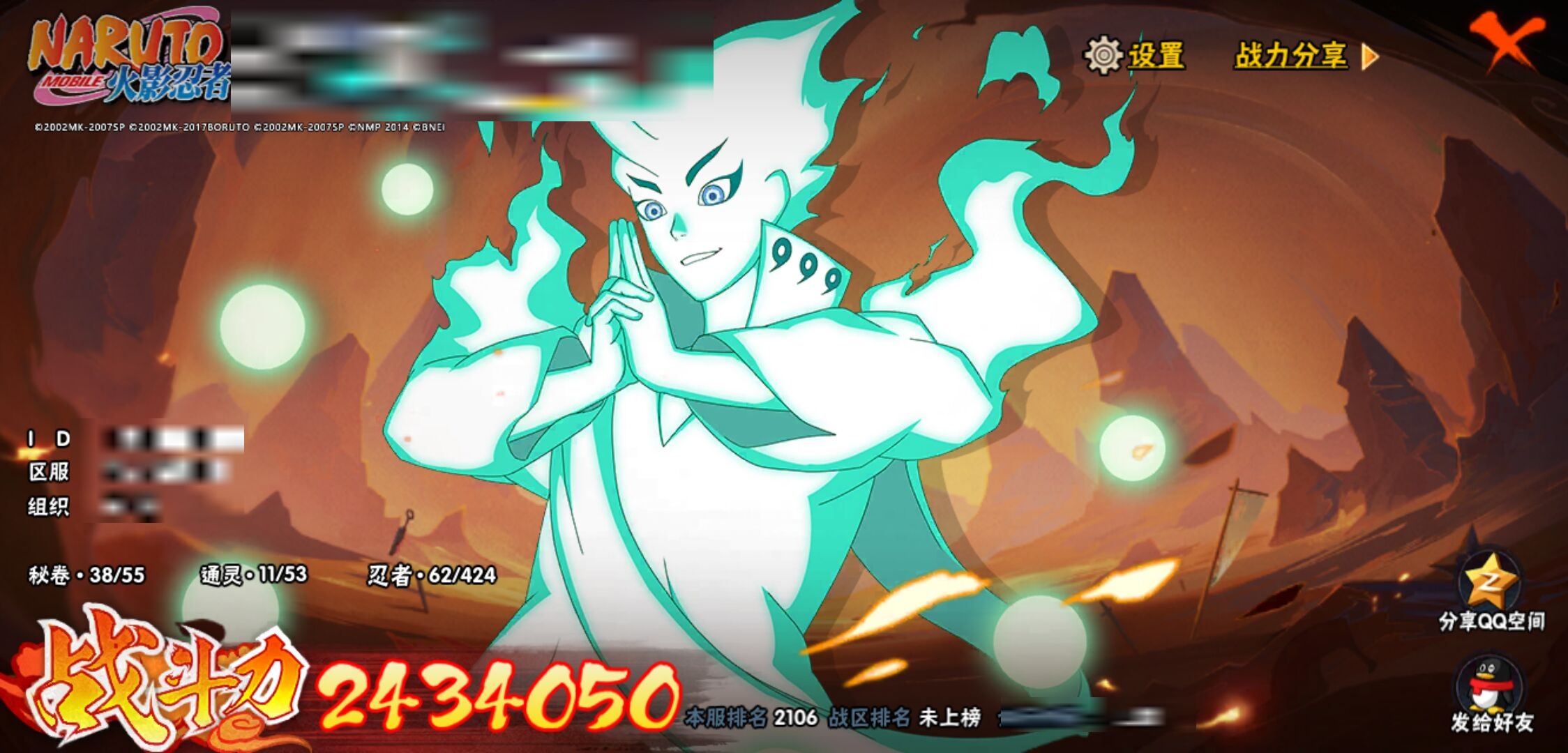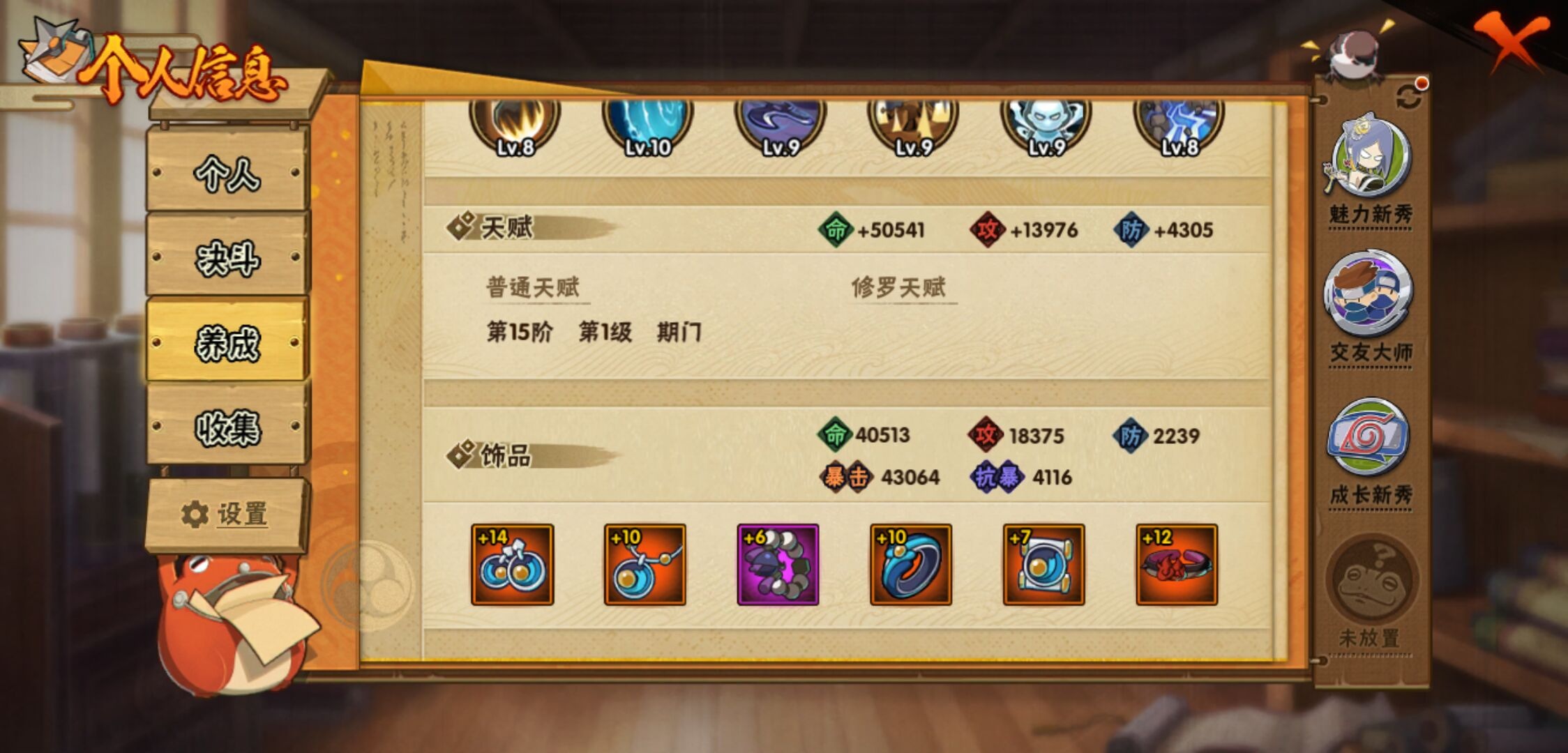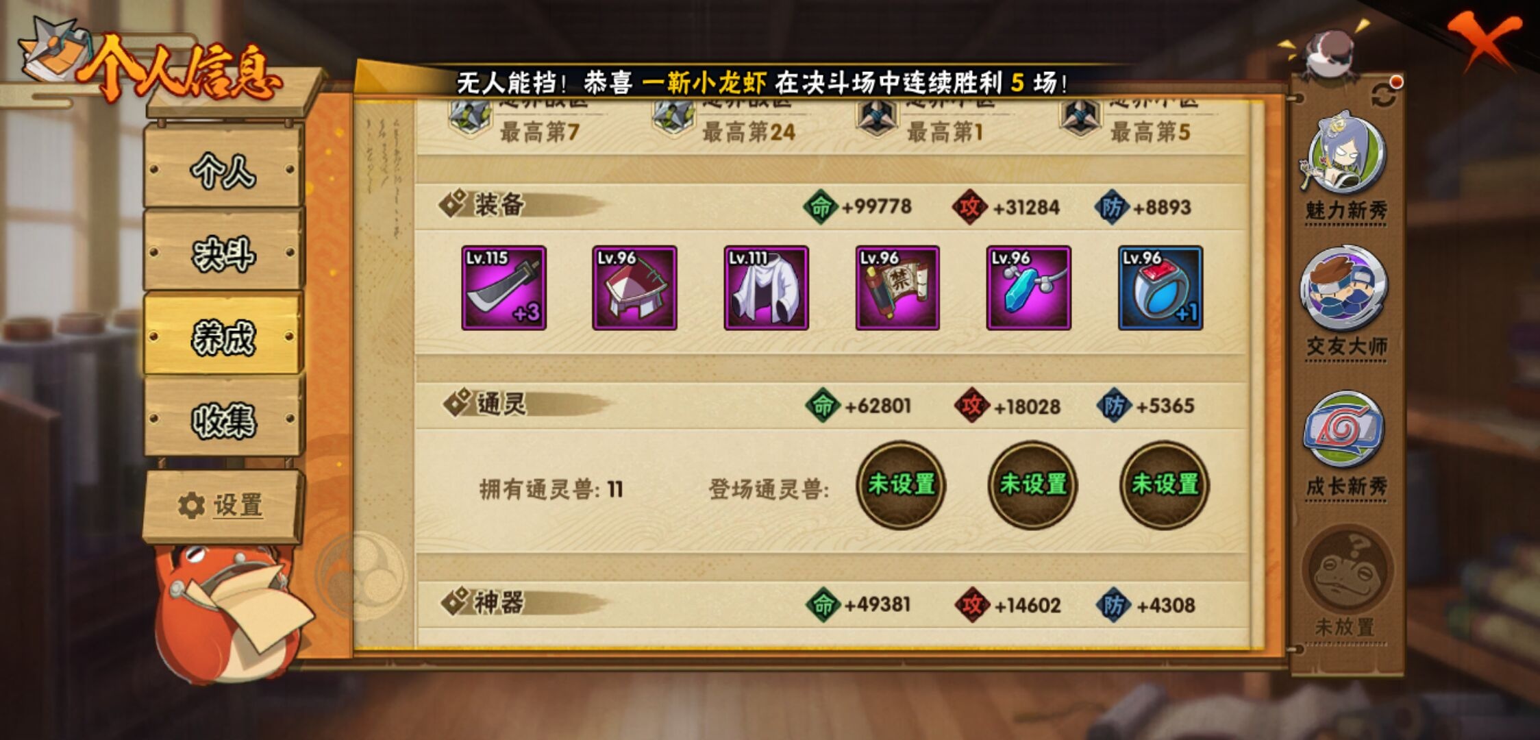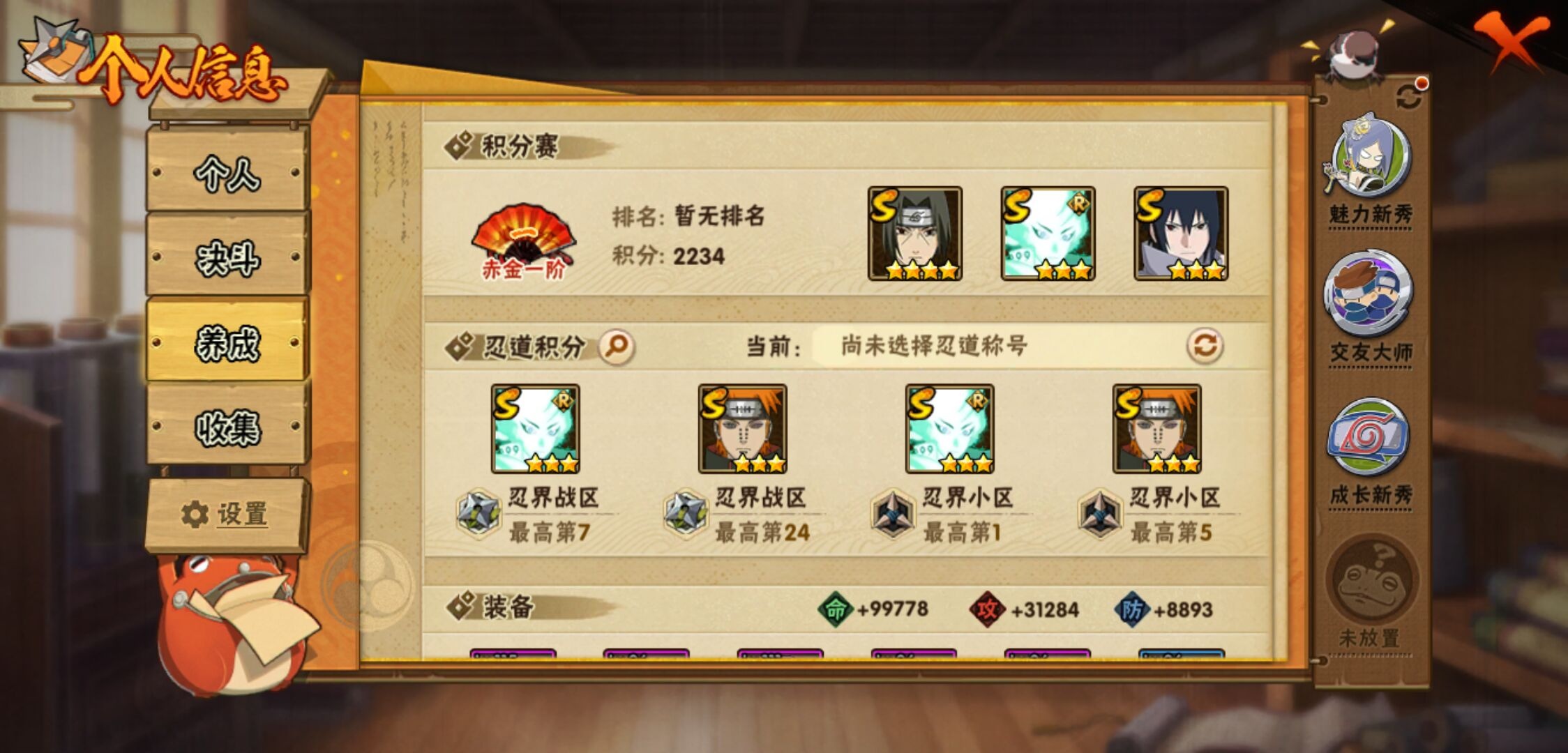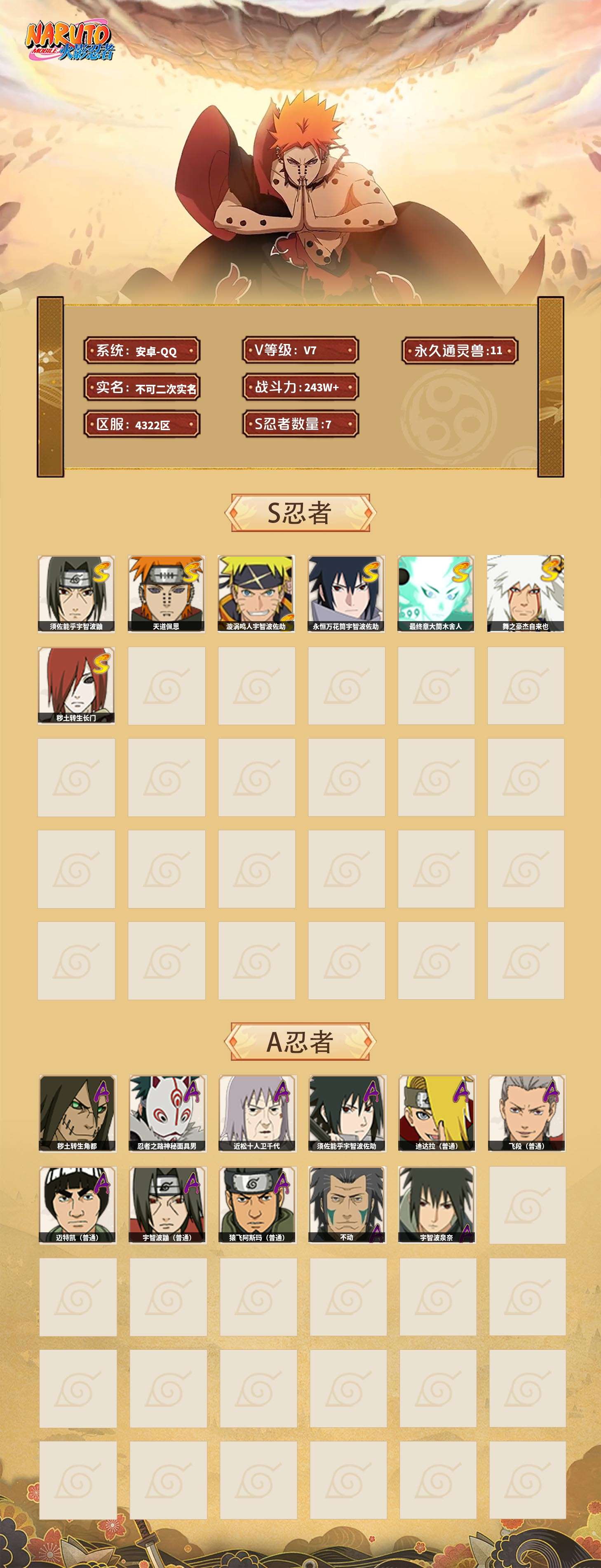 【火影忍者】【lyhy11391】战斗力:243w;段位:中忍2阶;本服排名:2106;vip:v7级;s忍:7个;a忍:11个;通灵兽:11个,s忍:天道佩恩|漩涡鸣人宇智波佐助|永恒万花筒宇智波佐助|最终章大筒木舍人|舞之豪杰自来也|须佐能乎宇智波鼬 4星|秽土转生长门__a忍:秽土转生角都|忍者之路神秘面具男|近松十人卫千代|须佐能乎宇智波佐助|迪达拉(普通)|飞段(普通)|迈特凯(普通)|宇智波鼬(普通)|猿飞阿斯玛(普通)|不动|宇智波泉奈__通灵兽:忍犬(普通)|蓝蛇|蛤蟆吉|忍龟|镰鼬|猿魔|砂之守鹤|山椒鱼|蜃|蛤蟆仙人|鲛鲨