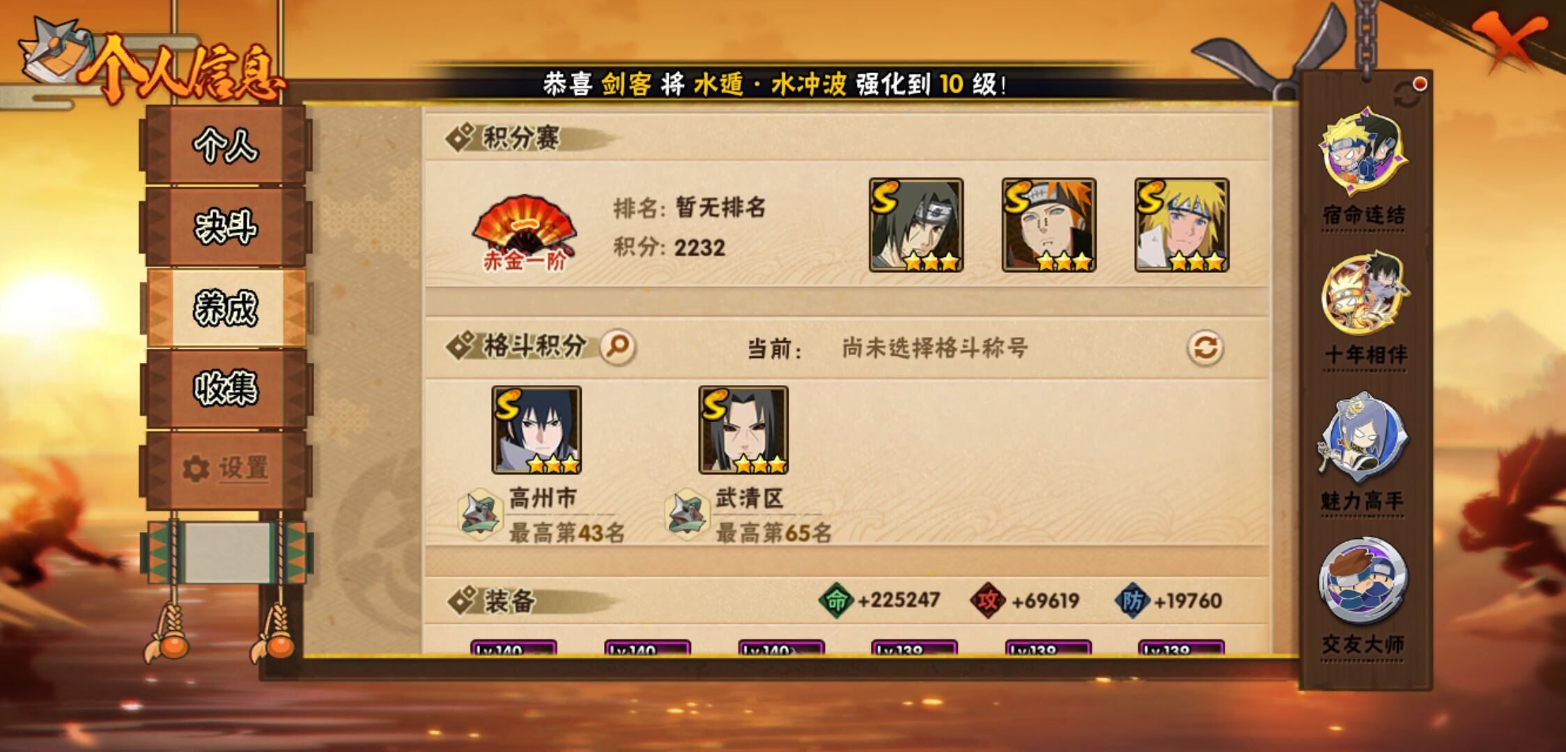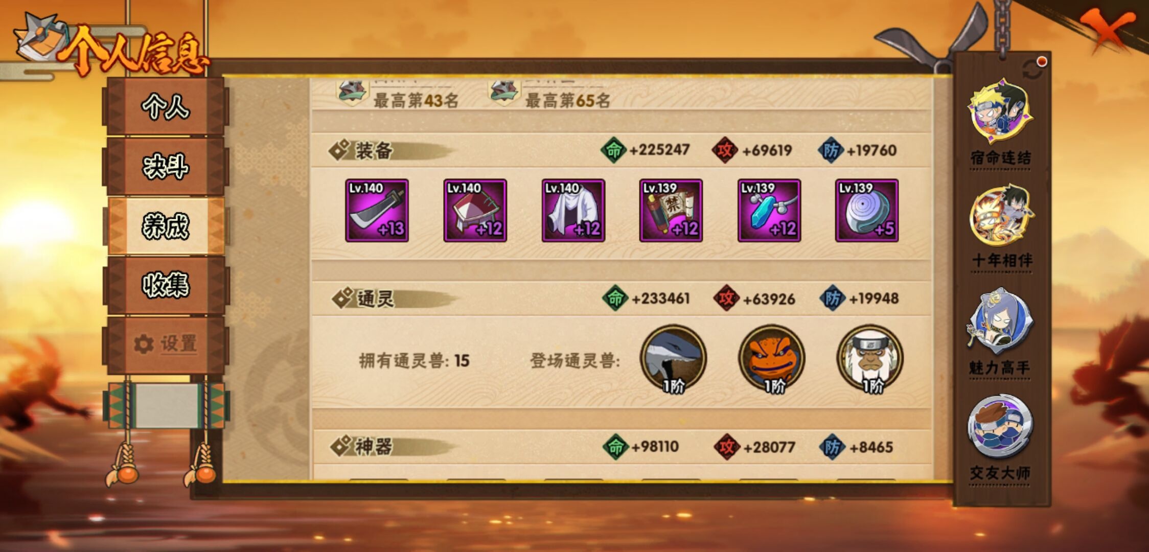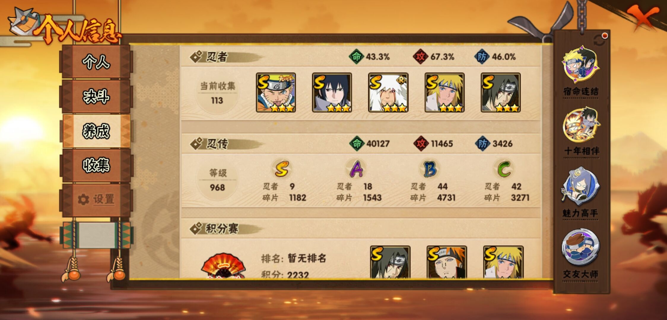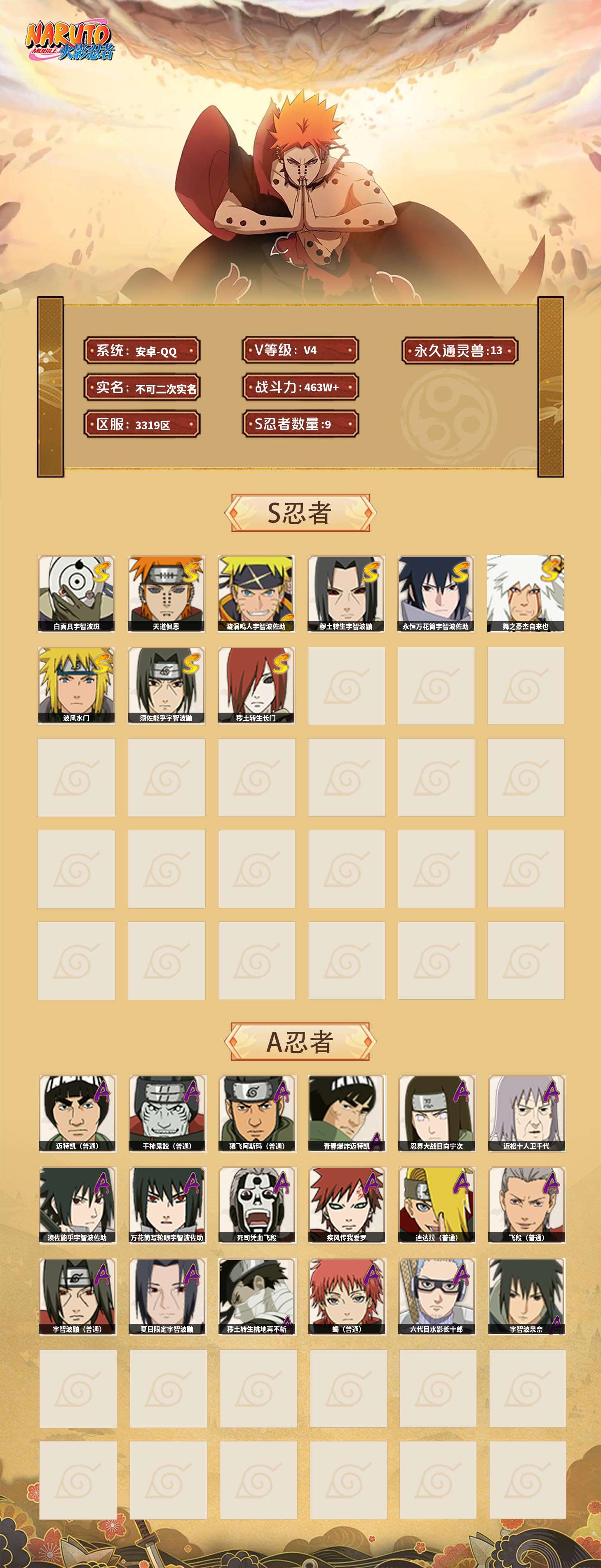 【火影忍者】【lyhy11393】战斗力:463w;段位:上忍2阶;本服排名:1949;vip:v4级;s忍:9个;a忍:18个;通灵兽:13个,s忍:白面具宇智波斑|天道佩恩|漩涡鸣人宇智波佐助|秽土转生宇智波鼬|永恒万花筒宇智波佐助|舞之豪杰自来也|波风水门|须佐能乎宇智波鼬|秽土转生长门__a忍:青春爆炸迈特凯|忍界大战日向宁次|近松十人卫千代|须佐能乎宇智波佐助|万花筒写轮眼宇智波佐助|死司凭血飞段|疾风传我爱罗|迪达拉(普通)|飞段(普通)|迈特凯(普通) 4星|宇智波鼬(普通)|夏日限定宇智波鼬|干柿鬼鲛(普通) 4星|秽土转生桃地再不斩|蝎(普通)|猿飞阿斯玛(普通) 4星|六代目水影长十郎|宇智波泉奈__通灵兽:忍犬(普通)|蓝蛇|蛤蟆吉|忍龟|砂之守鹤|镰鼬|猿魔|山椒鱼|蜃|蛤蟆仙人|鲛鲨|蛤蟆健|乌鸦(普通)