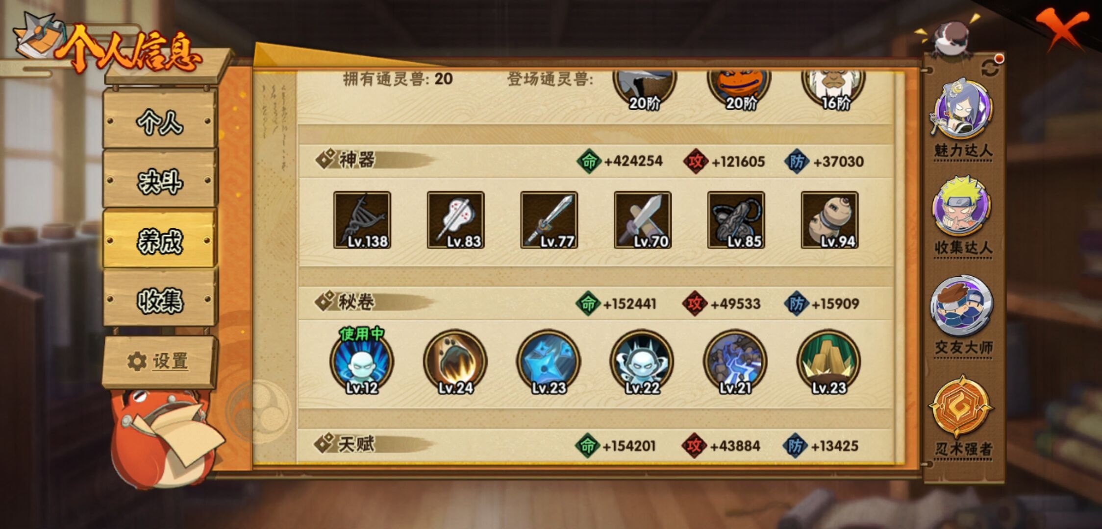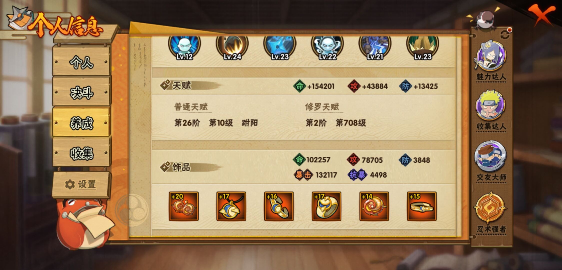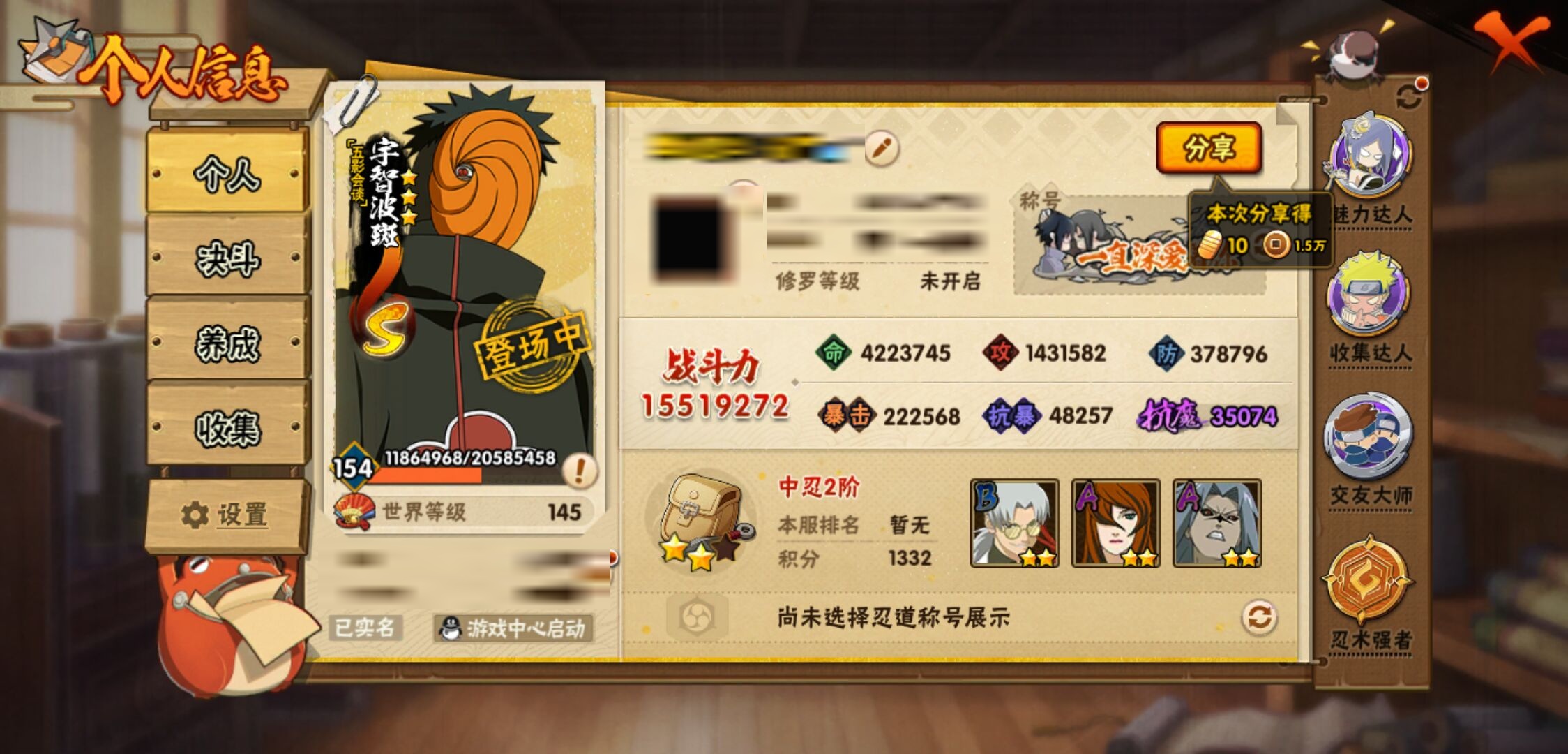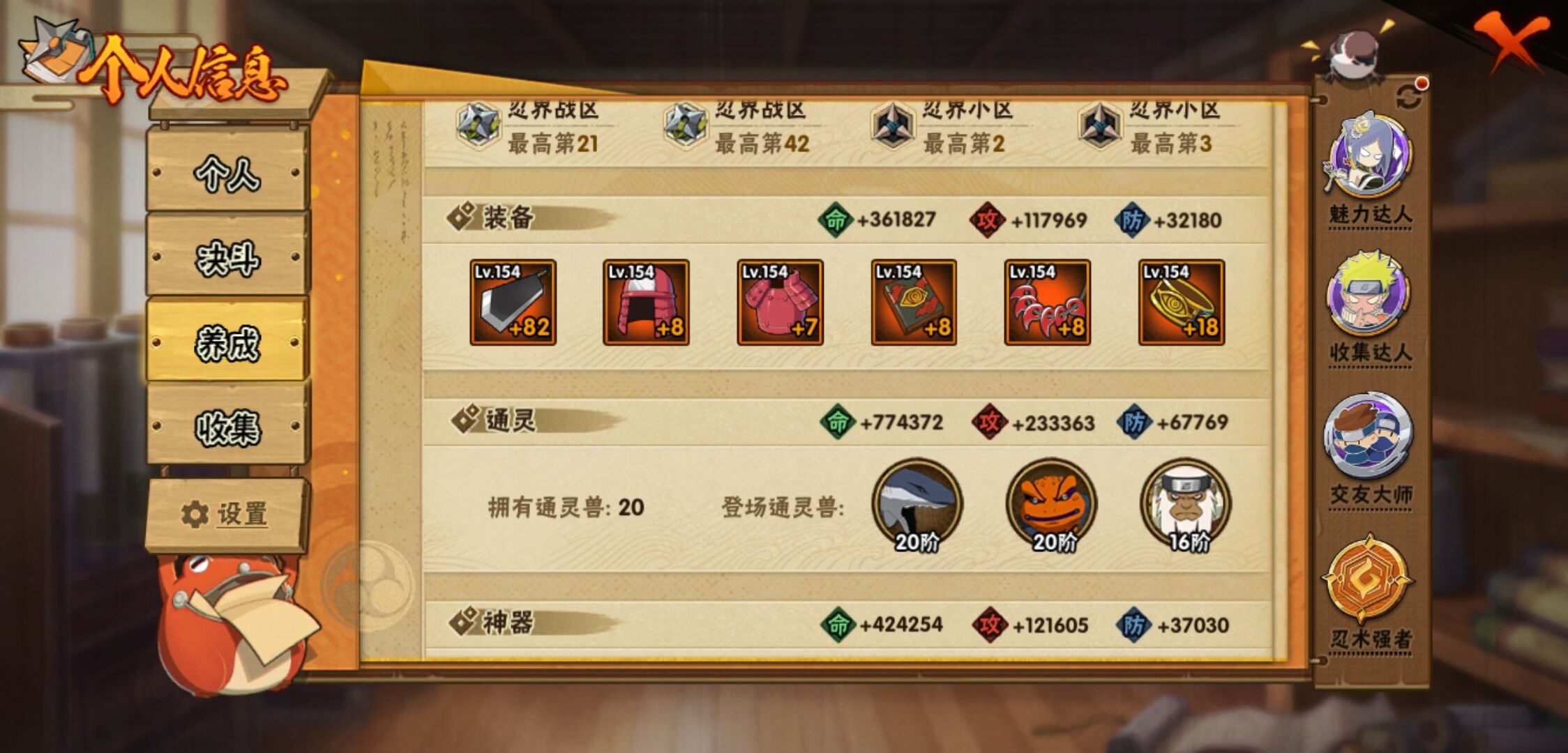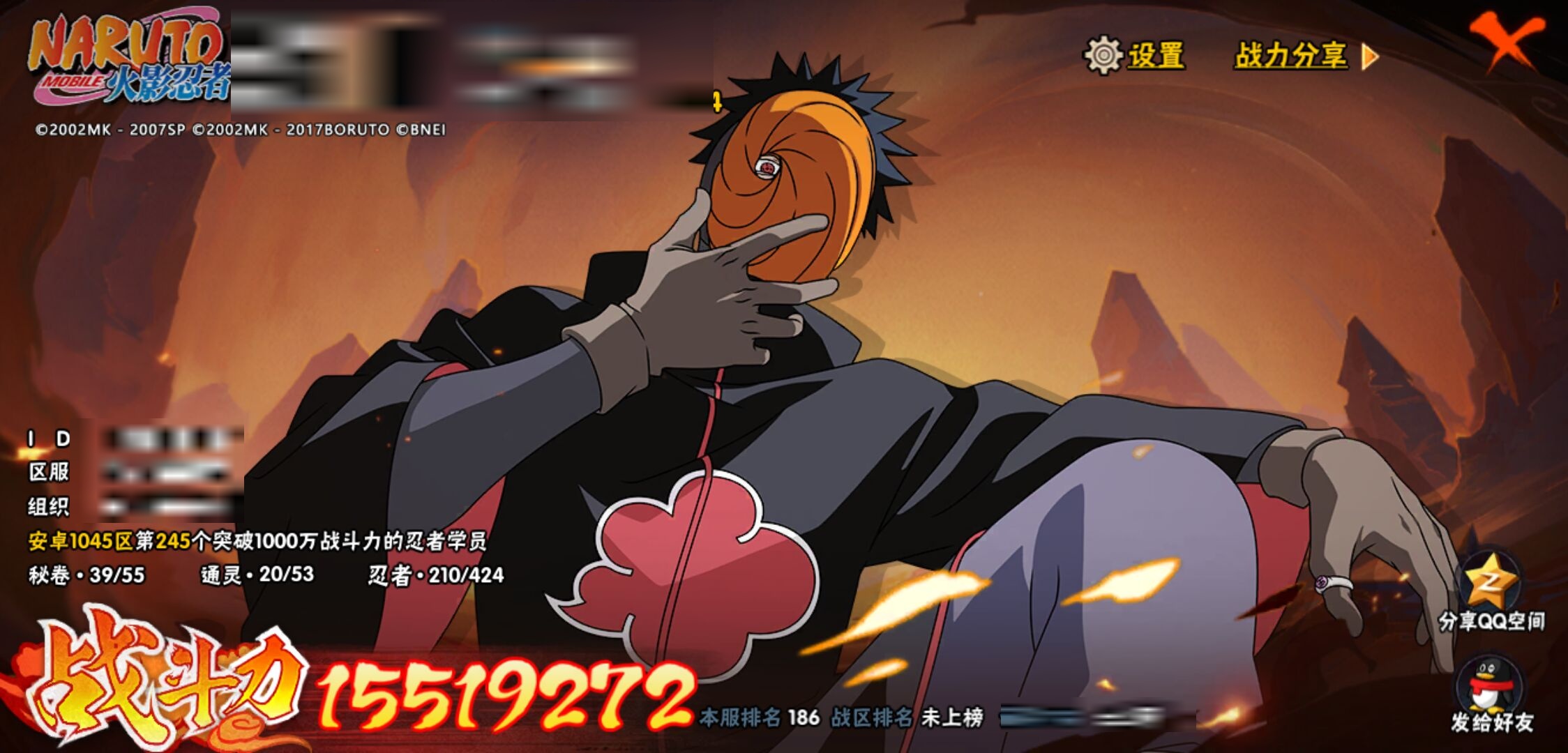 【火影忍者】【lyhy11402】战斗力:1551w;段位:中忍2阶;本服排名:186;vip:v7级;s忍:24个;a忍:46个;通灵兽:19个,s忍:十尾人柱力宇智波带土|秽土转生解宇智波斑|忍界大战宇智波带土|须佐能乎旗木卡卡西|九喇嘛连结波风水门|五影会谈宇智波斑|天道佩恩|传说中的三忍自来也|漩涡鸣人宇智波佐助|秽土转生千手柱间|秽土转生宇智波鼬|永恒万花筒宇智波佐助|舞之豪杰自来也|大蛇丸(普通) 4星|纲手(普通)|百豪纲手|波风水门|秽土转生波风水门|秽土转生宇智波斑|须佐能乎宇智波鼬 4星|秽土转生长门|仙人模式药师兜|九喇嘛连结漩涡鸣人|自来也(普通)__a忍:青春爆炸迈特凯|仙人模式巳月|幻之真容旗木卡卡西|忍界大战李洛克|忍界大战日向宁次|四代目土影黑土|秽土转生迪达拉|志村团藏|宇智波止水(普通)|忍界大战奇拉比|青年波风水门|近松十人卫千代|半蛇斗篷药师兜|须佐能乎宇智波佐助|九尾查克拉漩涡鸣人|晓大蛇丸|百豪春野樱|忍界大战秋道丁次|忍界大战我爱罗|秽土转生猿飞阿斯玛|疾风传咒印宇智波佐助|奇拉比(普通)|万花筒写轮眼宇智波佐助|五代目水影照美冥|五代目雷影达鲁伊|死司凭血飞段 4星|疾风传我爱罗 4星|迪达拉(普通)|飞段(普通) 4星|小南(普通)|仙人模式漩涡鸣人|万花筒写轮眼旗木卡卡西|迈特凯(普通) 5星|宇智波鼬(普通) 3星|干柿鬼鲛(普通) 5星|秽土转生桃地再不斩|桃地再不斩|蝎(普通) 5星|绯流琥蝎|猿飞阿斯玛(普通) 5星|最终章日向雏田|六代目水影长十郎|不动|宇智波泉奈|忍界大战土台|初始形态机械鸣人__通灵兽:忍犬(普通)|蓝蛇|蛤蟆吉|忍龟|镰鼬|猿魔|山椒鱼|蜃|蛤蟆仙人|鲛鲨|蛤蟆健|乌鸦(普通)|蛤蟆龙|怒鬼无臂|蛤蟆广|梦貘|鹰|蜘蛛|砂之守鹤