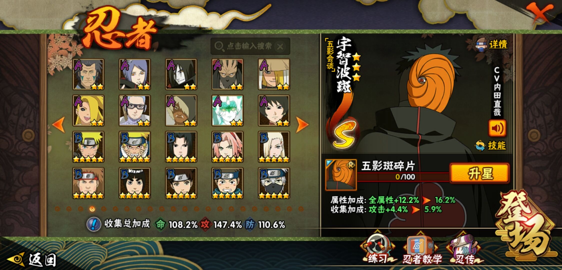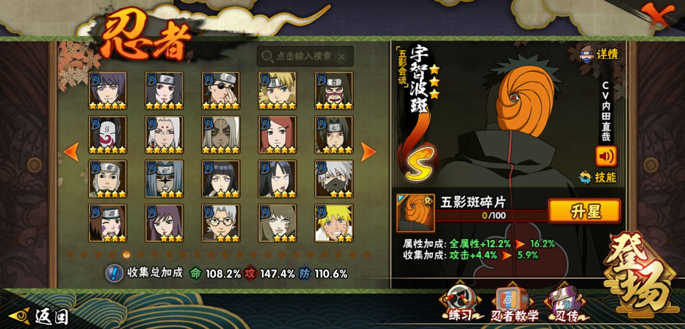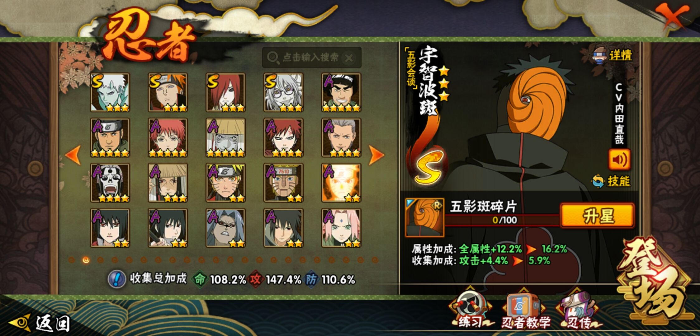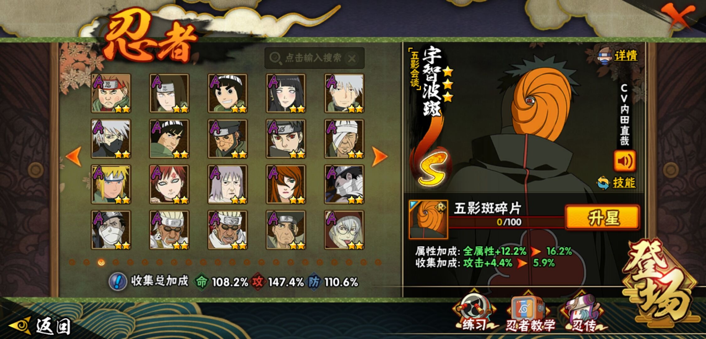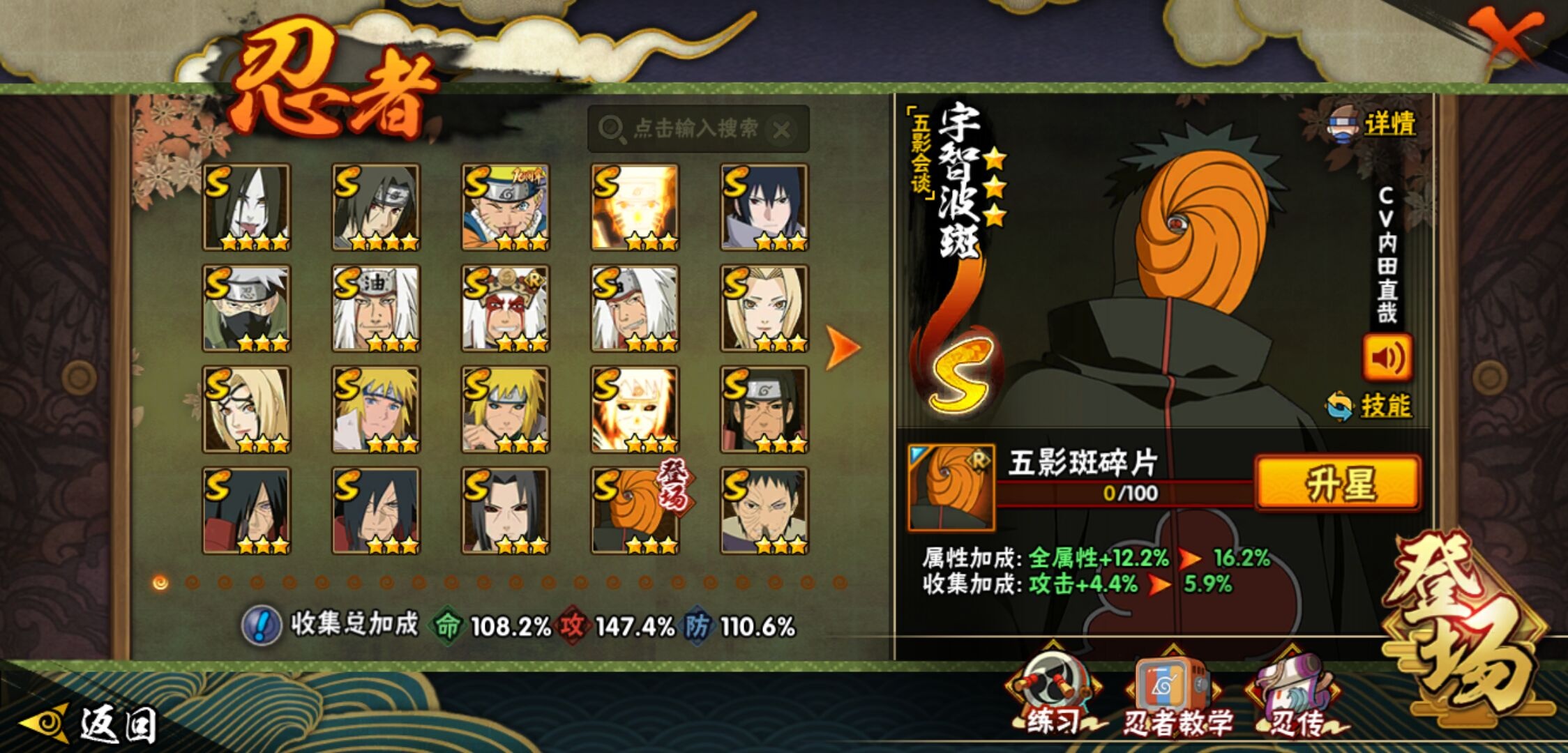 【火影忍者】【lyhy11402】战斗力:1551w;段位:中忍2阶;本服排名:186;vip:v7级;s忍:24个;a忍:46个;通灵兽:19个,s忍:十尾人柱力宇智波带土|秽土转生解宇智波斑|忍界大战宇智波带土|须佐能乎旗木卡卡西|九喇嘛连结波风水门|五影会谈宇智波斑|天道佩恩|传说中的三忍自来也|漩涡鸣人宇智波佐助|秽土转生千手柱间|秽土转生宇智波鼬|永恒万花筒宇智波佐助|舞之豪杰自来也|大蛇丸(普通) 4星|纲手(普通)|百豪纲手|波风水门|秽土转生波风水门|秽土转生宇智波斑|须佐能乎宇智波鼬 4星|秽土转生长门|仙人模式药师兜|九喇嘛连结漩涡鸣人|自来也(普通)__a忍:青春爆炸迈特凯|仙人模式巳月|幻之真容旗木卡卡西|忍界大战李洛克|忍界大战日向宁次|四代目土影黑土|秽土转生迪达拉|志村团藏|宇智波止水(普通)|忍界大战奇拉比|青年波风水门|近松十人卫千代|半蛇斗篷药师兜|须佐能乎宇智波佐助|九尾查克拉漩涡鸣人|晓大蛇丸|百豪春野樱|忍界大战秋道丁次|忍界大战我爱罗|秽土转生猿飞阿斯玛|疾风传咒印宇智波佐助|奇拉比(普通)|万花筒写轮眼宇智波佐助|五代目水影照美冥|五代目雷影达鲁伊|死司凭血飞段 4星|疾风传我爱罗 4星|迪达拉(普通)|飞段(普通) 4星|小南(普通)|仙人模式漩涡鸣人|万花筒写轮眼旗木卡卡西|迈特凯(普通) 5星|宇智波鼬(普通) 3星|干柿鬼鲛(普通) 5星|秽土转生桃地再不斩|桃地再不斩|蝎(普通) 5星|绯流琥蝎|猿飞阿斯玛(普通) 5星|最终章日向雏田|六代目水影长十郎|不动|宇智波泉奈|忍界大战土台|初始形态机械鸣人__通灵兽:忍犬(普通)|蓝蛇|蛤蟆吉|忍龟|镰鼬|猿魔|山椒鱼|蜃|蛤蟆仙人|鲛鲨|蛤蟆健|乌鸦(普通)|蛤蟆龙|怒鬼无臂|蛤蟆广|梦貘|鹰|蜘蛛|砂之守鹤