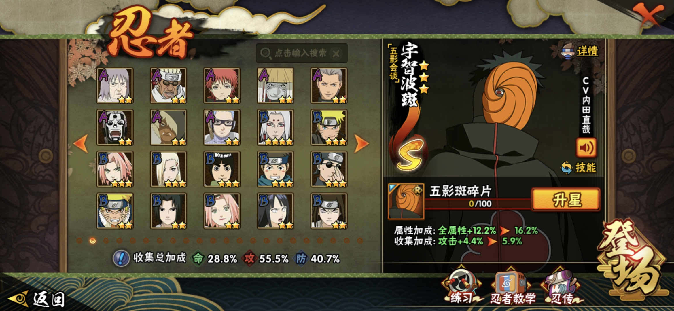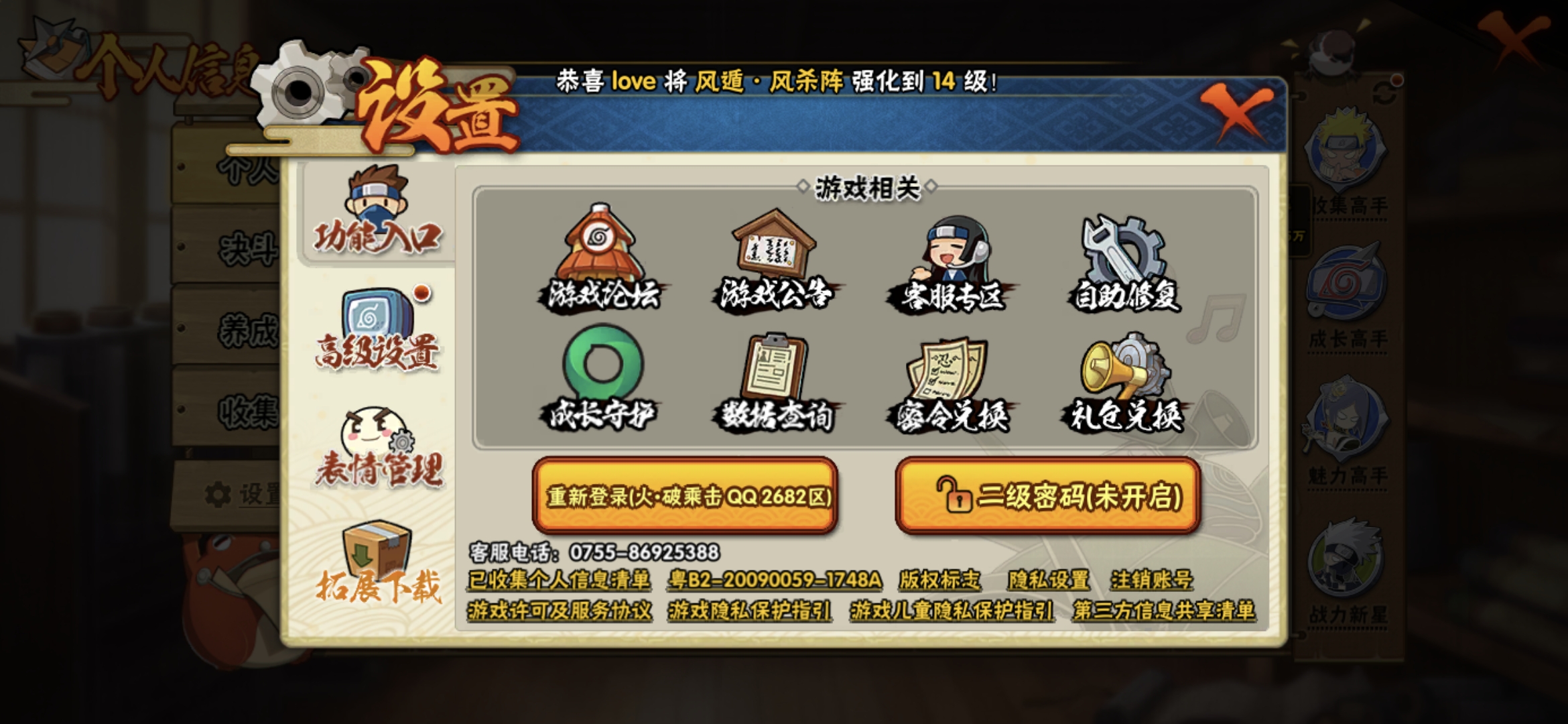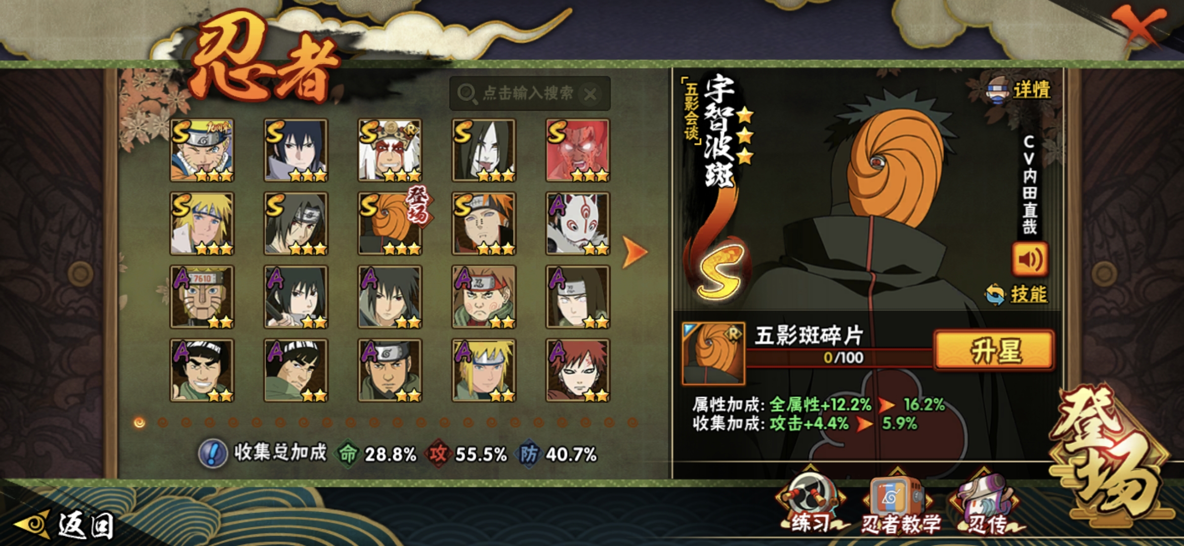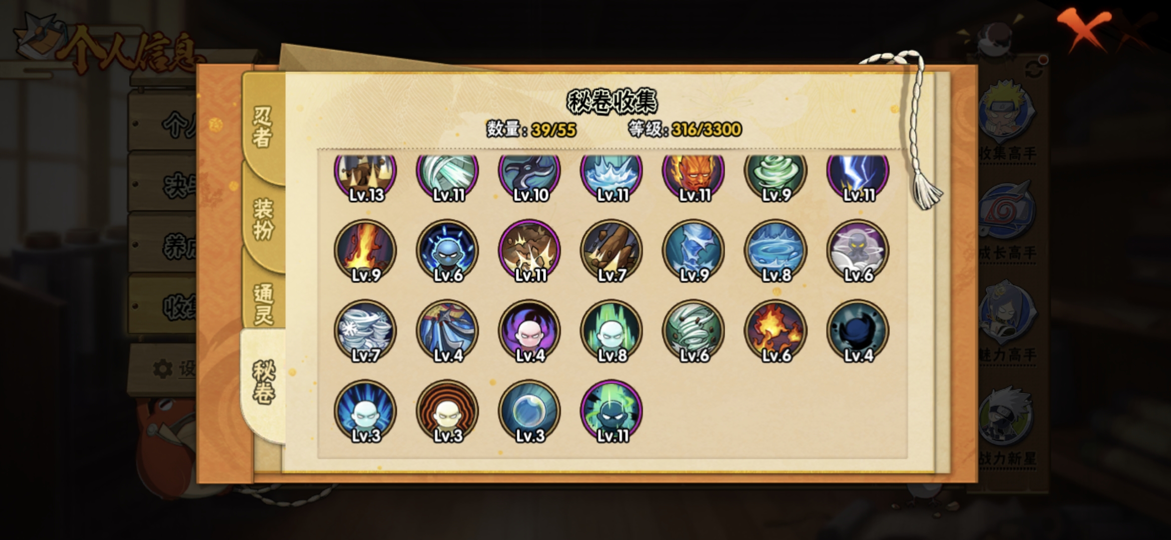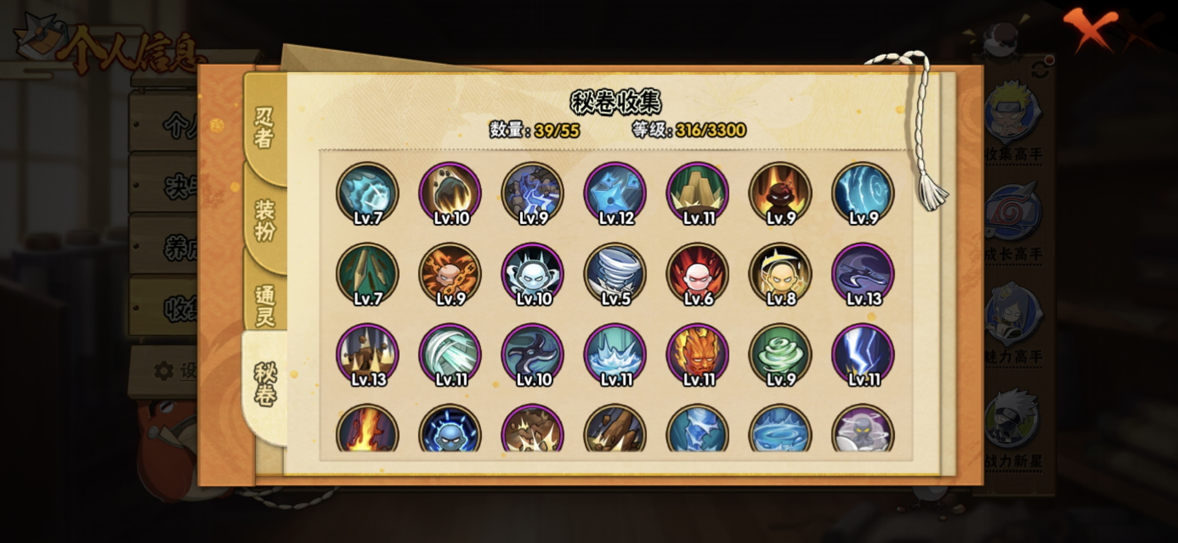 【区服】2682【等级】138【s级数量】9【a级数量】19【b级数量】31【c级数量】43 【通灵】 砂之守鹤 忍犬 蓝蛇 蛤蟆吉 忍龟 镰鼬 猿魔 山椒鱼 蜃 蛤蟆仙人 鲛鲨 蛤蟆健 乌鸦 【s级】宇智波佐助「永恒万花筒」 迈特凯「死门」 自来也「舞之豪杰」 宇智波鼬「须佐能乎」 波风水门 漩涡鸣人·宇智波佐助 佩恩「天道」 大蛇丸 宇智波斑「五影会谈」 【a级】蝎 宇智波佐助「须佐能乎」
