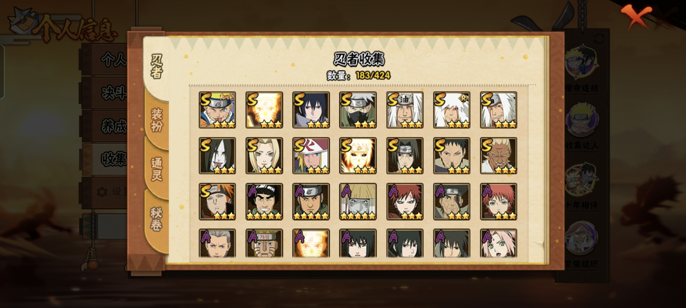 【s忍者15 a忍者35 通灵18】【安卓q-2870区-146级-v4-946万战力】【s级】纲手 艾「忍界大战」 自来也「舞之豪杰」 自来也「传说中的三忍」 自来也 佩恩「天道」 宇智波鼬「须佐能乎」 宇智波佐助「永恒万花筒」 宇智波带土「忍界大战」 波风水门「九喇嘛连结」 大蛇丸 波风水门 漩涡鸣人「九喇嘛连结」 漩涡鸣人·宇智波佐助 旗木卡卡西「须佐能乎」【a级】波风水