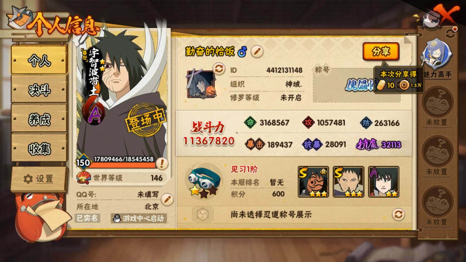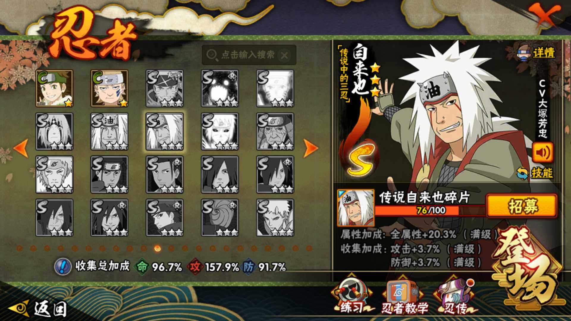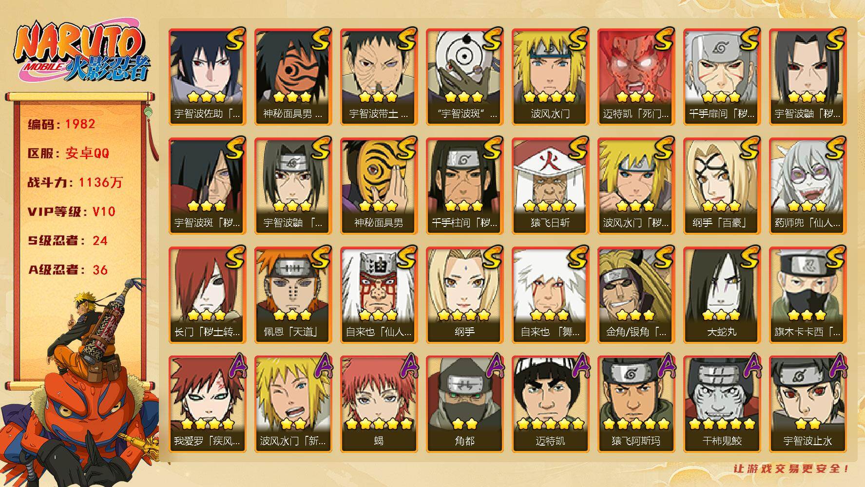 [16503364]v10 1136万战力 24s 36a 1.5w金币 200点券 传说自来也76片 忍战樱69片 无80片 zp3459 【s级忍者】:长门「秽土转生」3星,金角·银角「秽土转生」3星,波风水门「秽土转生」3星,千手扉间「秽土转生」3星,千手柱间「秽土转生」3星,宇智波鼬「秽土转生」3星,宇智波斑「秽土转生」3星,宇智波带土「忍界大战」3星,宇智波鼬「须佐能乎」3星,旗木卡卡西「须佐能乎」3星,自来也「仙人模式」3星,自来也「舞之豪杰」3星,大蛇丸3星,纲手4星,纲手「百豪」3星,猿飞日斩4星,波风水门4星,药师兜「仙人模式」3星,神秘面具男3星,神秘面具男「红夜之刃」3星,迈特凯「死门」3星,佩恩「天道」3星,宇智波佐助「永恒万花筒」3星,宇智波斑 「白面具」3星宇智波斑「白面具」 【a级忍者】:艾「青年」2星,长门「青年」2星,波风水门「青年」2星,波风水门「新春限定」2星,达鲁伊「博人传」2星,迪达拉「秽土转生」2星,大蛇丸「晓」2星,奇拉比「忍界大战」2星,飞段4星,飞段「死司凭血」4星,干柿鬼鲛5星,漩涡鸣人「仙人模式」2星,漩涡鸣人「九尾查克拉」2星,迈特凯5星,旗木卡卡西「幻之真容」2星,我爱罗「疾风传」4星,我爱罗「忍界大战」2星,蝎5星,蝎「绯流琥」2星,小南「夏日泳装」2星,角都2星,猿飞阿斯玛5星,宇智波止水2星,宇智波鼬2星,宇智波佐助「须佐能乎」2星,宇智波佐助「万花筒写轮眼」2星,药师兜「半蛇斗篷」2星,照美冥「五代目水影」2星,日向宁次「忍界大战」2星,宇智波带土「暴怒」2星,长十郎「六代目水影」2星,猿飞木叶丸「博人传」2星,黑土「博人传」2星,春野樱「百豪」2星,千代「近松十人卫」2星,宇智波泉奈2星