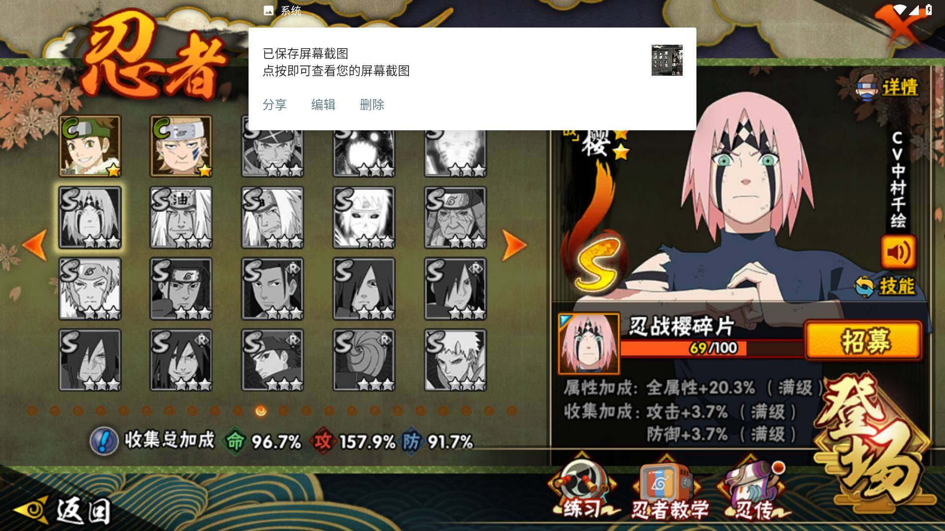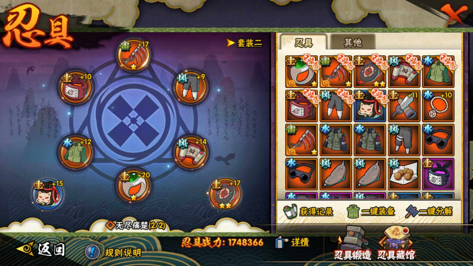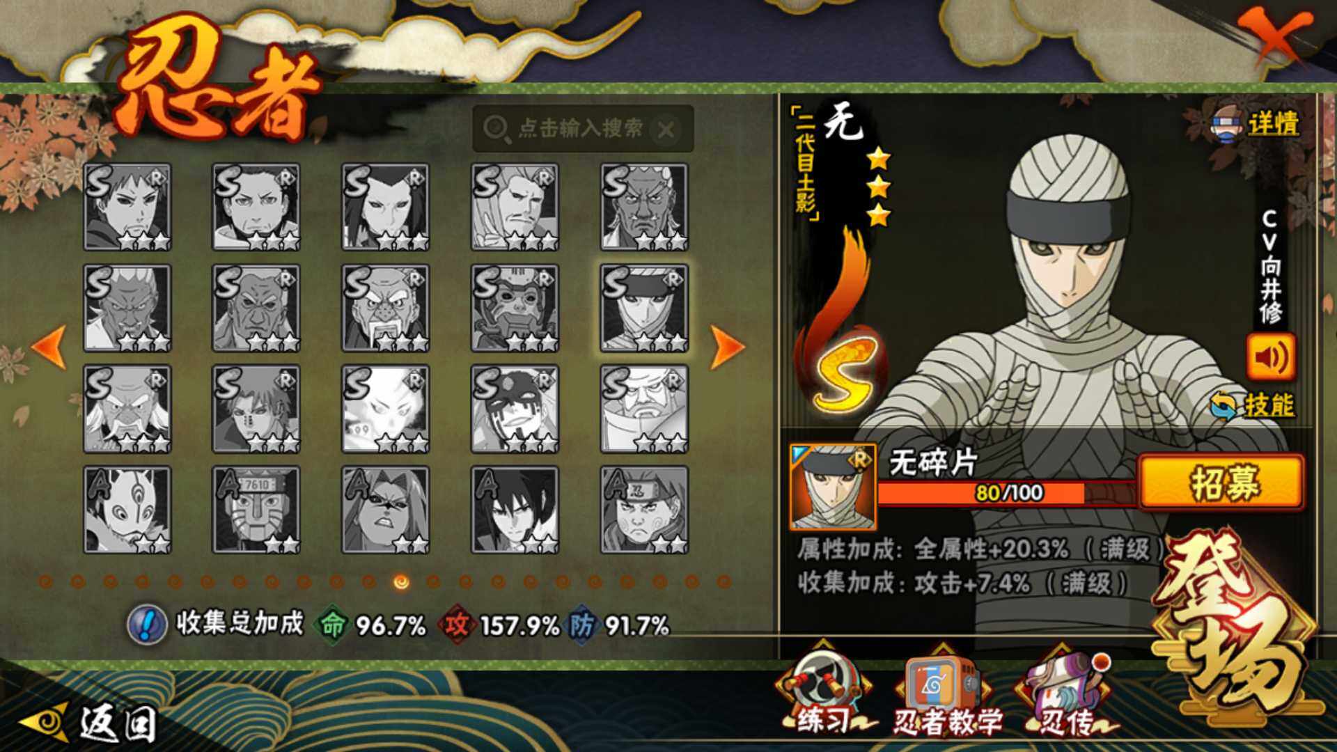 [16503364]v10 1136万战力 24s 36a 1.5w金币 200点券 传说自来也76片 忍战樱69片 无80片 zp3459 【s级忍者】:长门「秽土转生」3星,金角·银角「秽土转生」3星,波风水门「秽土转生」3星,千手扉间「秽土转生」3星,千手柱间「秽土转生」3星,宇智波鼬「秽土转生」3星,宇智波斑「秽土转生」3星,宇智波带土「忍界大战」3星,宇智波鼬「须佐能乎」3星,旗木卡卡西「须佐能乎」3星,自来也「仙人模式」3星,自来也「舞之豪杰」3星,大蛇丸3星,纲手4星,纲手「百豪」3星,猿飞日斩4星,波风水门4星,药师兜「仙人模式」3星,神秘面具男3星,神秘面具男「红夜之刃」3星,迈特凯「死门」3星,佩恩「天道」3星,宇智波佐助「永恒万花筒」3星,宇智波斑 「白面具」3星宇智波斑「白面具」 【a级忍者】:艾「青年」2星,长门「青年」2星,波风水门「青年」2星,波风水门「新春限定」2星,达鲁伊「博人传」2星,迪达拉「秽土转生」2星,大蛇丸「晓」2星,奇拉比「忍界大战」2星,飞段4星,飞段「死司凭血」4星,干柿鬼鲛5星,漩涡鸣人「仙人模式」2星,漩涡鸣人「九尾查克拉」2星,迈特凯5星,旗木卡卡西「幻之真容」2星,我爱罗「疾风传」4星,我爱罗「忍界大战」2星,蝎5星,蝎「绯流琥」2星,小南「夏日泳装」2星,角都2星,猿飞阿斯玛5星,宇智波止水2星,宇智波鼬2星,宇智波佐助「须佐能乎」2星,宇智波佐助「万花筒写轮眼」2星,药师兜「半蛇斗篷」2星,照美冥「五代目水影」2星,日向宁次「忍界大战」2星,宇智波带土「暴怒」2星,长十郎「六代目水影」2星,猿飞木叶丸「博人传」2星,黑土「博人传」2星,春野樱「百豪」2星,千代「近松十人卫」2星,宇智波泉奈2星