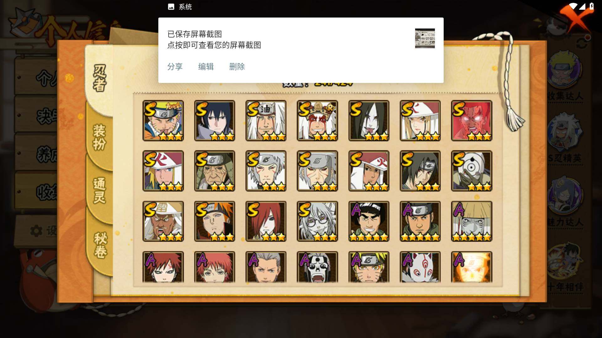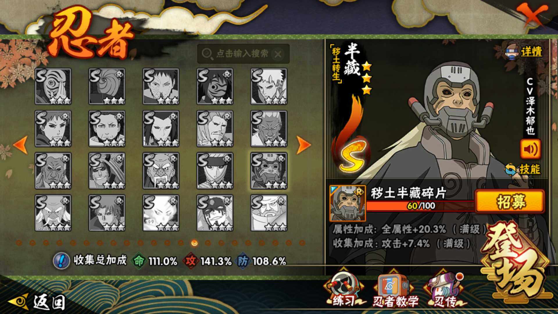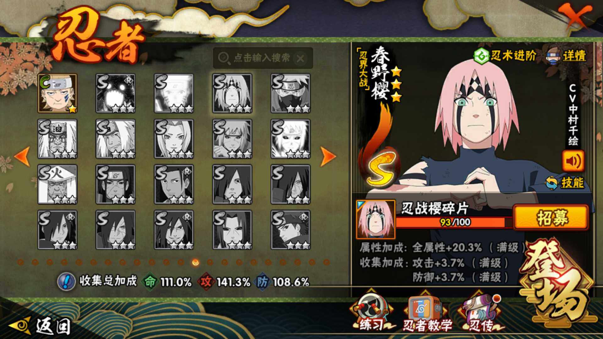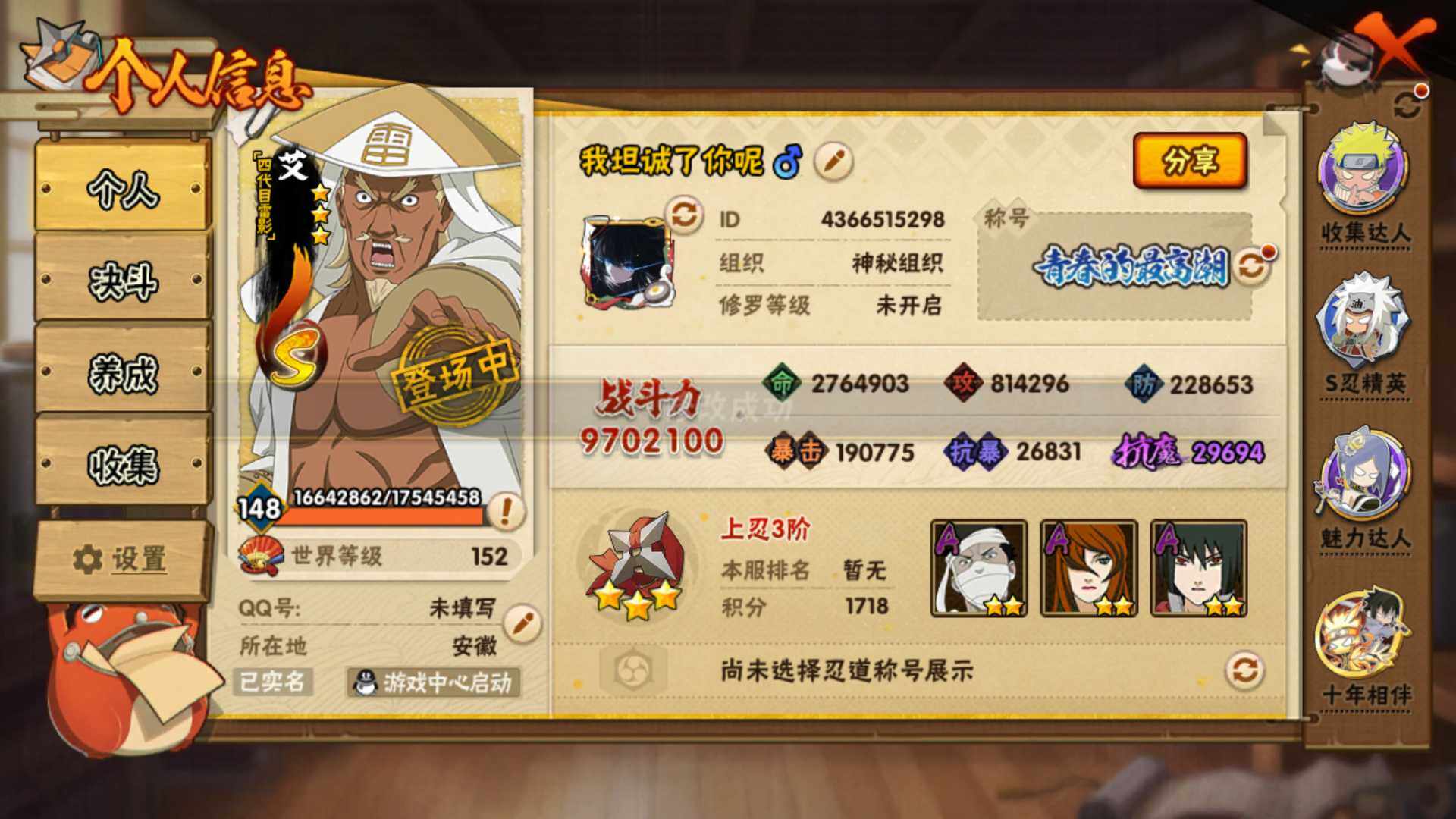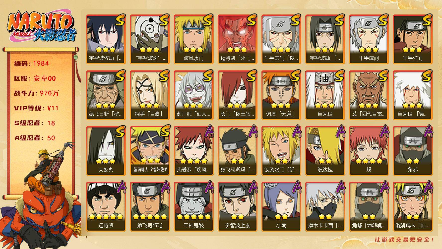 [16504037]v11 970万战力 18s 50a 忍战樱93片 传说自来也79片 十尾57片 半藏60片 忍战大野木60片 zp3457 【s级忍者】:长门「秽土转生」3星,猿飞日斩「秽土转生」3星,千手扉间「秽土转生」3星,宇智波鼬「须佐能乎」3星,艾「四代目雷影」3星,自来也3星,自来也「舞之豪杰」3星,大蛇丸3星,纲手「百豪」3星,千手柱间3星,千手扉间3星,波风水门3星,药师兜「仙人模式」3星,迈特凯「死门」3星,佩恩「天道」3星,宇智波佐助「永恒万花筒」3星,宇智波斑 「白面具」3星宇智波斑「白面具」,漩涡鸣人·宇智波佐助3星 【a级忍者】:艾「青年」2星,波风水门「青年」2星,波风水门「新春限定」2星,达鲁伊「博人传」2星,迪达拉2星,迪达拉「秽土转生」2星,大蛇丸「晓」2星,奇拉比2星,飞段4星,飞段「死司凭血」3星,干柿鬼鲛5星,漩涡博人「桃式显现」2星,漩涡鸣人「仙人模式」2星,漩涡鸣人「九尾查克拉」2星,迈特凯5星,旗木卡卡西「万花筒写轮眼」2星,旗木卡卡西「幻之真容」2星,桃地再不斩「漂泊武士」2星,桃地再不斩「秽土转生」2星,我爱罗「疾风传」4星,蝎4星,小南2星,小南「新春限定」2星,角都2星,角都「地怨虞」2星,角都「晓创生」2星,猿飞阿斯玛5星,猿飞阿斯玛「秽土转生」2星,宇智波止水2星,宇智波鼬2星,宇智波鼬「新春限定」2星,宇智波佐助「须佐能乎」2星,宇智波佐助「疾风传咒印」2星,宇智波佐助「万花筒写轮眼」2星,药师兜「半蛇斗篷」2星,照美冥「五代目水影」2星,绝2星,宇智波带土「暴怒」2星,长十郎「六代目水影」2星,神秘面具男「忍者之路」2星,佩恩·六道「漂泊浪客」2星,猿飞木叶丸「博人传」2星,黑土「博人传」2星,春野樱「百豪」2星,秋道丁次「忍界大战」2星,千代「近松十人卫」2星,不缘2星,地陆2星,宇智波泉奈2星,迈特凯「青春爆炸」2星
