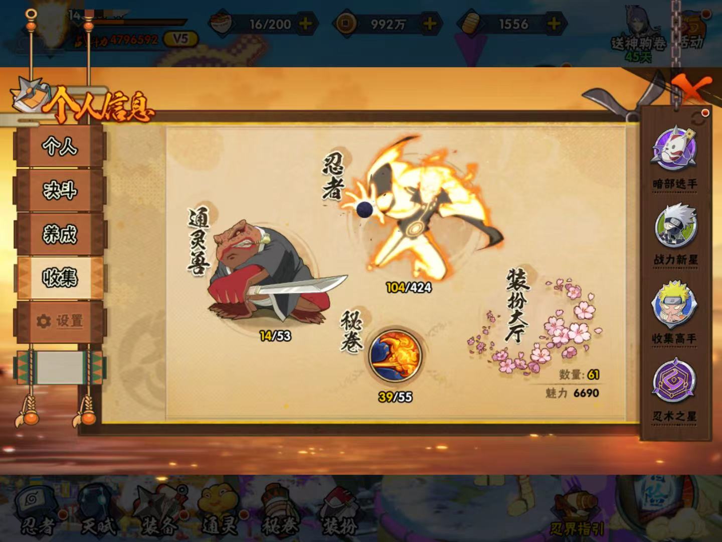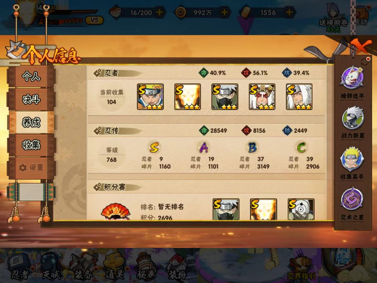 【s忍者9 a忍者19 通灵14】【iosq-1823区-143级-v5-479万战力】【s级】自来也「传说中的三忍」 漩涡鸣人·宇智波佐助 佩恩「天道」 宇智波斑「白面具」 旗木卡卡西「须佐能乎」 自来也「舞之豪杰」 宇智波鼬「须佐能乎」 漩涡鸣人「九喇嘛连结」 波风水门【a级】巳月「仙人模式」 李洛克「忍界大战」 千代「近松十人卫」 蝎「绯流琥」 干柿鬼鲛 宇智波佐助「万花