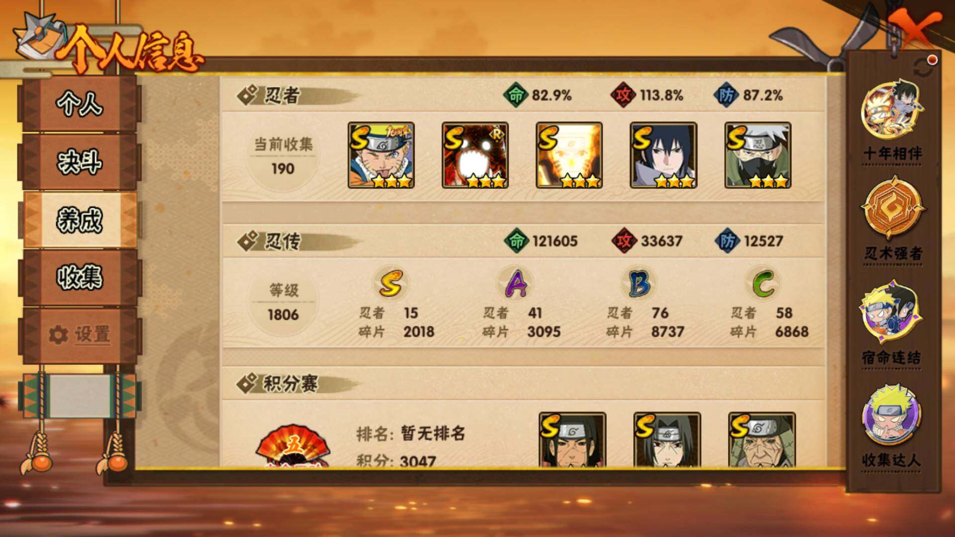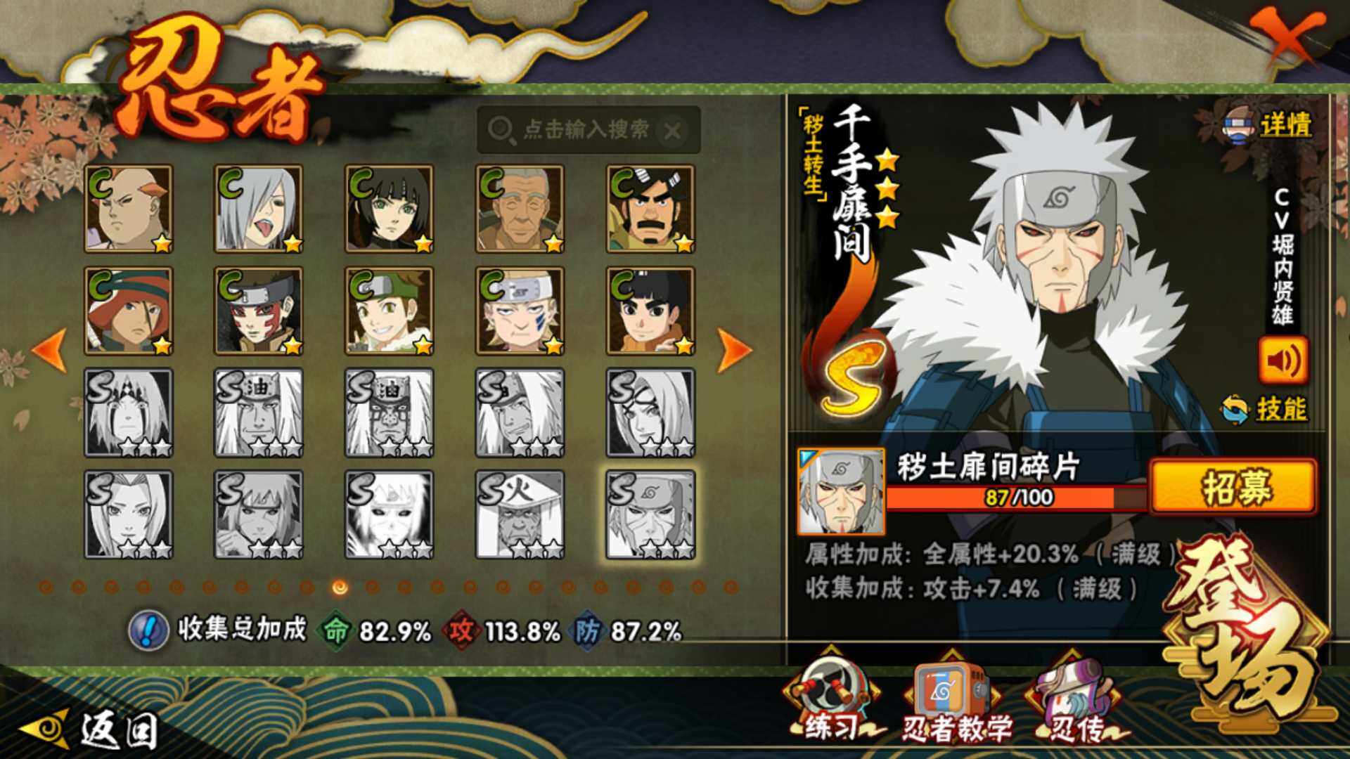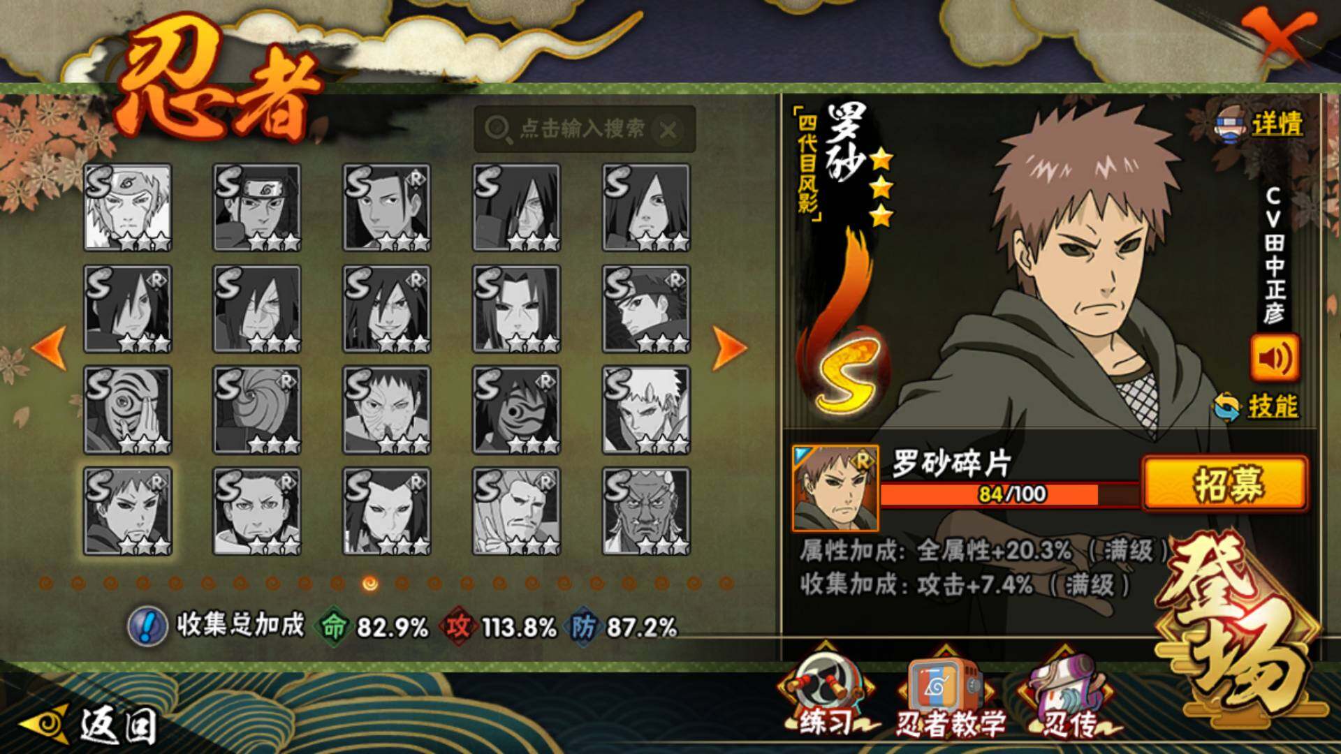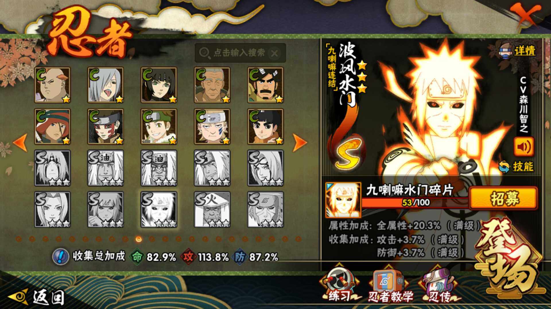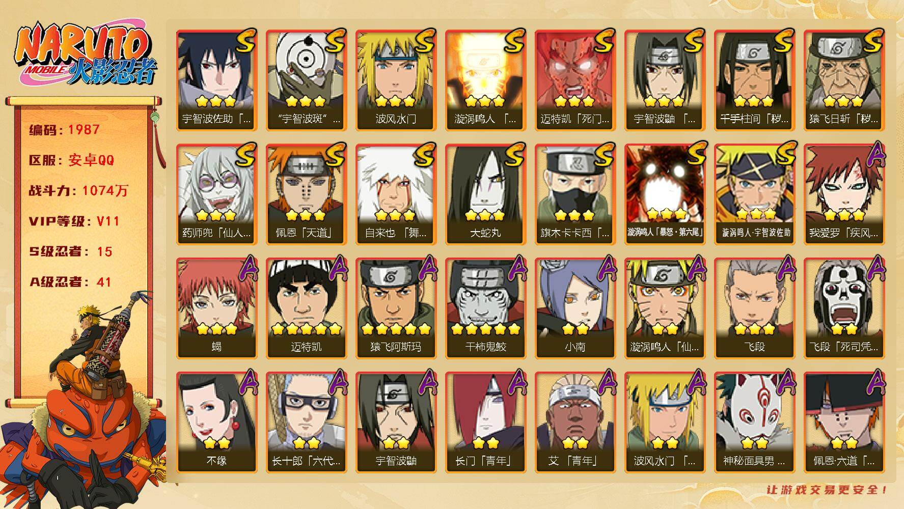 [16505920]可免费转苹果 v11 1074万战力 15s-41a 九喇嘛水门53片 秽土扉间87片 罗砂84片 tt1743 【s级忍者】:猿飞日斩「秽土转生」3星,千手柱间「秽土转生」3星,宇智波鼬「须佐能乎」3星,旗木卡卡西「须佐能乎」3星,自来也「舞之豪杰」3星,大蛇丸3星,波风水门3星,药师兜「仙人模式」3星,漩涡鸣人「九喇嘛连结」3星,迈特凯「死门」3星,佩恩「天道」3星,宇智波佐助「永恒万花筒」3星,宇智波斑 「白面具」3星宇智波斑「白面具」,漩涡鸣人「暴怒·第六尾」3星,漩涡鸣人·宇智波佐助3星 【a级忍者】:艾「青年」2星,长门「青年」2星,波风水门「青年」2星,迪达拉「秽土转生」2星,飞段3星,飞段「死司凭血」2星,干柿鬼鲛5星,漩涡鸣人「仙人模式」2星,漩涡鸣人「九尾查克拉」2星,机械鸣人「初始形态」2星,迈特凯5星,旗木卡卡西「幻之真容」2星,桃地再不斩「秽土转生」2星,我爱罗「疾风传」3星,蝎3星,小南2星,猿飞阿斯玛5星,宇智波鼬2星,宇智波鼬「新春限定」2星,宇智波鼬「夏日限定」2星,宇智波佐助「须佐能乎」2星,宇智波佐助「疾风传咒印」2星,宇智波佐助「万花筒写轮眼」2星,照美冥「五代目水影」2星,日向雏田「最终章」2星,宇智波带土「暴怒」2星,长十郎「六代目水影」2星,神秘面具男「忍者之路」2星,佩恩·六道「漂泊浪客」2星,李洛克「忍界大战」2星,黑土「博人传」2星,春野樱「百豪」2星,秋道丁次「忍界大战」2星,千代「近松十人卫」2星,神农「羁绊」2星,土台「忍界大战」2星,不缘2星,地陆2星,宇智波泉奈2星,大野木「侠隐江湖」2星,迈特凯「青春爆炸」2星