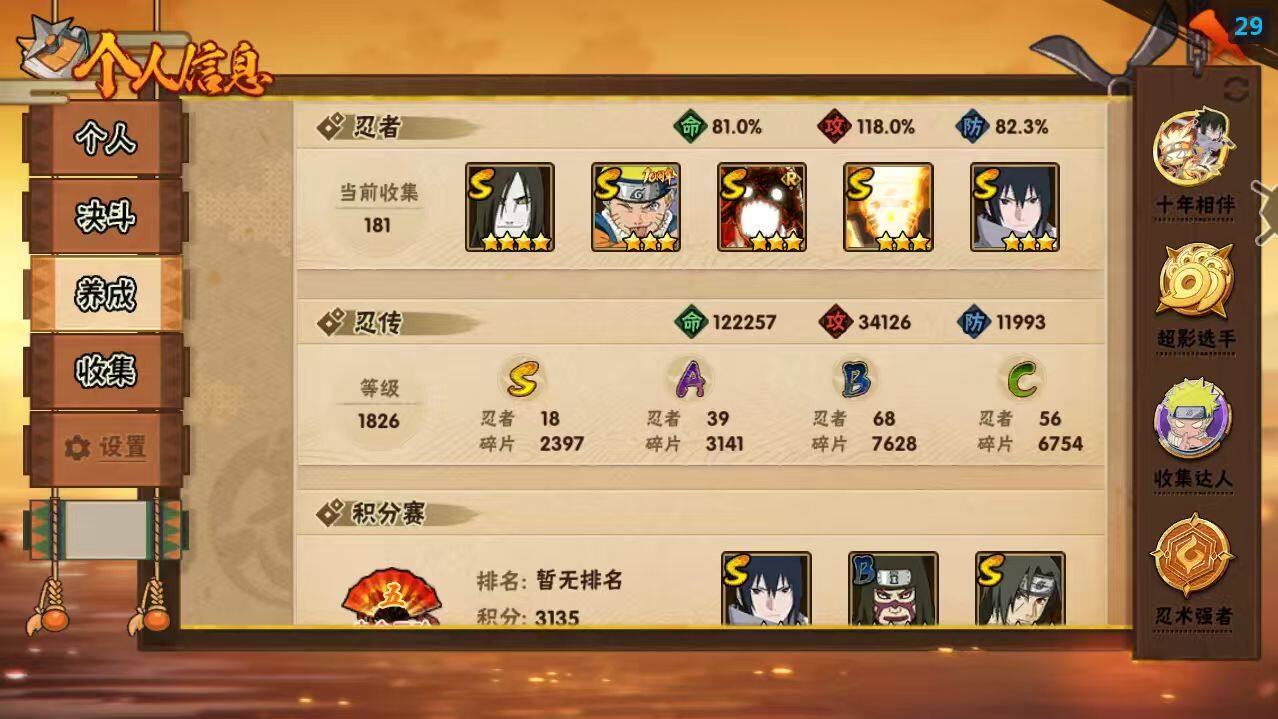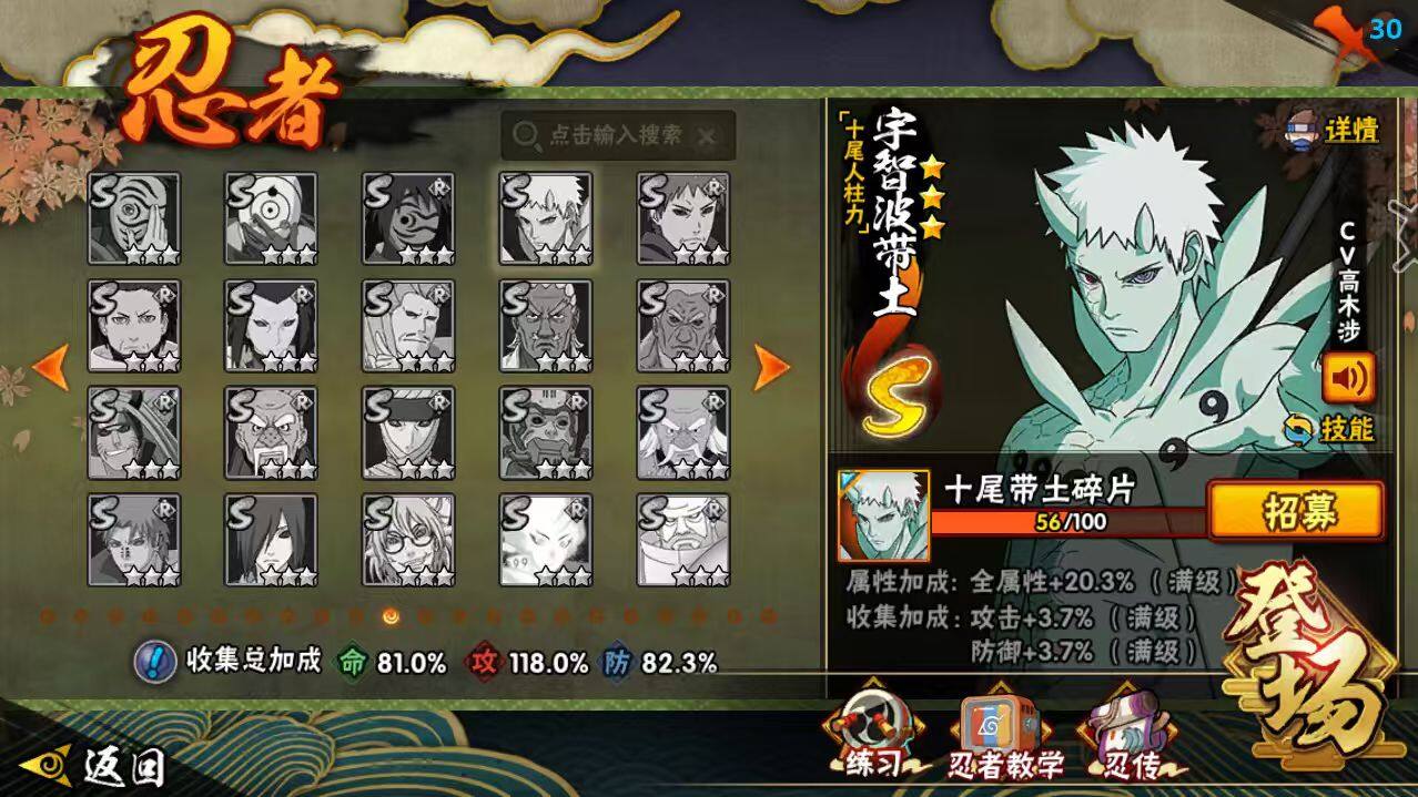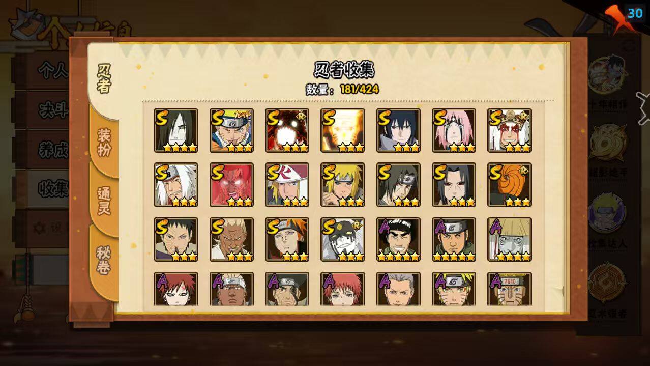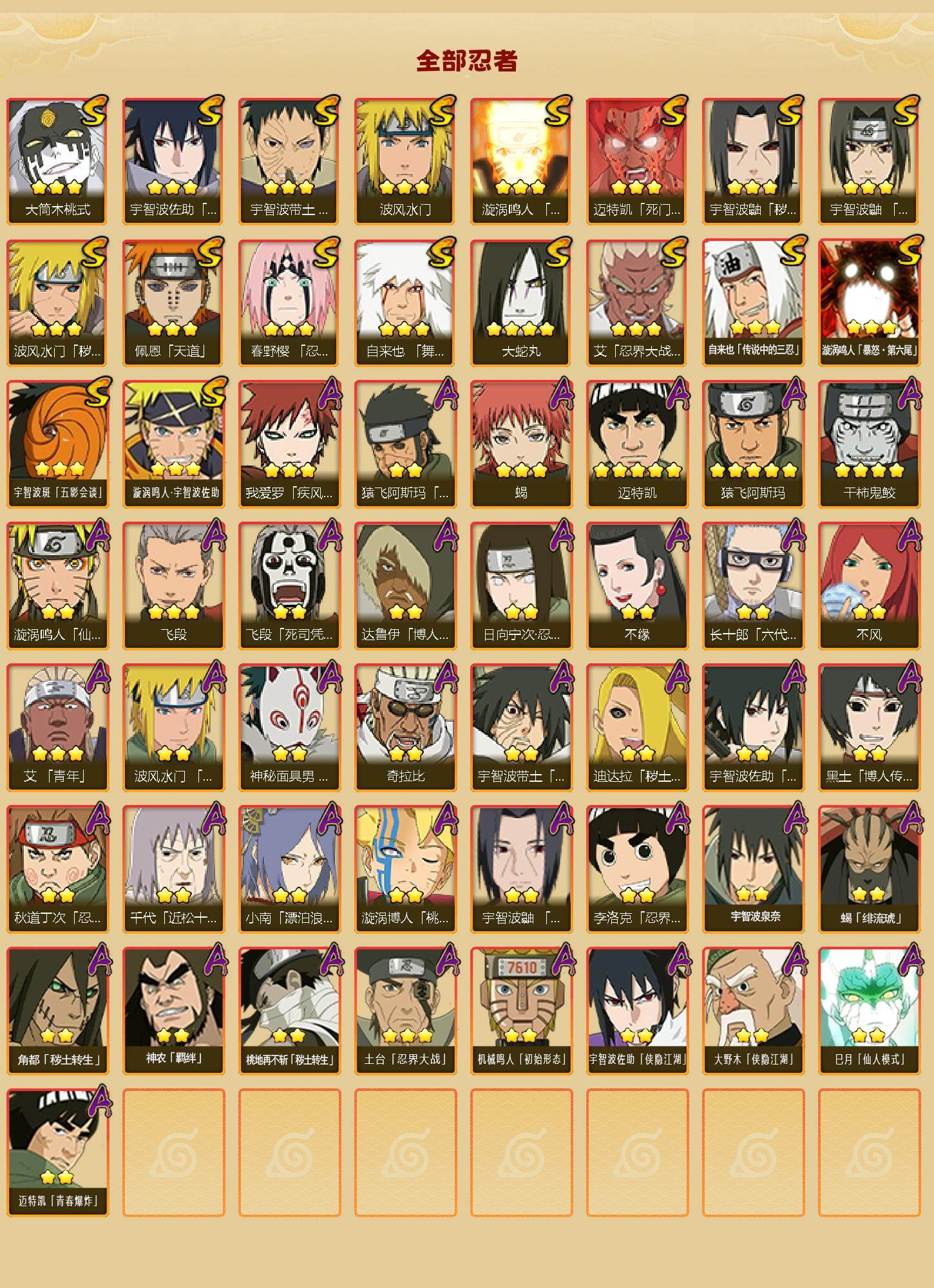 [16508375]18s级忍者数-39a级忍者数 【s级忍者】:波风水门「秽土转生」3星,宇智波鼬「秽土转生」3星,春野樱「忍界大战」3星,宇智波带土「忍界大战」3星,艾「忍界大战」3星,宇智波鼬「须佐能乎」3星,自来也「舞之豪杰」3星,大蛇丸4星,自来也「传说中的三忍」3星,波风水门3星,漩涡鸣人「九喇嘛连结」3星,迈特凯「死门」3星,佩恩「天道」3星,宇智波佐助「永恒万花筒」3星,大筒木桃式3星,漩涡鸣人「暴怒·第六尾」3星,宇智波斑「五影会谈」3星,漩涡鸣人·宇智波佐助3星 【a级忍者】:艾「青年」3星,波风水门「青年」2星,达鲁伊「博人传」2星,迪达拉「秽土转生」2星,奇拉比2星,飞段3星,飞段「死司凭血」2星,干柿鬼鲛4星,漩涡博人「桃式显现」2星,漩涡鸣人「仙人模式」2星,机械鸣人「初始形态」2星,迈特凯5星,桃地再不斩「秽土转生」2星,我爱罗「疾风传」3星,蝎3星,蝎「绯流琥」2星,小南「漂泊浪客」2星,角都「秽土转生」2星,猿飞阿斯玛5星,猿飞阿斯玛「秽土转生」2星,宇智波鼬「夏日限定」2星,宇智波佐助「须佐能乎」2星,宇智波佐助「侠隐江湖」2星,日向宁次「忍界大战」2星,宇智波带土「暴怒」2星,长十郎「六代目水影」2星,神秘面具男「忍者之路」2星,李洛克「忍界大战」2星,黑土「博人传」2星,秋道丁次「忍界大战」2星,千代「近松十人卫」2星,神农「羁绊」2星,土台「忍界大战」3星,不缘2星,不风2星,宇智波泉奈2星,大野木「侠隐江湖」2星,巳月「仙人模式」2星,迈特凯「青春爆炸」2星