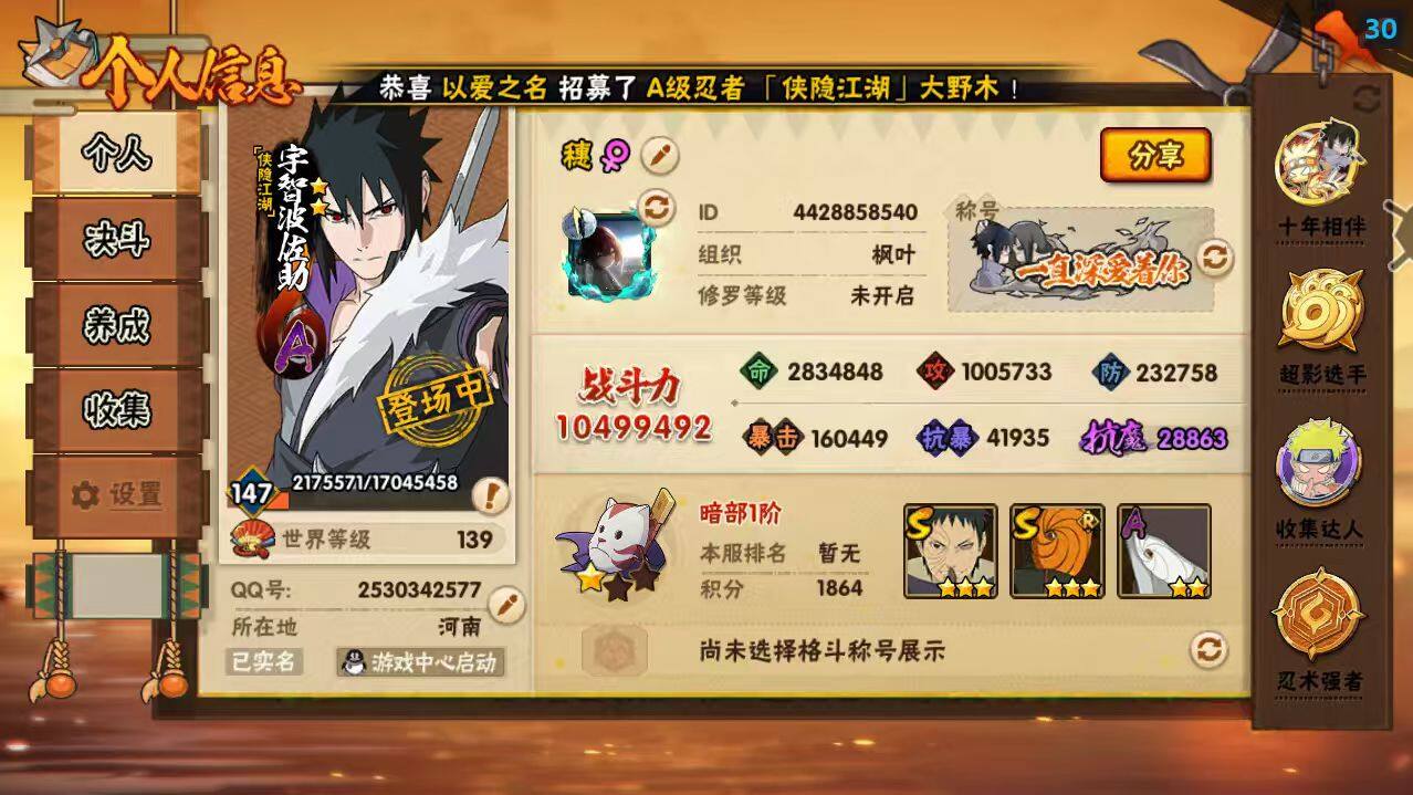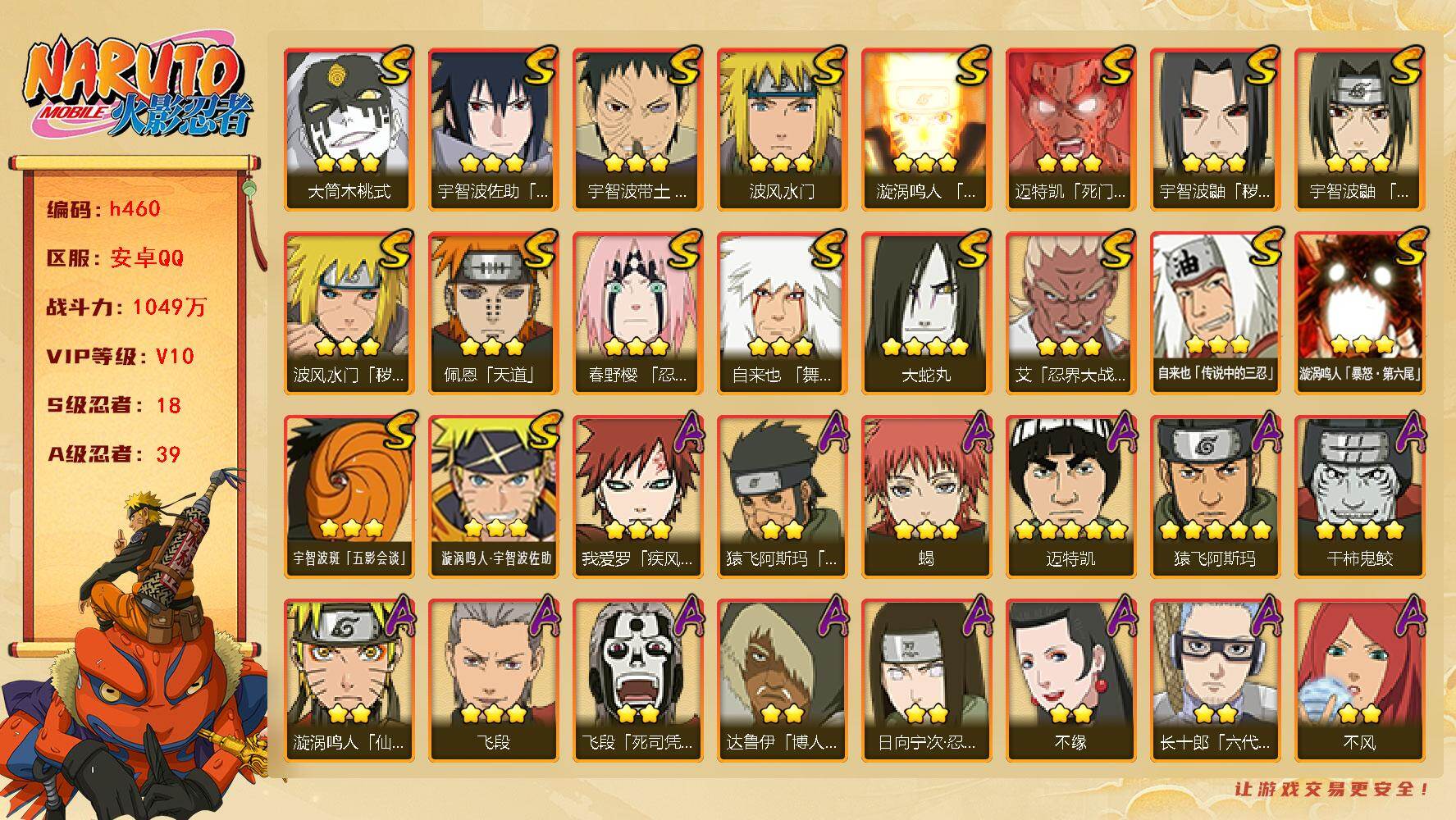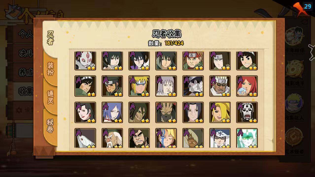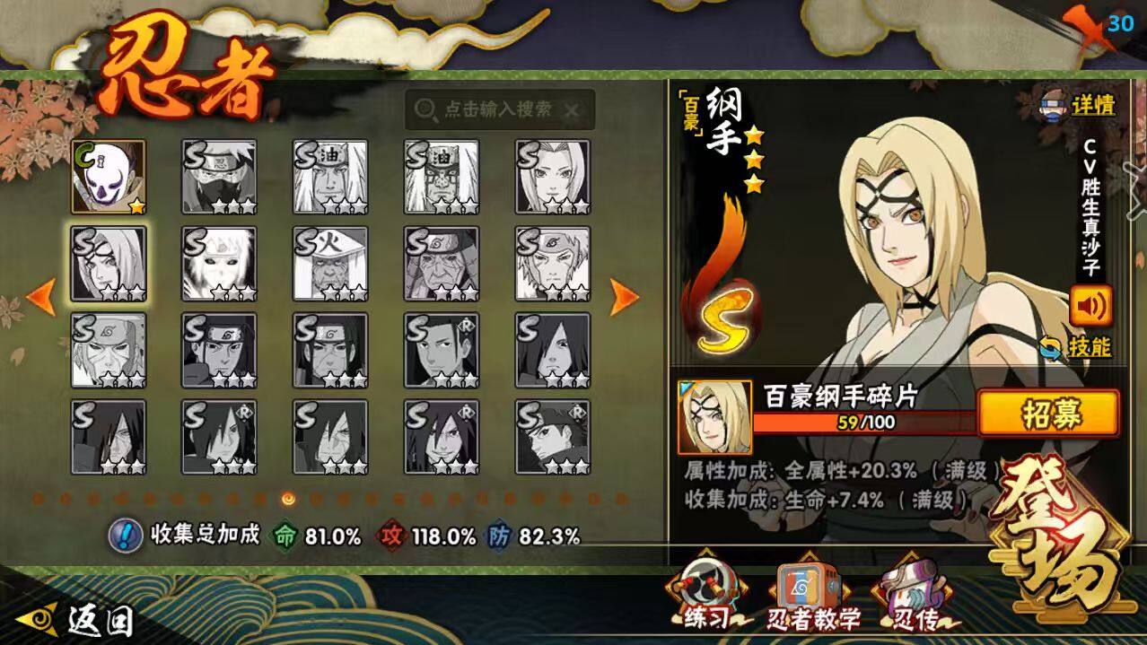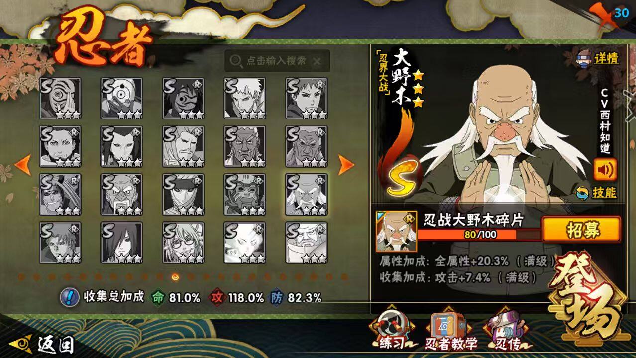[16508375]18s级忍者数-39a级忍者数 【s级忍者】:波风水门「秽土转生」3星,宇智波鼬「秽土转生」3星,春野樱「忍界大战」3星,宇智波带土「忍界大战」3星,艾「忍界大战」3星,宇智波鼬「须佐能乎」3星,自来也「舞之豪杰」3星,大蛇丸4星,自来也「传说中的三忍」3星,波风水门3星,漩涡鸣人「九喇嘛连结」3星,迈特凯「死门」3星,佩恩「天道」3星,宇智波佐助「永恒万花筒」3星,大筒木桃式3星,漩涡鸣人「暴怒·第六尾」3星,宇智波斑「五影会谈」3星,漩涡鸣人·宇智波佐助3星 【a级忍者】:艾「青年」3星,波风水门「青年」2星,达鲁伊「博人传」2星,迪达拉「秽土转生」2星,奇拉比2星,飞段3星,飞段「死司凭血」2星,干柿鬼鲛4星,漩涡博人「桃式显现」2星,漩涡鸣人「仙人模式」2星,机械鸣人「初始形态」2星,迈特凯5星,桃地再不斩「秽土转生」2星,我爱罗「疾风传」3星,蝎3星,蝎「绯流琥」2星,小南「漂泊浪客」2星,角都「秽土转生」2星,猿飞阿斯玛5星,猿飞阿斯玛「秽土转生」2星,宇智波鼬「夏日限定」2星,宇智波佐助「须佐能乎」2星,宇智波佐助「侠隐江湖」2星,日向宁次「忍界大战」2星,宇智波带土「暴怒」2星,长十郎「六代目水影」2星,神秘面具男「忍者之路」2星,李洛克「忍界大战」2星,黑土「博人传」2星,秋道丁次「忍界大战」2星,千代「近松十人卫」2星,神农「羁绊」2星,土台「忍界大战」3星,不缘2星,不风2星,宇智波泉奈2星,大野木「侠隐江湖」2星,巳月「仙人模式」2星,迈特凯「青春爆炸」2星