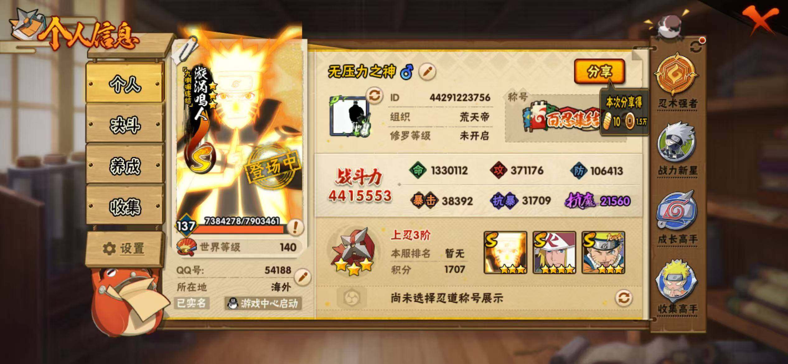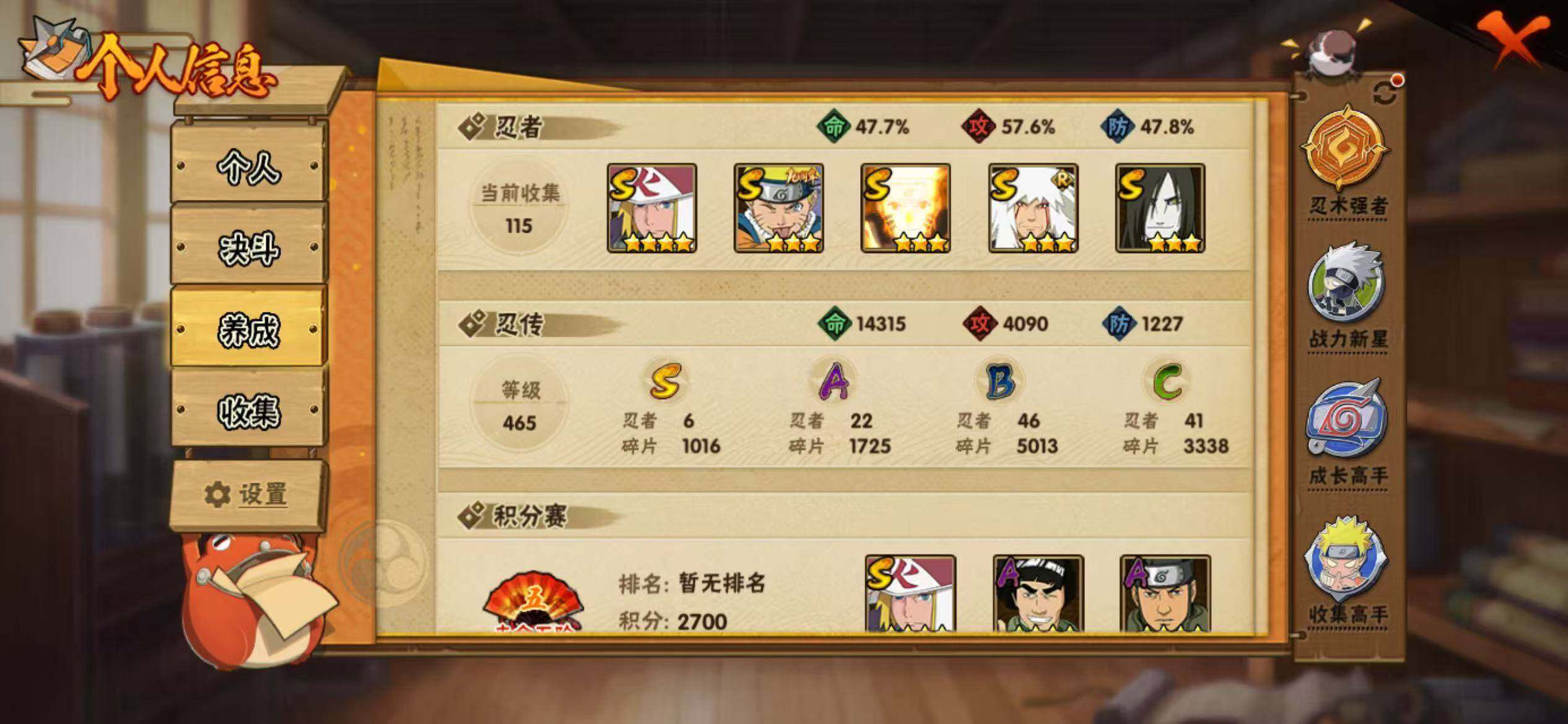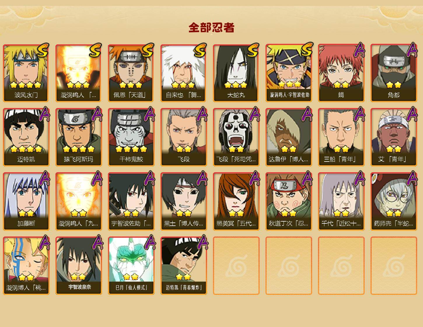 【hy617】6s级忍者数-22a级忍者数 【s级忍者】:自来也「舞之豪杰」3星,大蛇丸3星,波风水门4星,漩涡鸣人「九喇嘛连结」3星,佩恩「天道」3星,漩涡鸣人·宇智波佐助3星 【a级忍者】:艾「青年」2星,三船「青年」2星,达鲁伊「博人传」2星,飞段2星,飞段「死司凭血」2星,干柿鬼鲛4星,漩涡博人「桃式显现」2星,漩涡鸣人「九尾查克拉」2星,迈特凯4星,蝎2星,角都2星,猿飞阿斯玛4星,宇智波佐助「须佐能乎」2星,药师兜「半蛇斗篷」2星,照美冥「五代目水影」2星,黑土「博人传」2星,秋道丁次「忍界大战」2星,千代「近松十人卫」2星,加藤断2星,宇智波泉奈2星,巳月「仙人模式」2星,迈特凯「青春爆炸」2星