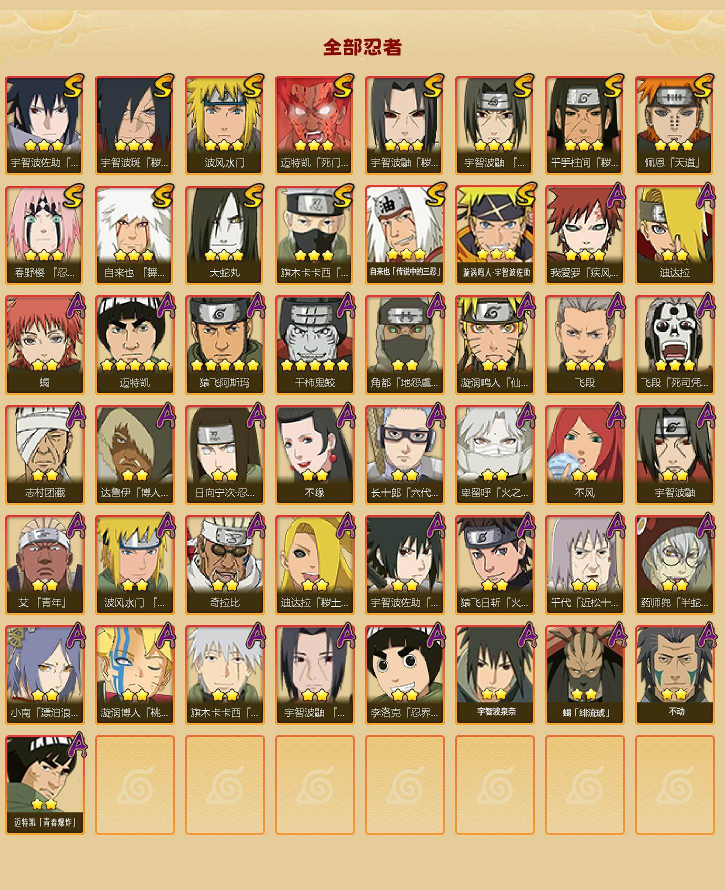 【hy618】14s级忍者数-35a级忍者数 【s级忍者】:千手柱间「秽土转生」3星,宇智波鼬「秽土转生」3星,宇智波斑「秽土转生·解」3星,春野樱「忍界大战」3星,宇智波鼬「须佐能乎」3星,旗木卡卡西「须佐能乎」3星,自来也「舞之豪杰」3星,大蛇丸3星,自来也「传说中的三忍」3星,波风水门3星,迈特凯「死门」3星,佩恩「天道」3星,宇智波佐助「永恒万花筒」3星,漩涡鸣人·宇智波佐助3星 【a级忍者】:艾「青年」2星,波风水门「青年」2星,达鲁伊「博人传」2星,迪达拉2星,迪达拉「秽土转生」2星,奇拉比2星,飞段3星,飞段「死司凭血」3星,干柿鬼鲛5星,漩涡博人「桃式显现」2星,漩涡鸣人「仙人模式」2星,迈特凯5星,旗木卡卡西「幻之真容」2星,我爱罗「疾风传」3星,蝎2星,蝎「绯流琥」2星,小南「漂泊浪客」2星,角都「地怨虞」2星,猿飞阿斯玛5星,猿飞日斩「火影继承人」2星,宇智波鼬2星,宇智波鼬「夏日限定」2星,宇智波佐助「须佐能乎」2星,药师兜「半蛇斗篷」2星,日向宁次「忍界大战」2星,长十郎「六代目水影」2星,卑留呼「火之意志继承者」2星,李洛克「忍界大战」2星,千代「近松十人卫」2星,志村团藏2星,不缘2星,不风2星,宇智波泉奈2星,不动2星,迈特凯「青春爆炸」2星