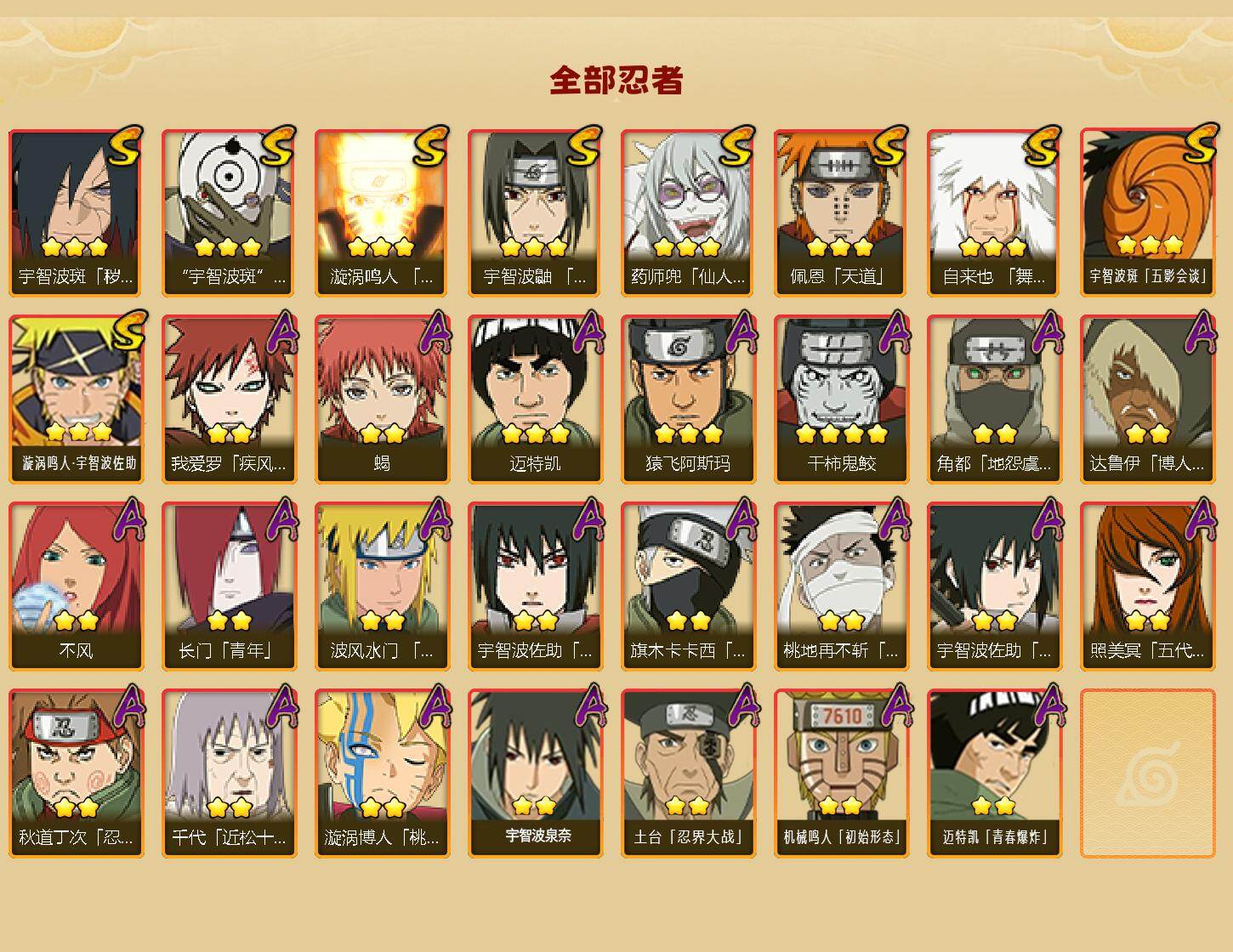 【hyyt219】v8/s忍9/a忍22/4星干柿鬼鲛/2星旗木卡卡西「忍界大战」/2星我爱罗「疾风传」/2星达鲁伊「博人传」/2星长门「青年」/2星蝎/3星佩恩「天道」/2星桃地再不斩「漂泊武士」/3星漩涡鸣人·宇智波佐助/2星角都「地怨虞」/2星照美冥「五代目水影」/3星漩涡鸣人「九喇嘛连结」/2星秋道丁次「忍界大战」/2星漩涡博人「桃式显现」/2星土台「忍界大战」/3星药师兜「仙人模式」/2星波风水门「青年」/3星自来也「舞之豪杰」/3星宇智波斑「白面具」/2星不风/2星宇智波佐助「万花筒写轮眼」/2星宇智波泉奈/3星迈特凯/3星宇智波斑「秽土转生·解」/3星猿飞阿斯玛/2星迈特凯「青春爆炸」/2星宇智波佐助「须佐能乎」/3星宇智波斑「五影会谈」/2星机械鸣人「初始形态」/2星千代「近松十人卫」/3星宇智波鼬「须佐能乎」