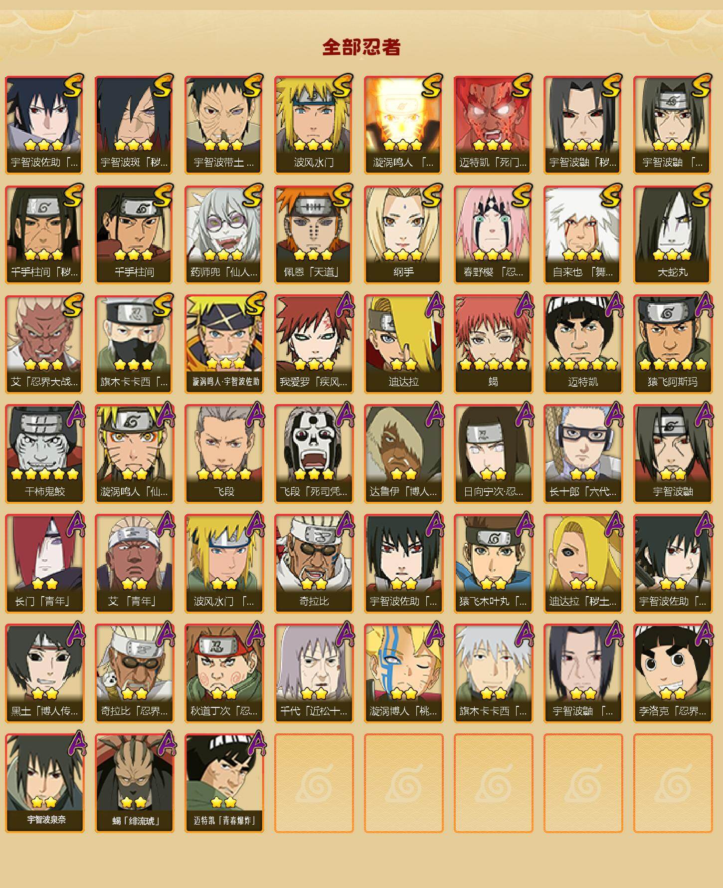 【hyyh1094】v4/战力968w/s忍19/a忍32/3星纲手/2星达鲁伊「博人传」/5星猿飞阿斯玛/3星旗木卡卡西「须佐能乎」/5星蝎/5星迈特凯/2星奇拉比「忍界大战」/3星药师兜「仙人模式」/2星长十郎「六代目水影」/2星蝎「绯流琥」/3星迈特凯「死门」/3星千手柱间/2星黑土「博人传」/2星迪达拉「秽土转生」/3星飞段「死司凭血」/3星春野樱「忍界大战」/2星宇智波佐助「万花筒写轮眼」/2星迪达拉/2星猿飞木叶丸「博人传」/2星日向宁次「忍界大战」/2星宇智波鼬/3星宇智波佐助「永恒万花筒」/3星宇智波鼬「秽土转生」/2星长门「青年」/3星宇智波带土「忍界大战」/3星佩恩「天道」/3星漩涡鸣人·宇智波佐助/3星波风水门/3星漩涡鸣人「九喇嘛连结」/2星秋道丁次「忍界大战」/2星漩涡博人「桃式显现」/3星千手柱间「秽土转生」/3星我爱罗「疾风传」/2星李洛克「忍界大战」/2星波风水门「青年」/3星自来也「舞之豪杰」/4星飞段/2星奇拉比/2星漩涡鸣人「仙人模式」/2星宇智波鼬「夏日限定」/2星宇智波泉奈/2星旗木卡卡西「幻之真容」/3星大蛇丸/3星艾「忍界大战」/3星宇智波斑「秽土转生·解」/2星艾「青年」/2星迈特凯「青春爆炸」/2星宇智波佐助「须佐能乎」/5星干柿鬼鲛/2星千代「近松十人卫」/3星宇智波鼬「须佐能乎」