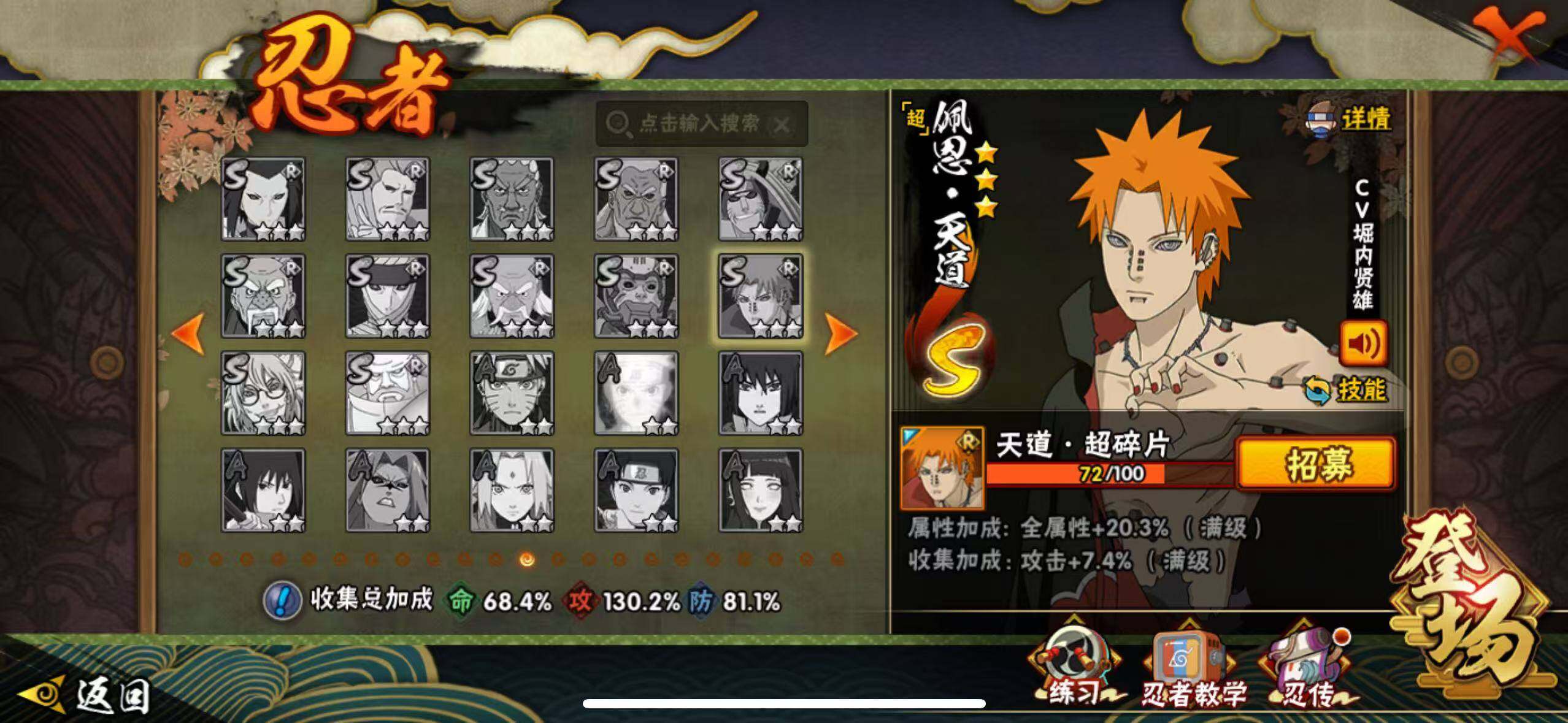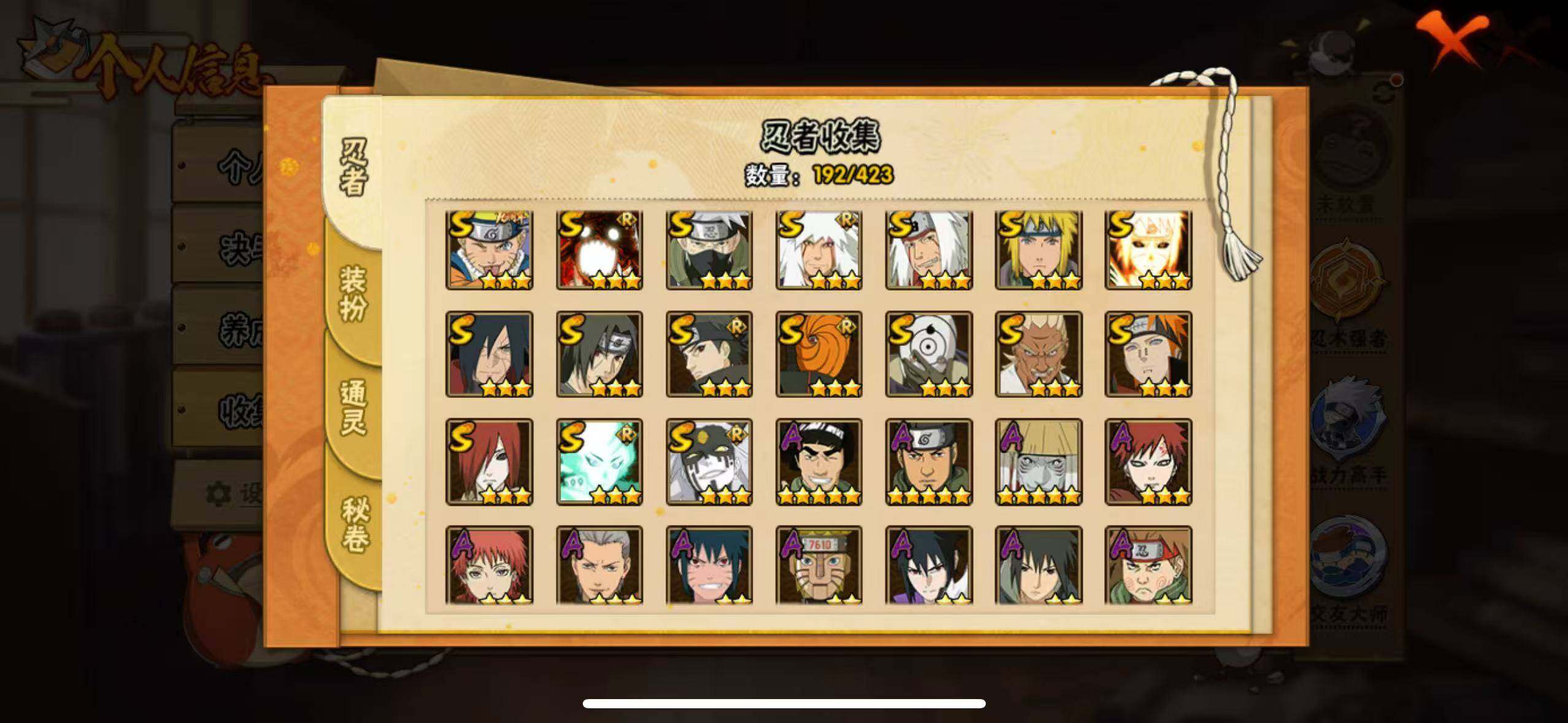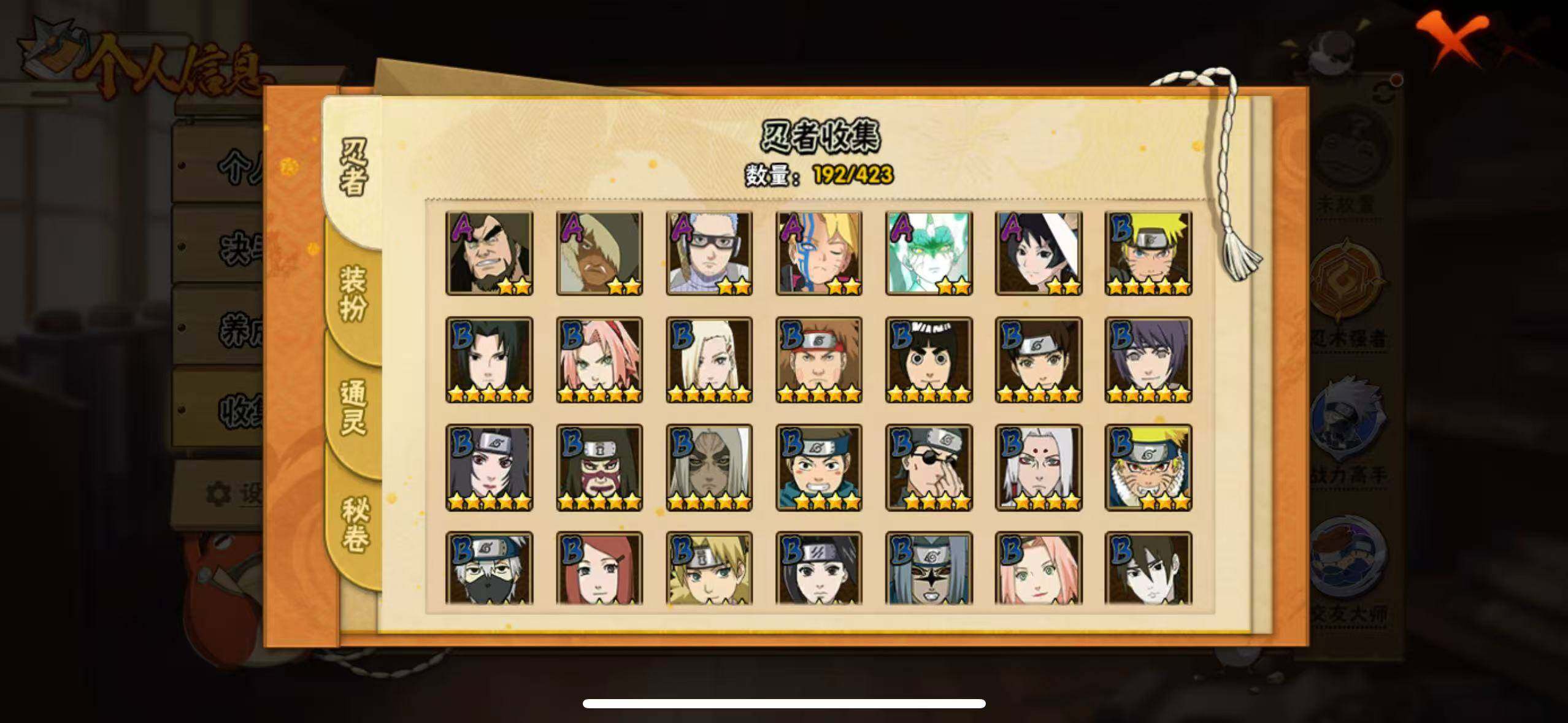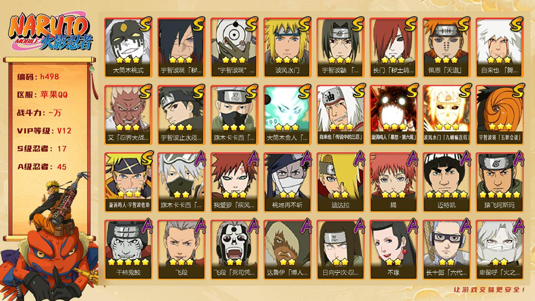 [16527379]17s级忍者数-45a级忍者数 【s级忍者】:长门「秽土转生」3星,宇智波斑「秽土转生·解」3星,艾「忍界大战」3星,宇智波鼬「须佐能乎」3星,宇智波止水「须佐能乎」3星,旗木卡卡西「须佐能乎」3星,自来也「舞之豪杰」3星,自来也「传说中的三忍」3星,波风水门3星,佩恩「天道」3星,宇智波斑 「白面具」3星宇智波斑「白面具」,大筒木桃式3星,大筒木舍人「最终章」3星,漩涡鸣人「暴怒·第六尾」3星,波风水门「九喇嘛连结」3星,宇智波斑「五影会谈」3星,漩涡鸣人·宇智波佐助3星 【a级忍者】:波风水门「青年」2星,达鲁伊「博人传」2星,迪达拉2星,大蛇丸「晓」2星,飞段3星,飞段「死司凭血」2星,飞段「恶灵之影」2星,干柿鬼鲛5星,漩涡博人「桃式显现」2星,机械鸣人「初始形态」2星,迈特凯5星,旗木卡卡西「元气夏日」2星,旗木卡卡西「幻之真容」2星,桃地再不斩2星,桃地再不斩「秽土转生」2星,我爱罗「疾风传」3星,蝎3星,蝎「绯流琥」2星,小南「漂泊浪客」2星,角都「秽土转生」2星,猿飞阿斯玛5星,猿飞阿斯玛「七夕限定」2星,宇智波鼬2星,宇智波鼬「夏日限定」2星,宇智波佐助「侠隐江湖」2星,药师兜「侠隐江湖」2星,日向宁次「忍界大战」2星,黑绝2星,宇智波带土「漂泊浪客」2星,长十郎「六代目水影」2星,卑留呼「火之意志继承者」2星,神秘面具男「忍者之路」2星,佩恩·六道「漂泊浪客」2星,李洛克「忍界大战」2星,黑土「夏日限定」2星,秋道丁次「忍界大战」2星,千代「近松十人卫」2星,神农「羁绊」2星,土台「忍界大战」2星,不缘2星,宇智波泉奈2星,不动2星,大野木「侠隐江湖」2星,巳月「仙人模式」2星,迈特凯「青春爆炸」2星